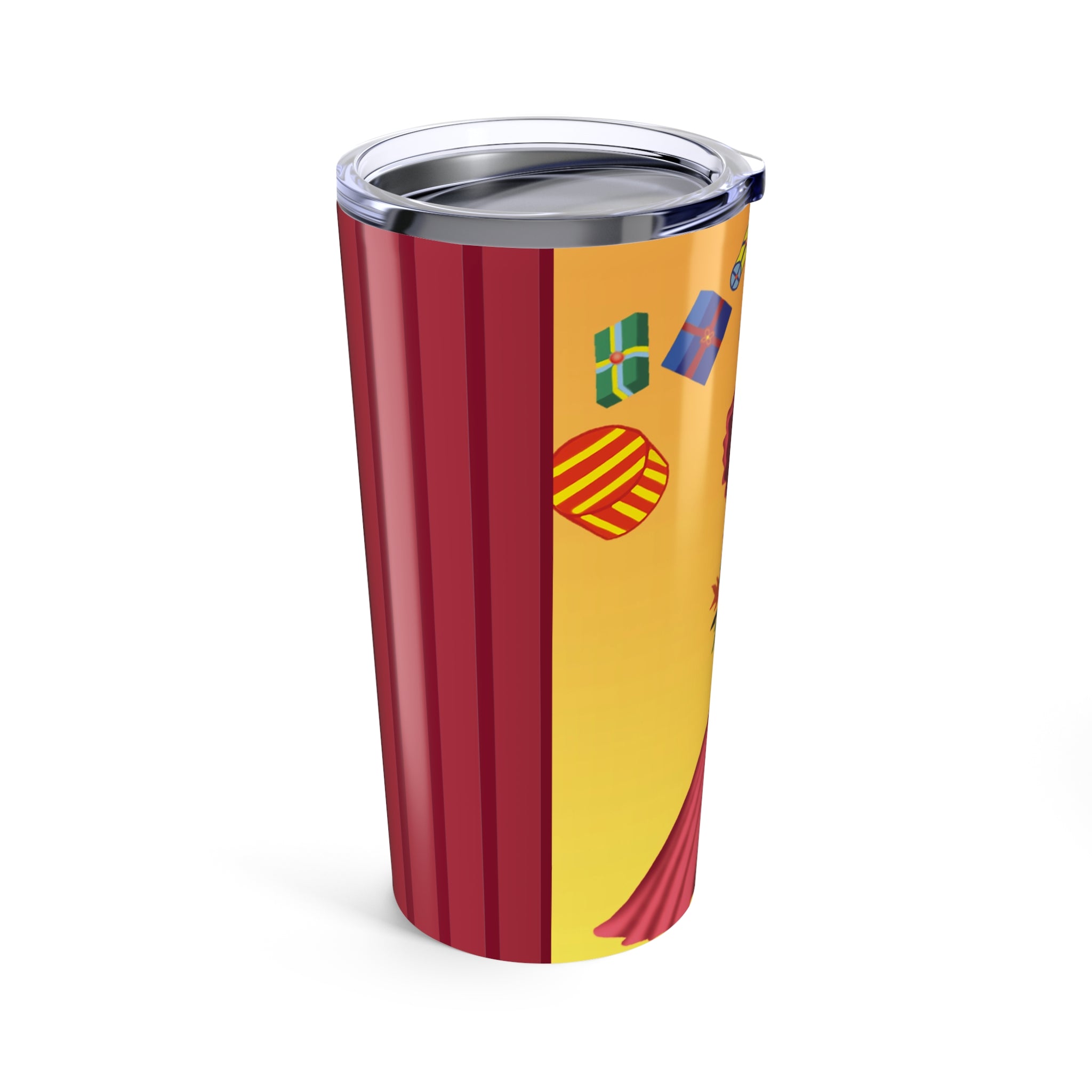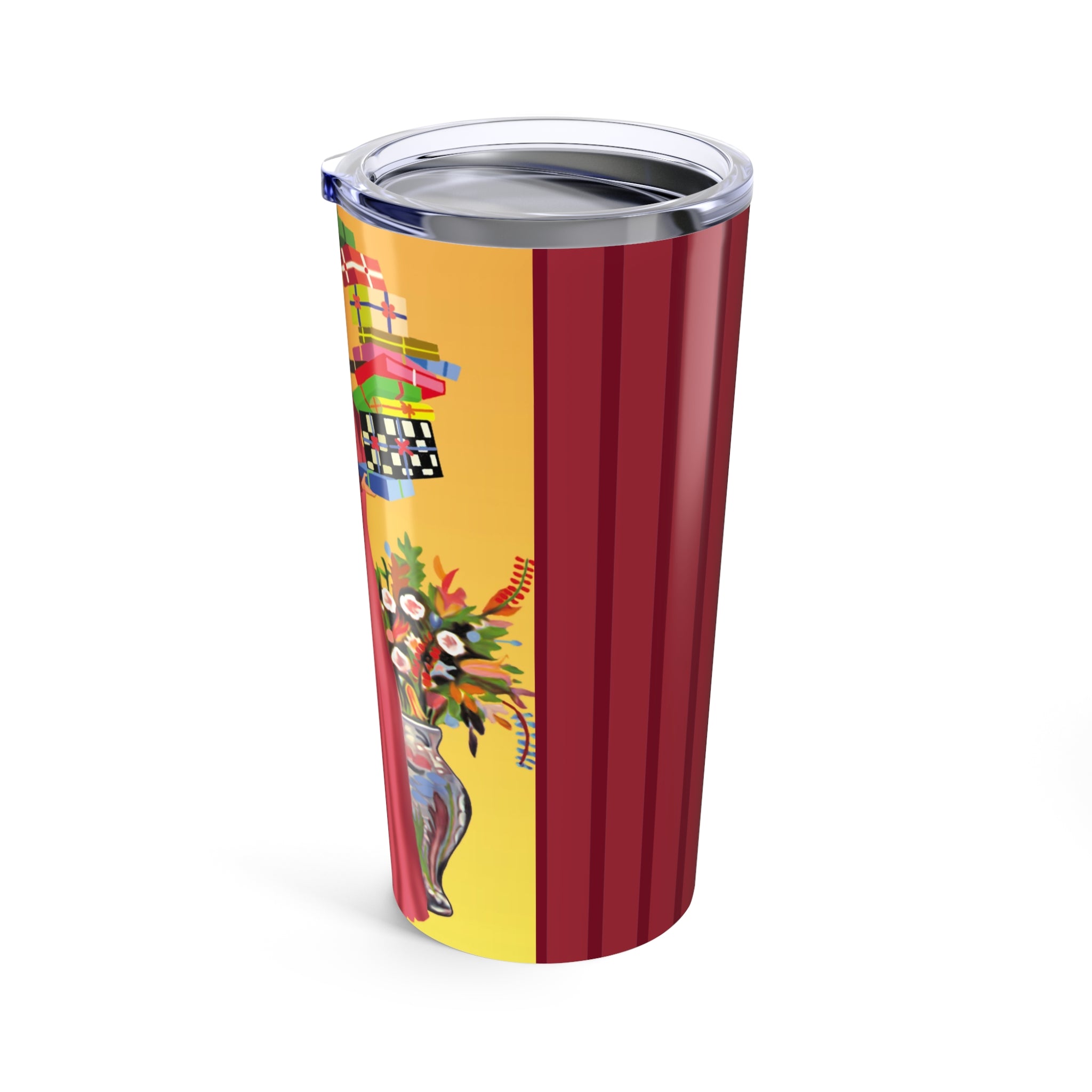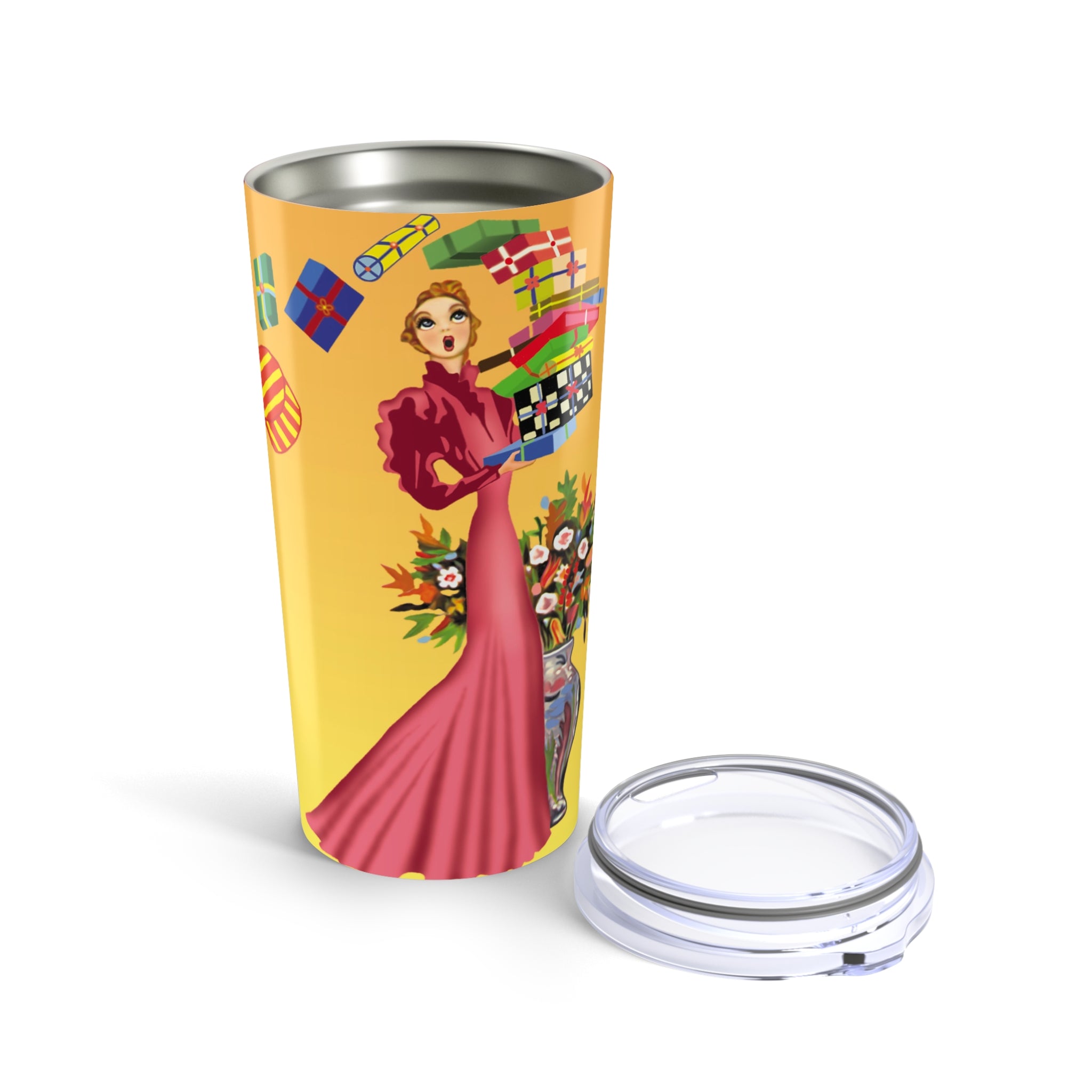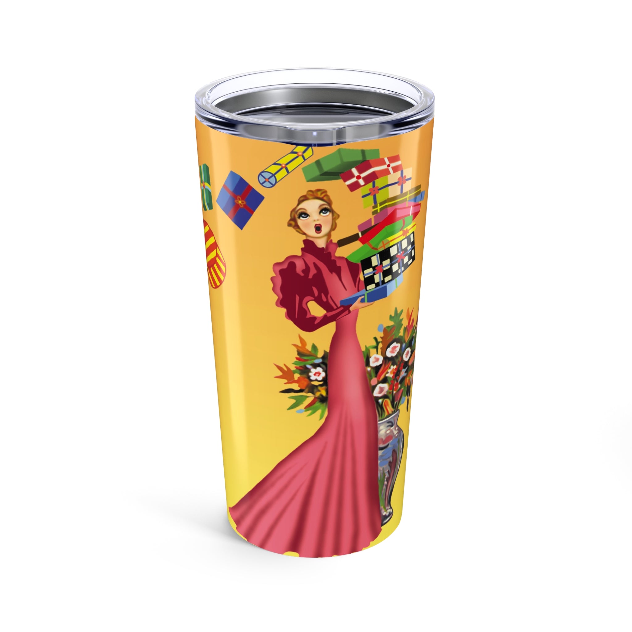 Take holiday elegance on the go with the Elegant Holiday Woman with Gifts Tumbler. Wrapped around the surface, the artwork tells a festive story: a graceful woman in a flowing rose-pink gown balances a towering stack of brightly wrapped gifts, while a silver vase bursts with seasonal flowers. Framed by bold red, green, and black borders, the design captures both sophistication and playful holiday charm.