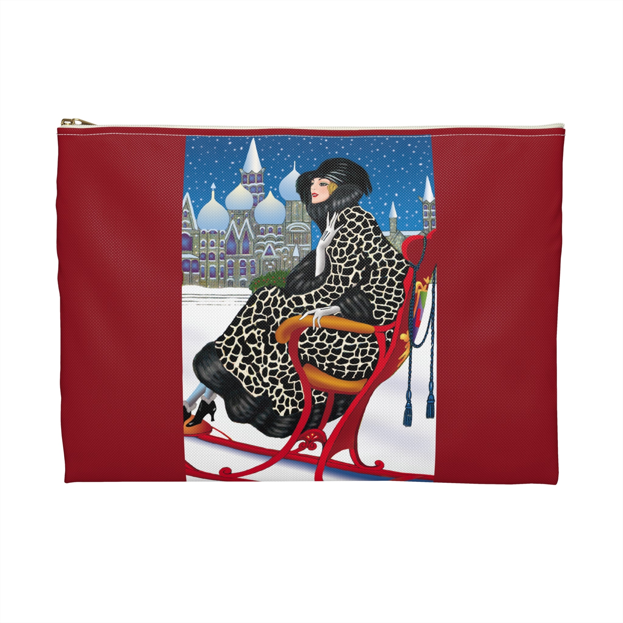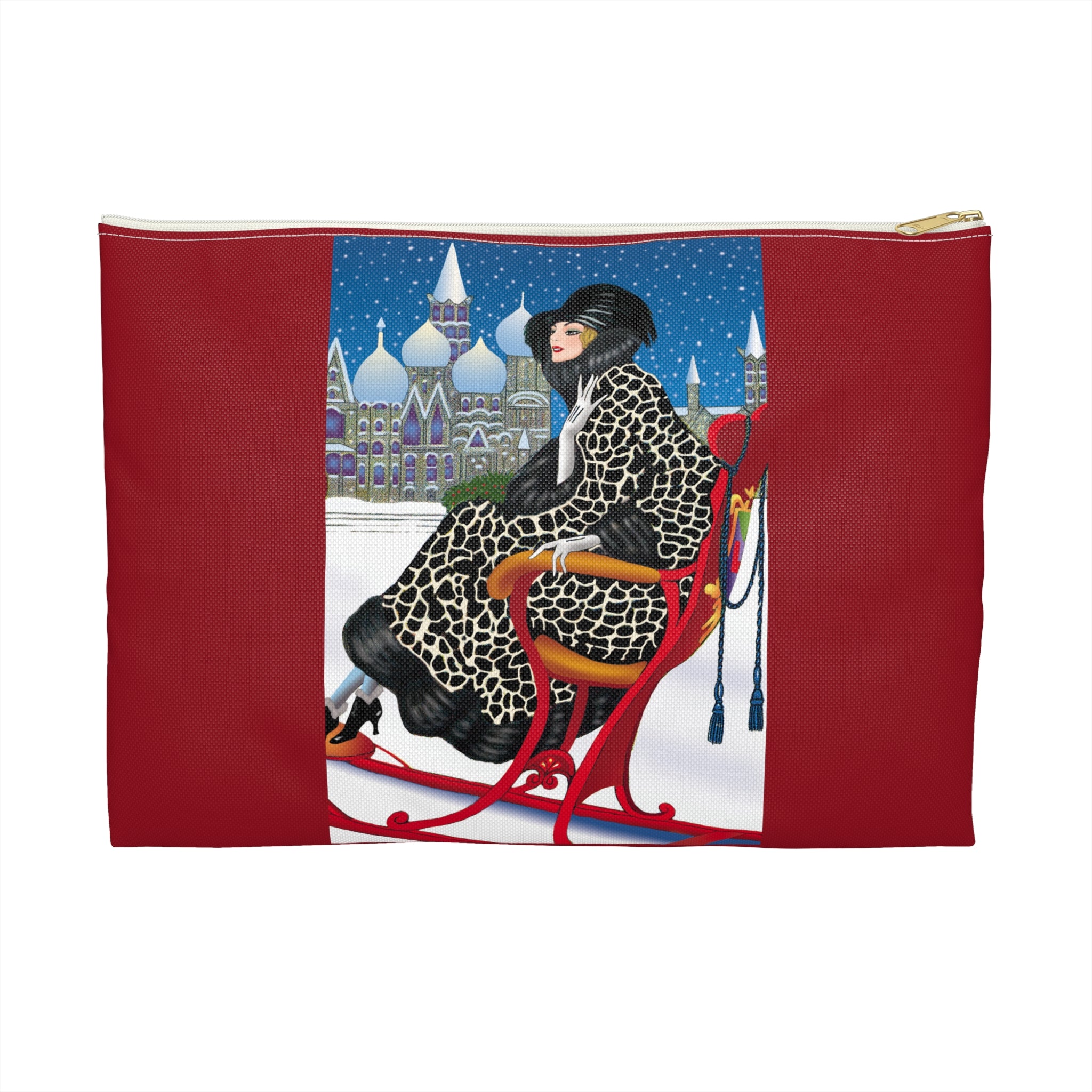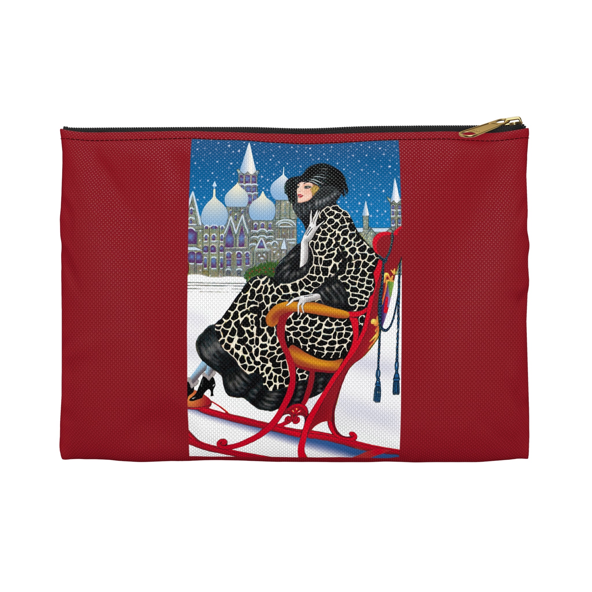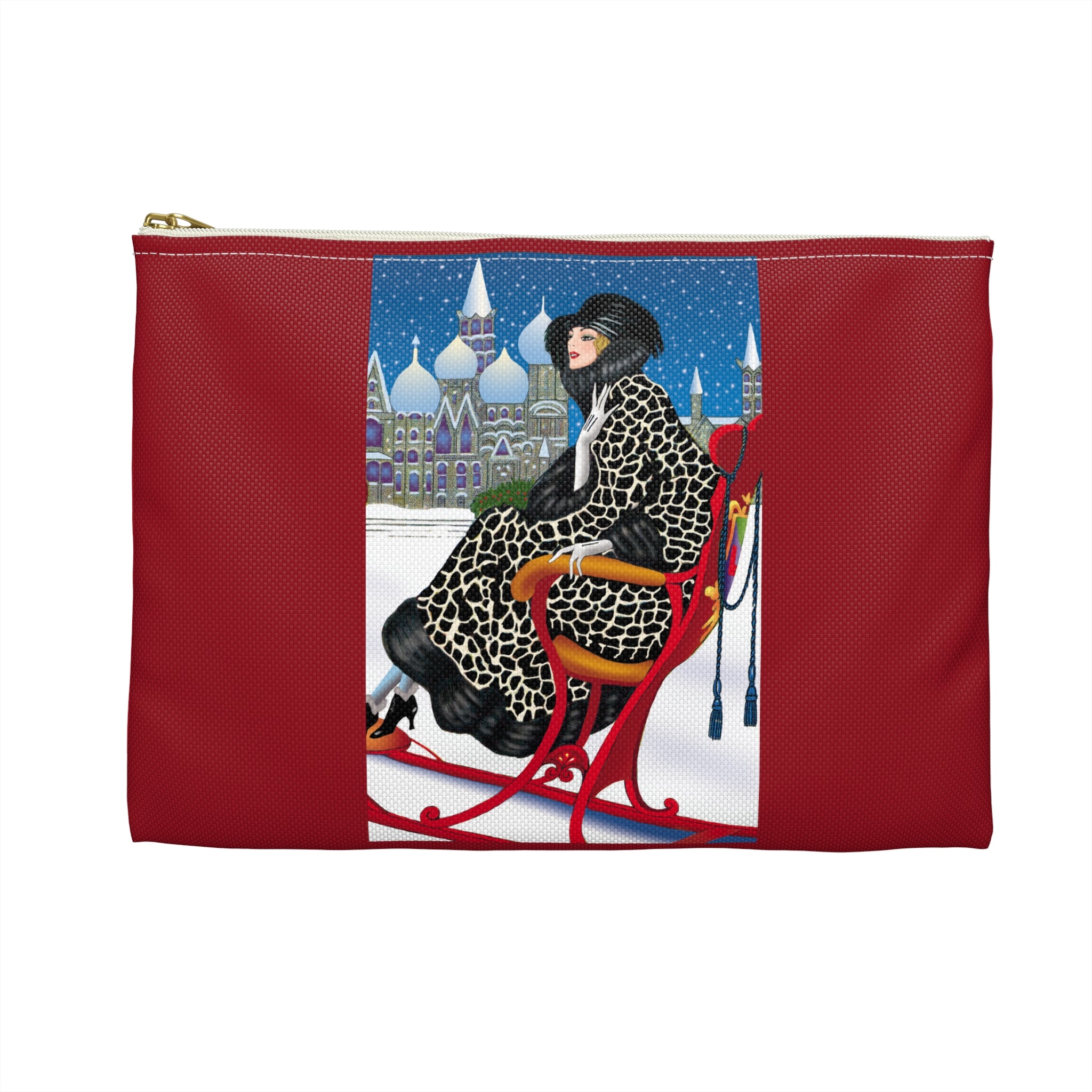 The artwork transforms this everyday pouch into a seasonal keepsake: a sophisticated woman in a dramatic black-and-white fur coat, with matching hat and gloves, rides gracefully in a vivid red sleigh under a snowy night sky. Snow-dusted domed towers sparkle in the background, while her chic high-heeled boots and confident poise add a touch of modern elegance to the fairytale scene. The deep blue sky, falling snow, and glowing architecture turn this design into a celebration of style and festive allure.
