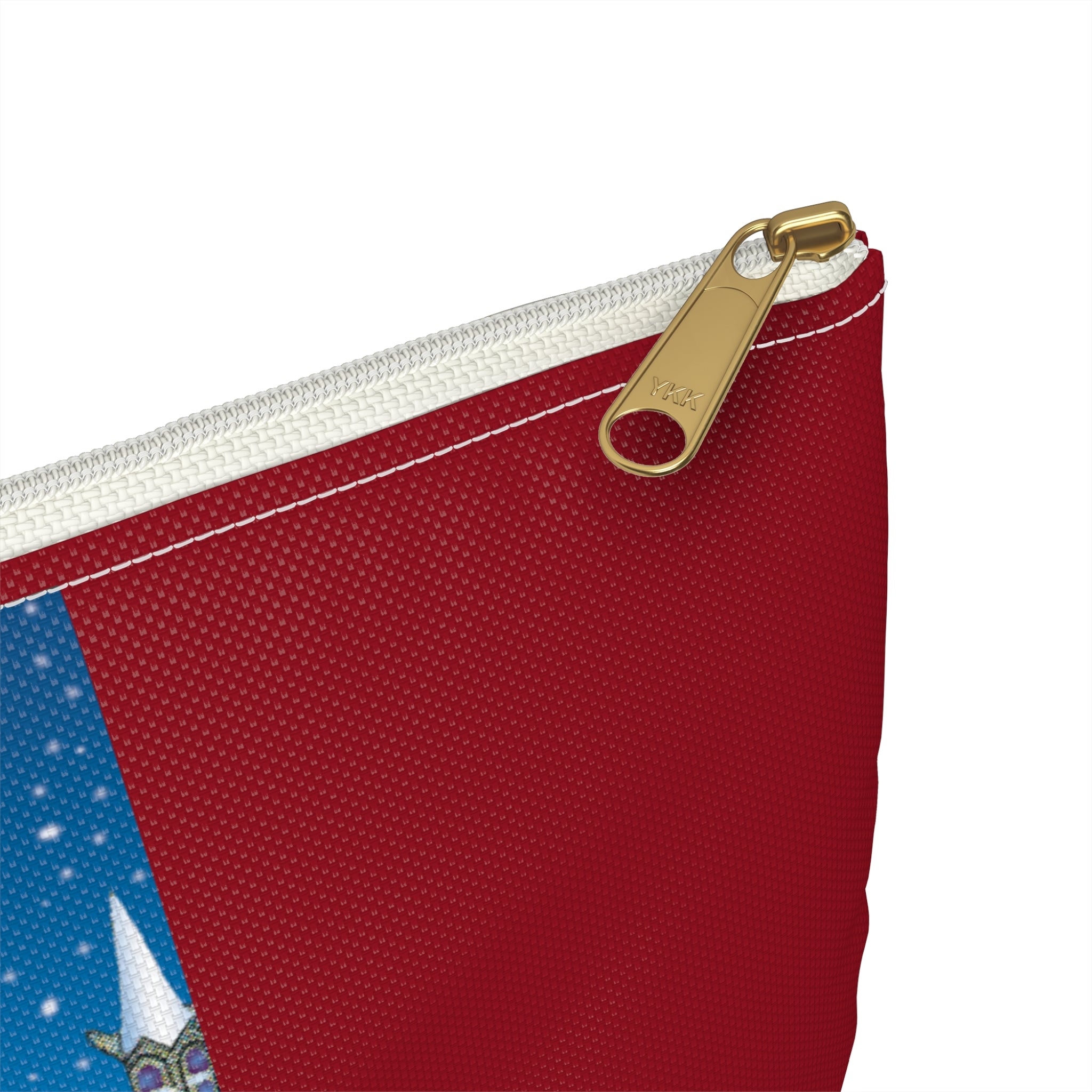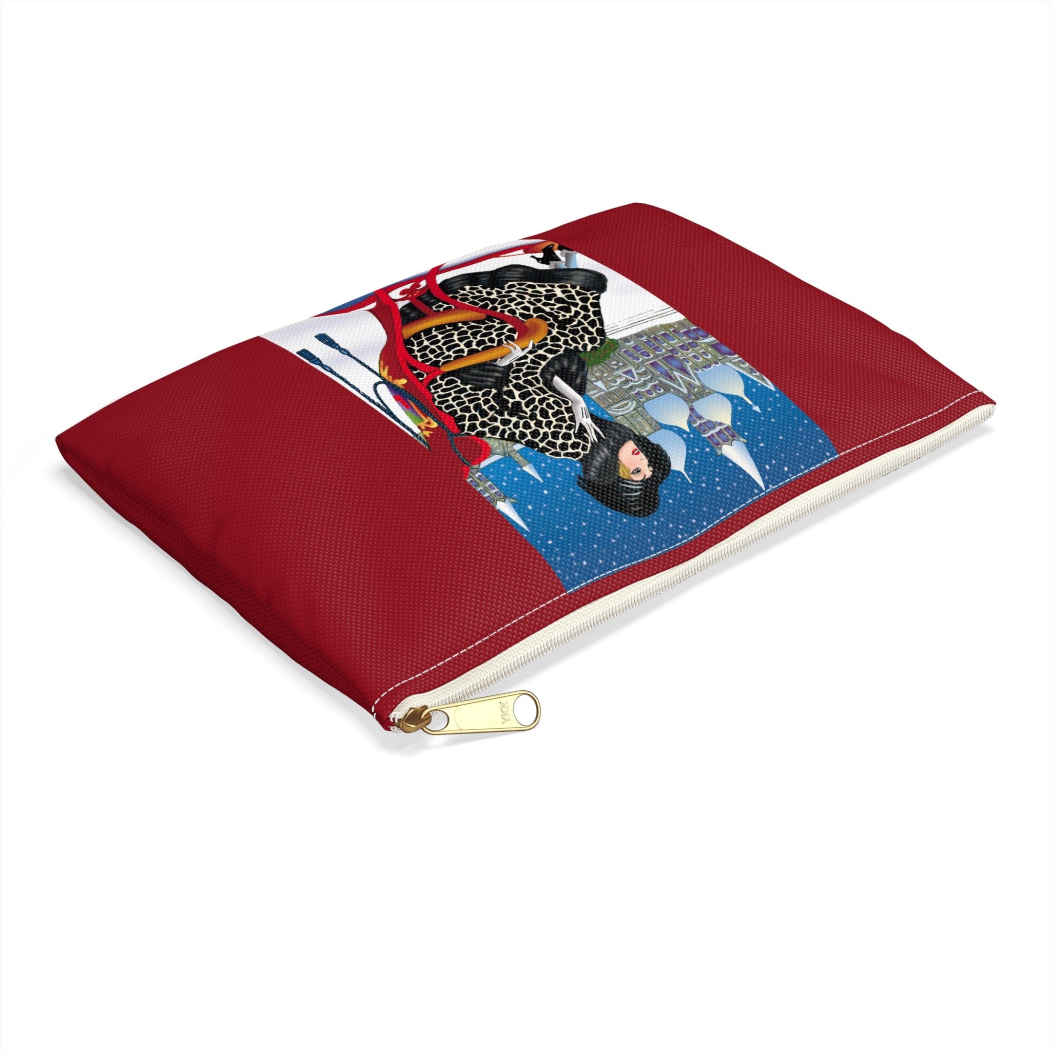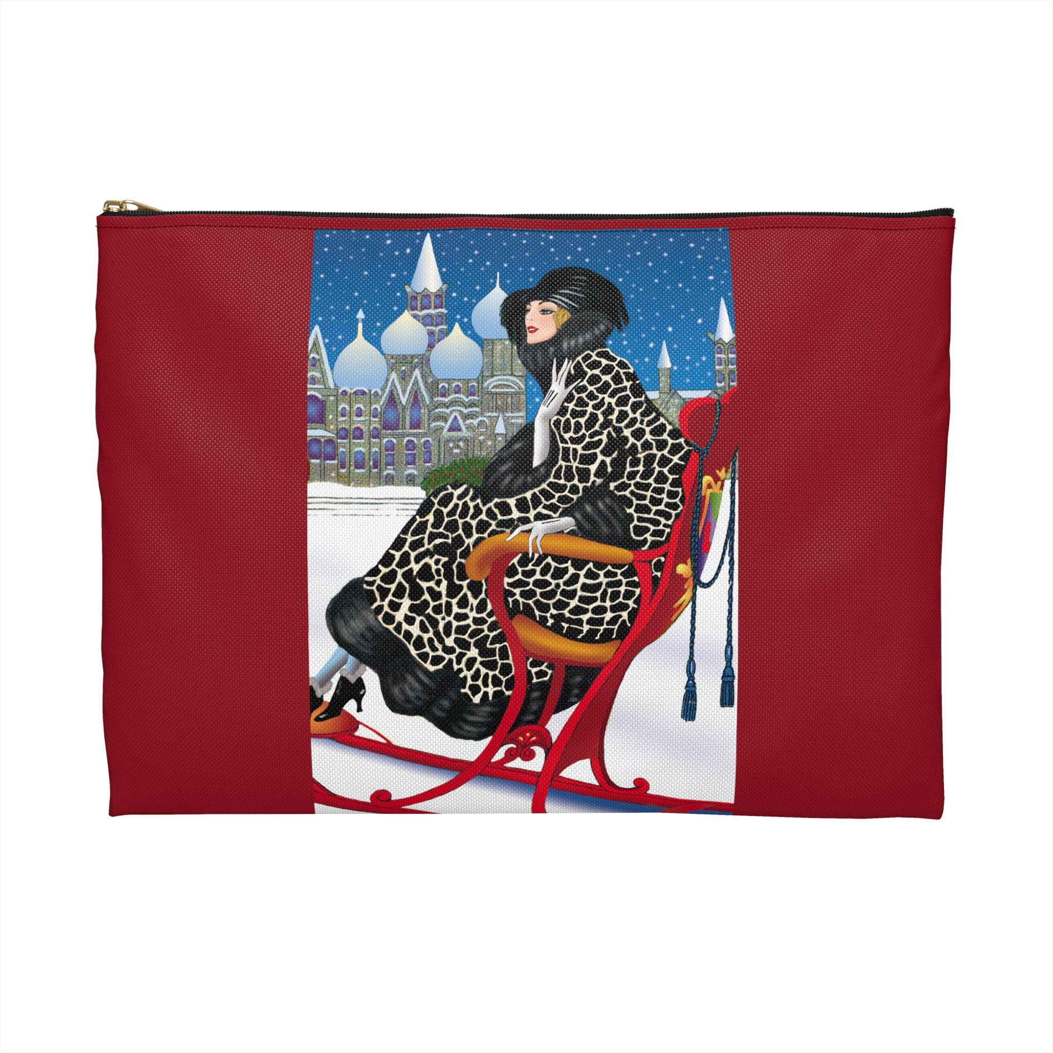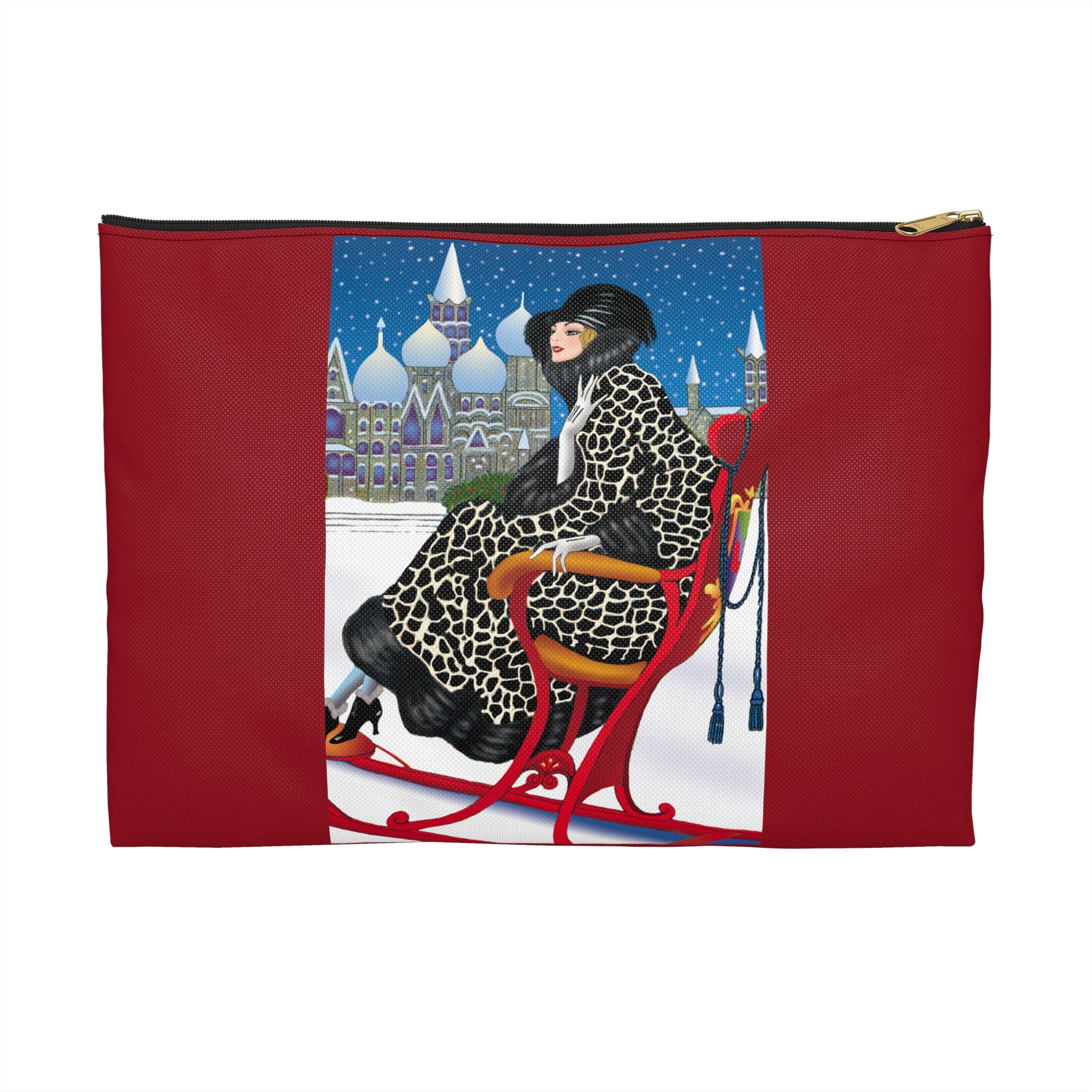 The artwork transforms this everyday pouch into a seasonal keepsake: a sophisticated woman in a dramatic black-and-white fur coat, with matching hat and gloves, rides gracefully in a vivid red sleigh under a snowy night sky. Snow-dusted domed towers sparkle in the background, while her chic high-heeled boots and confident poise add a touch of modern elegance to the fairytale scene. The deep blue sky, falling snow, and glowing architecture turn this design into a celebration of style and festive allure.
