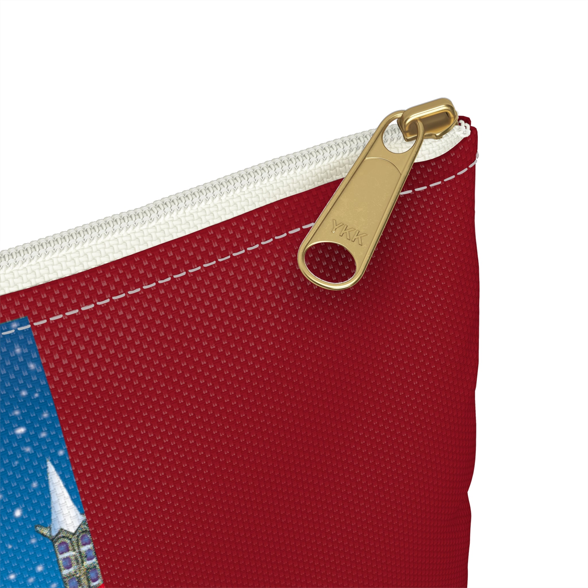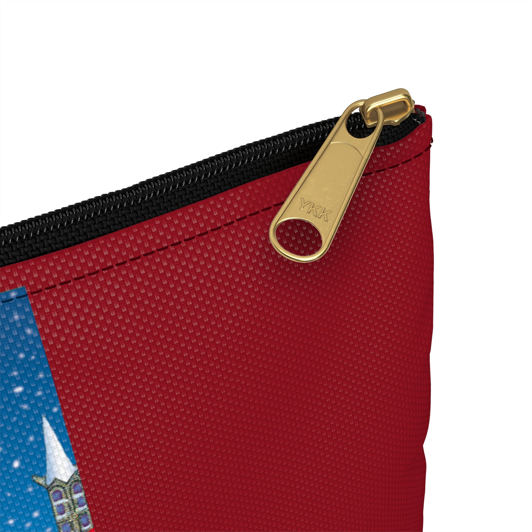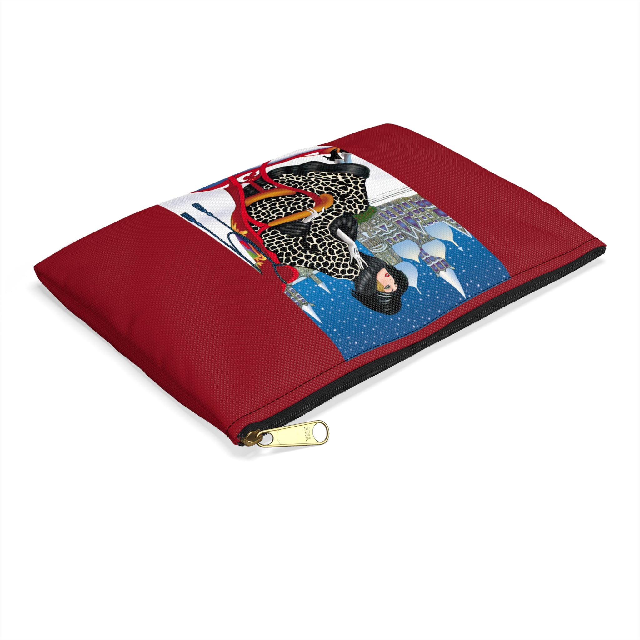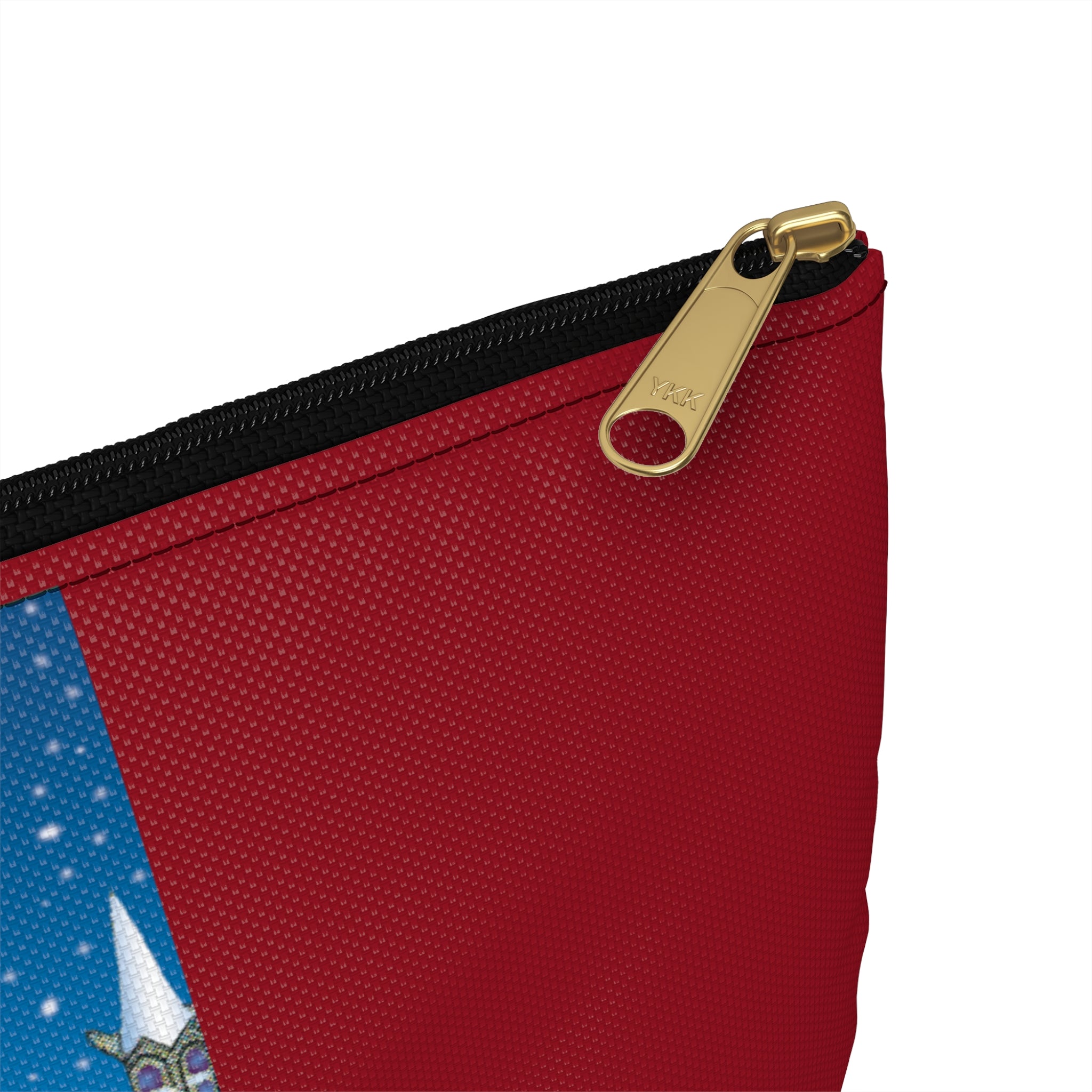 The artwork transforms this everyday pouch into a seasonal keepsake: a sophisticated woman in a dramatic black-and-white fur coat, with matching hat and gloves, rides gracefully in a vivid red sleigh under a snowy night sky. Snow-dusted domed towers sparkle in the background, while her chic high-heeled boots and confident poise add a touch of modern elegance to the fairytale scene. The deep blue sky, falling snow, and glowing architecture turn this design into a celebration of style and festive allure.