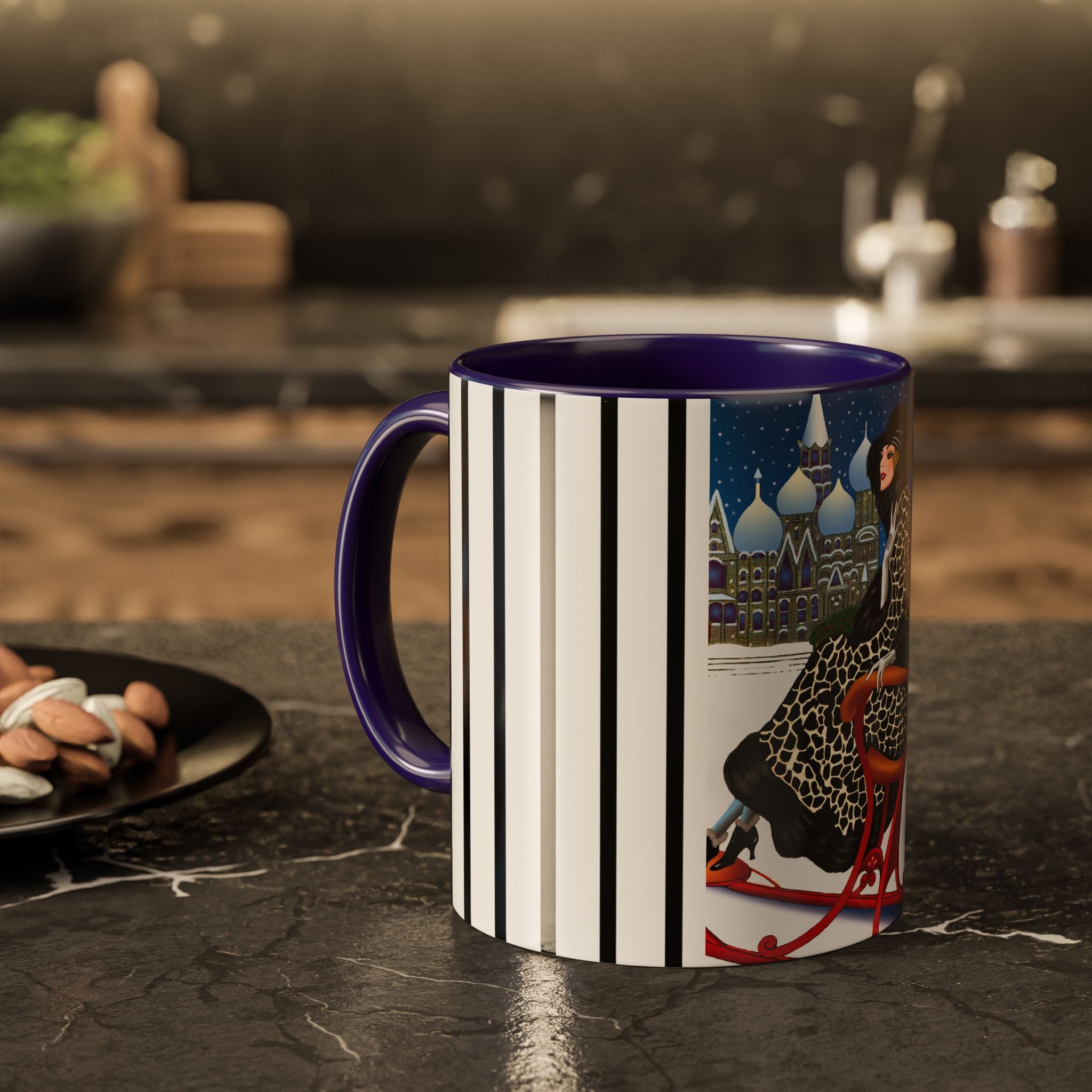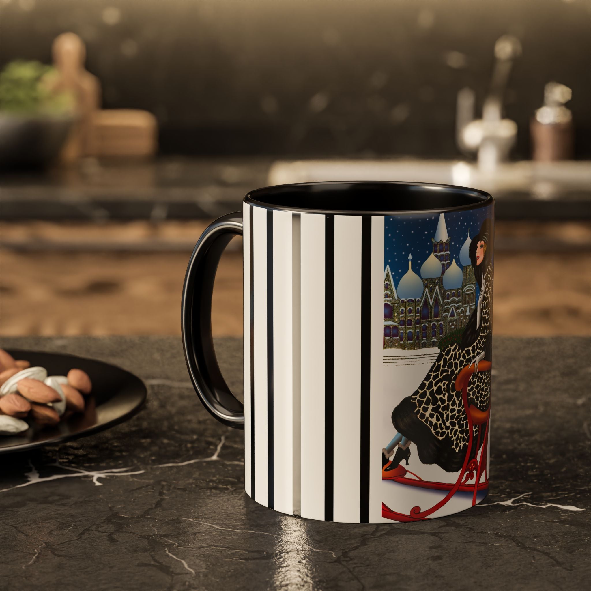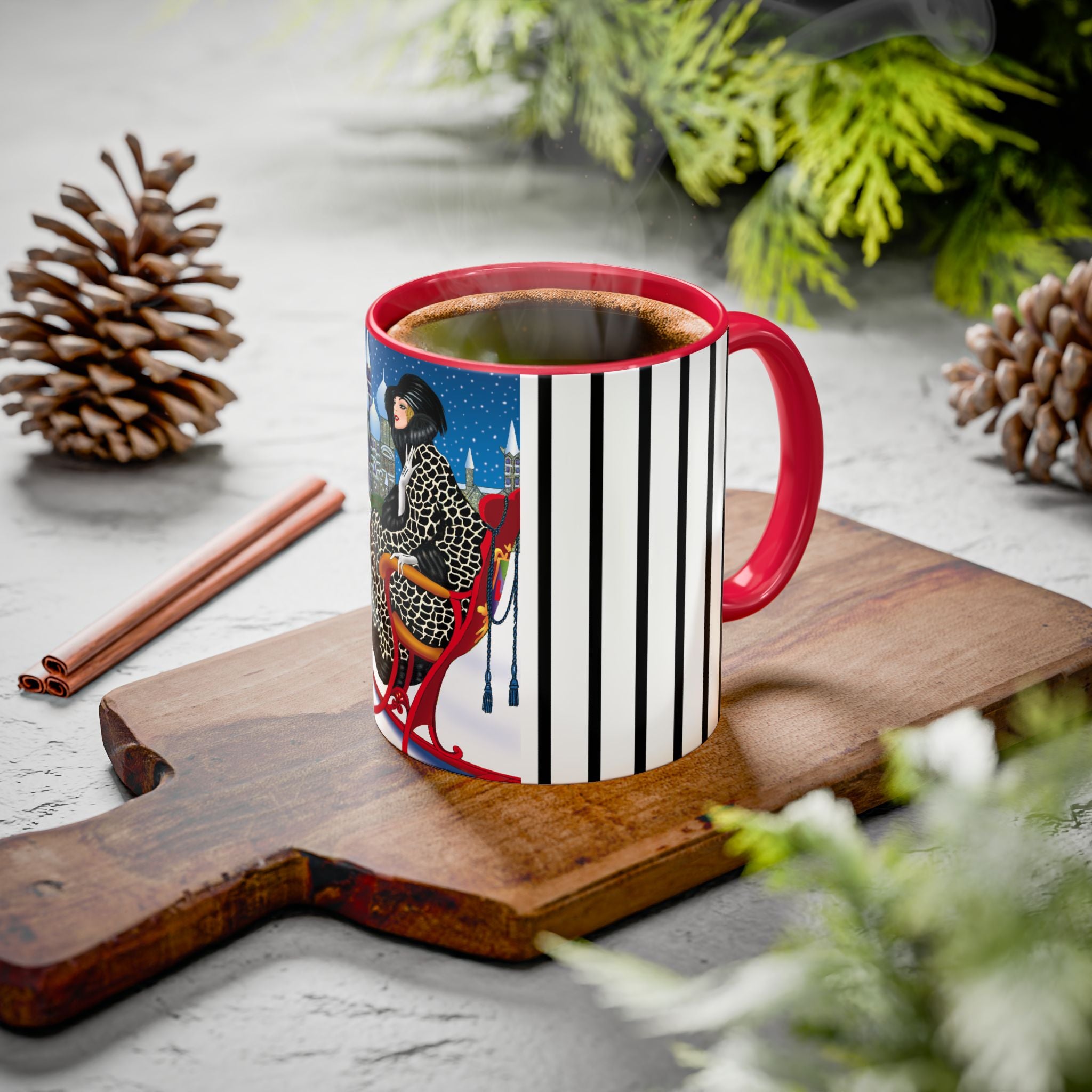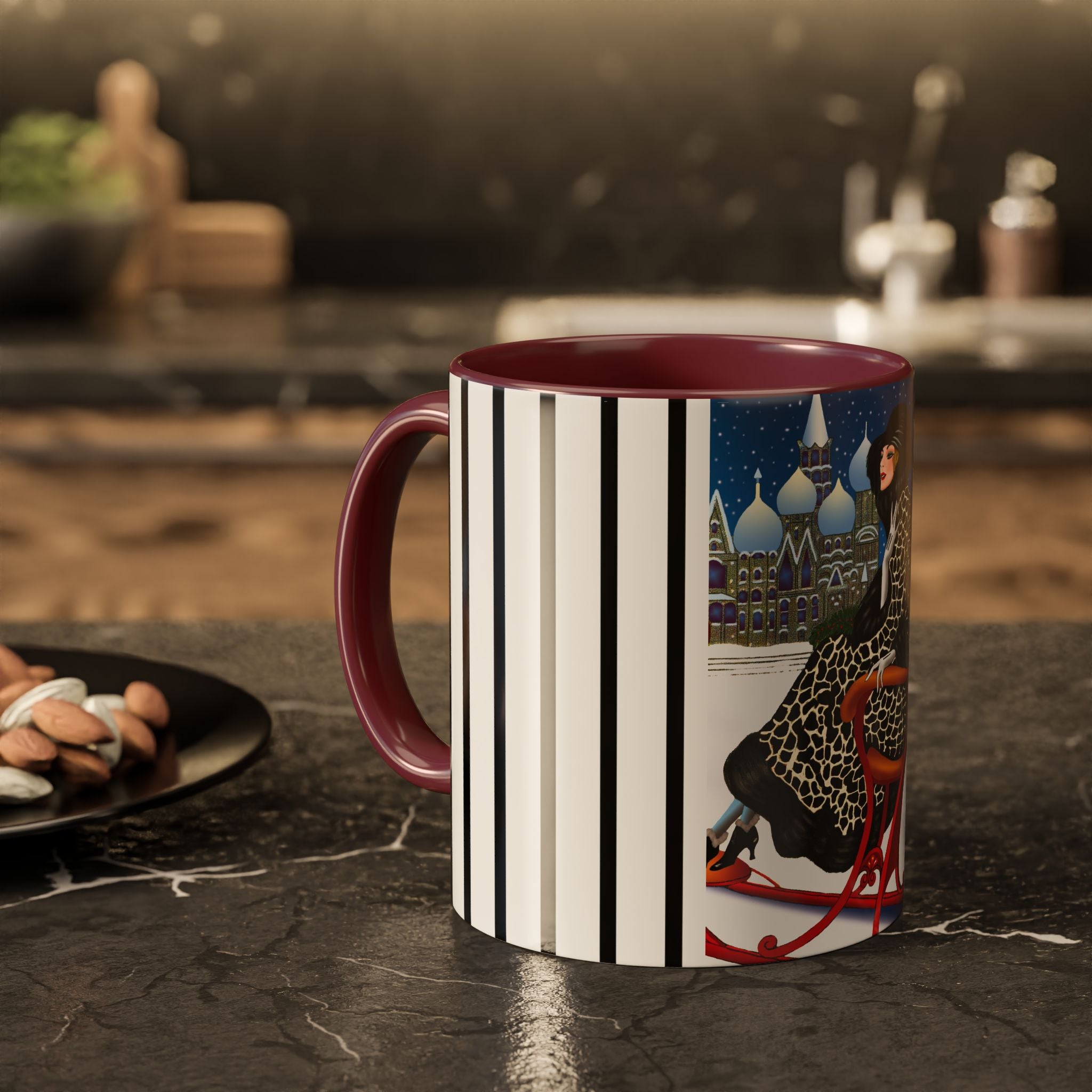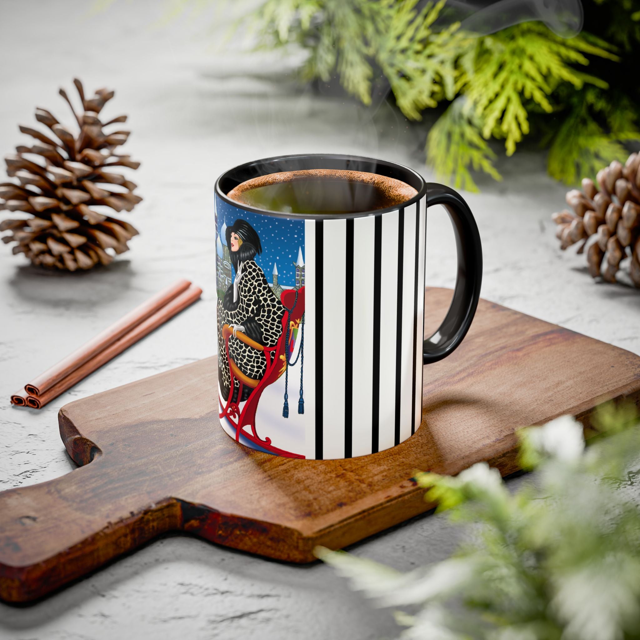 Start your mornings with a touch of winter glamour. The Elegant Winter Woman in Sleigh Colorful Mug transforms an everyday essential into a celebration of art and style. Wrapped around each mug is a stunning holiday scene: a sophisticated woman draped in a dramatic black-and-white patterned fur coat, complete with matching hat and gloves, sits gracefully in a vivid red sleigh. Behind her, whimsical snow-dusted towers sparkle beneath a deep blue night sky as snow falls gently all around. Her confident poise, chic high-heeled boots, and the enchanting backdrop create a timeless moment of elegance and festive allure.