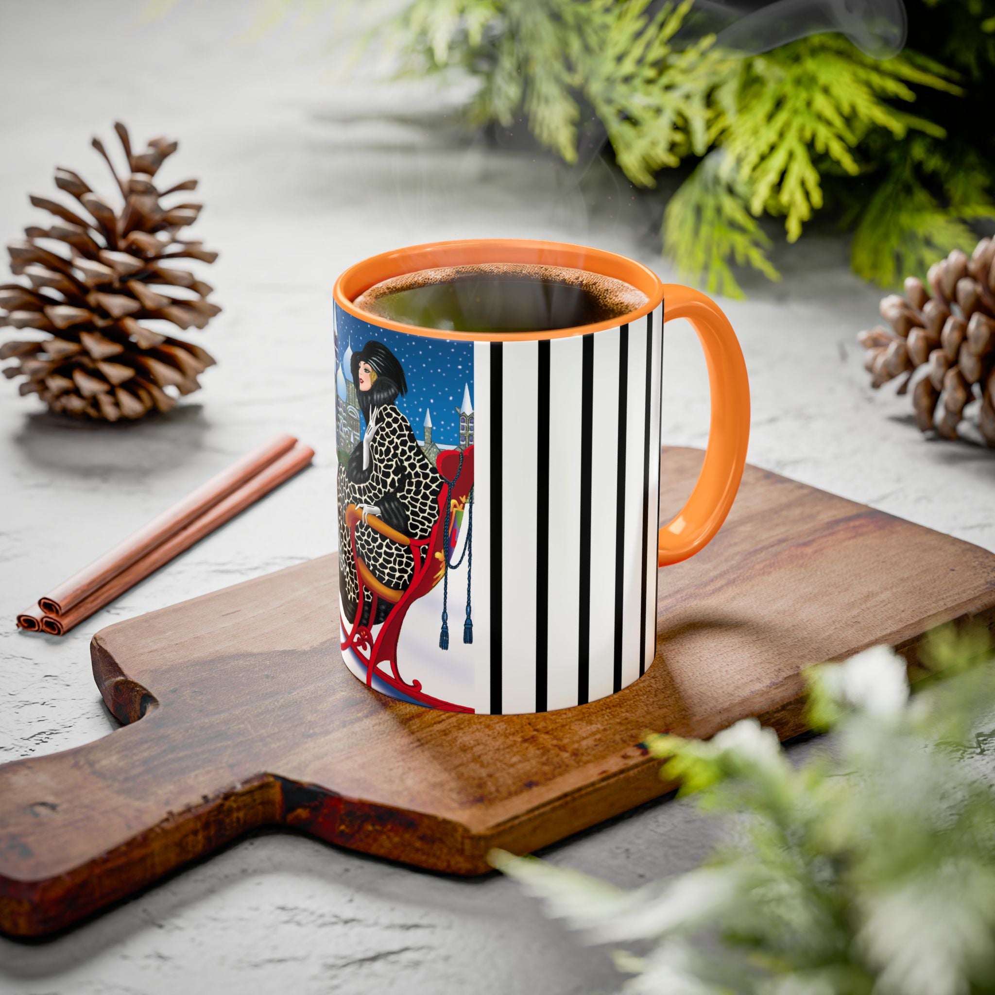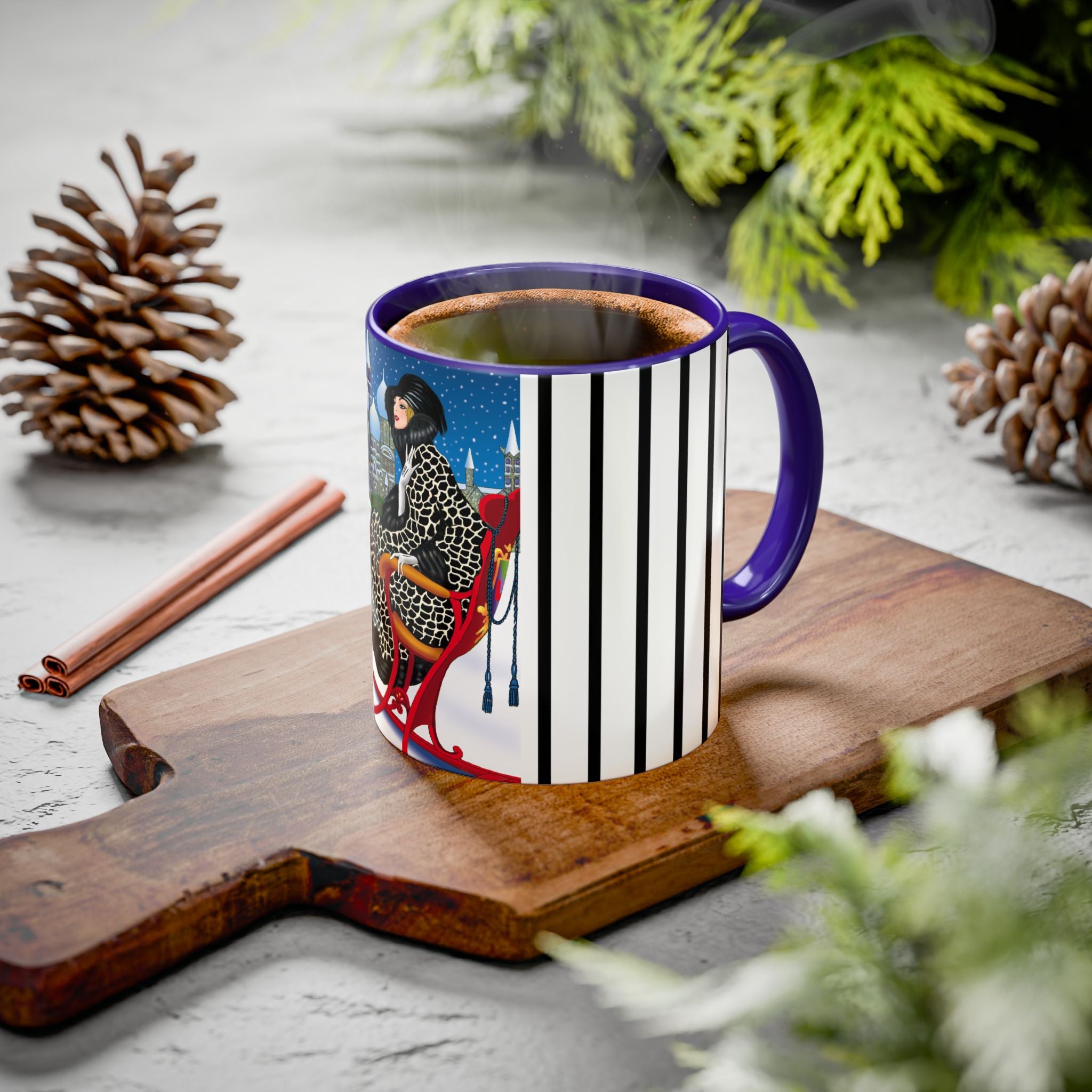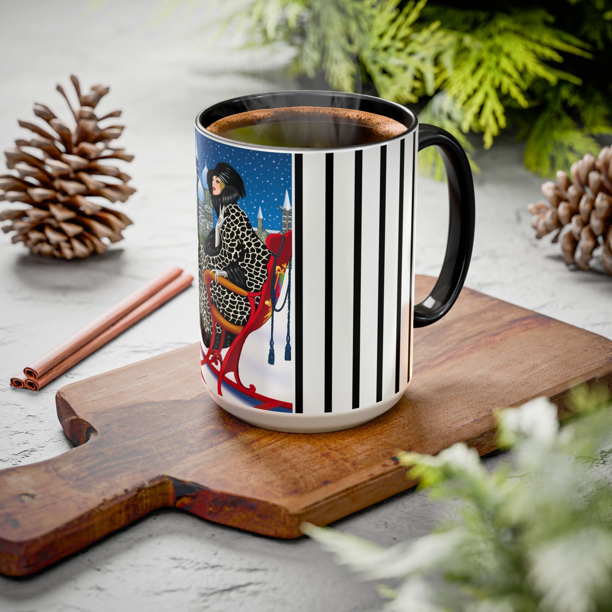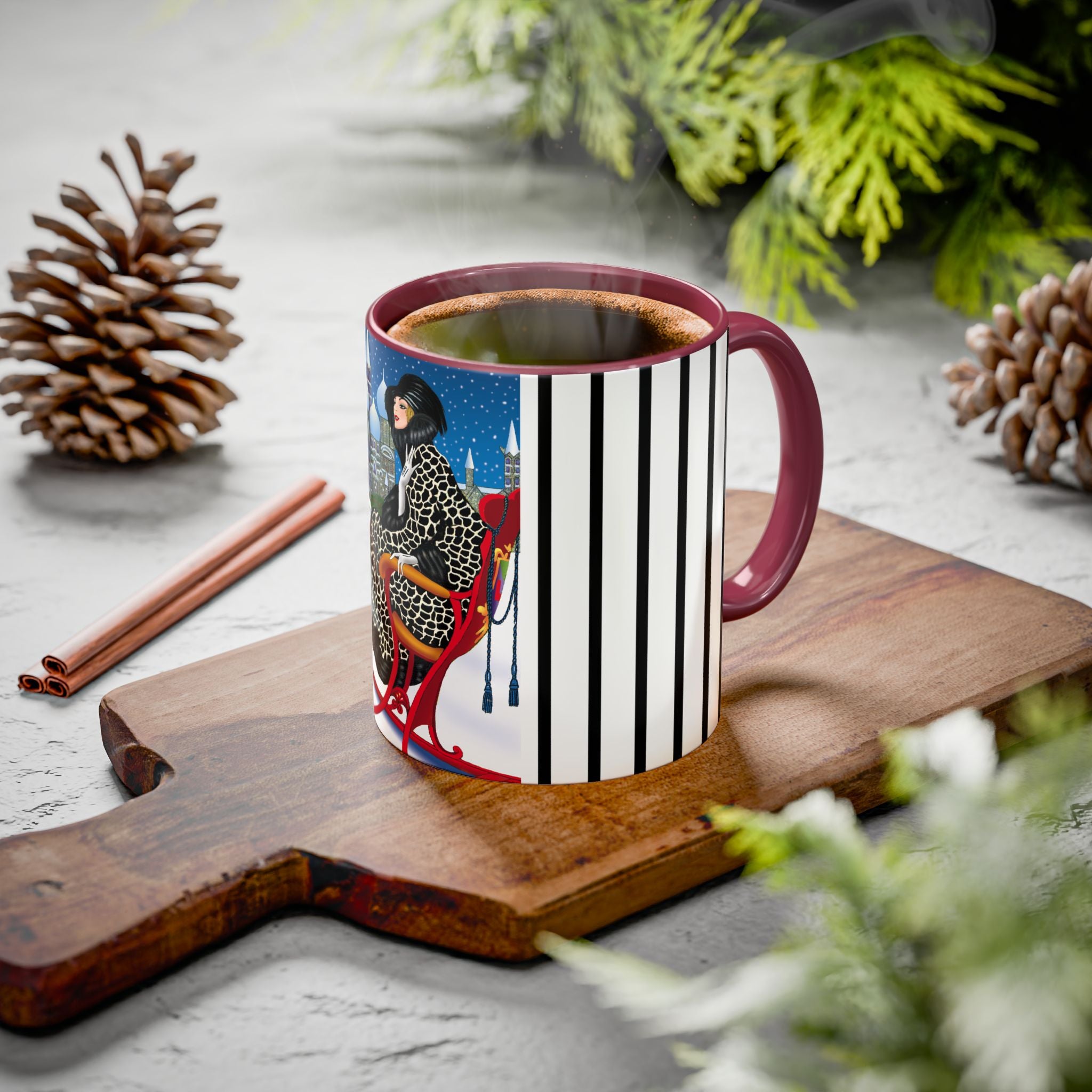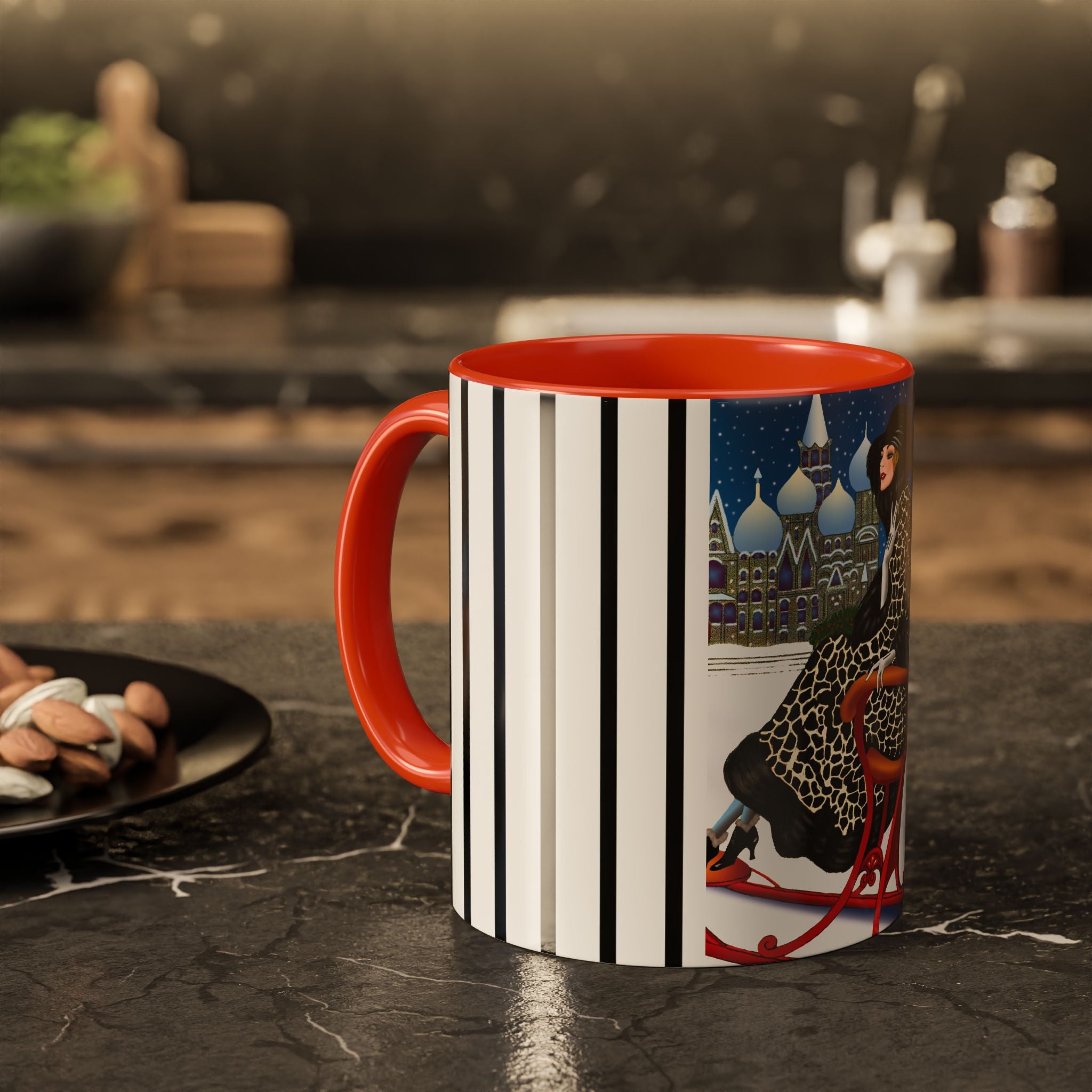 Start your mornings with a touch of winter glamour. The Elegant Winter Woman in Sleigh Colorful Mug transforms an everyday essential into a celebration of art and style. Wrapped around each mug is a stunning holiday scene: a sophisticated woman draped in a dramatic black-and-white patterned fur coat, complete with matching hat and gloves, sits gracefully in a vivid red sleigh. Behind her, whimsical snow-dusted towers sparkle beneath a deep blue night sky as snow falls gently all around. Her confident poise, chic high-heeled boots, and the enchanting backdrop create a timeless moment of elegance and festive allure.