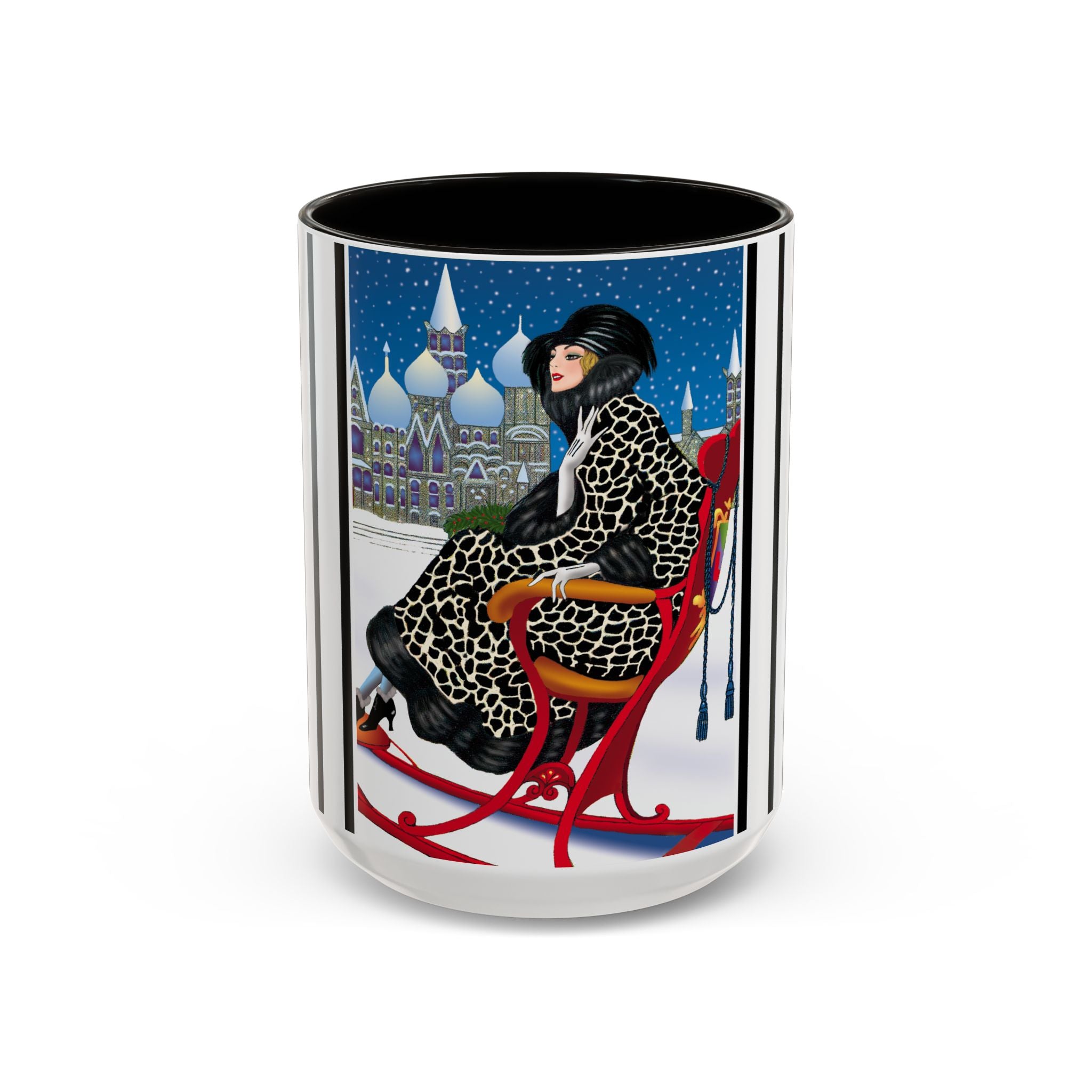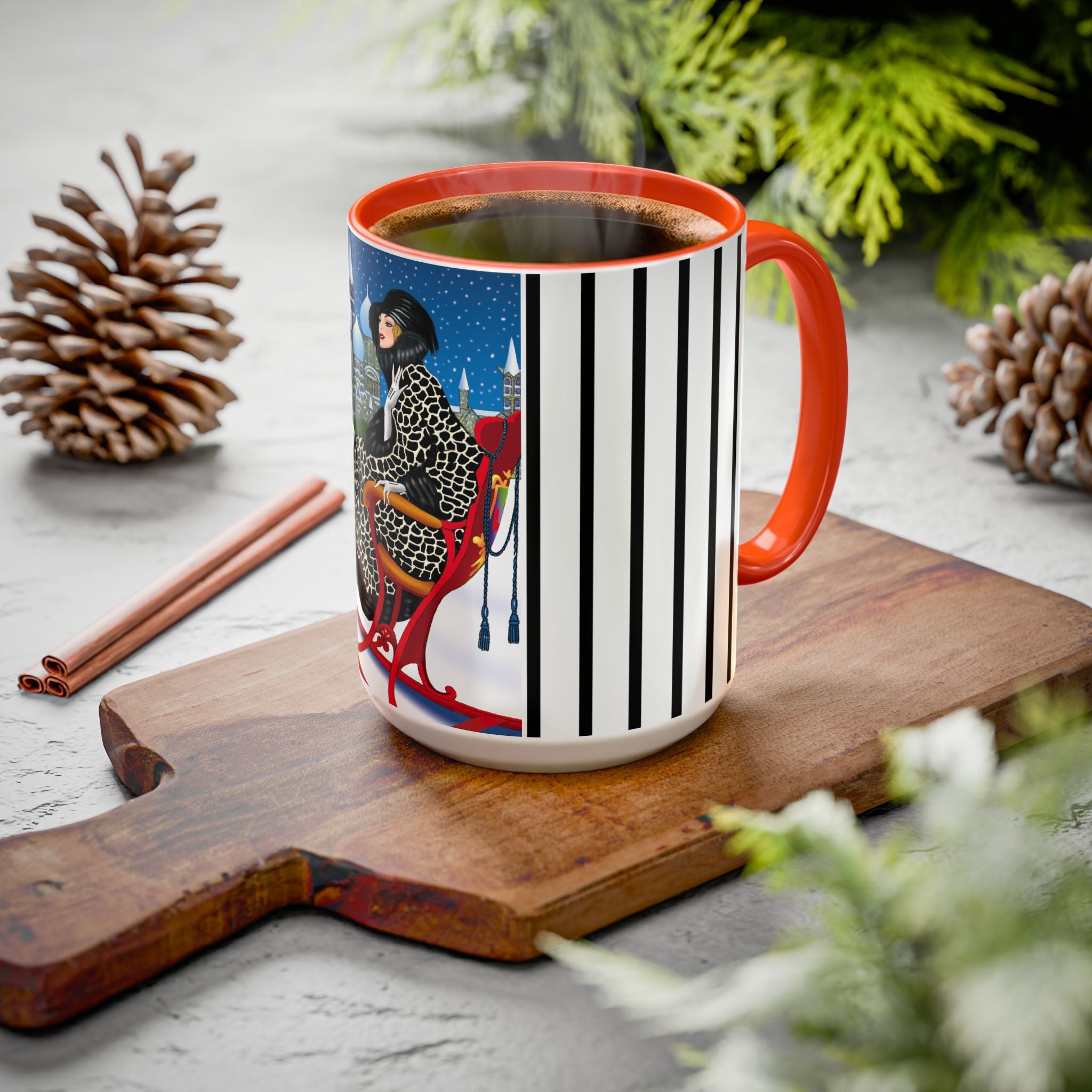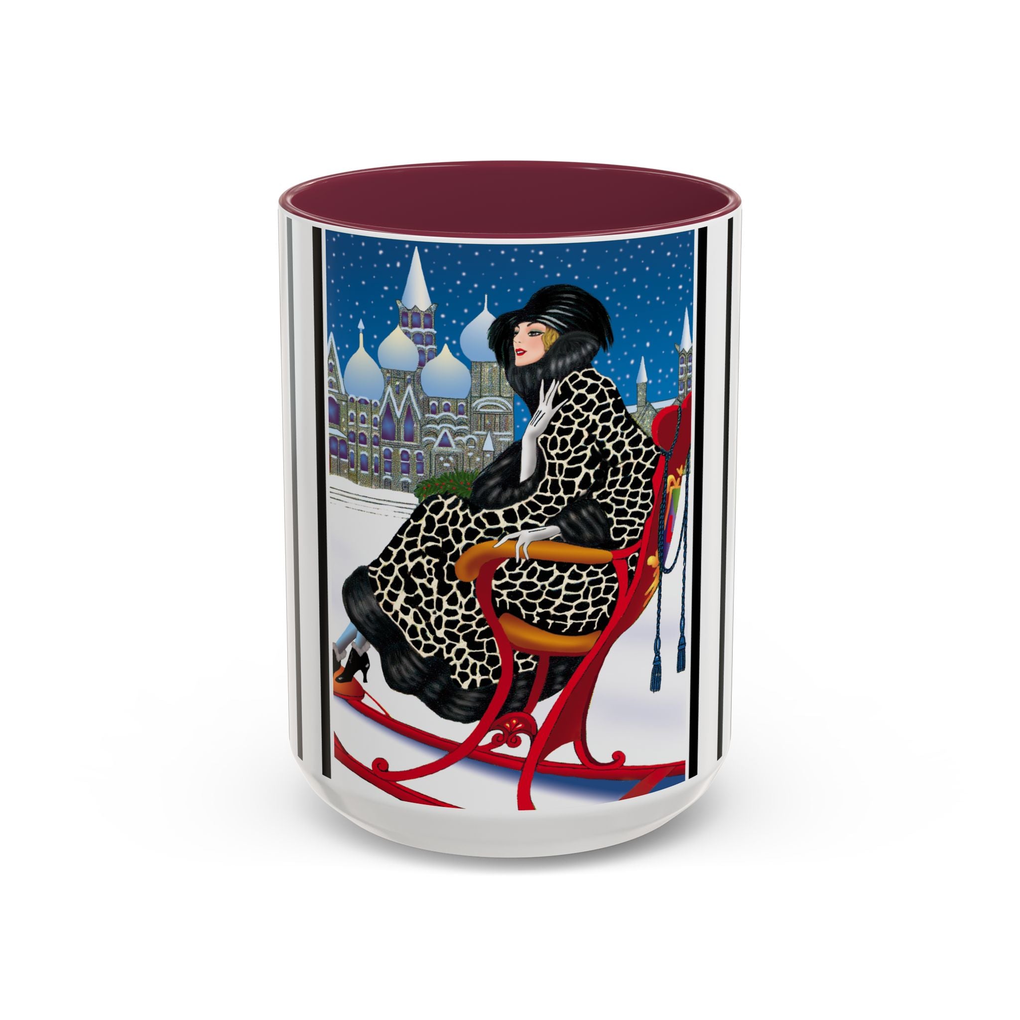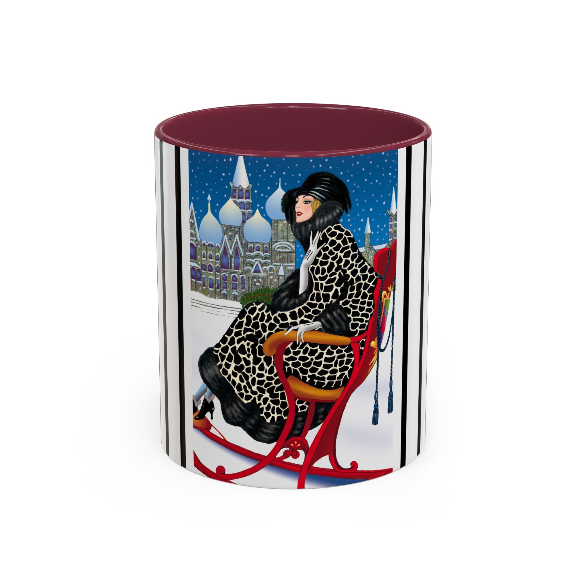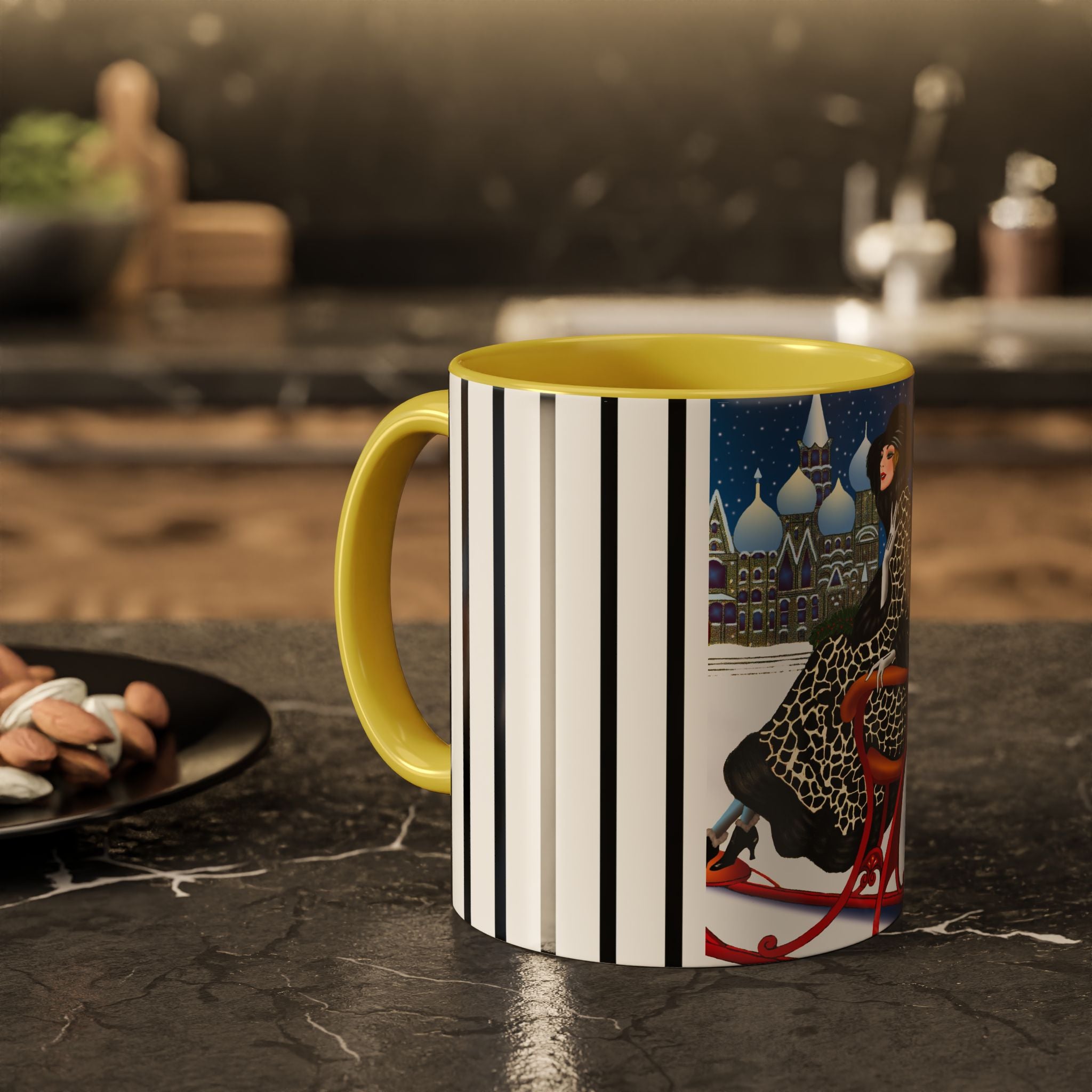 Start your mornings with a touch of winter glamour. The Elegant Winter Woman in Sleigh Colorful Mug transforms an everyday essential into a celebration of art and style. Wrapped around each mug is a stunning holiday scene: a sophisticated woman draped in a dramatic black-and-white patterned fur coat, complete with matching hat and gloves, sits gracefully in a vivid red sleigh. Behind her, whimsical snow-dusted towers sparkle beneath a deep blue night sky as snow falls gently all around. Her confident poise, chic high-heeled boots, and the enchanting backdrop create a timeless moment of elegance and festive allure.