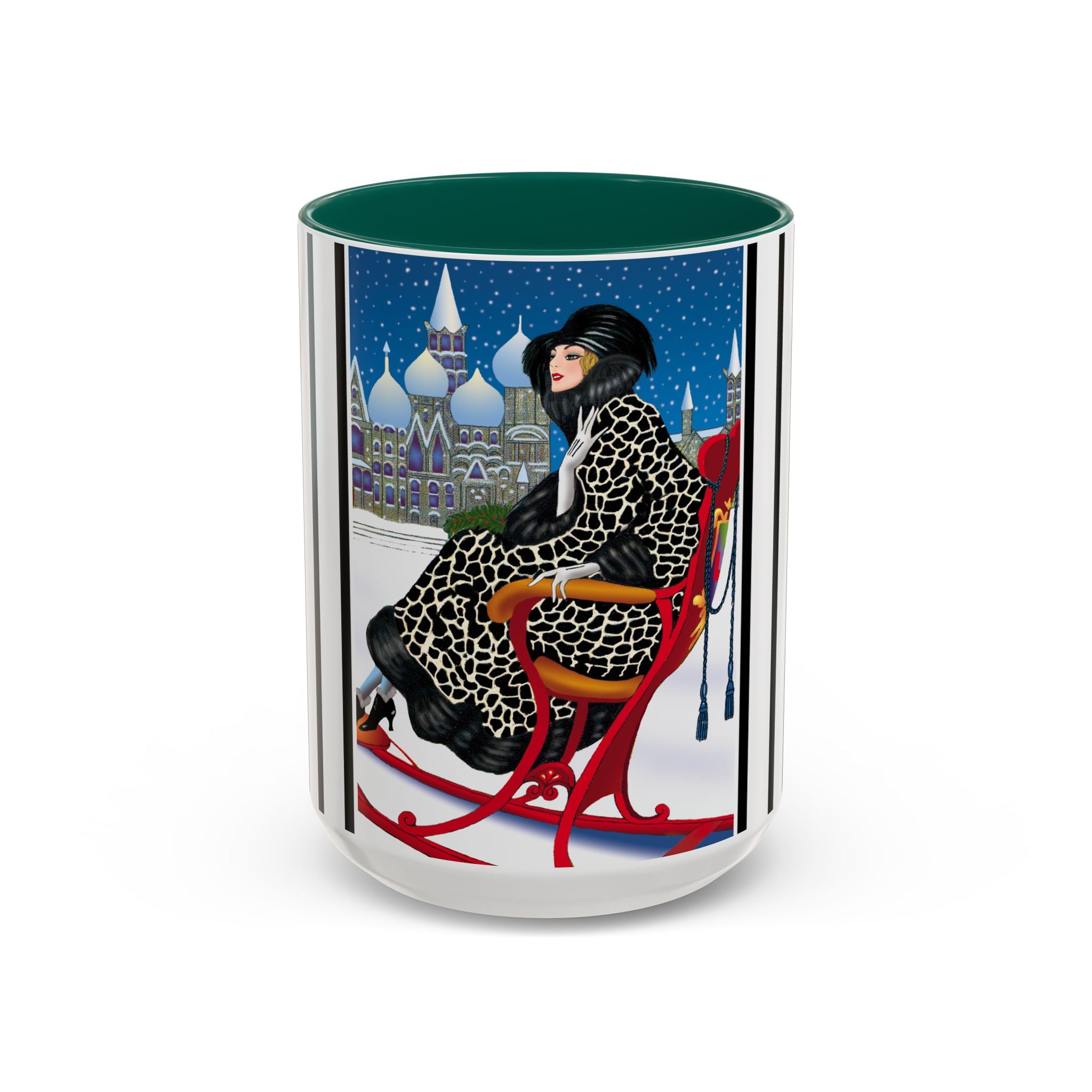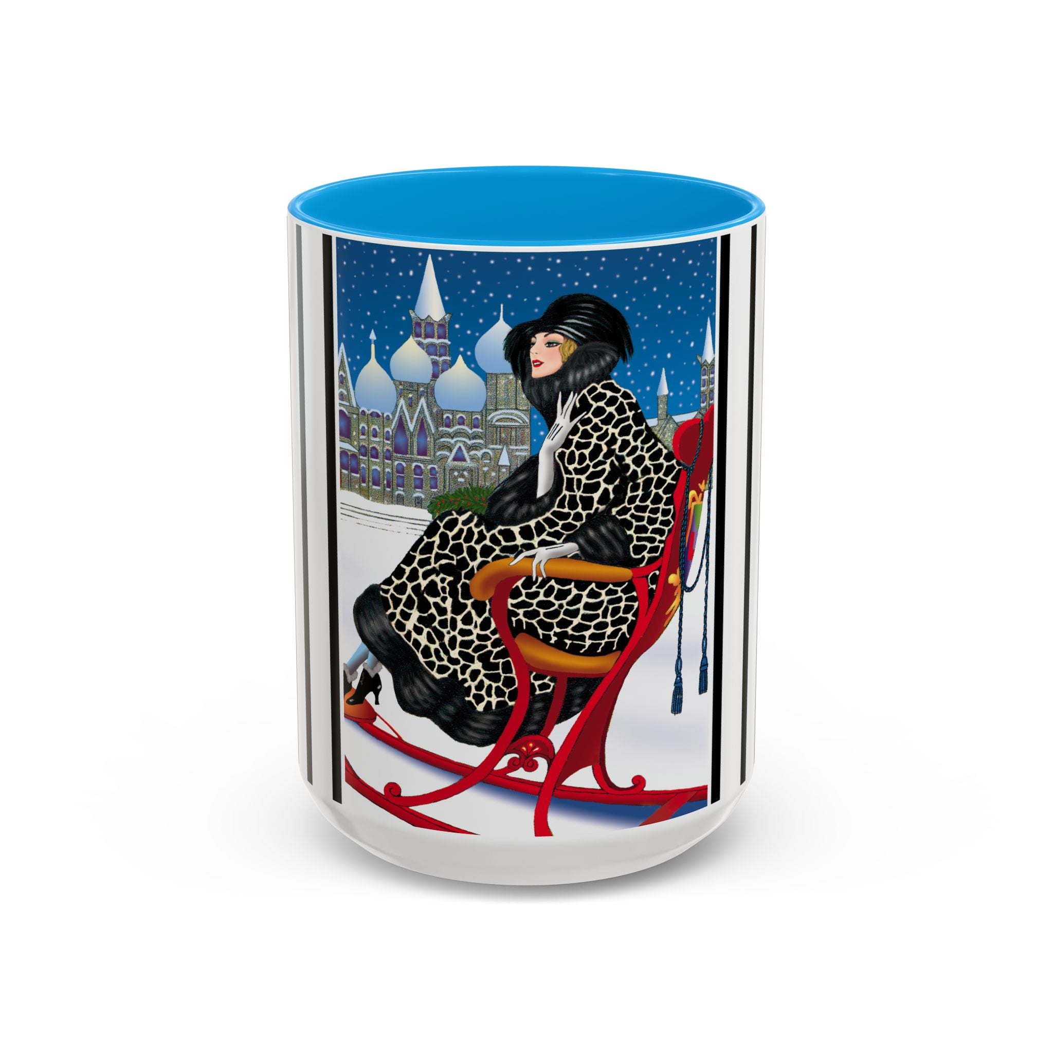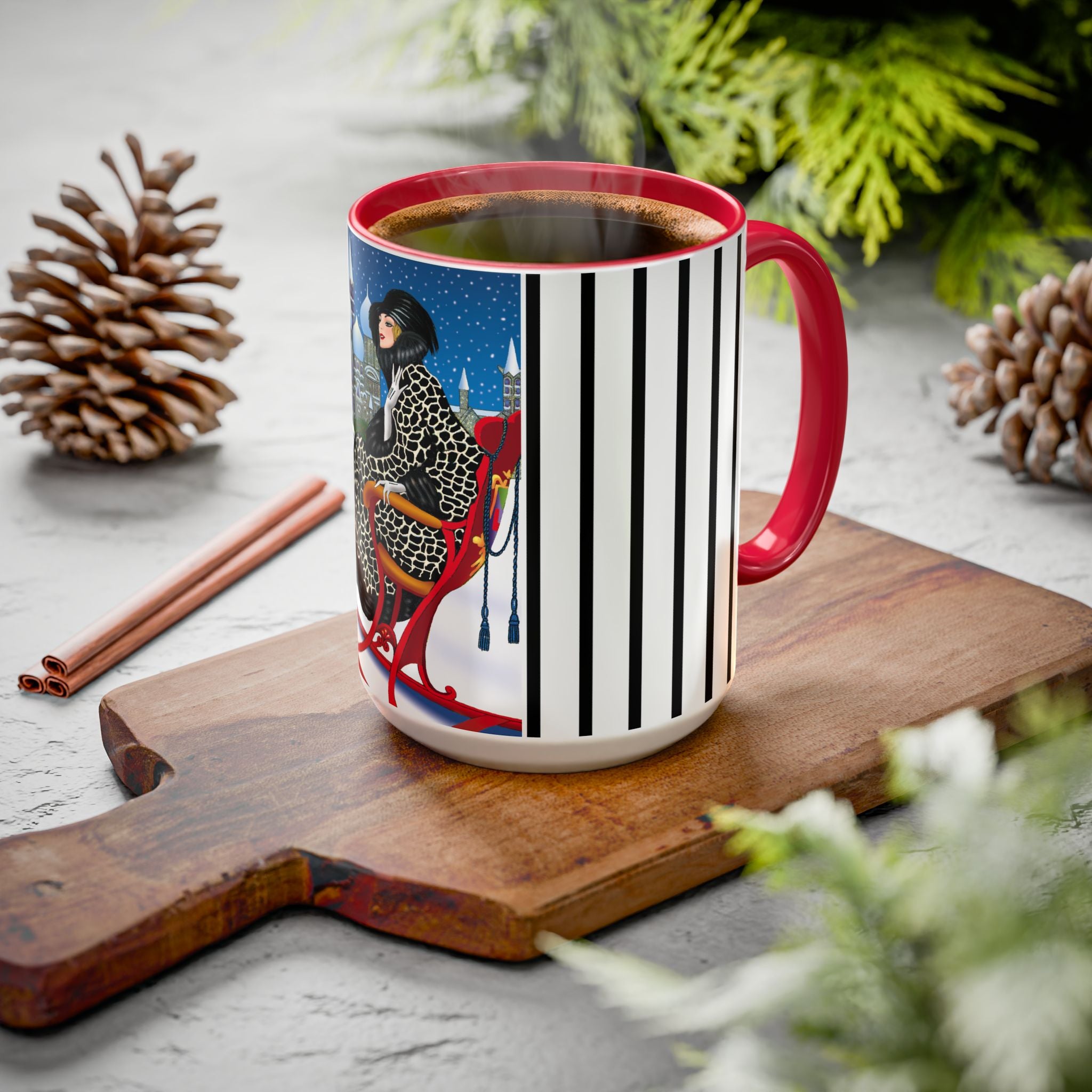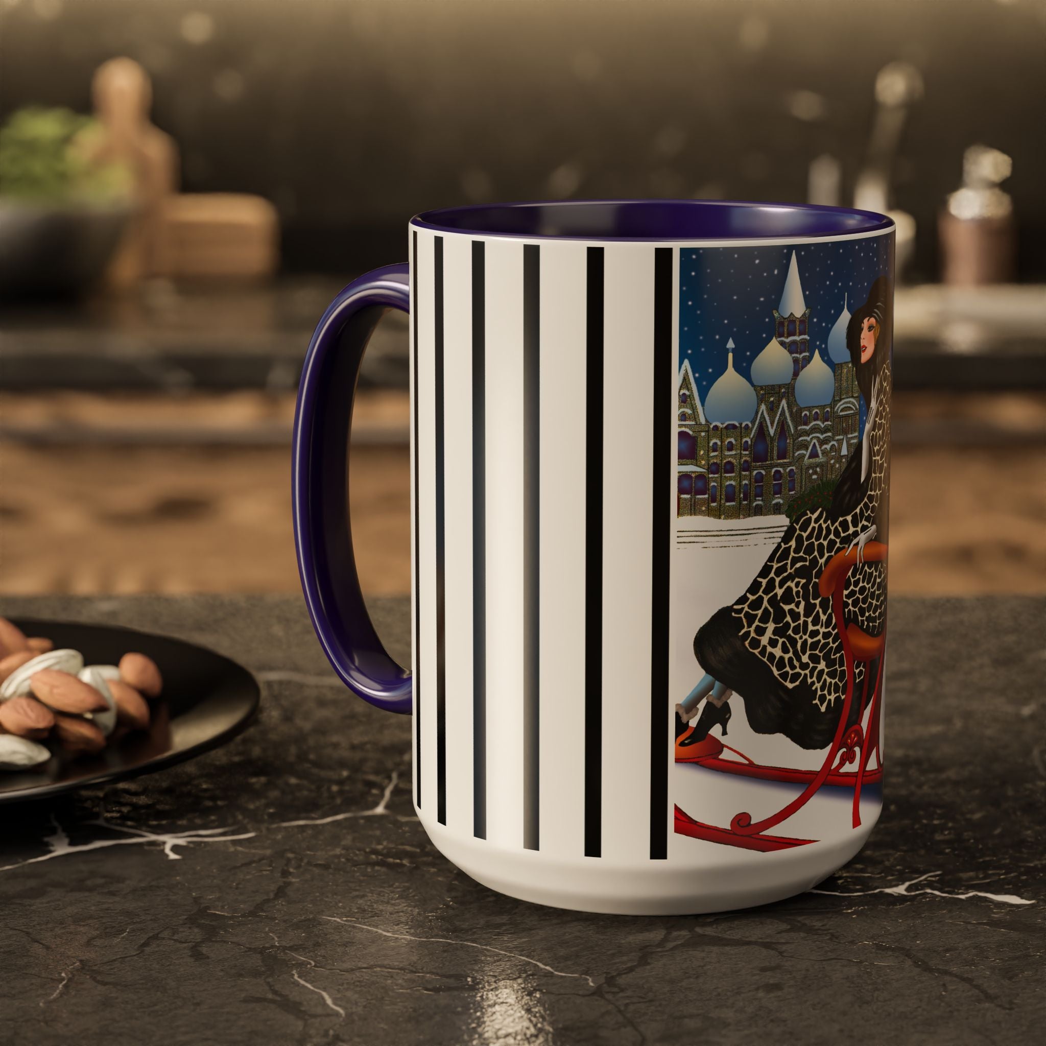 Start your mornings with a touch of winter glamour. The Elegant Winter Woman in Sleigh Colorful Mug transforms an everyday essential into a celebration of art and style. Wrapped around each mug is a stunning holiday scene: a sophisticated woman draped in a dramatic black-and-white patterned fur coat, complete with matching hat and gloves, sits gracefully in a vivid red sleigh. Behind her, whimsical snow-dusted towers sparkle beneath a deep blue night sky as snow falls gently all around. Her confident poise, chic high-heeled boots, and the enchanting backdrop create a timeless moment of elegance and festive allure.