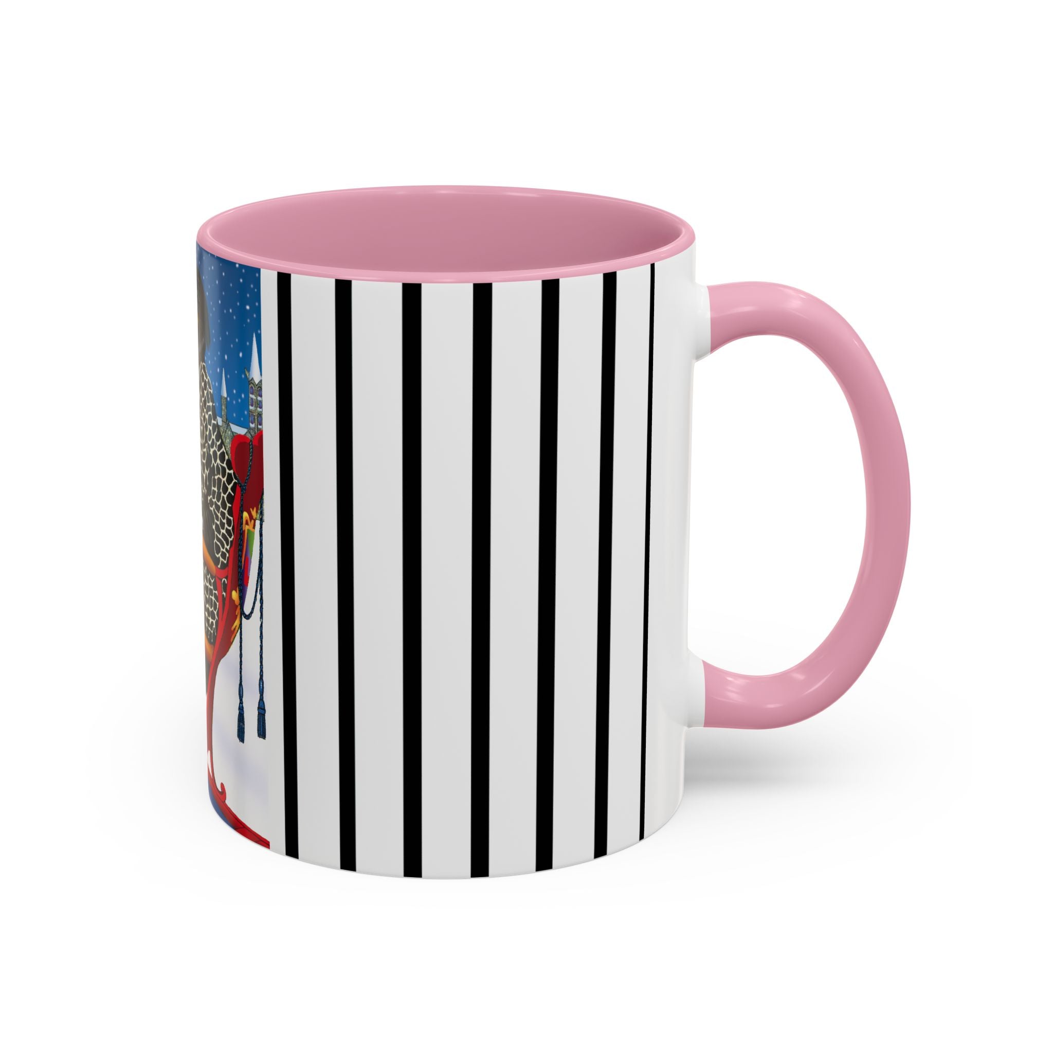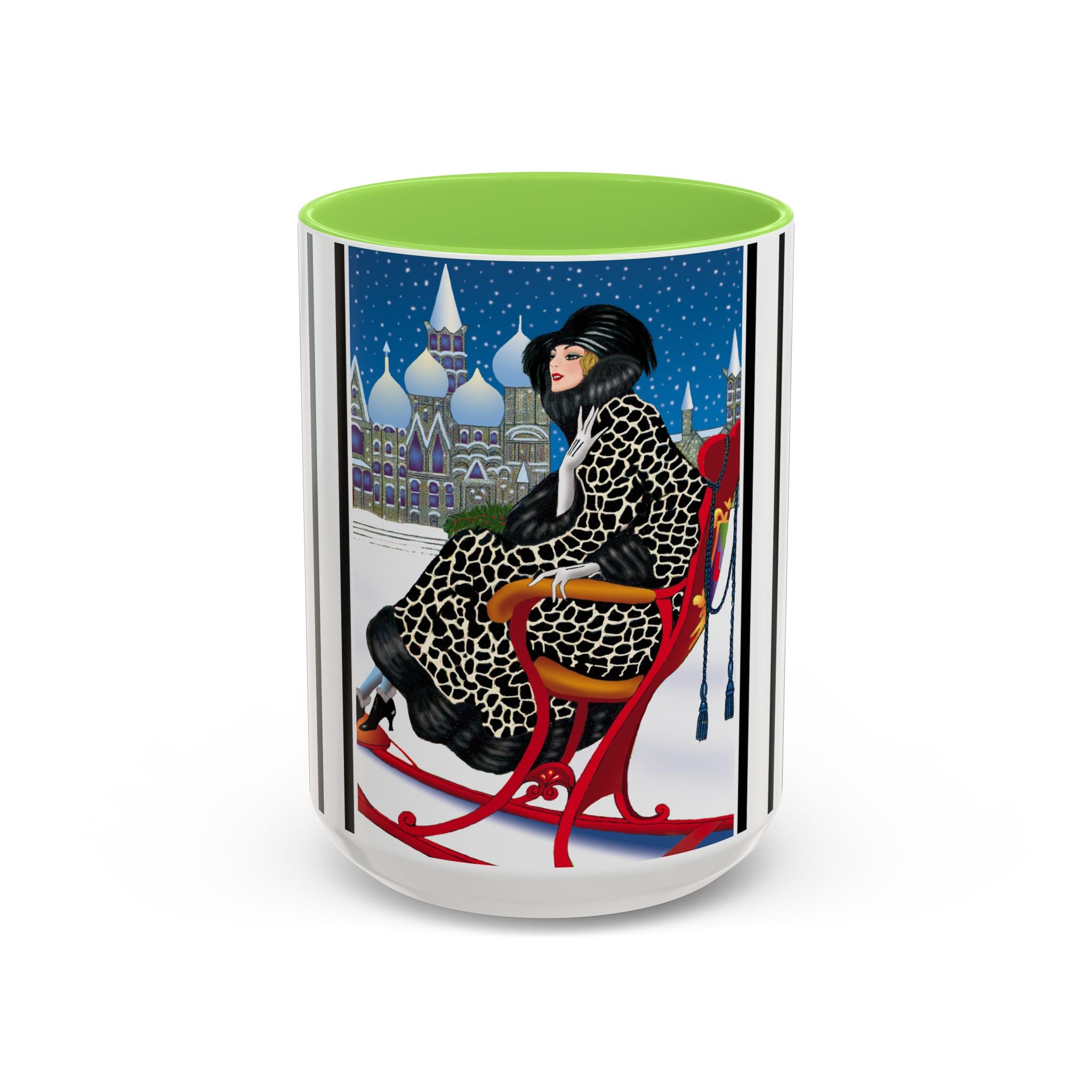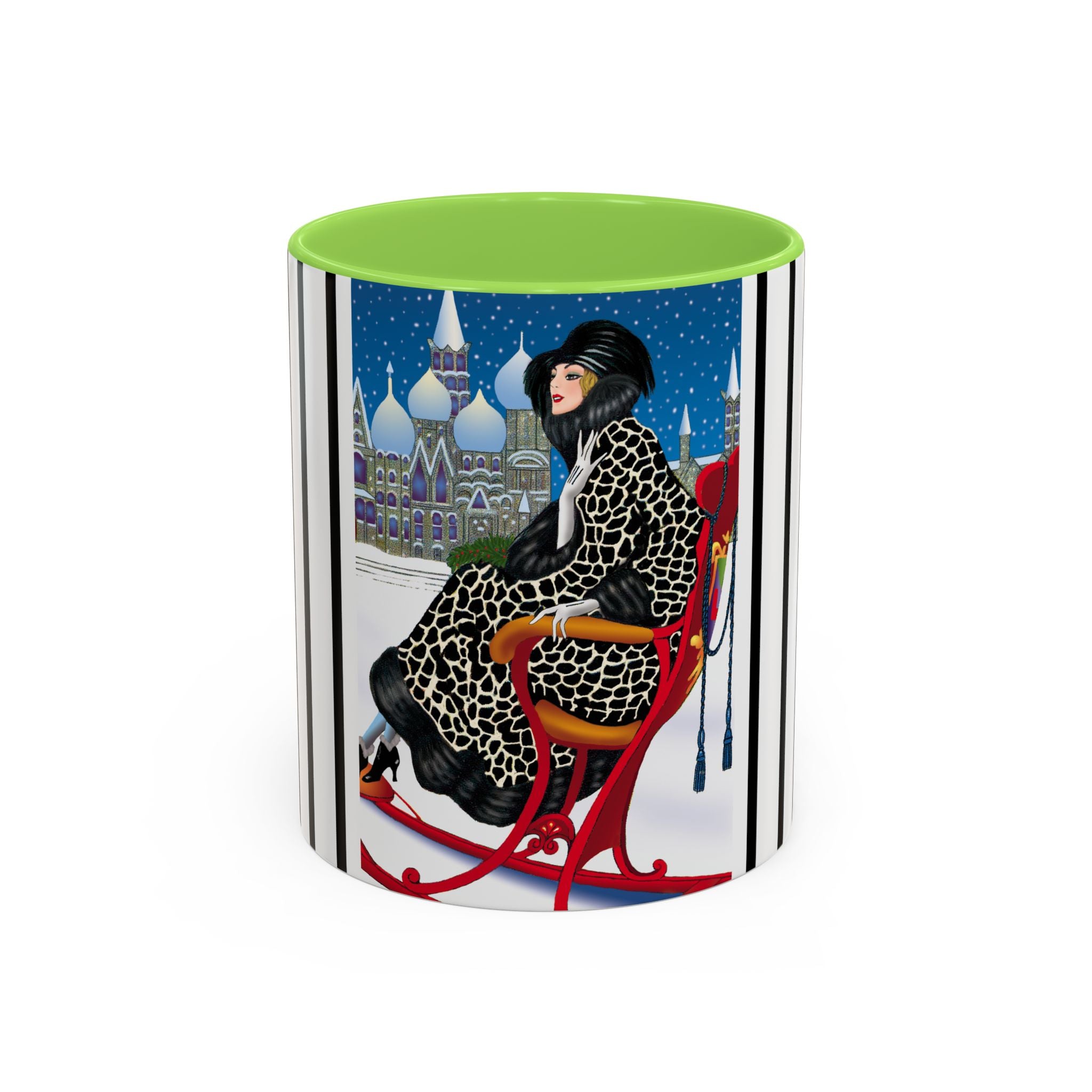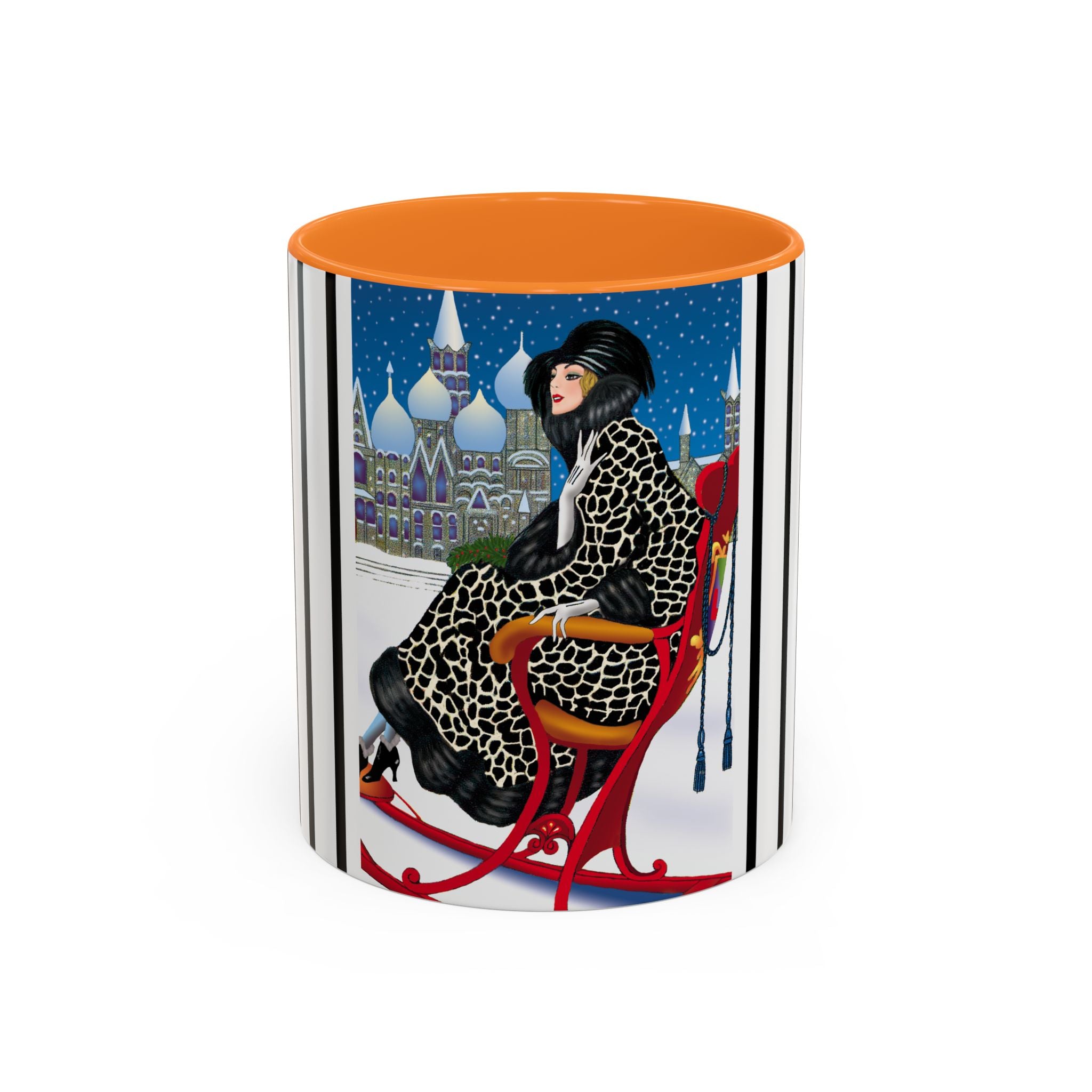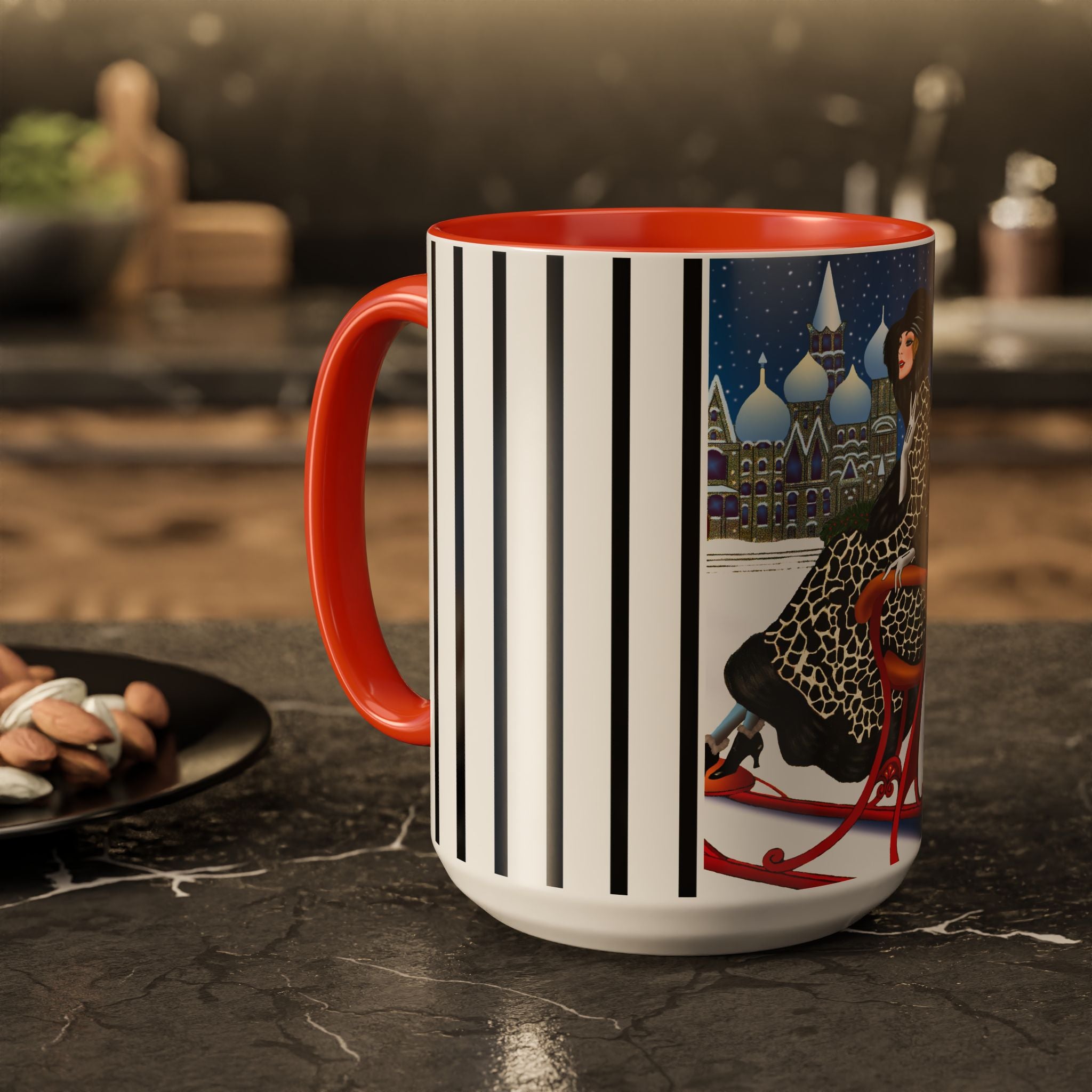 Start your mornings with a touch of winter glamour. The Elegant Winter Woman in Sleigh Colorful Mug transforms an everyday essential into a celebration of art and style. Wrapped around each mug is a stunning holiday scene: a sophisticated woman draped in a dramatic black-and-white patterned fur coat, complete with matching hat and gloves, sits gracefully in a vivid red sleigh. Behind her, whimsical snow-dusted towers sparkle beneath a deep blue night sky as snow falls gently all around. Her confident poise, chic high-heeled boots, and the enchanting backdrop create a timeless moment of elegance and festive allure.