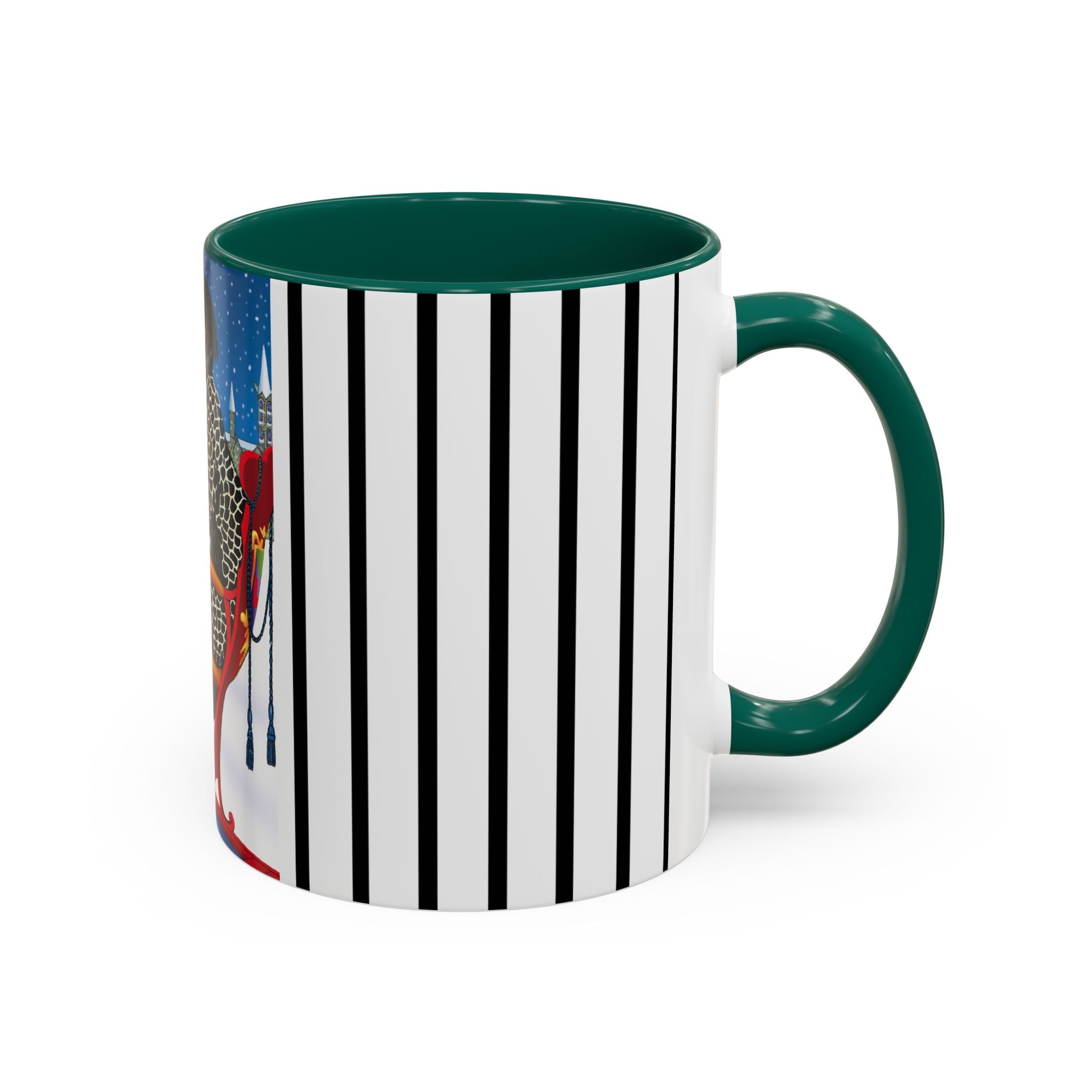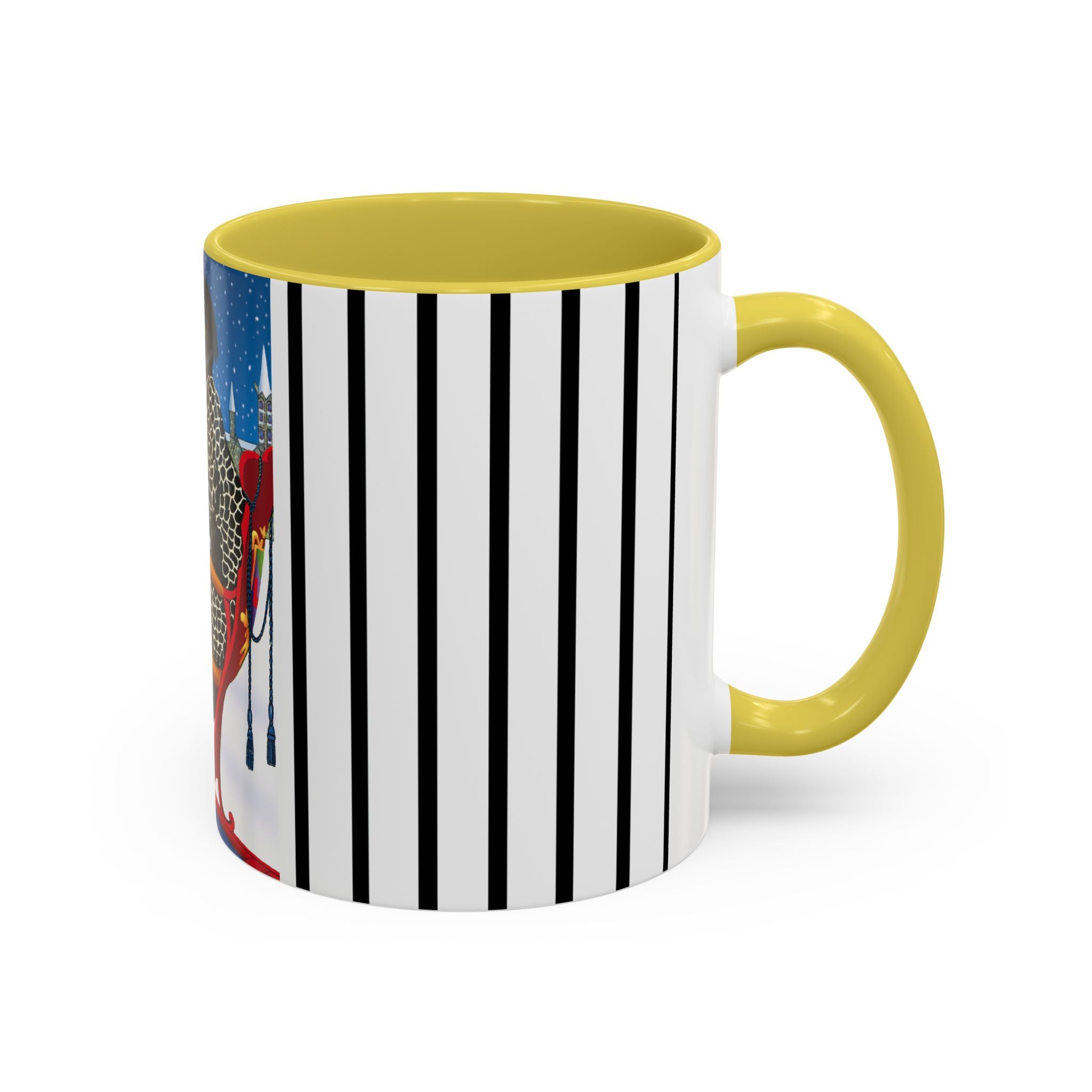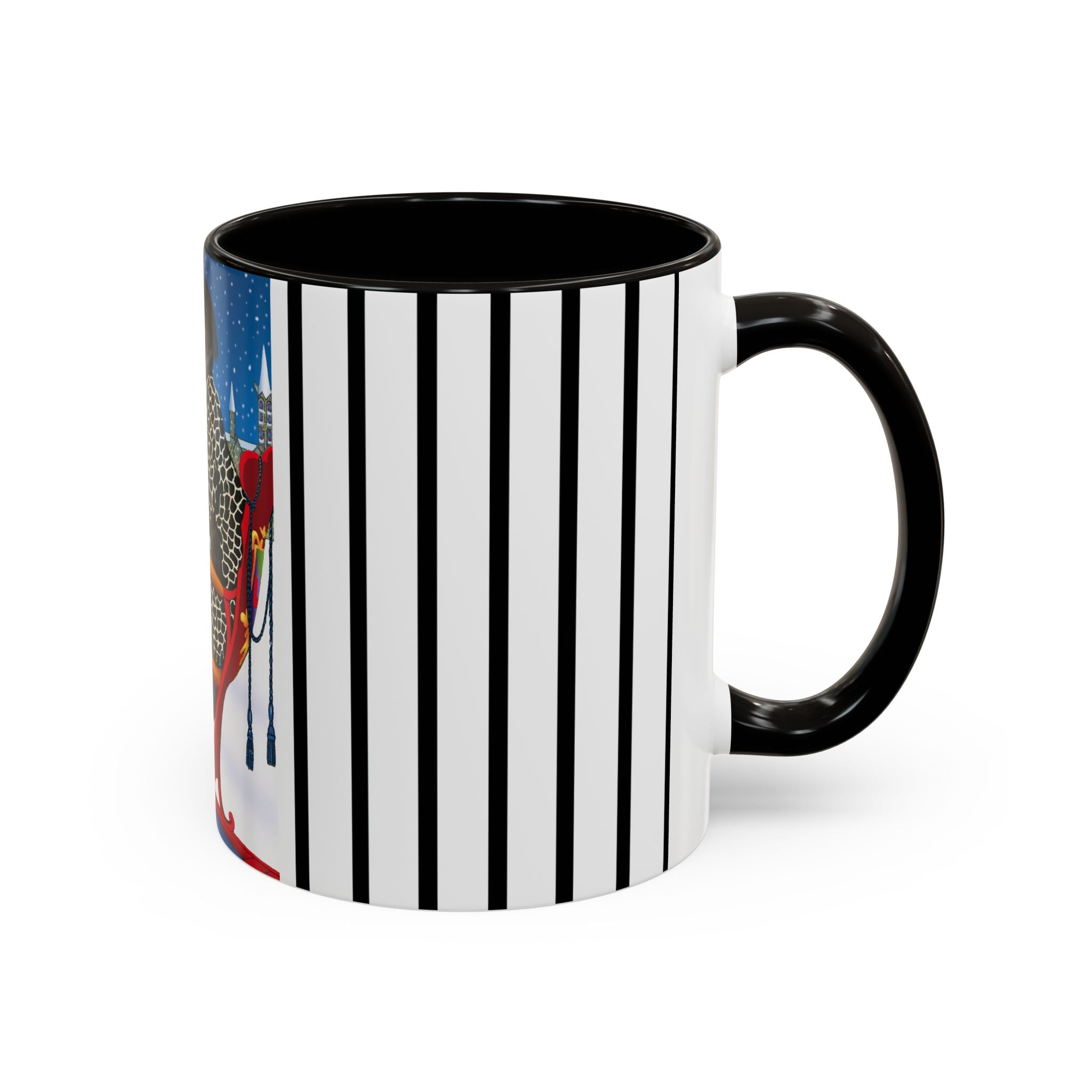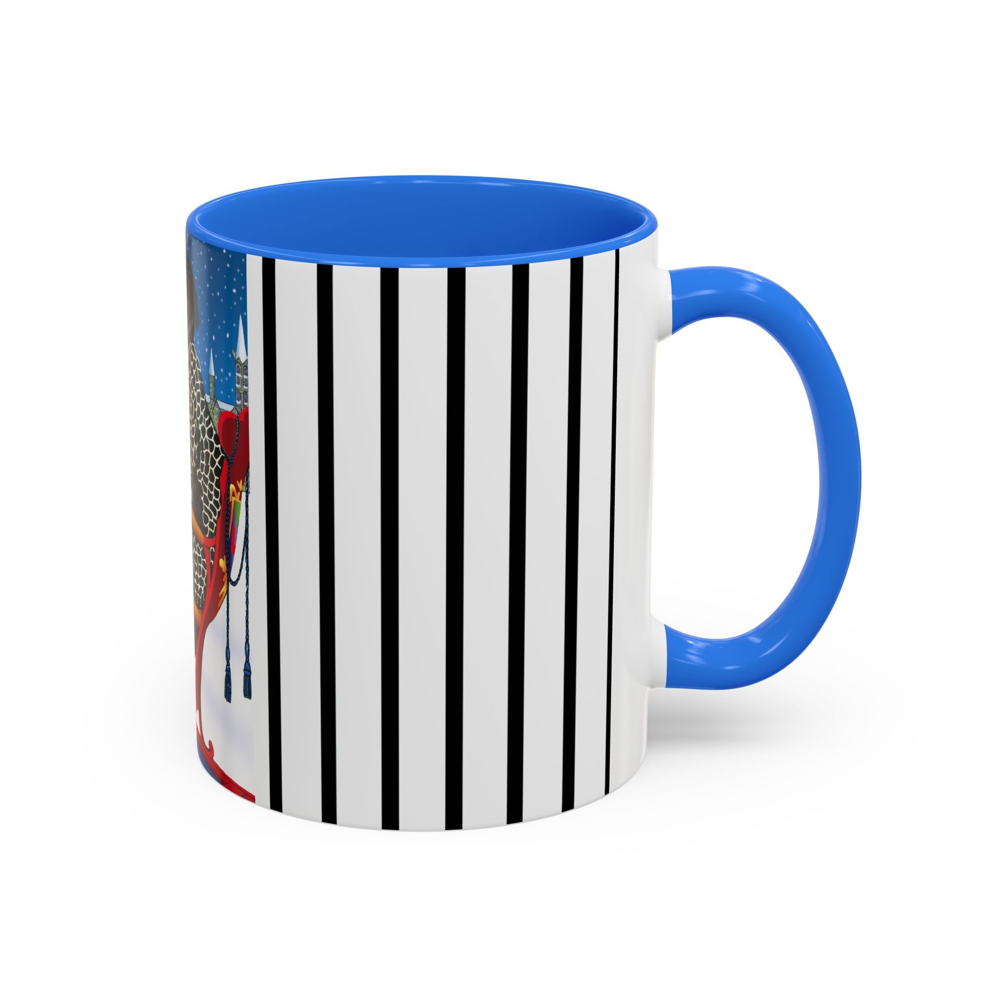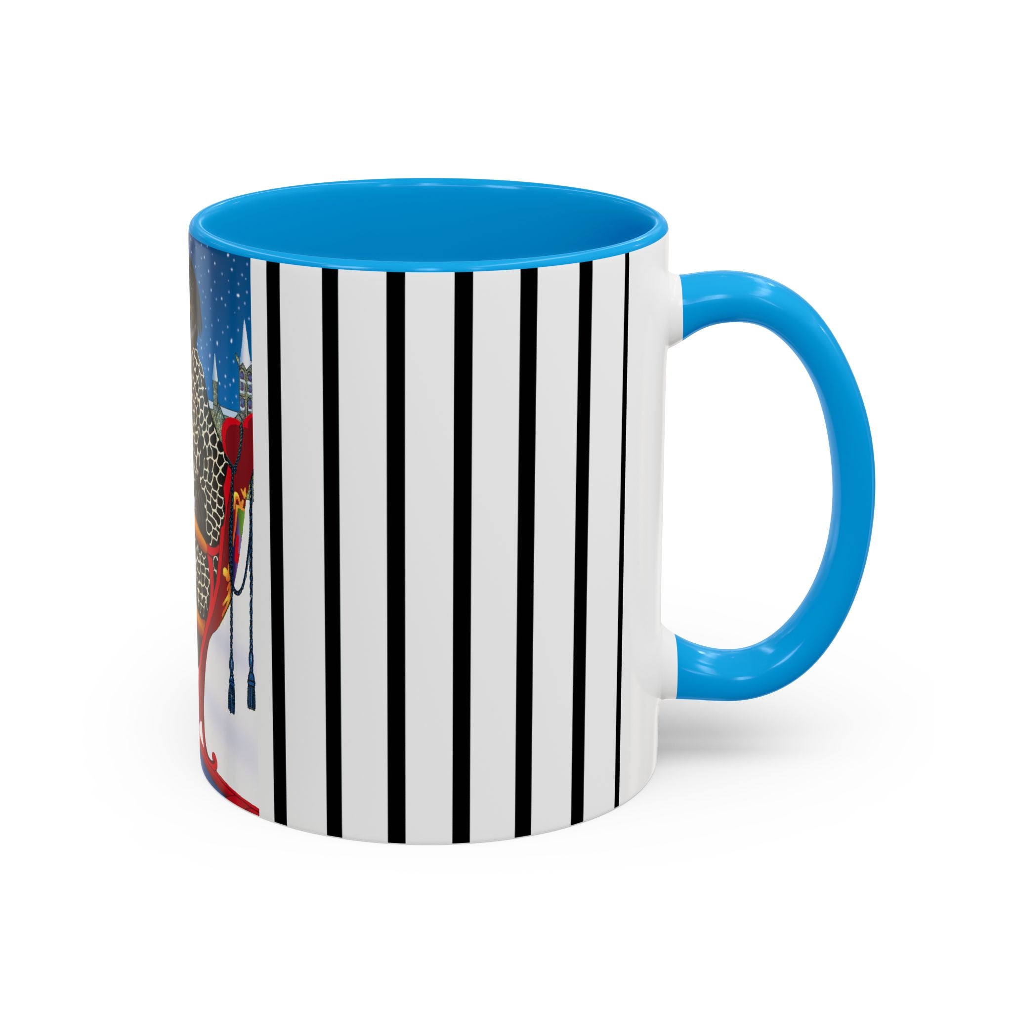 Start your mornings with a touch of winter glamour. The Elegant Winter Woman in Sleigh Colorful Mug transforms an everyday essential into a celebration of art and style. Wrapped around each mug is a stunning holiday scene: a sophisticated woman draped in a dramatic black-and-white patterned fur coat, complete with matching hat and gloves, sits gracefully in a vivid red sleigh. Behind her, whimsical snow-dusted towers sparkle beneath a deep blue night sky as snow falls gently all around. Her confident poise, chic high-heeled boots, and the enchanting backdrop create a timeless moment of elegance and festive allure.