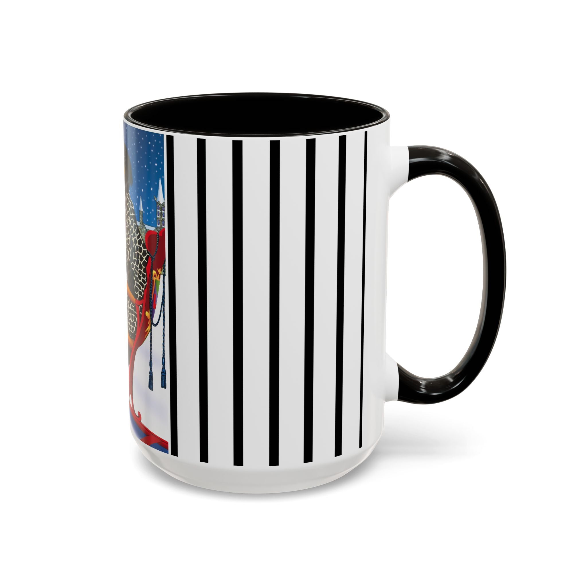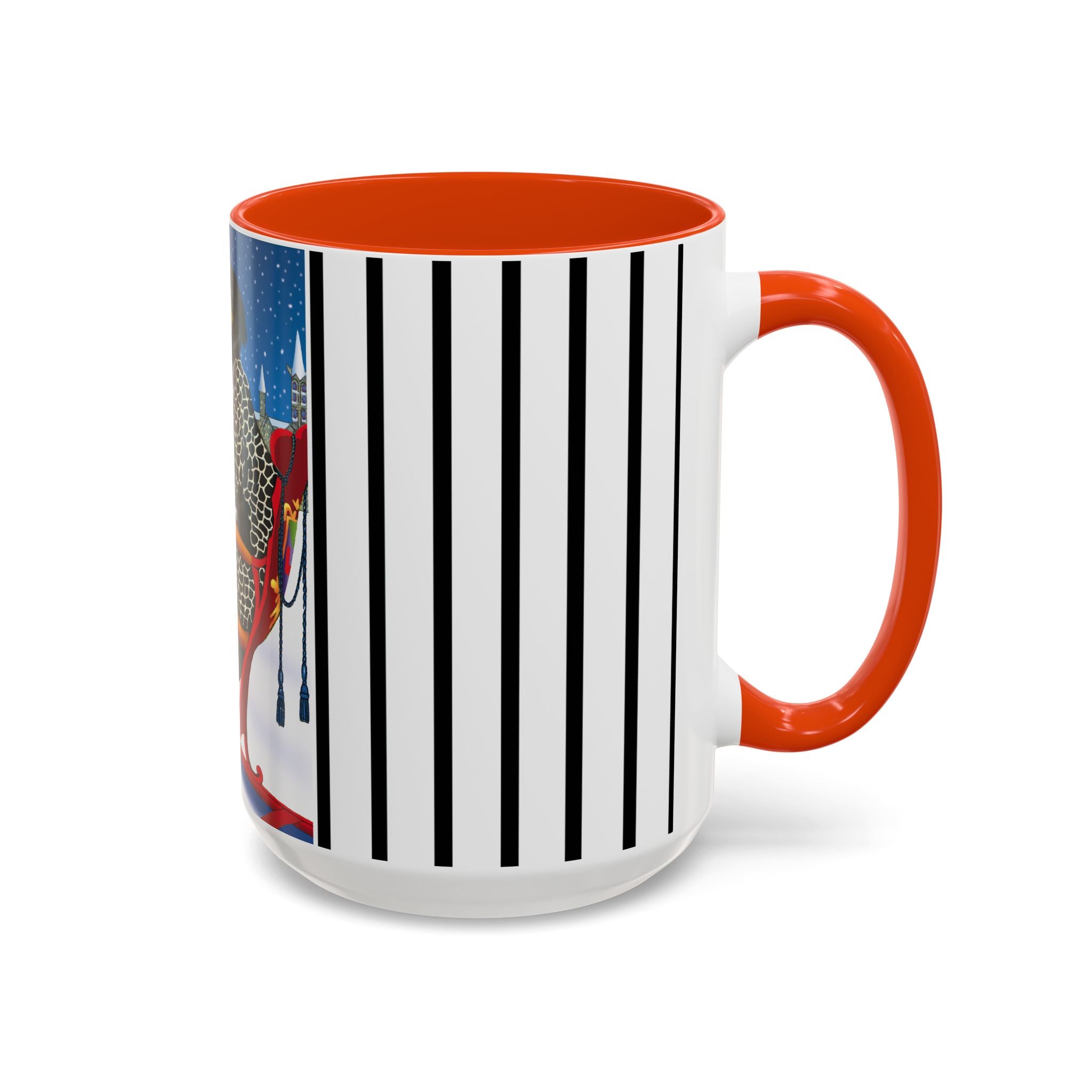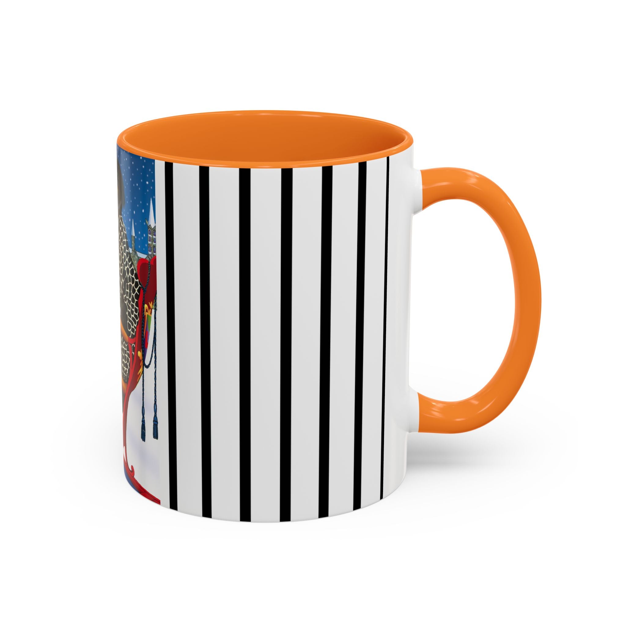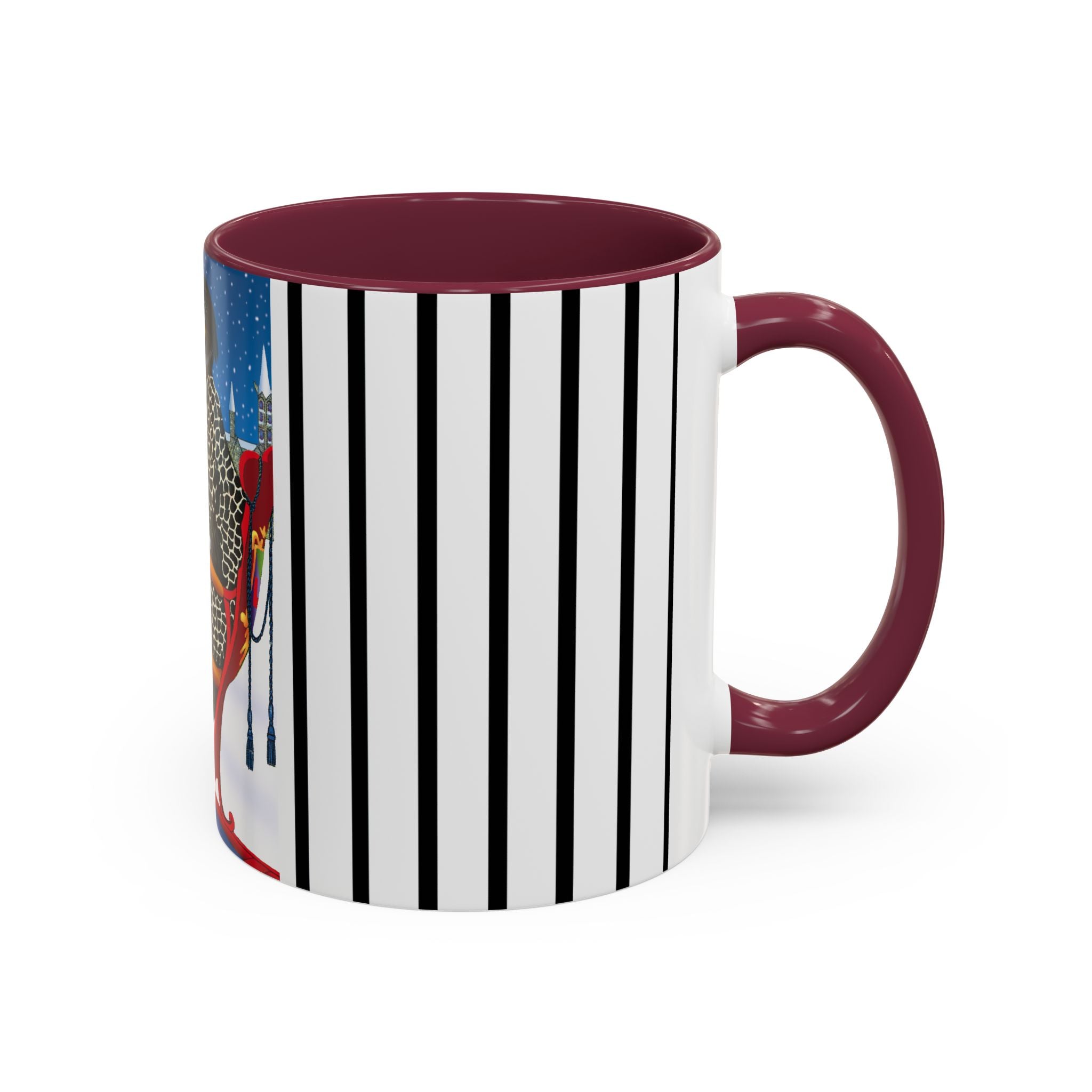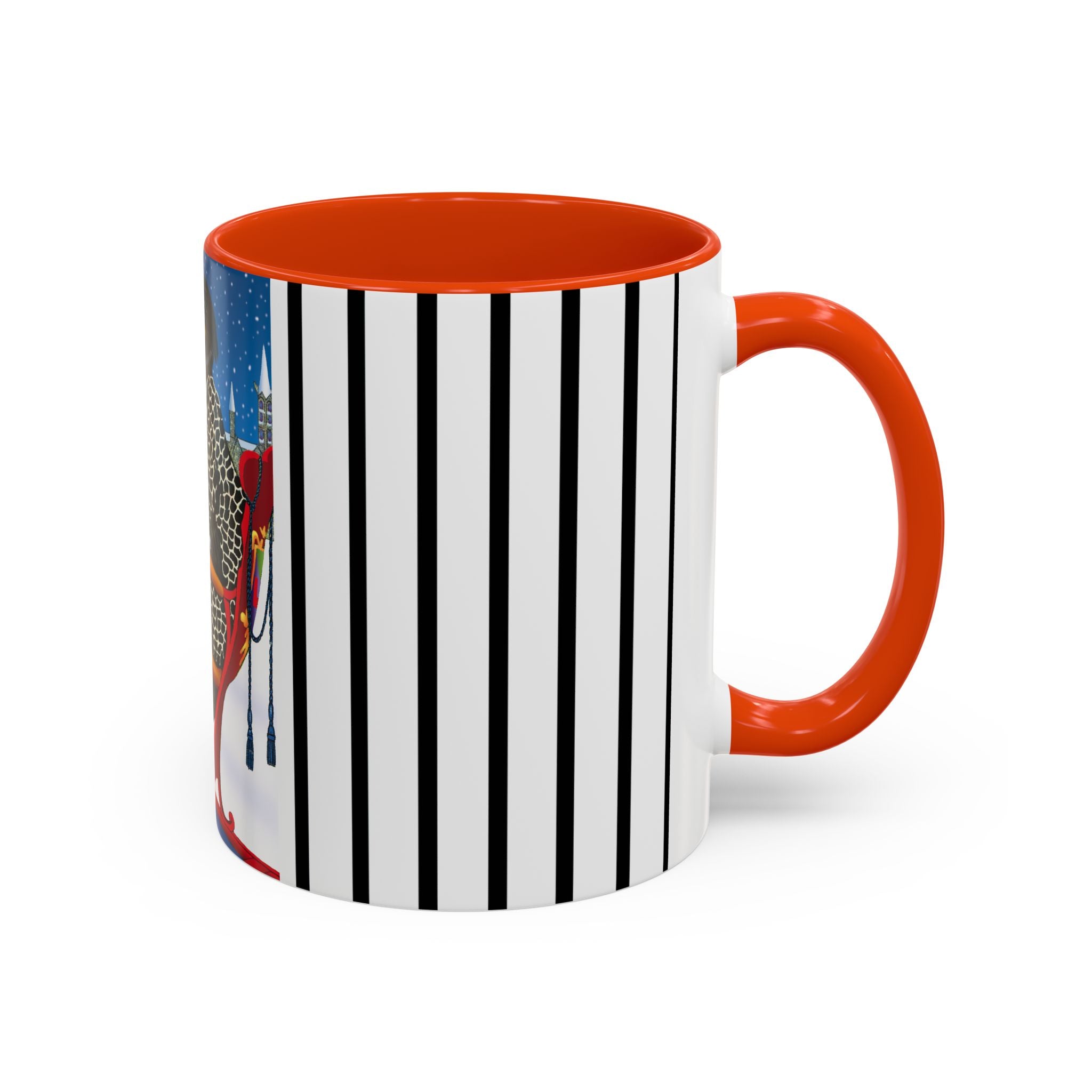 Start your mornings with a touch of winter glamour. The Elegant Winter Woman in Sleigh Colorful Mug transforms an everyday essential into a celebration of art and style. Wrapped around each mug is a stunning holiday scene: a sophisticated woman draped in a dramatic black-and-white patterned fur coat, complete with matching hat and gloves, sits gracefully in a vivid red sleigh. Behind her, whimsical snow-dusted towers sparkle beneath a deep blue night sky as snow falls gently all around. Her confident poise, chic high-heeled boots, and the enchanting backdrop create a timeless moment of elegance and festive allure.