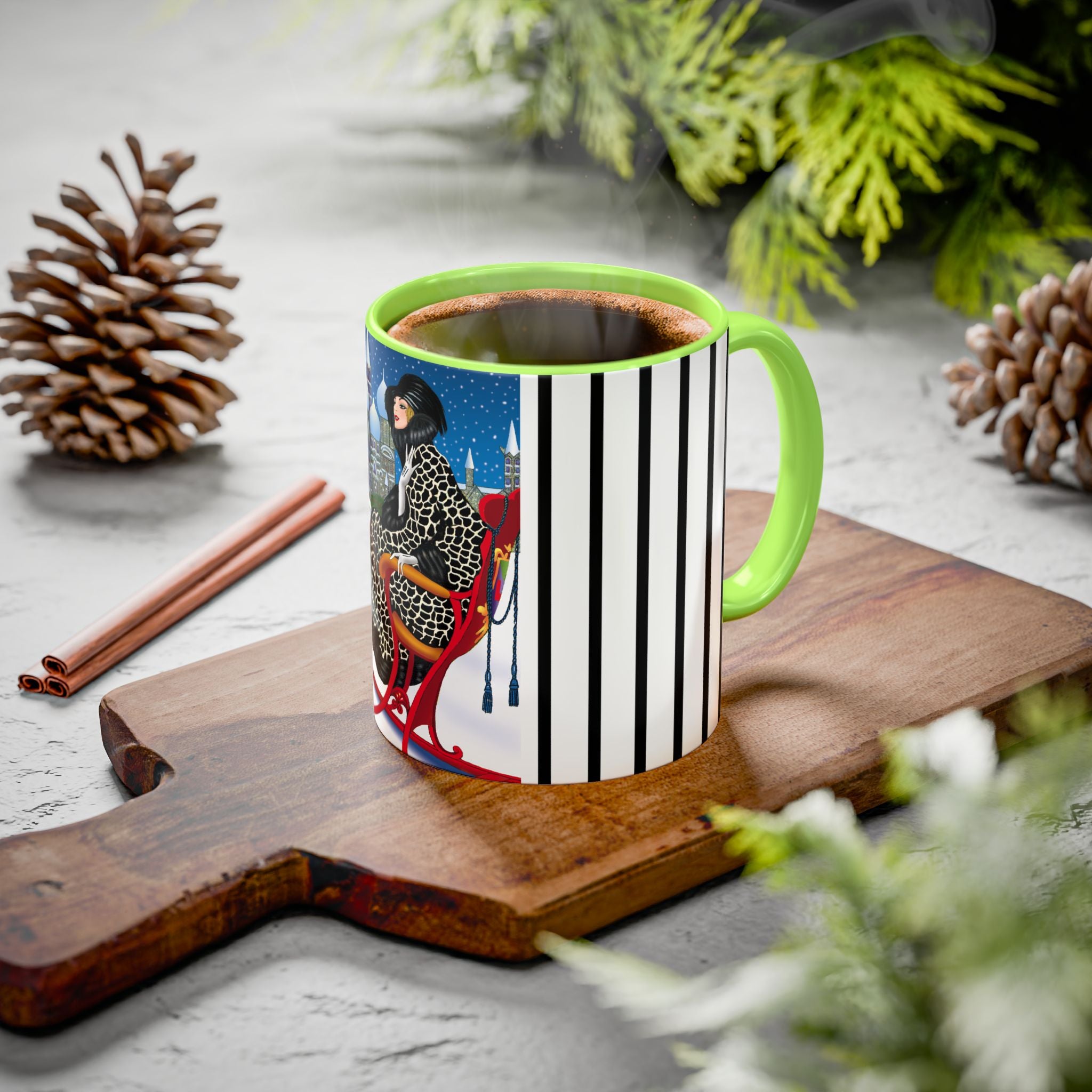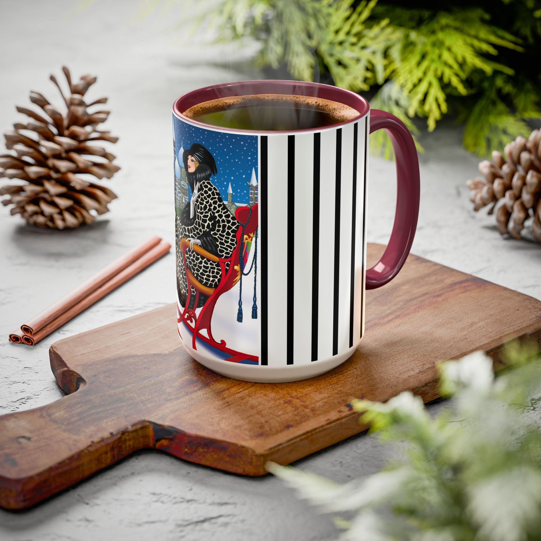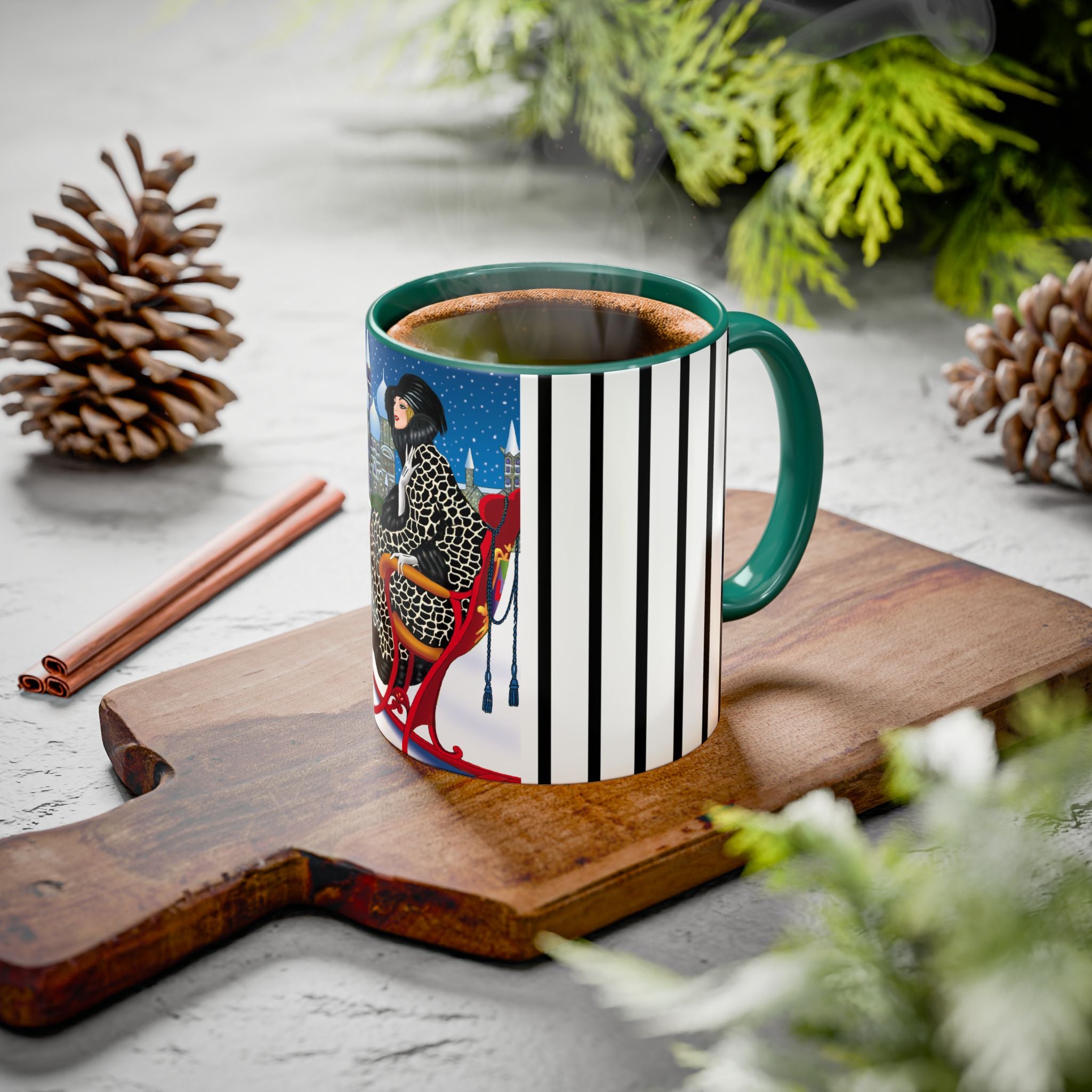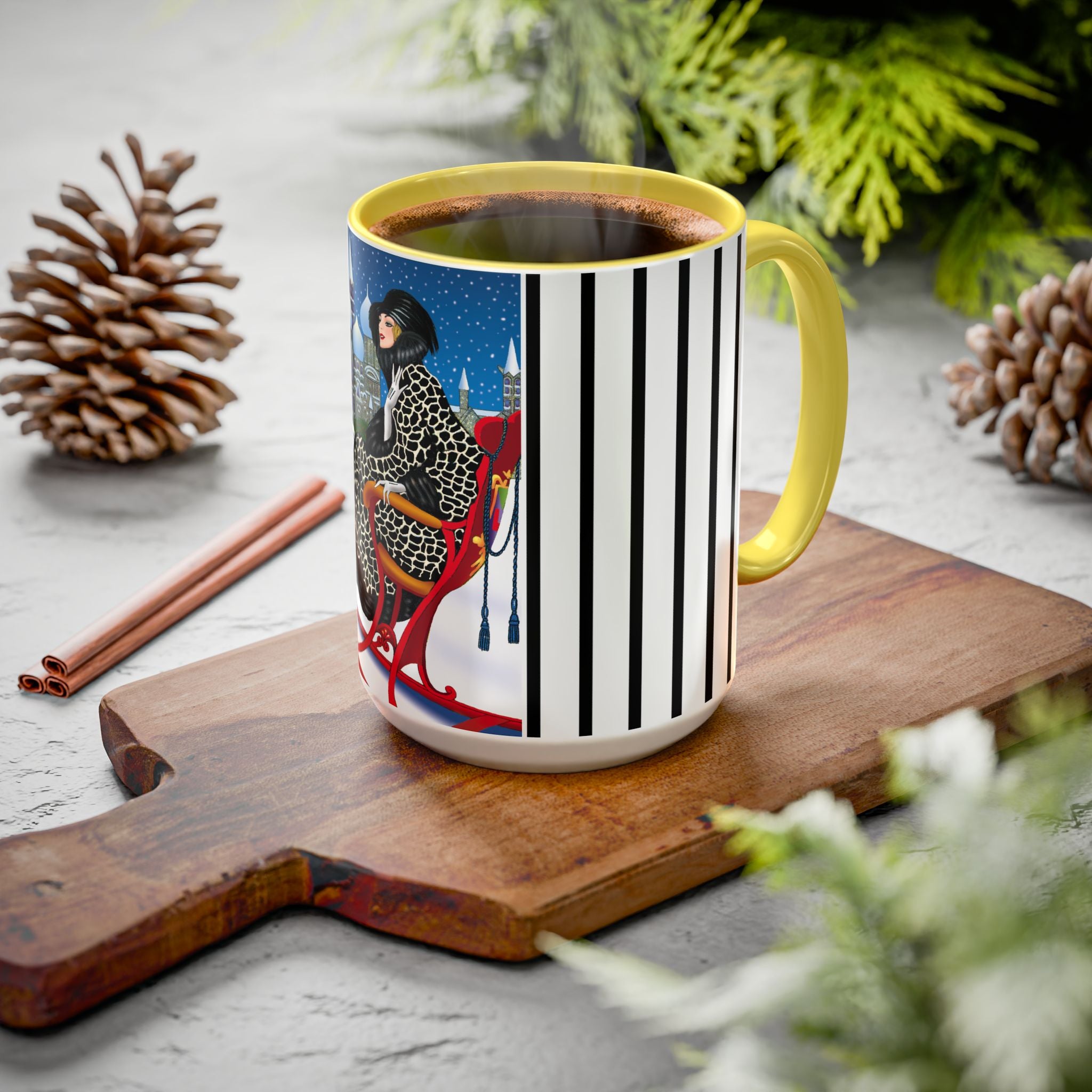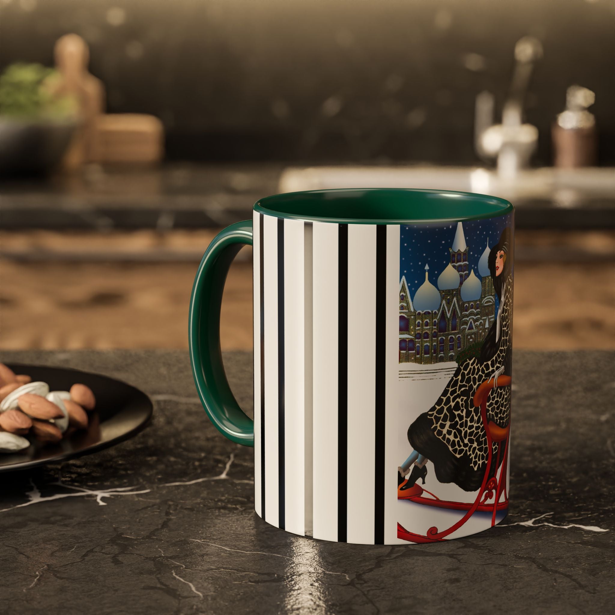 Available in 11oz and 15oz sizes and in 12 different color options, these mugs feature a colored handle and interior that accent the artwork beautifully. The glossy finish enhances the high-fidelity print, making every detail— from the shimmering skyline to the graceful winter figure—shine with vivid clarity. Durable, stylish, and practical, they’re perfect for coffee, tea, or cocoa on cozy winter mornings.
