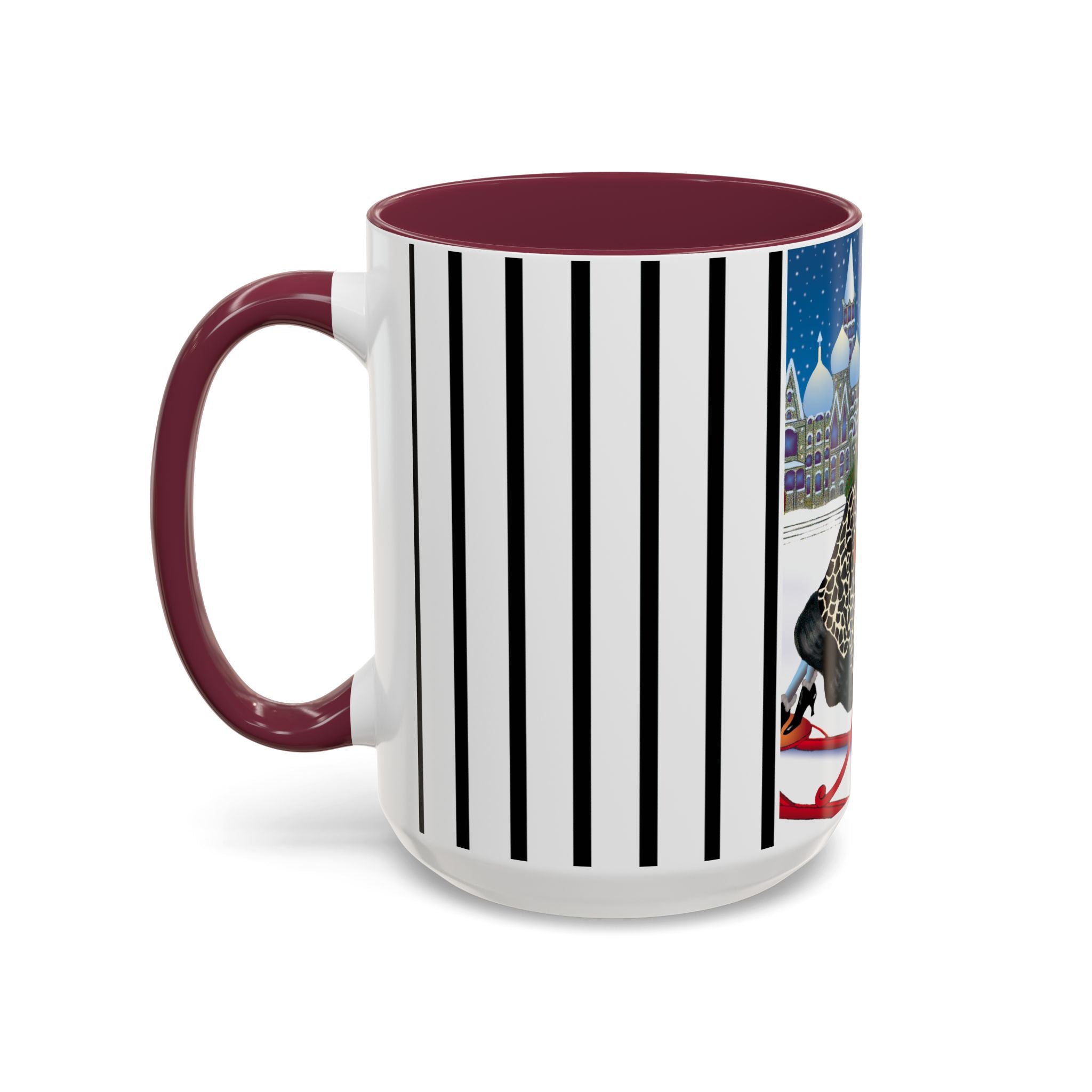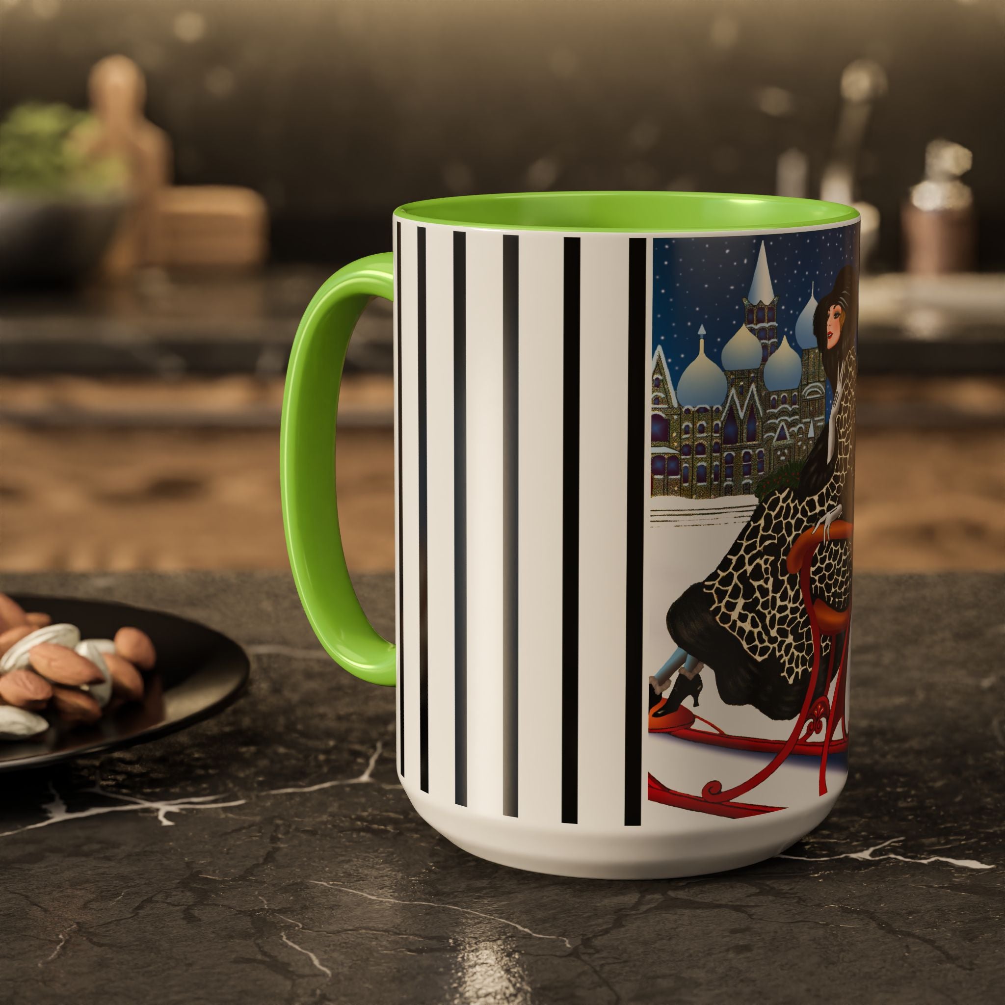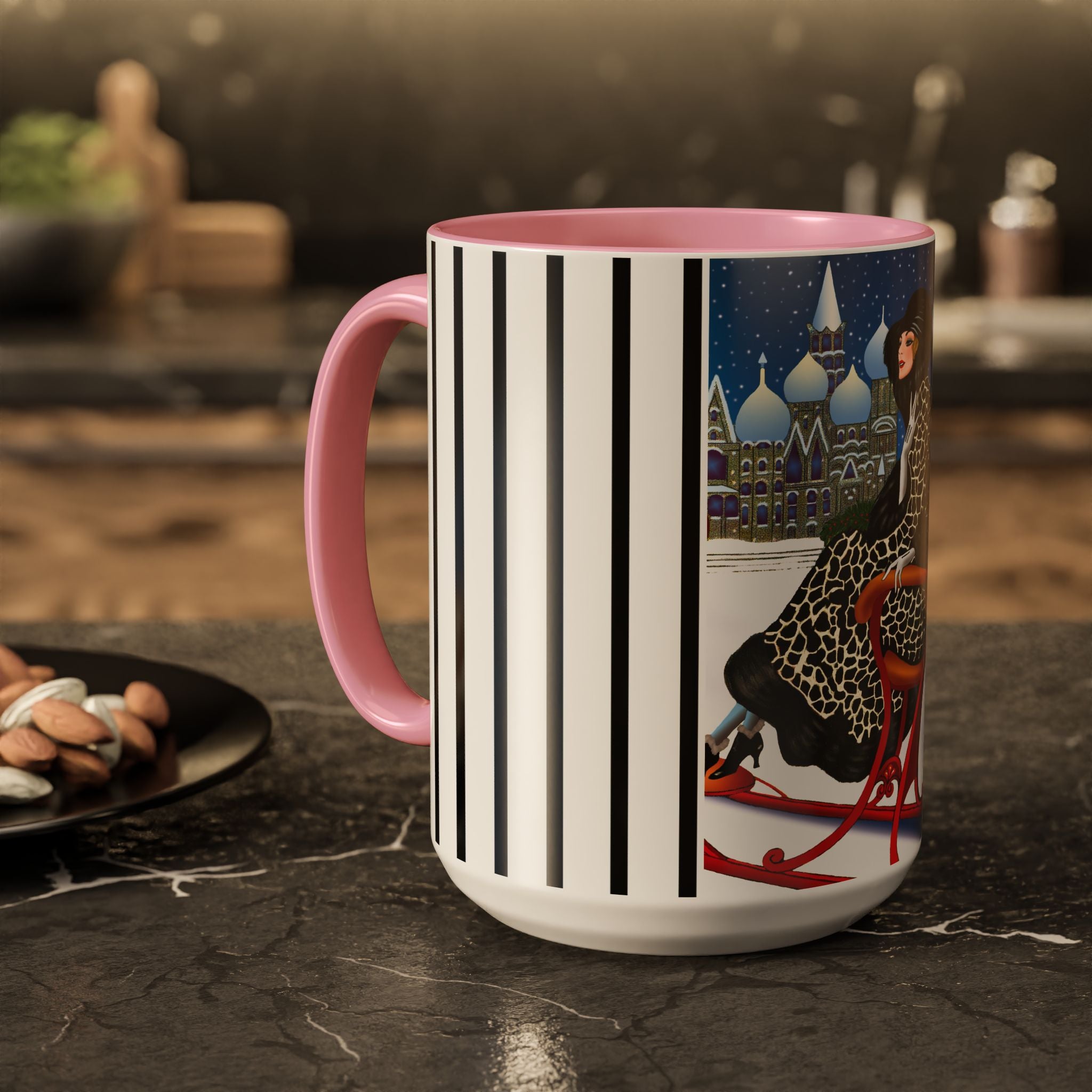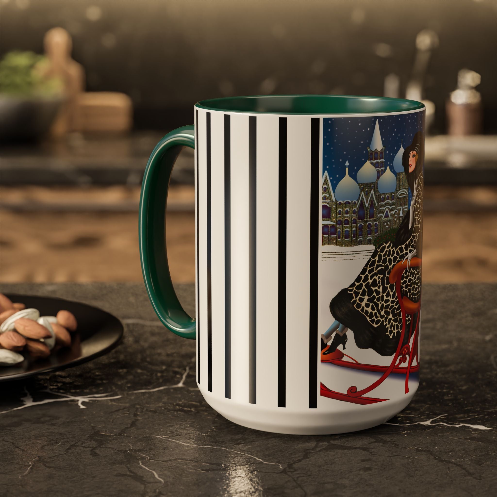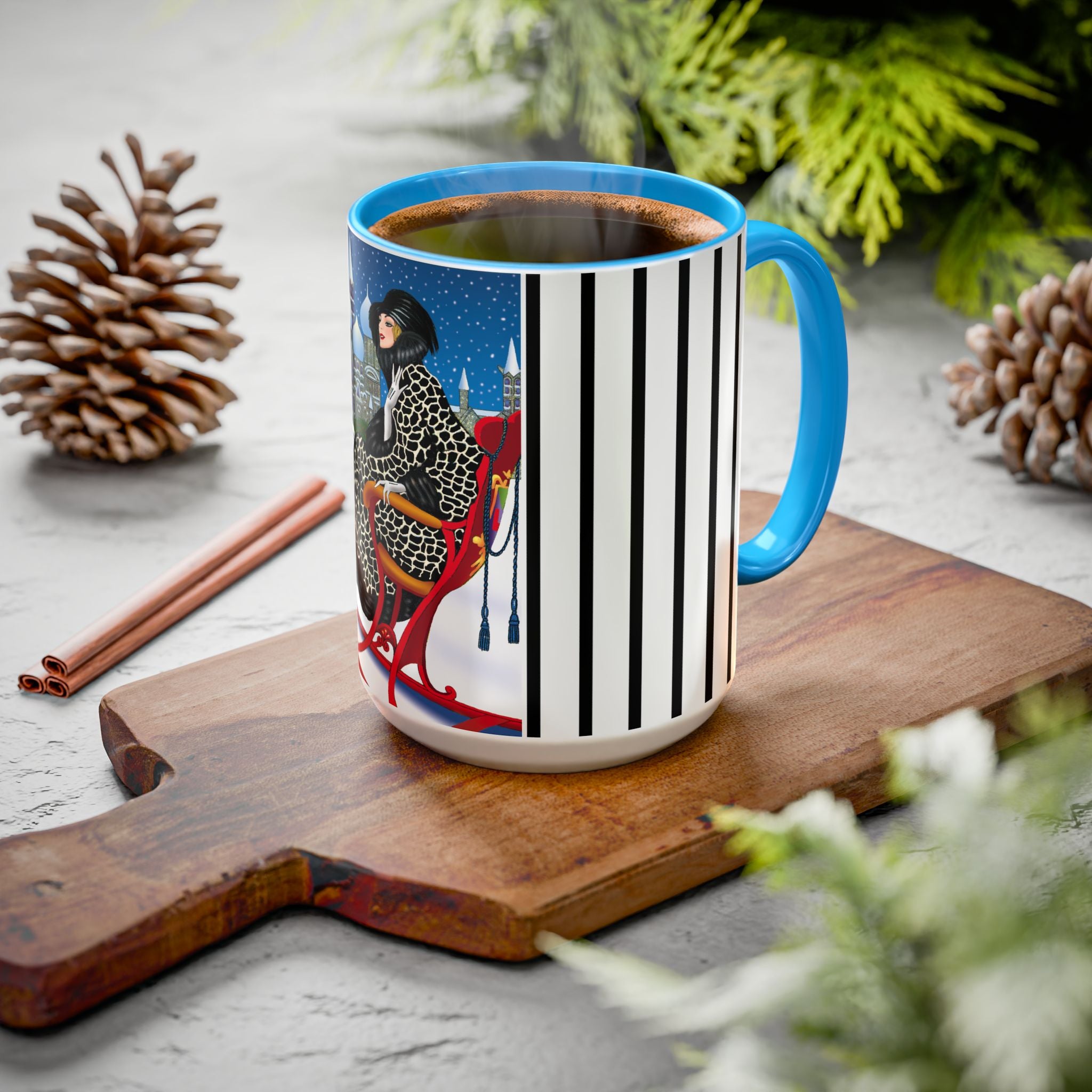 Available in 11oz and 15oz sizes and in 12 different color options, these mugs feature a colored handle and interior that accent the artwork beautifully. The glossy finish enhances the high-fidelity print, making every detail— from the shimmering skyline to the graceful winter figure—shine with vivid clarity. Durable, stylish, and practical, they’re perfect for coffee, tea, or cocoa on cozy winter mornings.