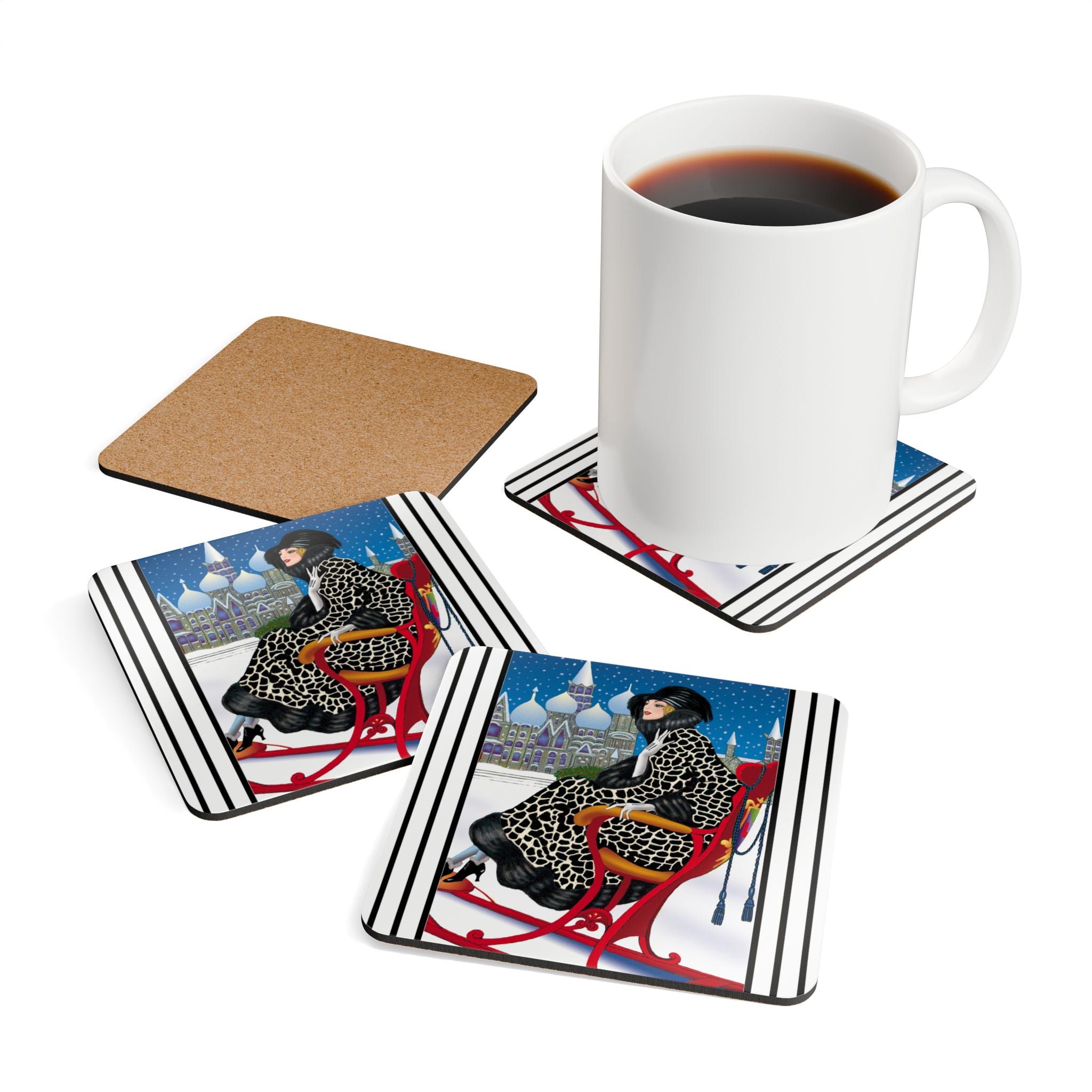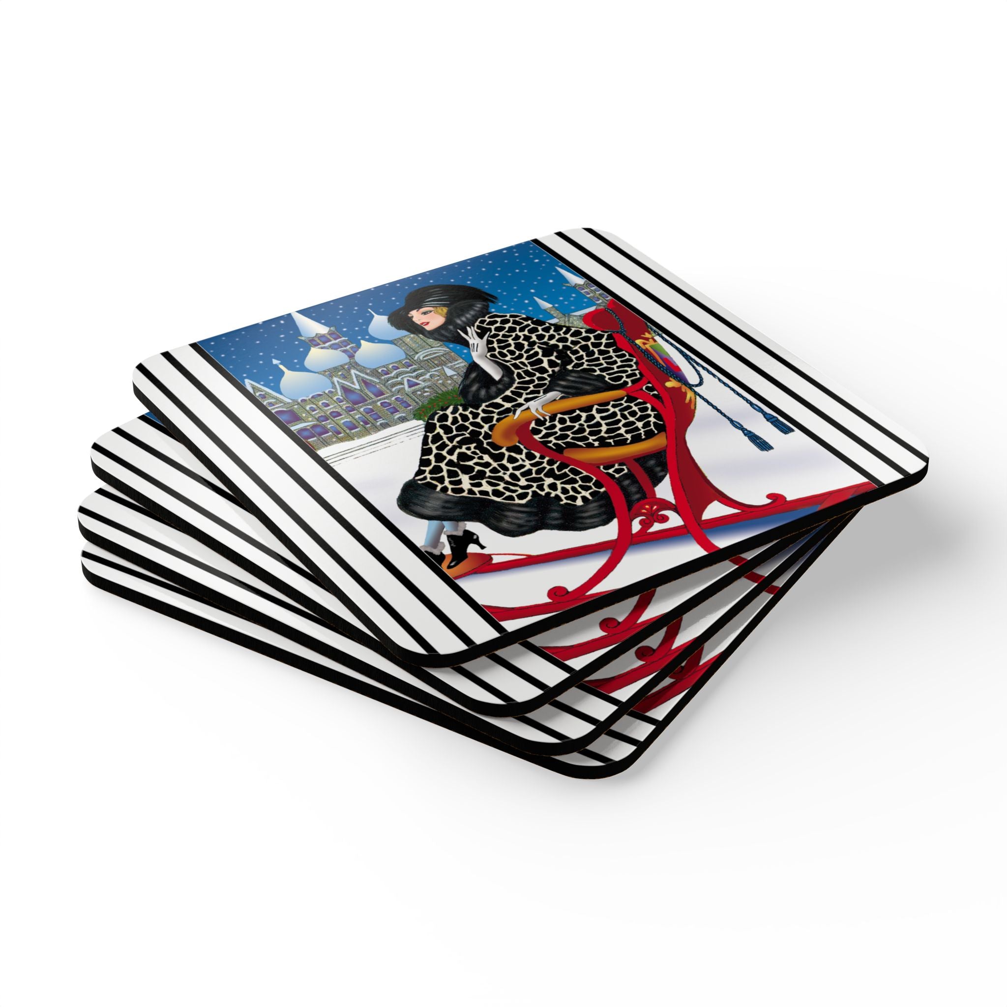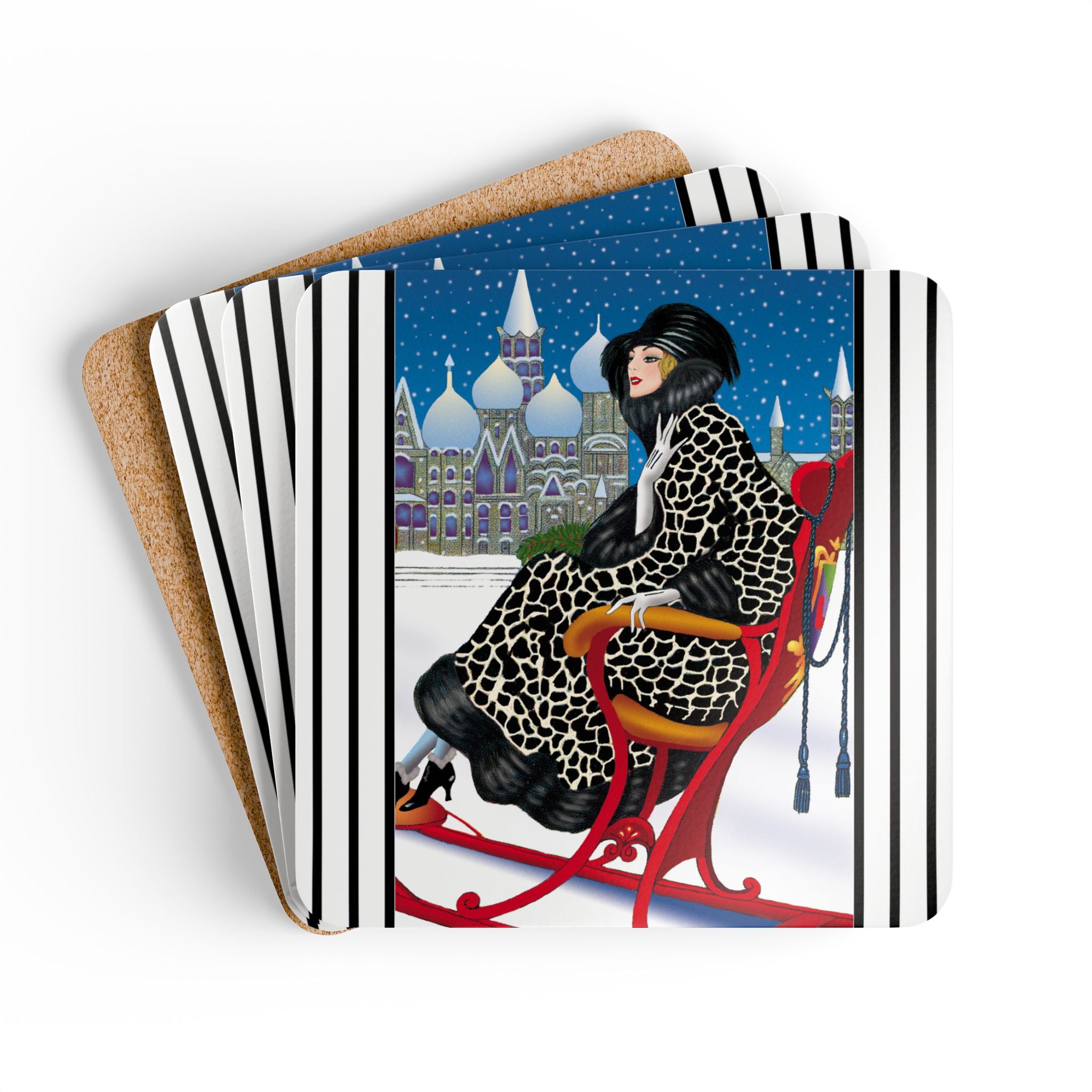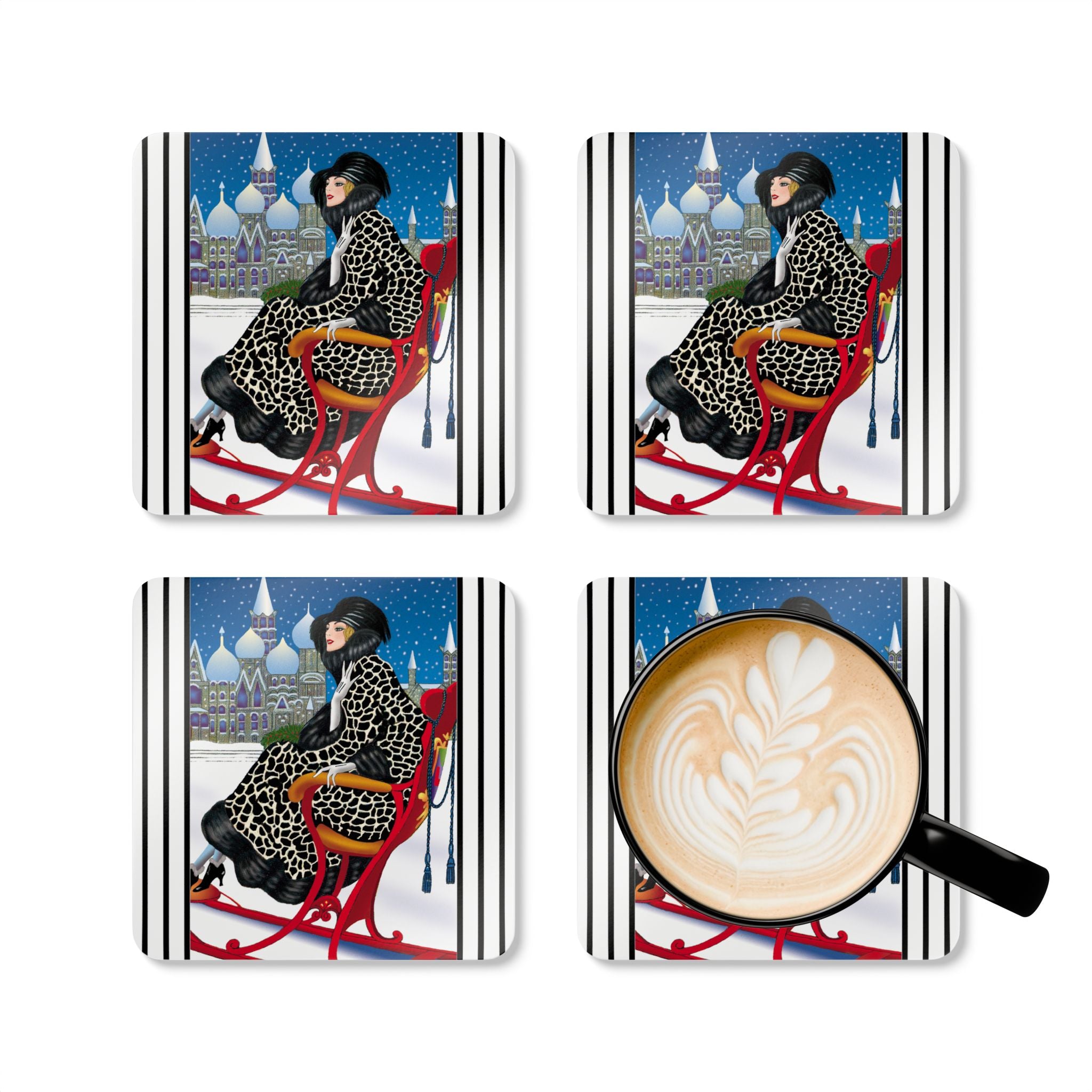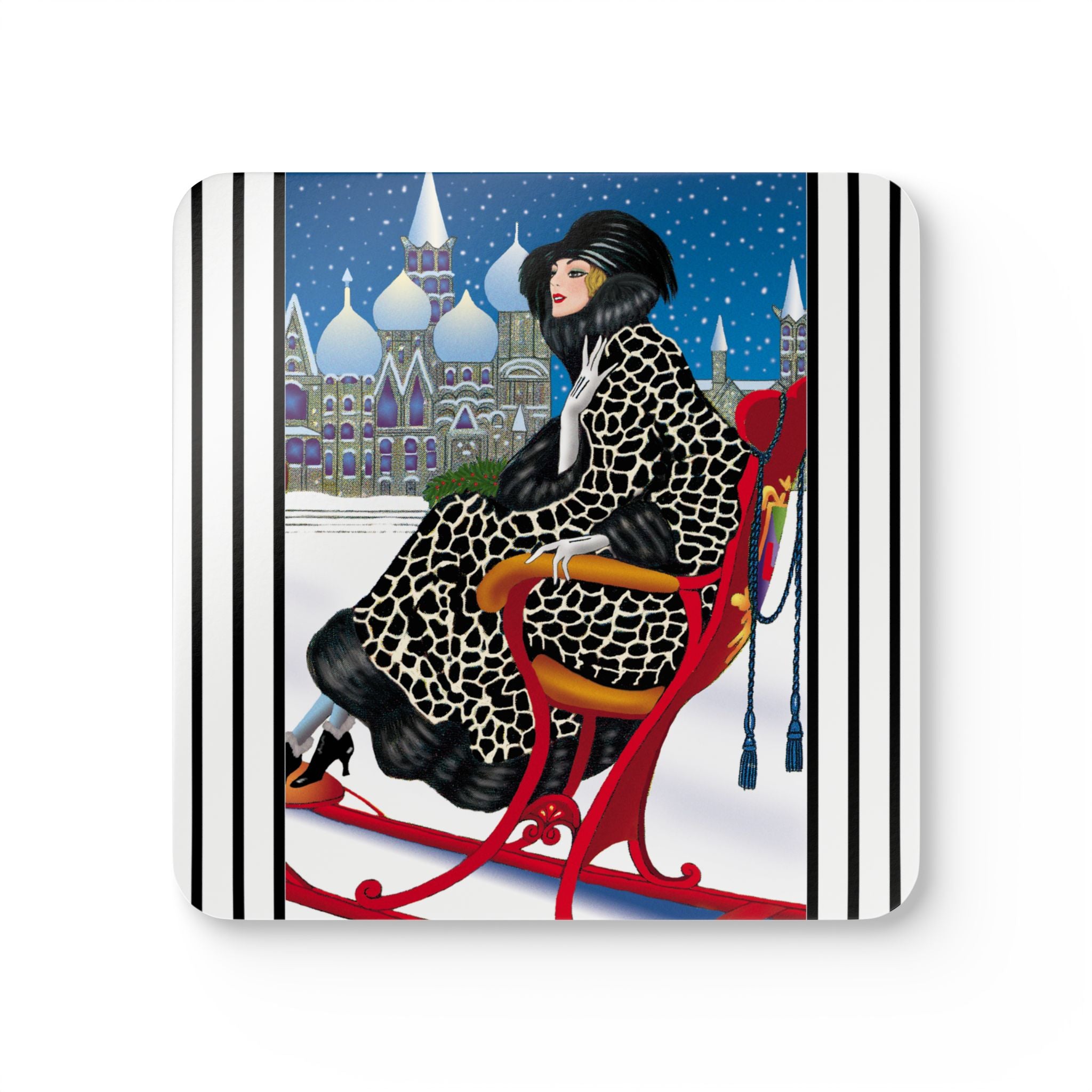 The artwork brings holiday magic into your home: a sophisticated woman, draped in a dramatic black-and-white fur coat with matching hat and gloves, rides gracefully in a vivid red sleigh under a snowy night sky. Snow-dusted domed towers shimmer in the background, while her chic high-heeled boots and poised elegance add a modern twist to the enchanting fairytale scene. The deep blue sky, falling snow, and glowing architecture transform these coasters into more than just tableware—they become festive accents that celebrate the beauty of the season.