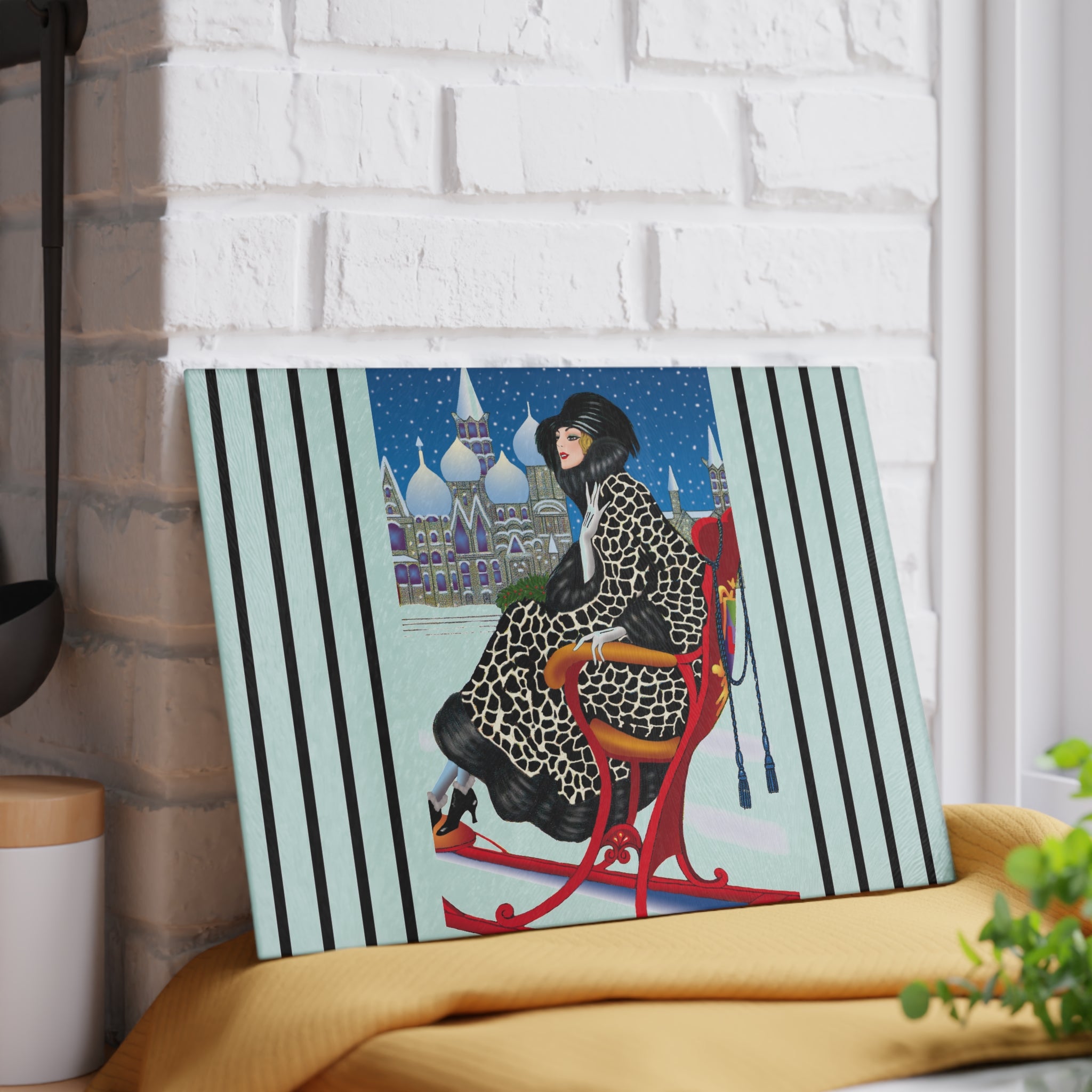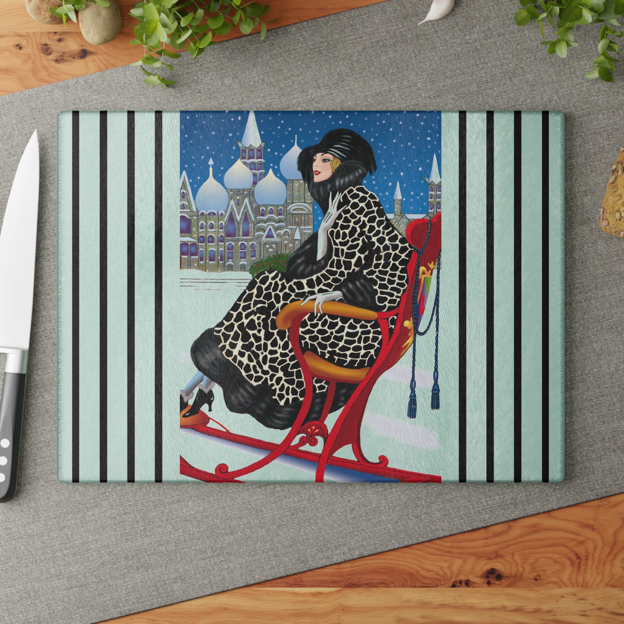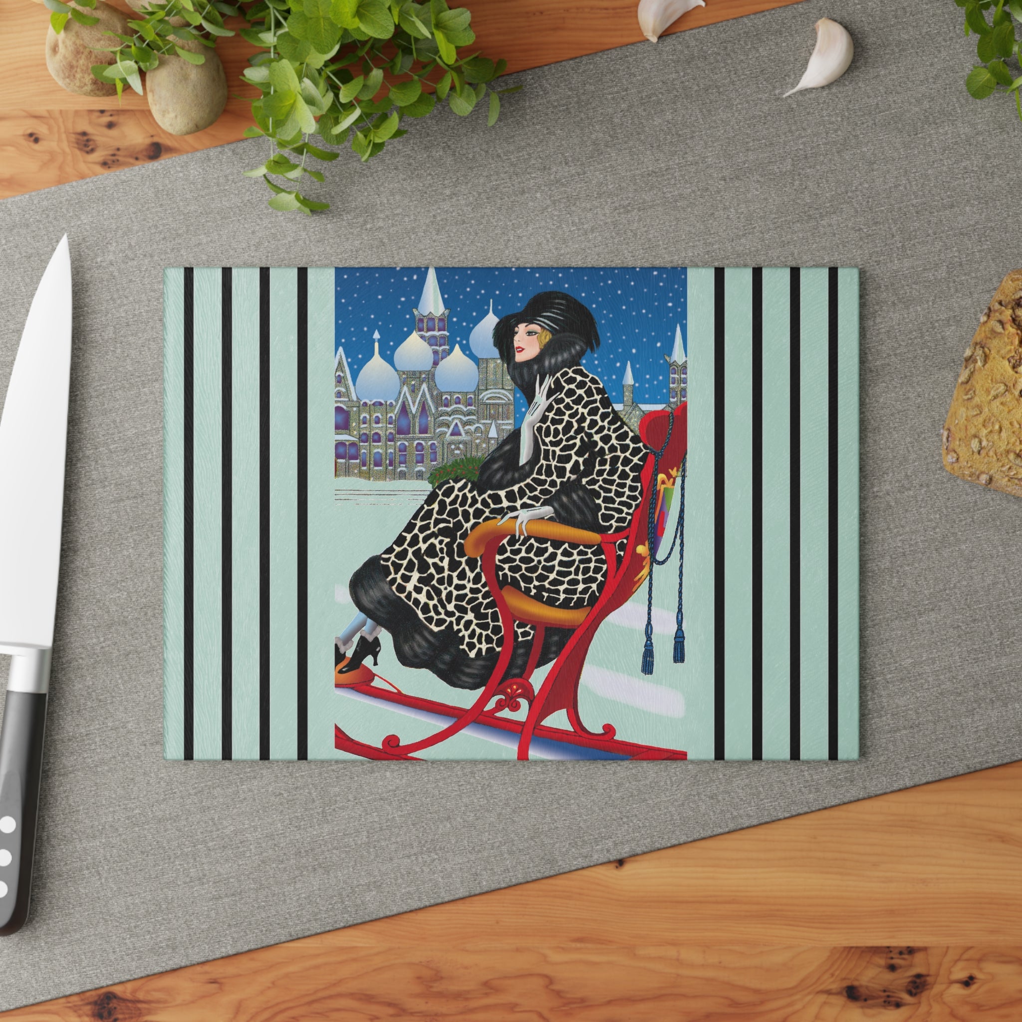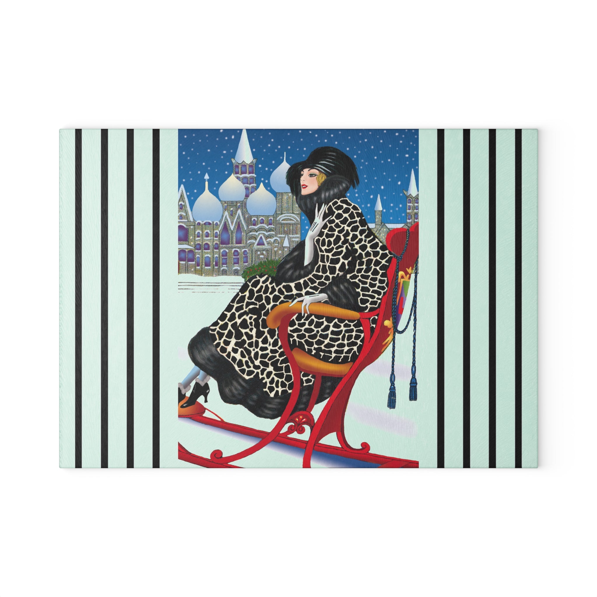 Bring style and strength to your kitchen with the Elegant Winter Woman in Sleigh Glass Cutting Board. Made from tempered glass for lasting durability, this board features a textured surface that’s perfect for chopping, slicing, and dicing. Available in two sizes (8" × 11" and 11" × 15"), it blends everyday function with festive artistry.