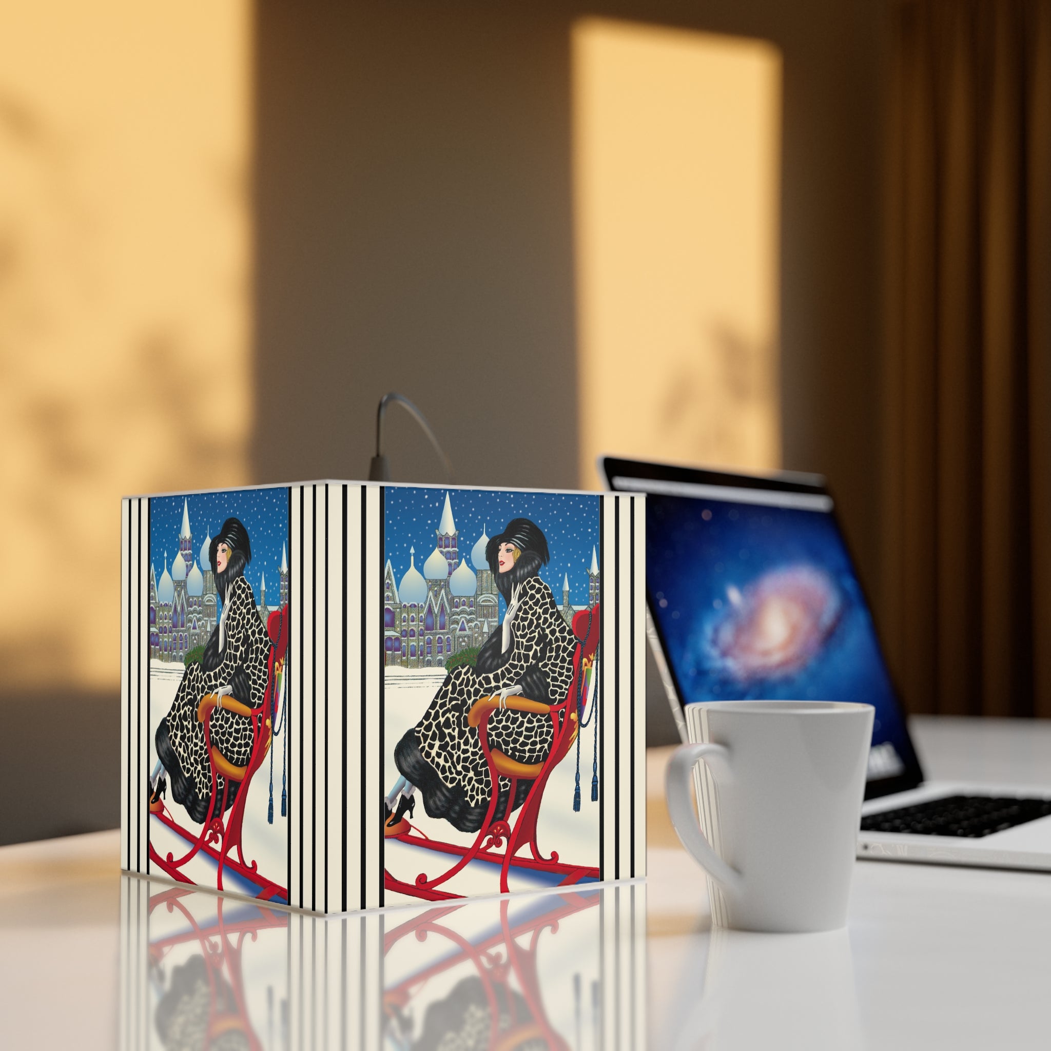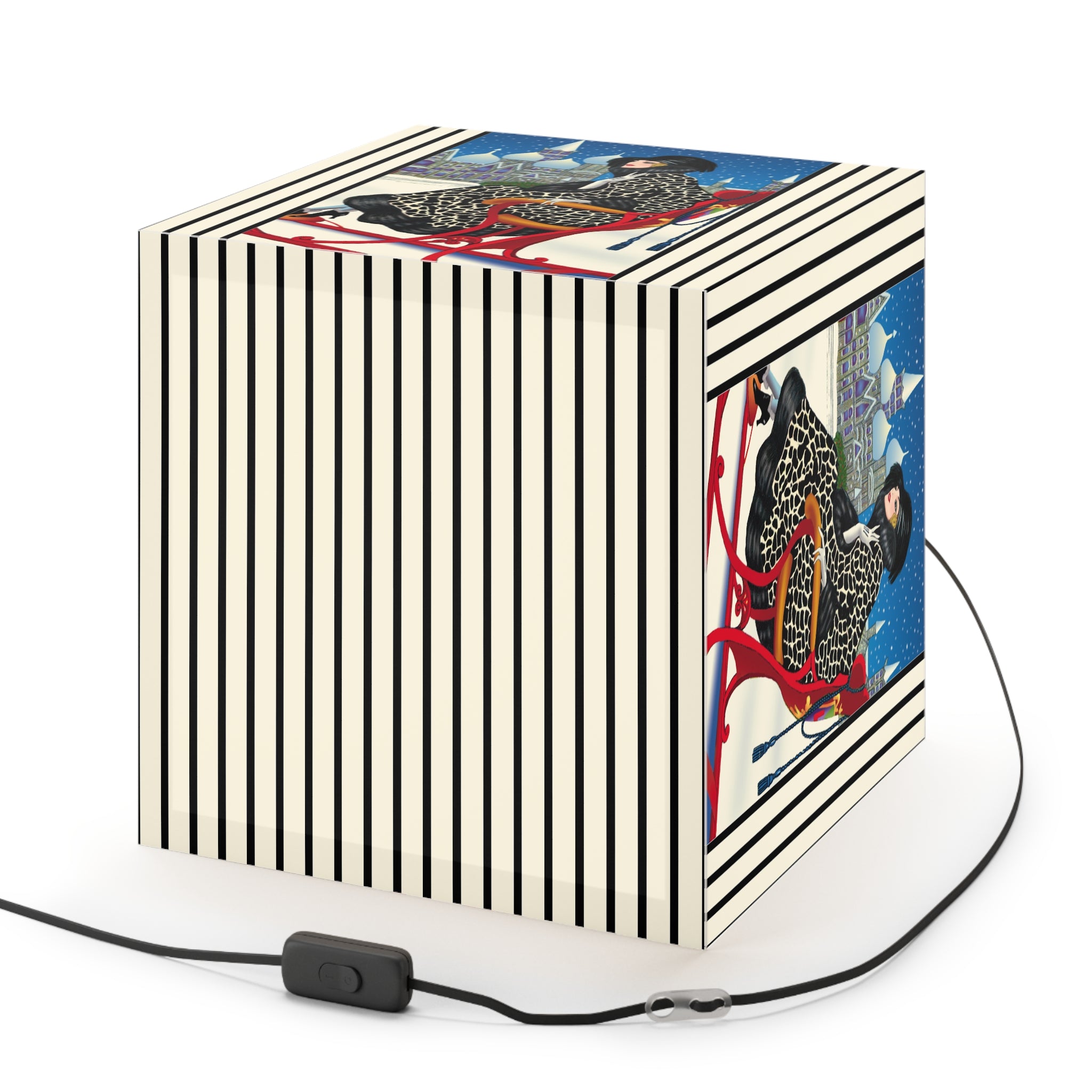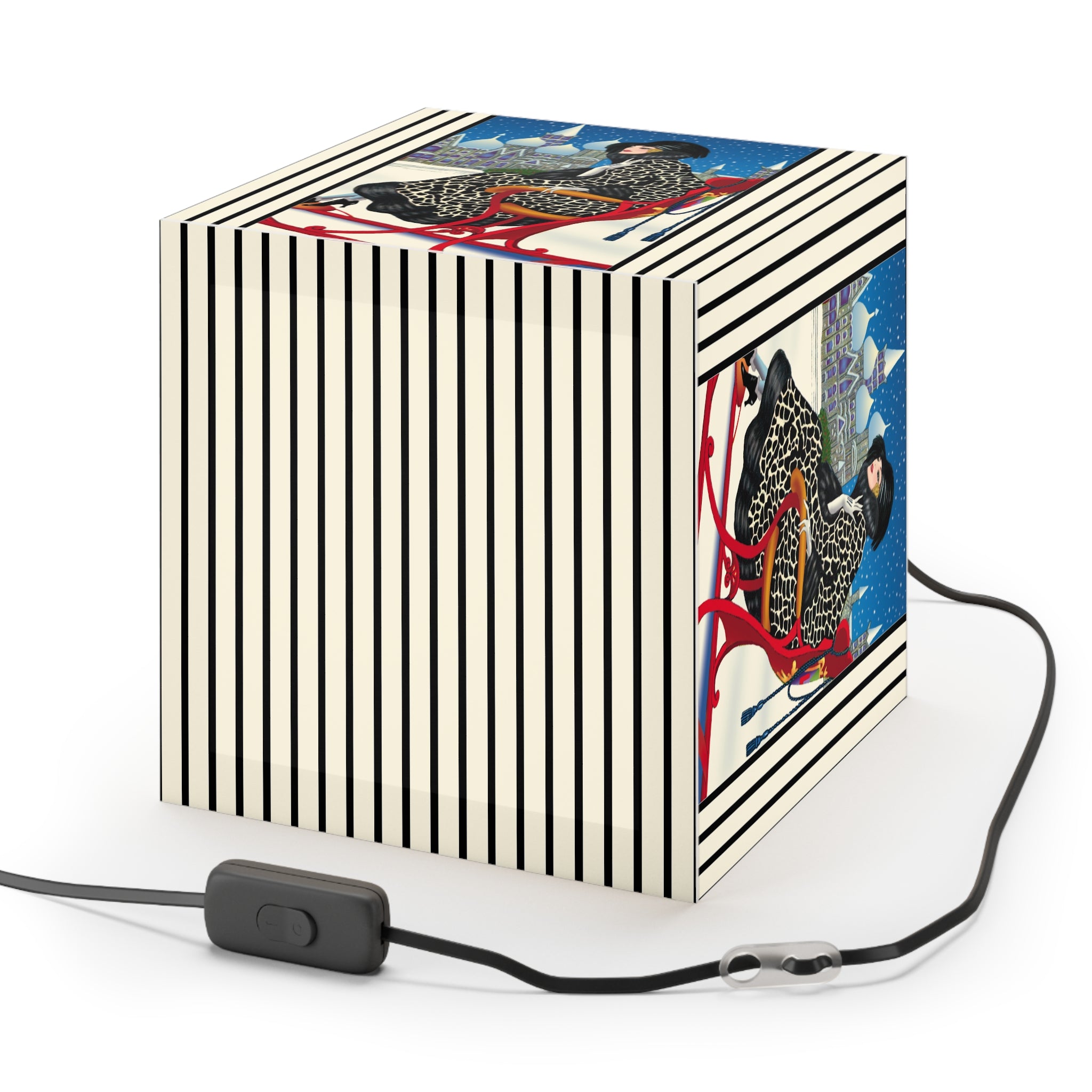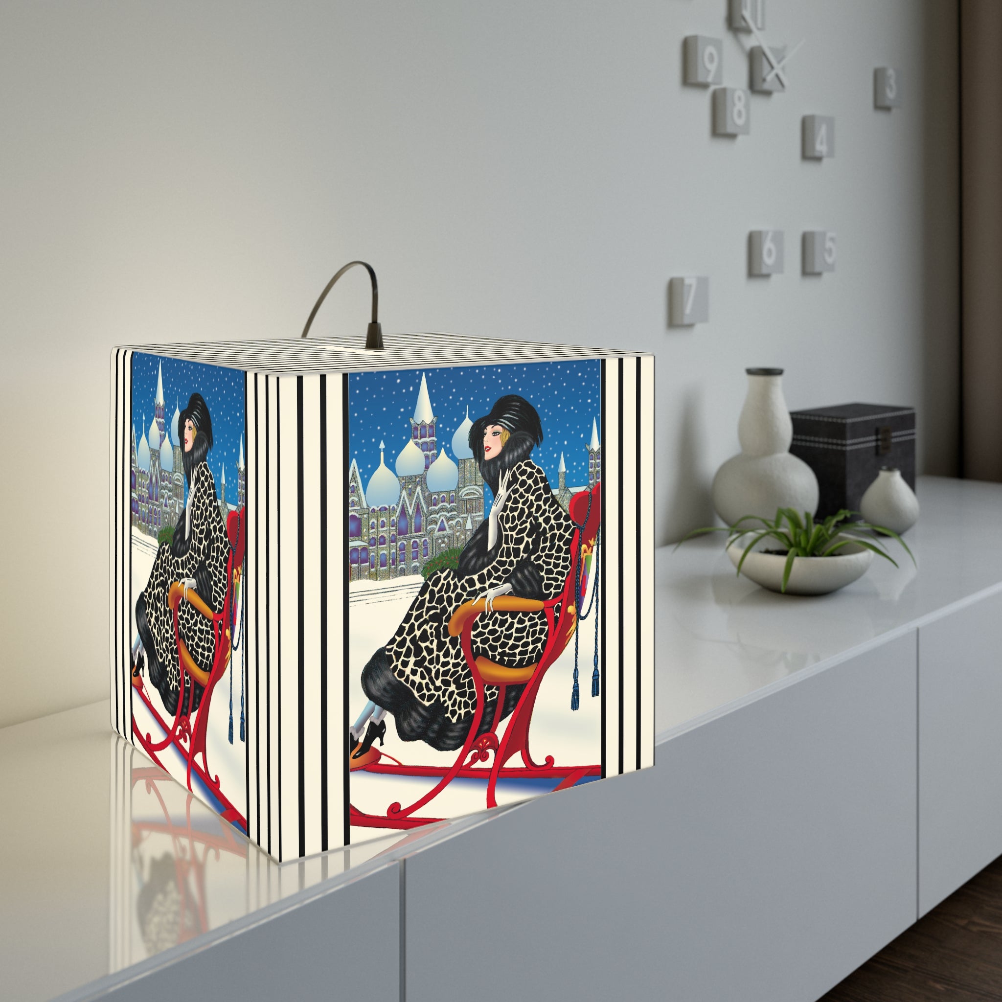 Bring the magic of winter nights into your home with the Elegant Winter Woman in Sleigh Light Cube Lamp. Wrapped around this unique lamp is enchanting artwork of a poised woman in a dramatic black-and-white patterned fur coat, complete with matching hat and gloves, gliding through the snow in a vivid red sleigh. Against the backdrop of a deep blue night sky, snow falls gently over glittering domed towers, creating a fairytale scene of elegance and festive allure. Her chic high-heeled boots and confident grace add a touch of modern glamour to the timeless holiday charm.