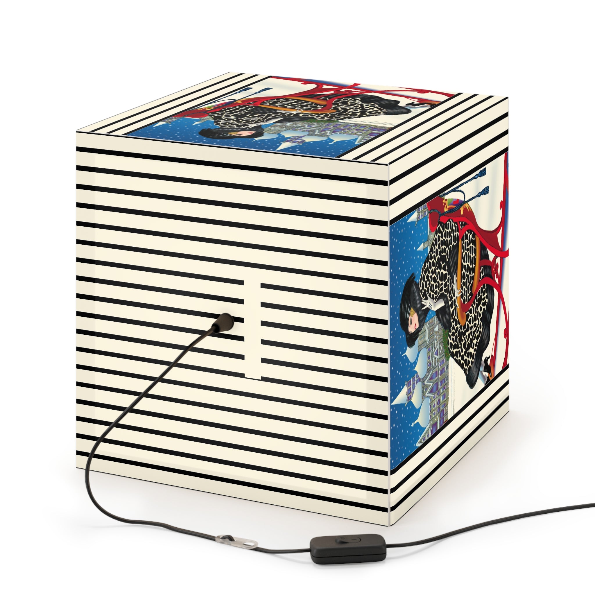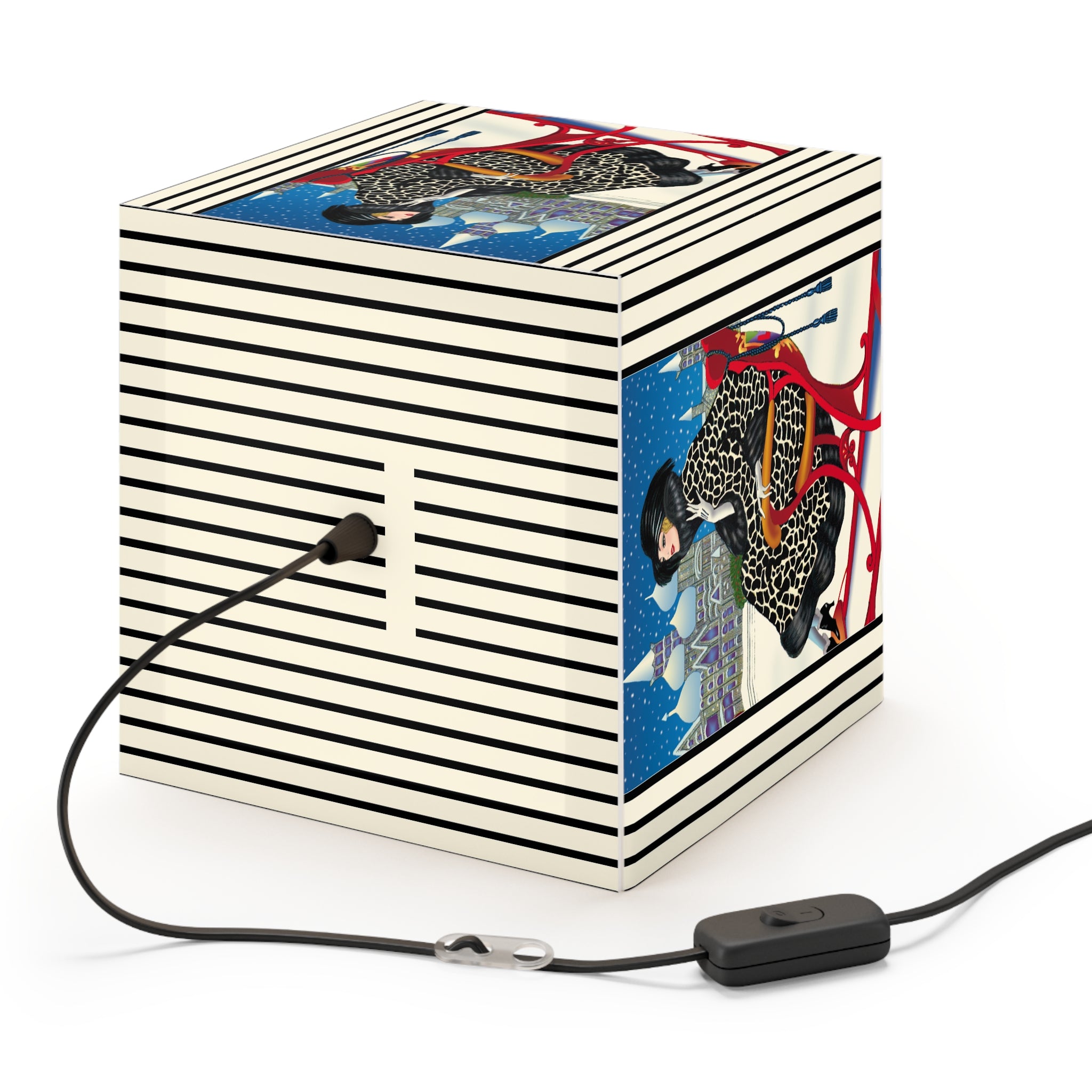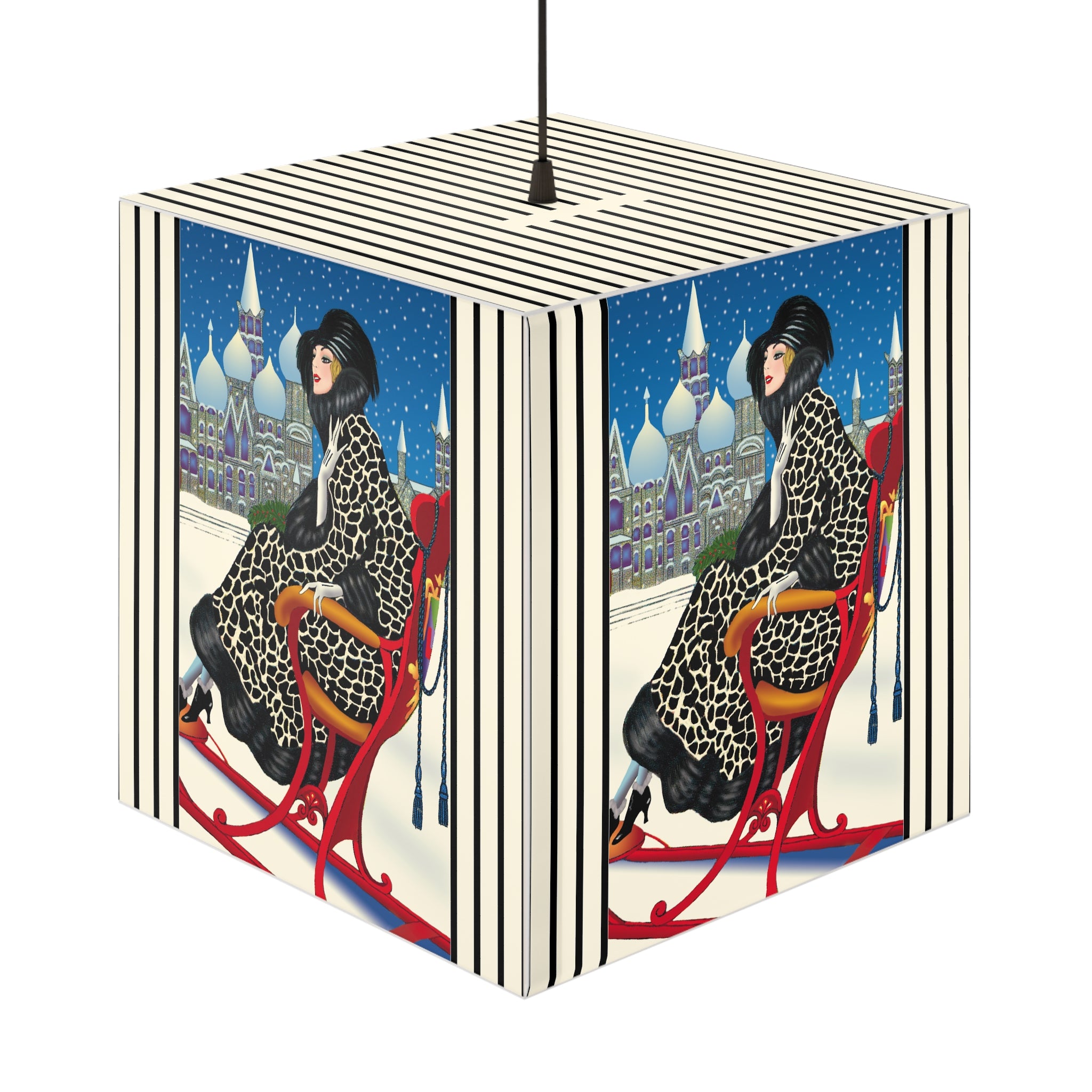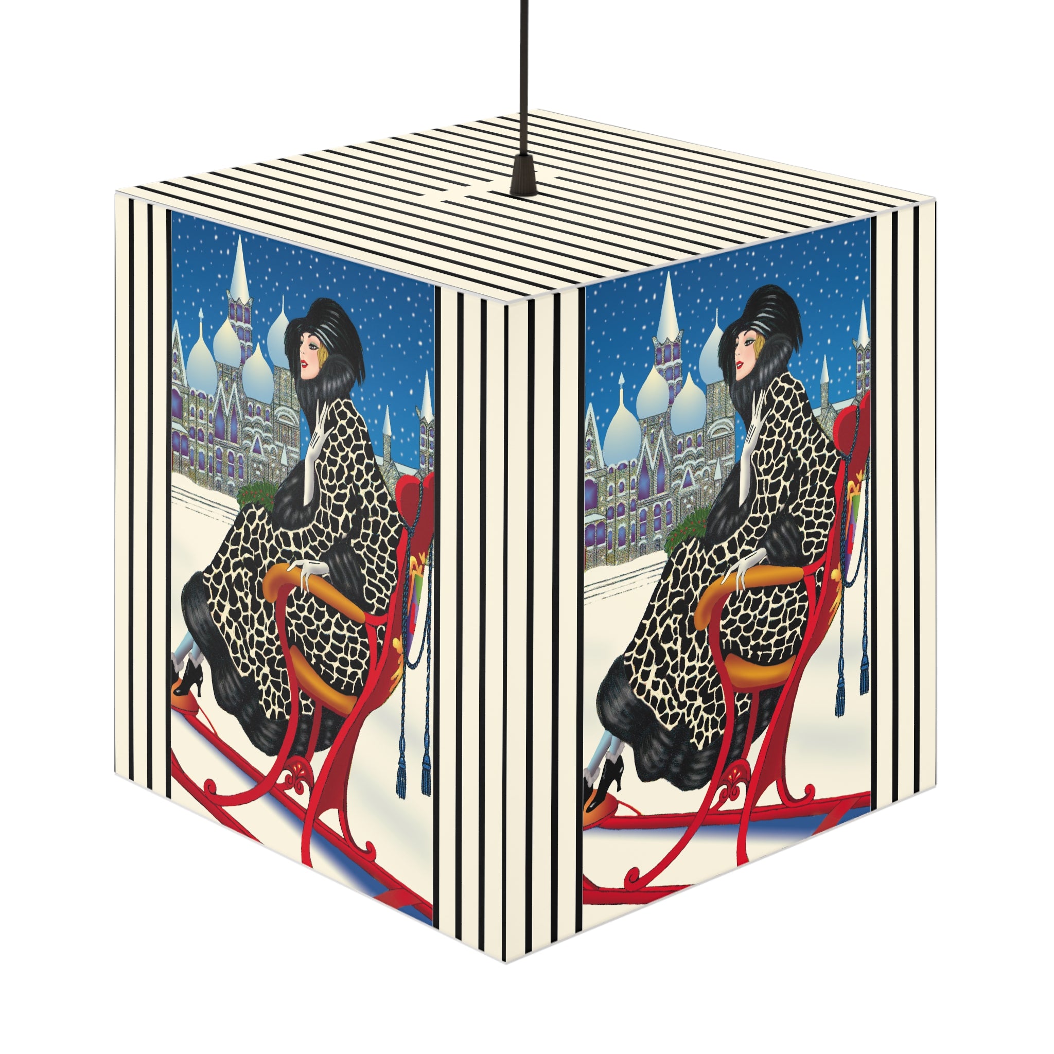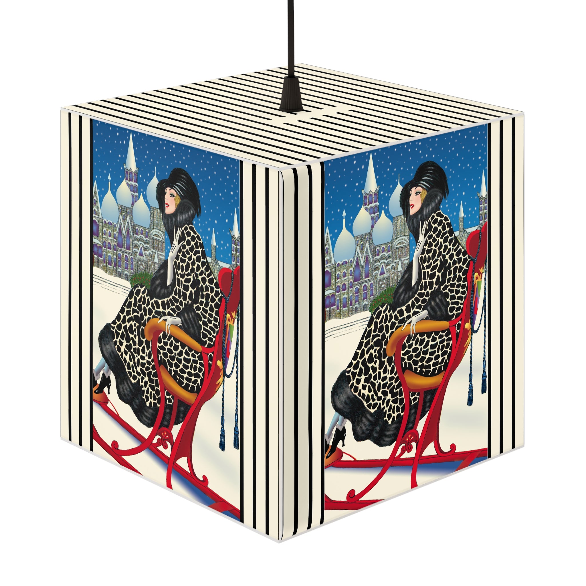 Bring the magic of winter nights into your home with the Elegant Winter Woman in Sleigh Light Cube Lamp. Wrapped around this unique lamp is enchanting artwork of a poised woman in a dramatic black-and-white patterned fur coat, complete with matching hat and gloves, gliding through the snow in a vivid red sleigh. Against the backdrop of a deep blue night sky, snow falls gently over glittering domed towers, creating a fairytale scene of elegance and festive allure. Her chic high-heeled boots and confident grace add a touch of modern glamour to the timeless holiday charm.