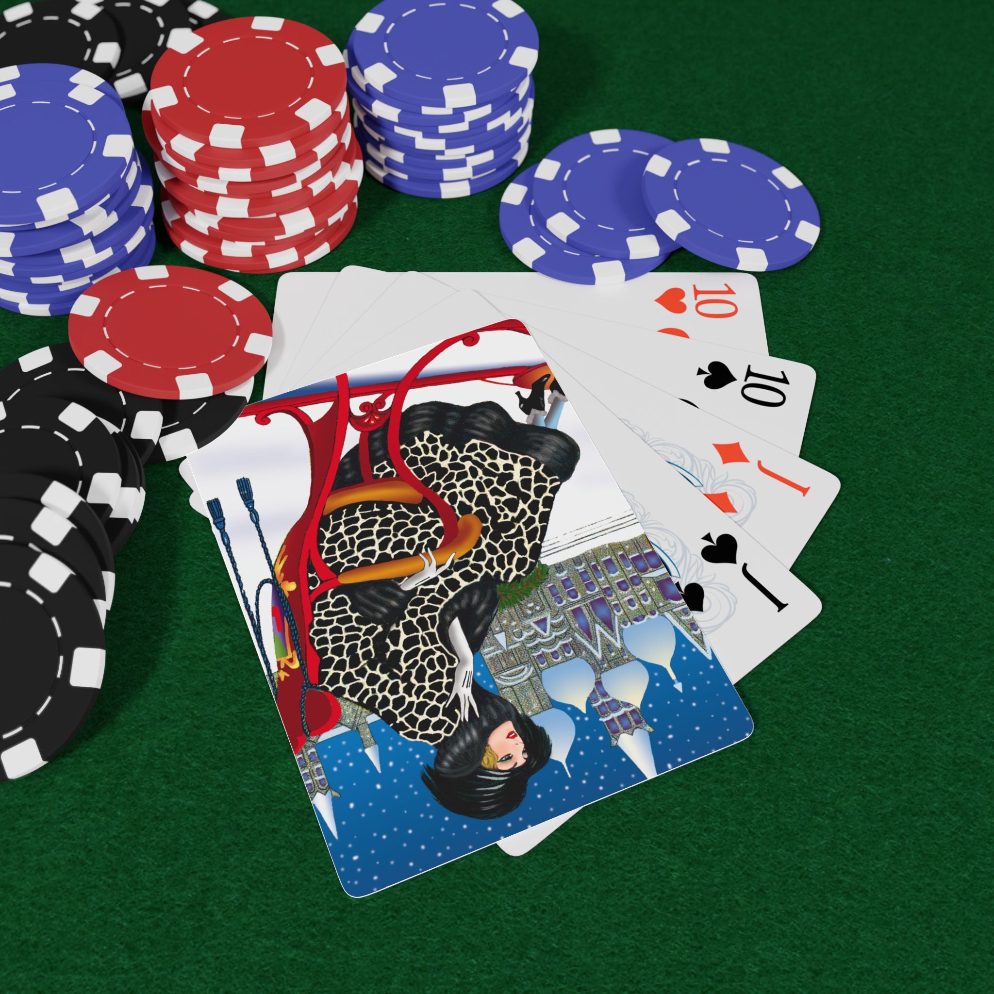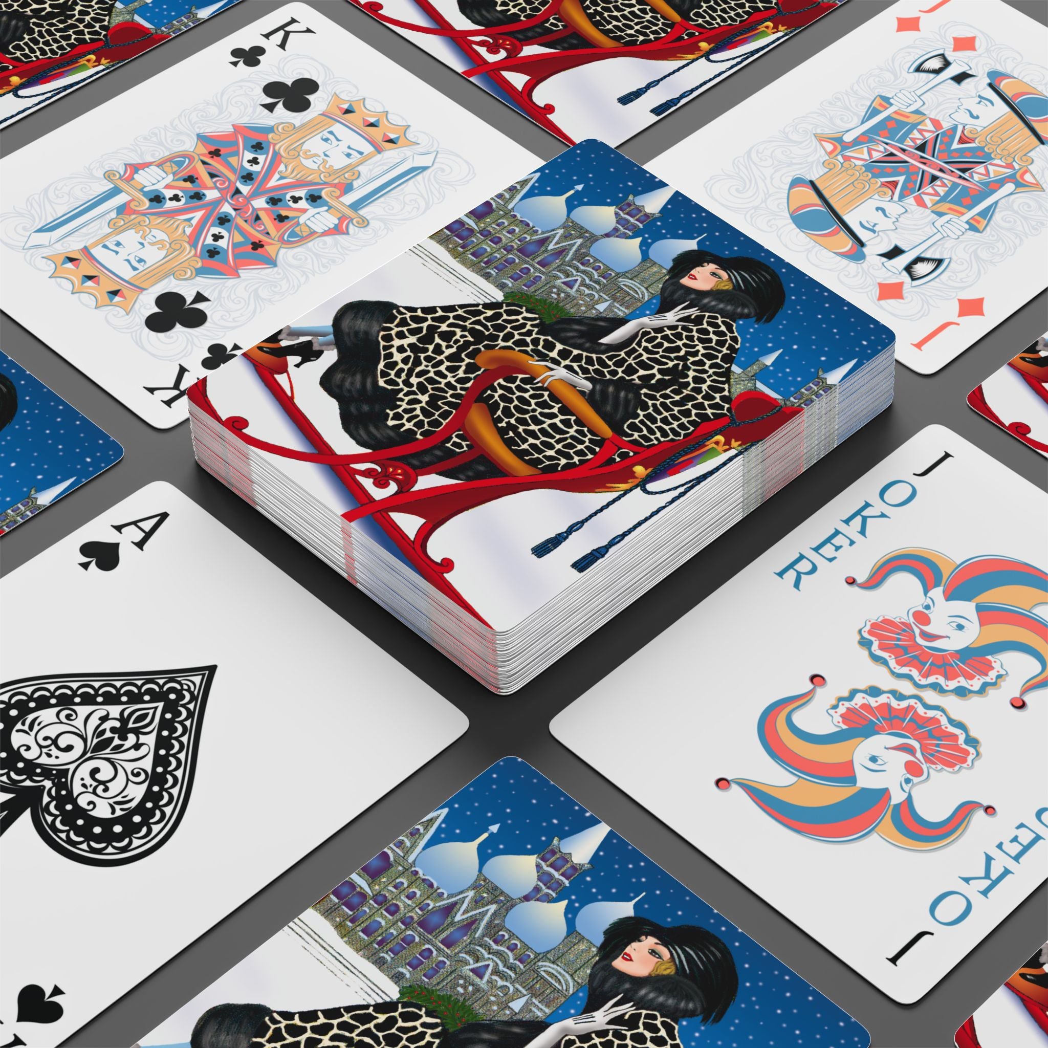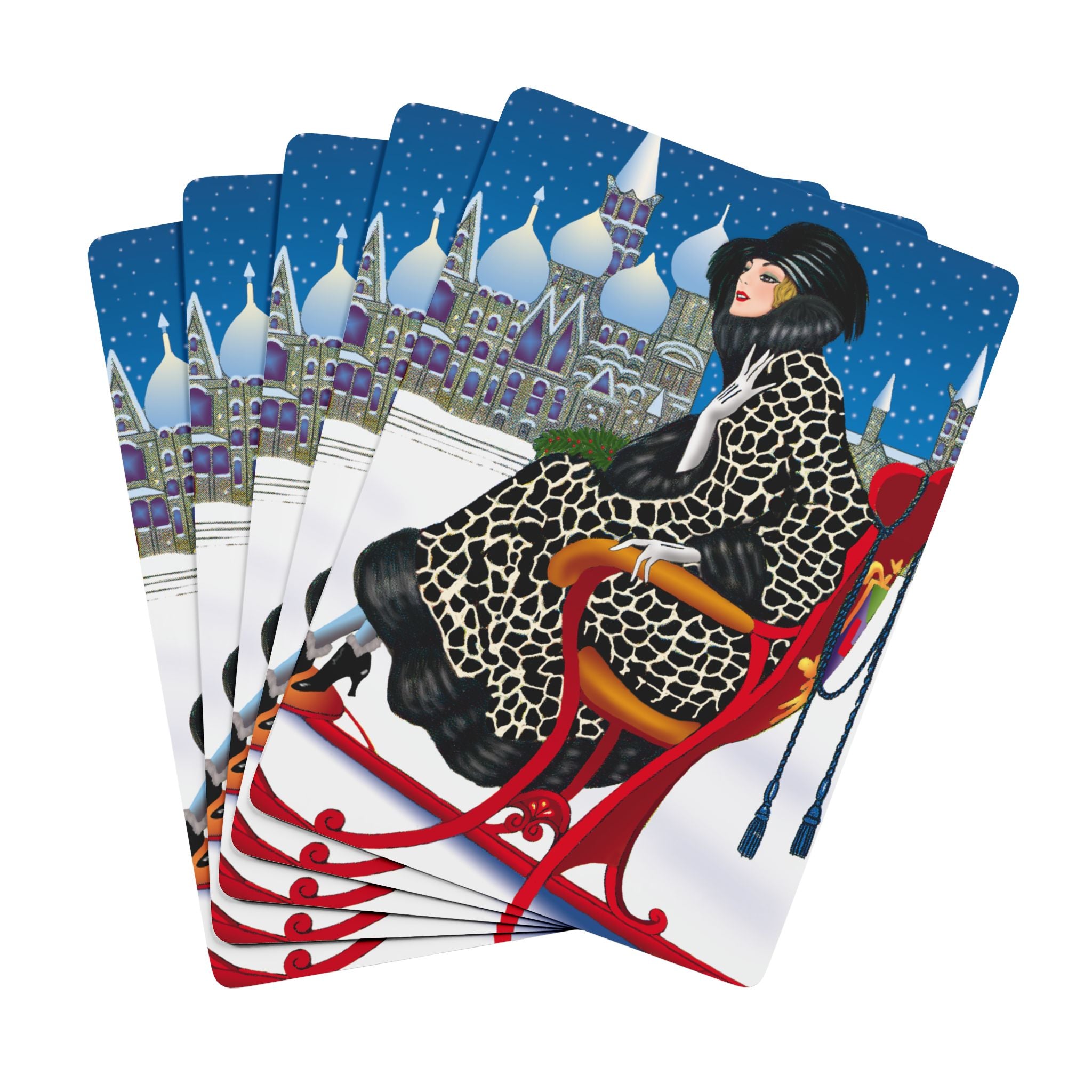 Turn every game night into a celebration of style and festivity with the Elegant Winter Woman in Sleigh Playing Cards. This deck shuffles together the magic of the holidays with timeless sophistication. The artwork captures a glamorous woman draped in a dramatic black-and-white fur coat, her matching hat and gloves framing her confident poise as she rides in a vivid red sleigh. Snow falls gently against the deep blue night sky, while whimsical domed towers sparkle in the distance, creating a fairytale backdrop filled with seasonal allure.