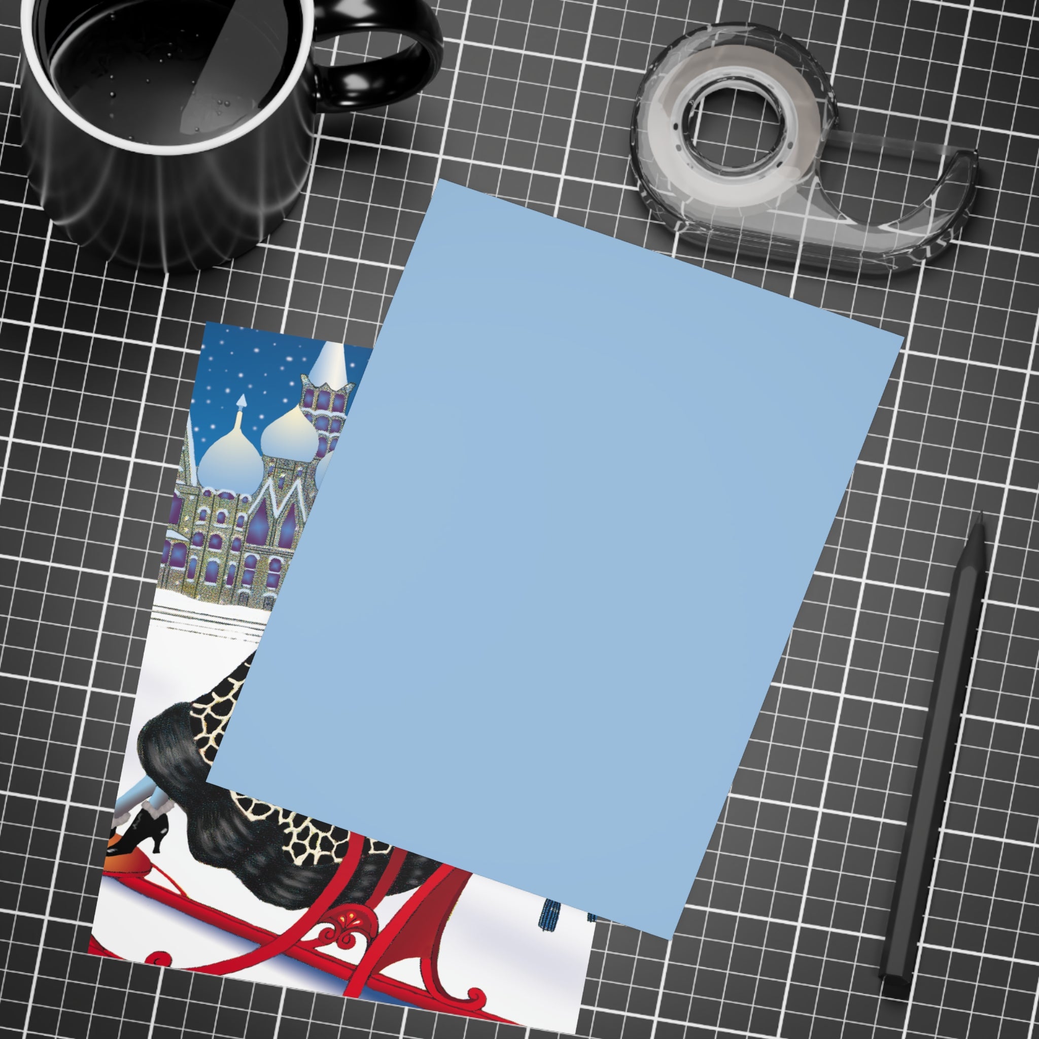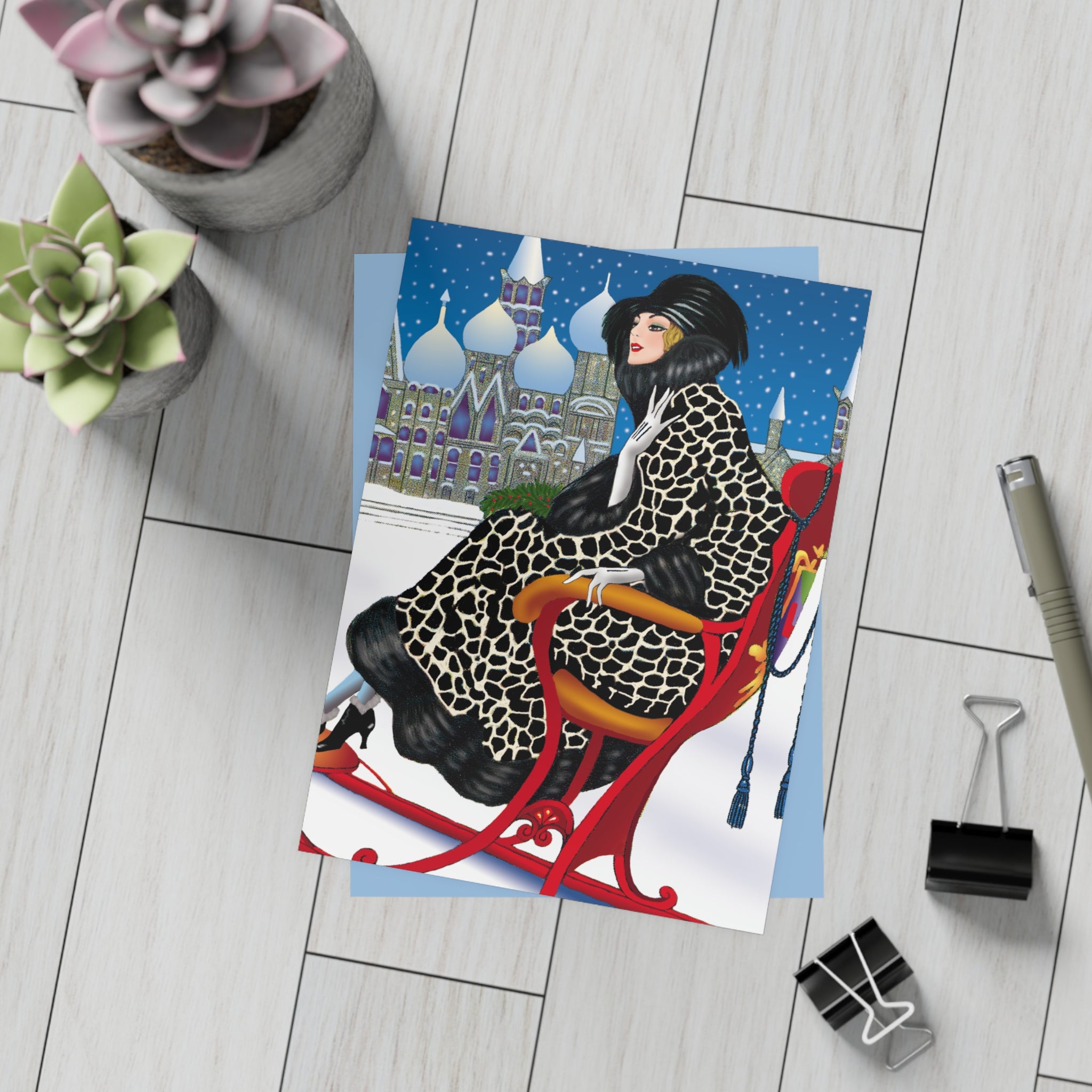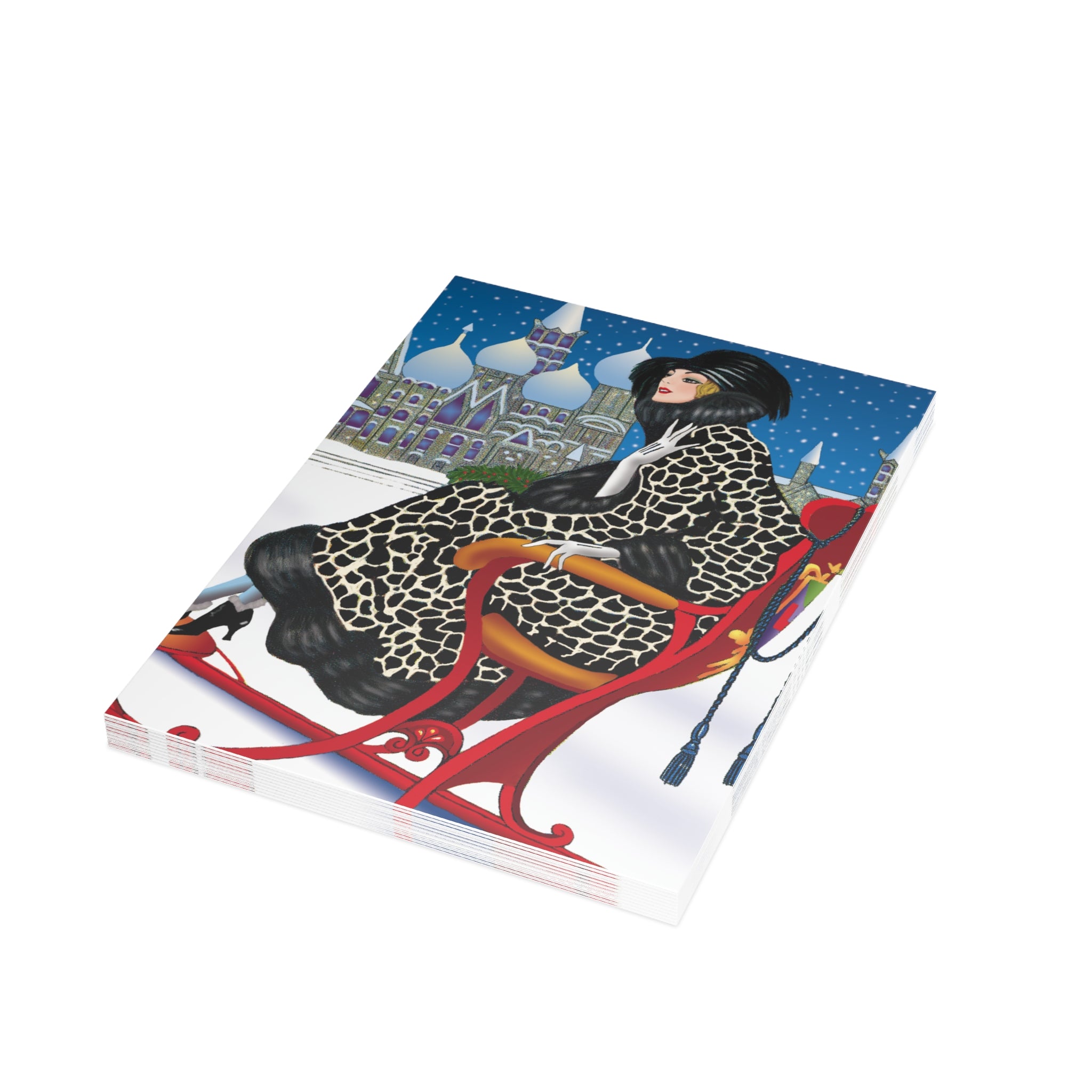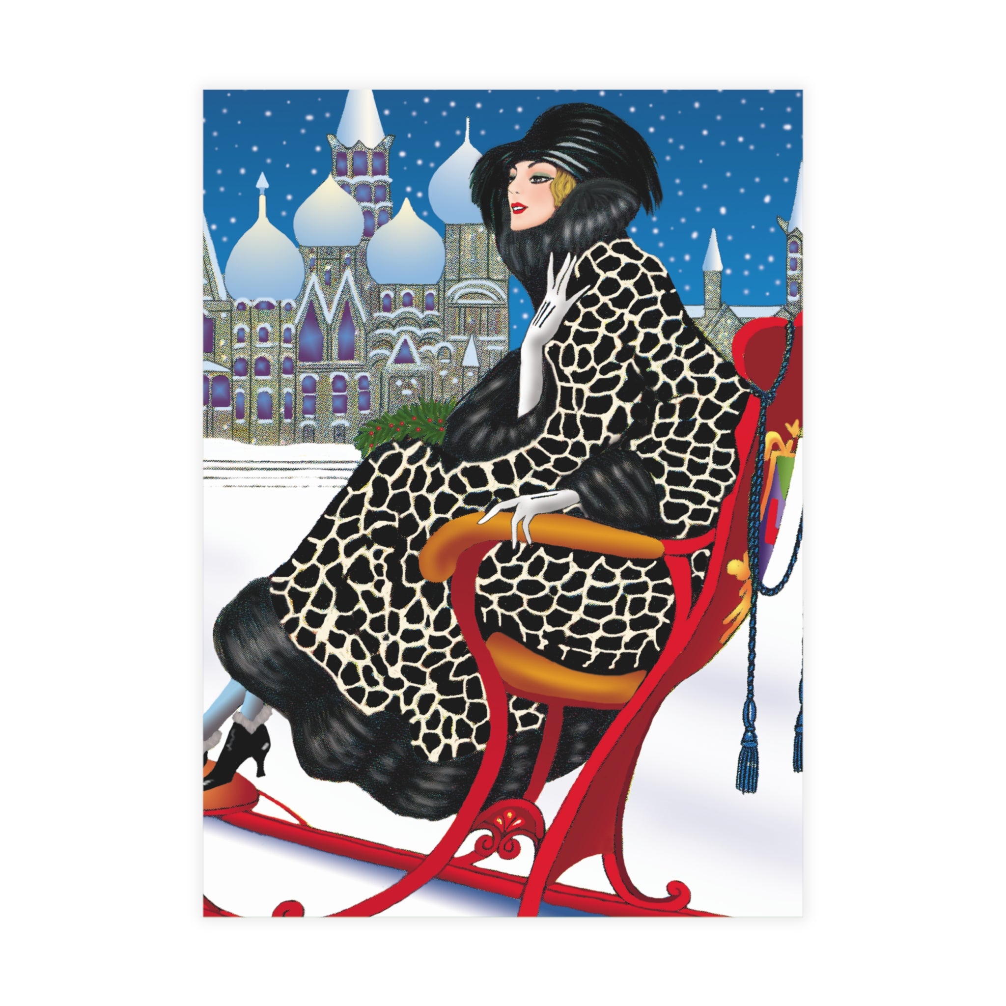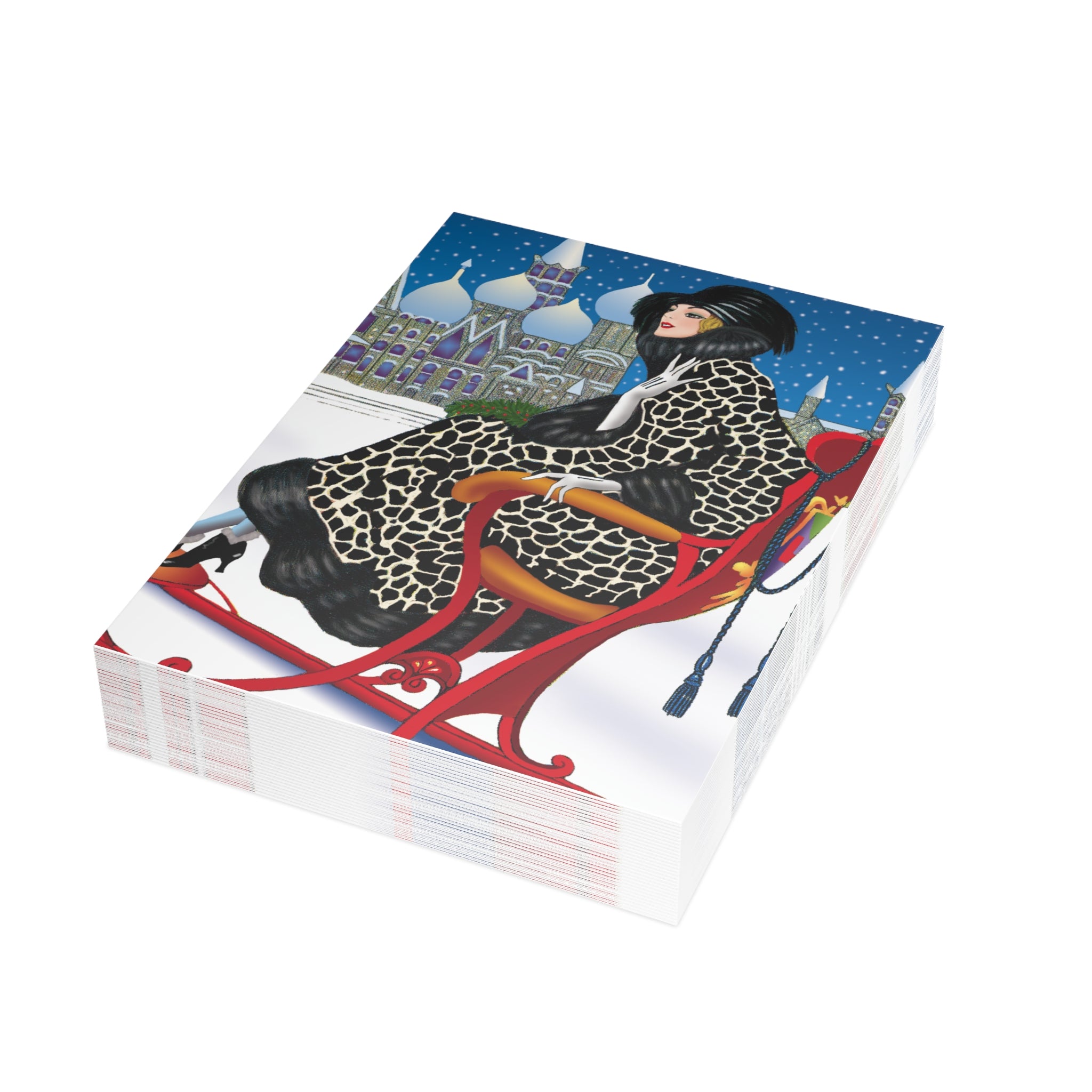 Send a touch of winter magic with the Elegant Winter Woman in Sleigh Postcard Bundles. Each postcard showcases a glamorous holiday scene: a sophisticated woman draped in a dramatic black-and-white patterned fur coat, complete with matching hat and gloves, glides through the night in a vivid red sleigh. Snow falls softly around her as whimsical, snow-dusted towers sparkle against a deep blue sky, creating the feeling of stepping straight into a fairytale. Her graceful pose, chic high-heeled boots, and the enchanting winter backdrop combine elegance with festive allure.