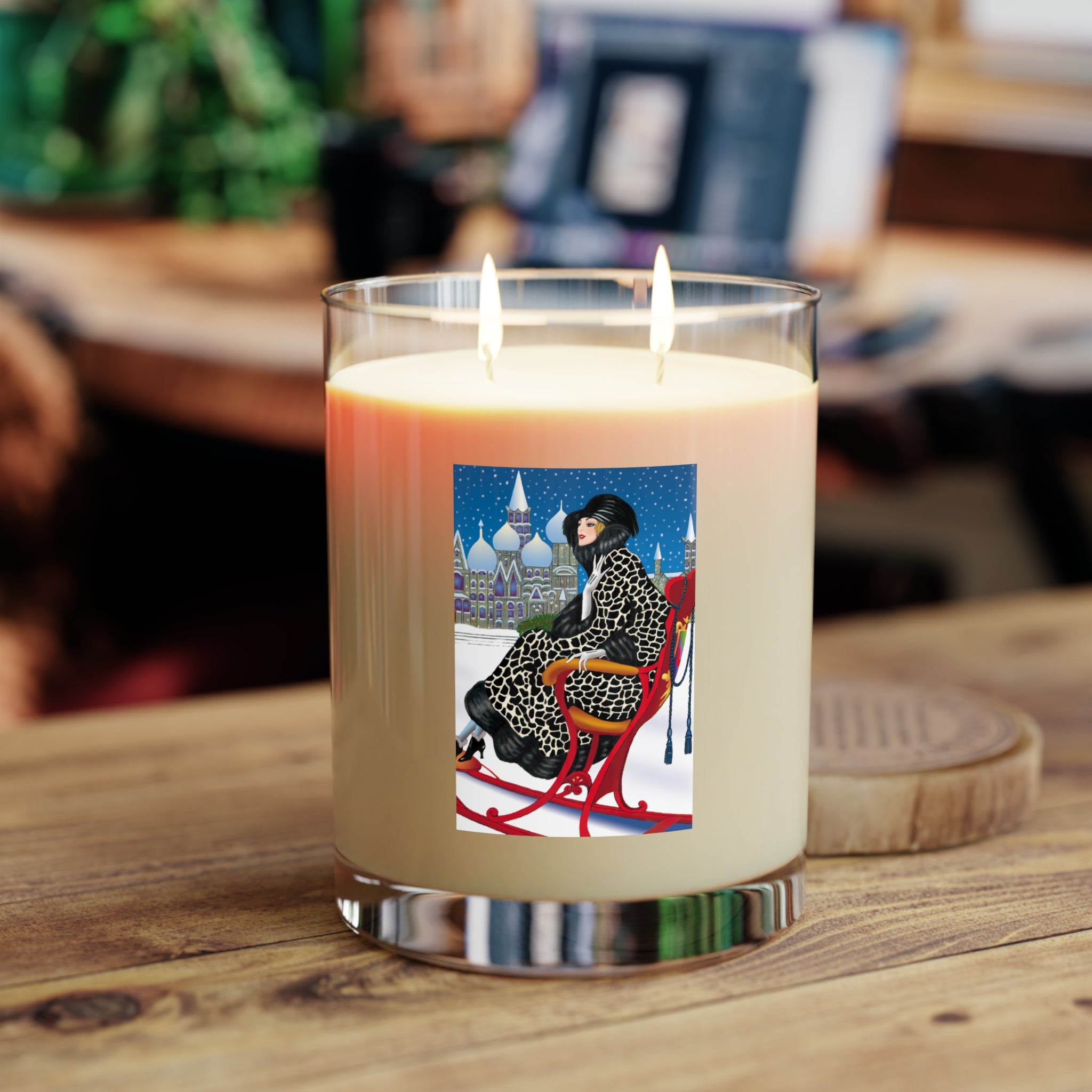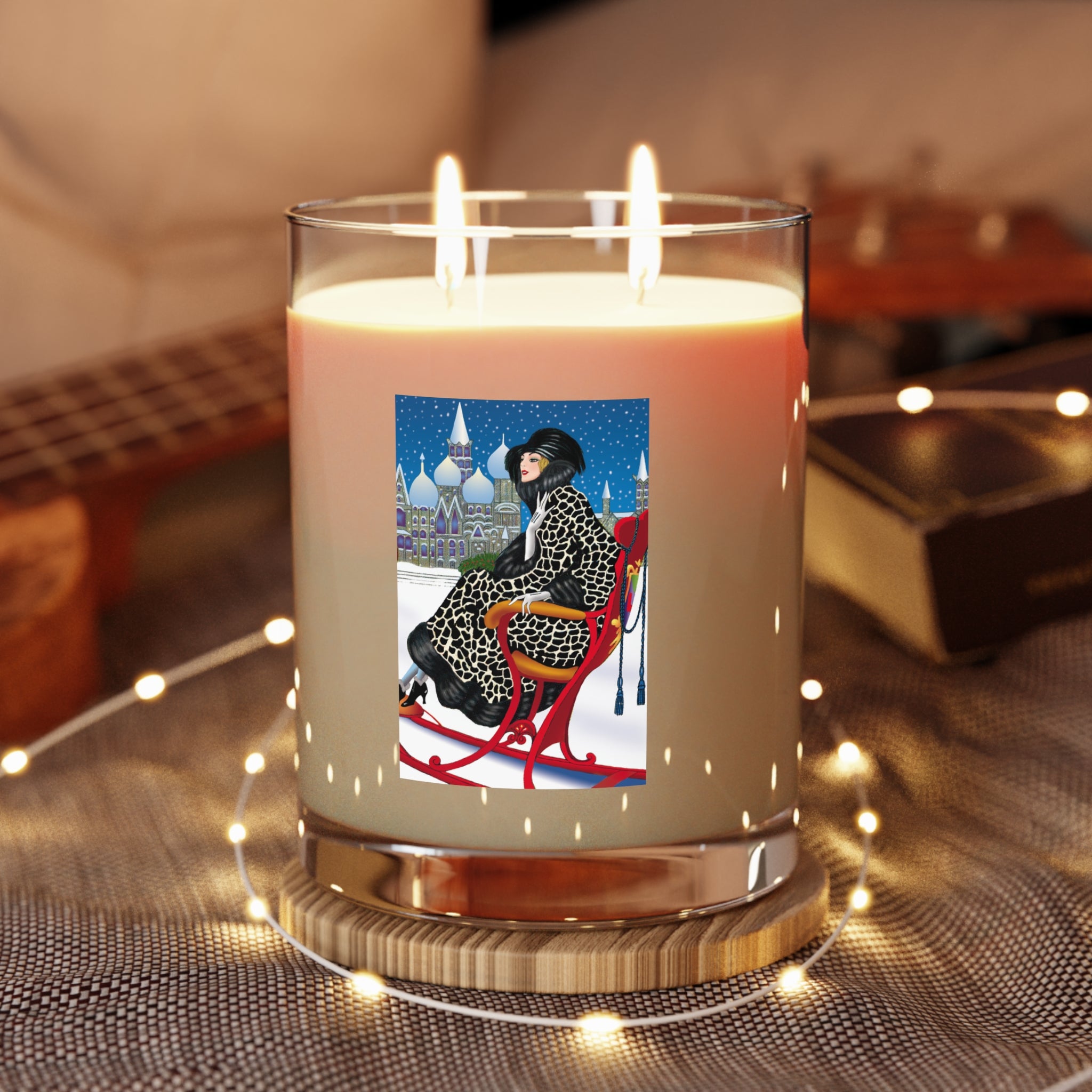The design brings winter magic into your home: a sophisticated woman, draped in a black-and-white patterned fur coat with matching hat and gloves, rides gracefully in a vivid red sleigh beneath a snowy night sky. Snow-dusted domed towers sparkle in the distance, while her chic high-heeled boots and confident poise add a touch of modern elegance to the fairytale scene. The deep blue sky, falling snow, and glowing architecture transform this candle into more than décor—it’s an enchanting centerpiece of holiday ambiance.