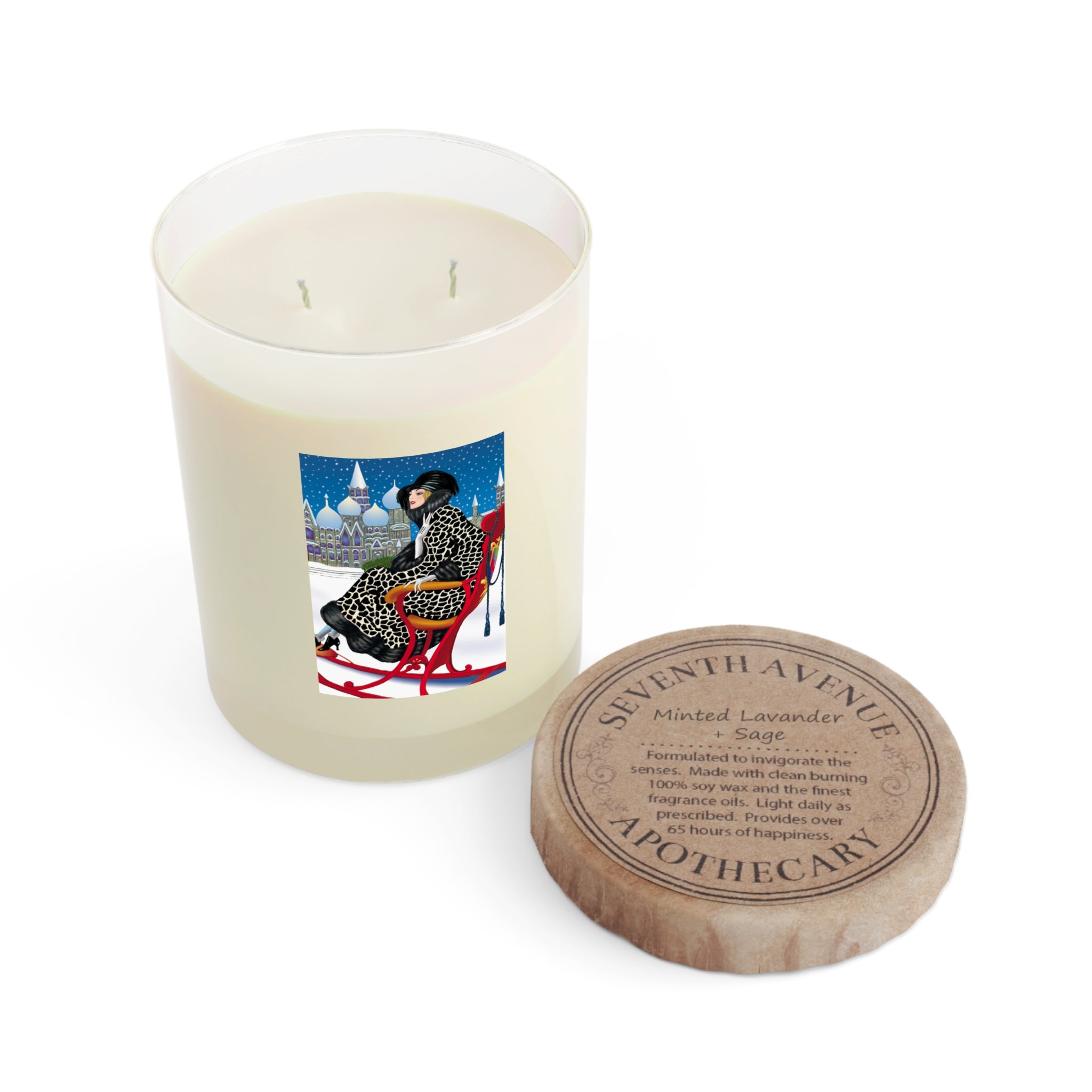Light up your holidays with the Elegant Winter Woman in Sleigh Scented Candle. Housed in an 11oz full glass jar with a premium 360° print, this candle combines long-lasting fragrance with striking holiday artwork. Crafted with 100% food-grade soy wax and the finest fragrance oils, it’s phthalate- and lead-free, with a burn time of up to 65 hours. Choose from three scents: White Tea & Fig, Lavender & Sage, or Ocean Mist & Moss.