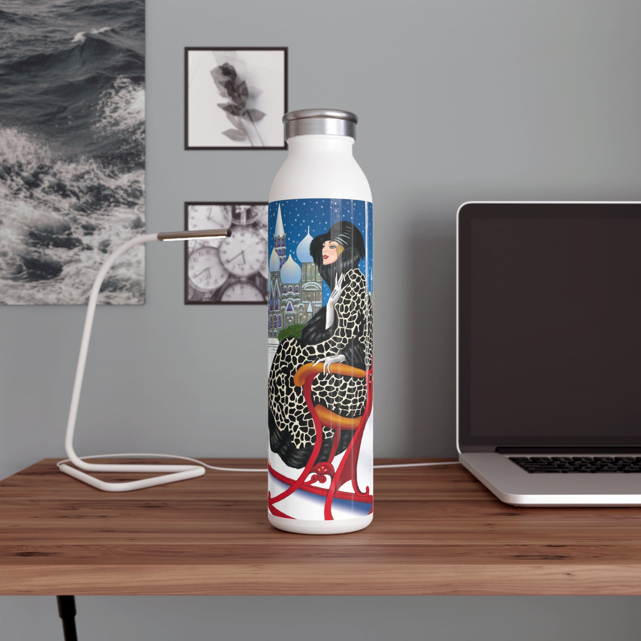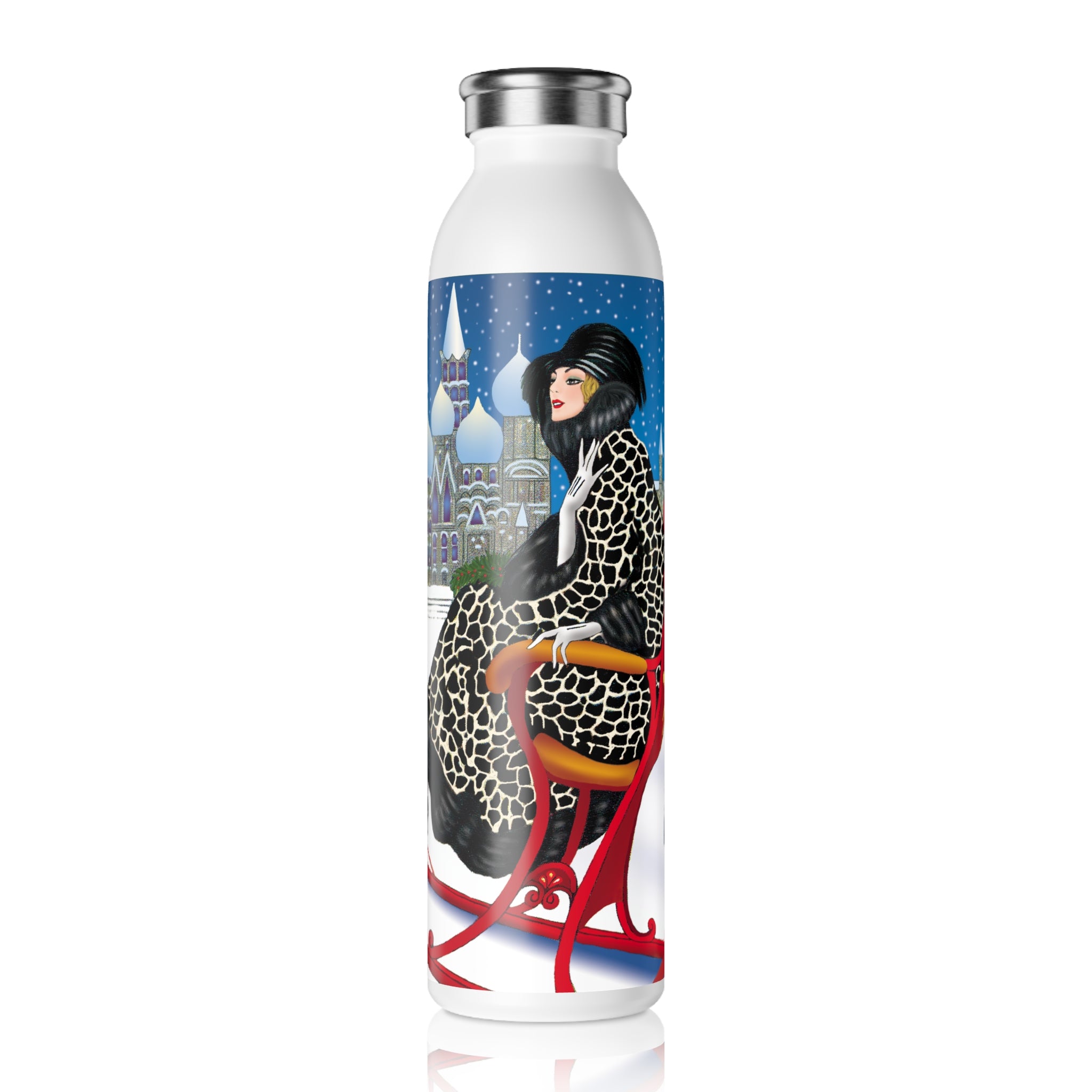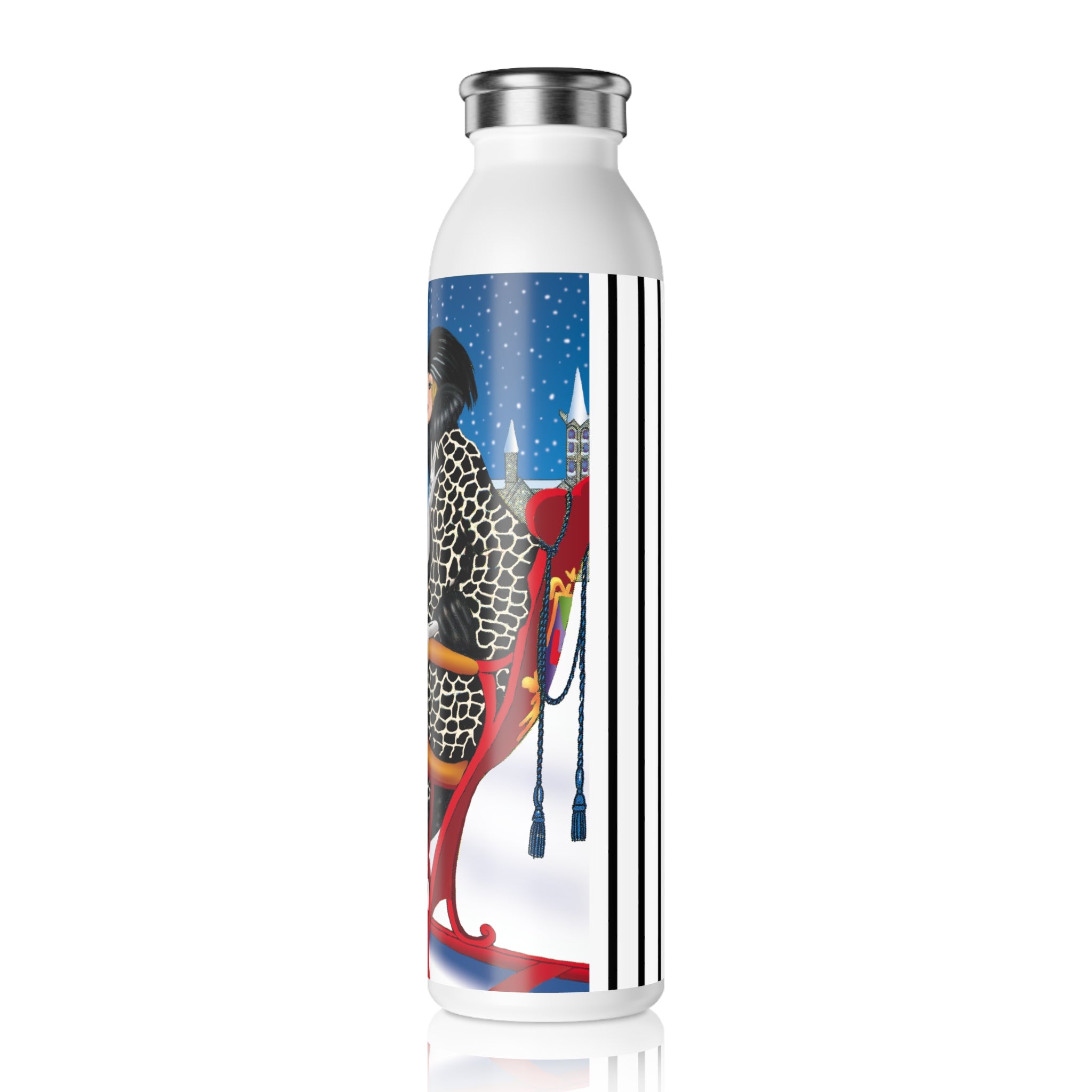 Stay stylishly hydrated with the Elegant Winter Woman in Sleigh Slim Water Bottle. With a 20oz capacity, sleek matte finish, and double-wall stainless steel frame with vacuum insulation, this bottle keeps drinks perfectly hot or cold for hours while adding a touch of seasonal elegance.