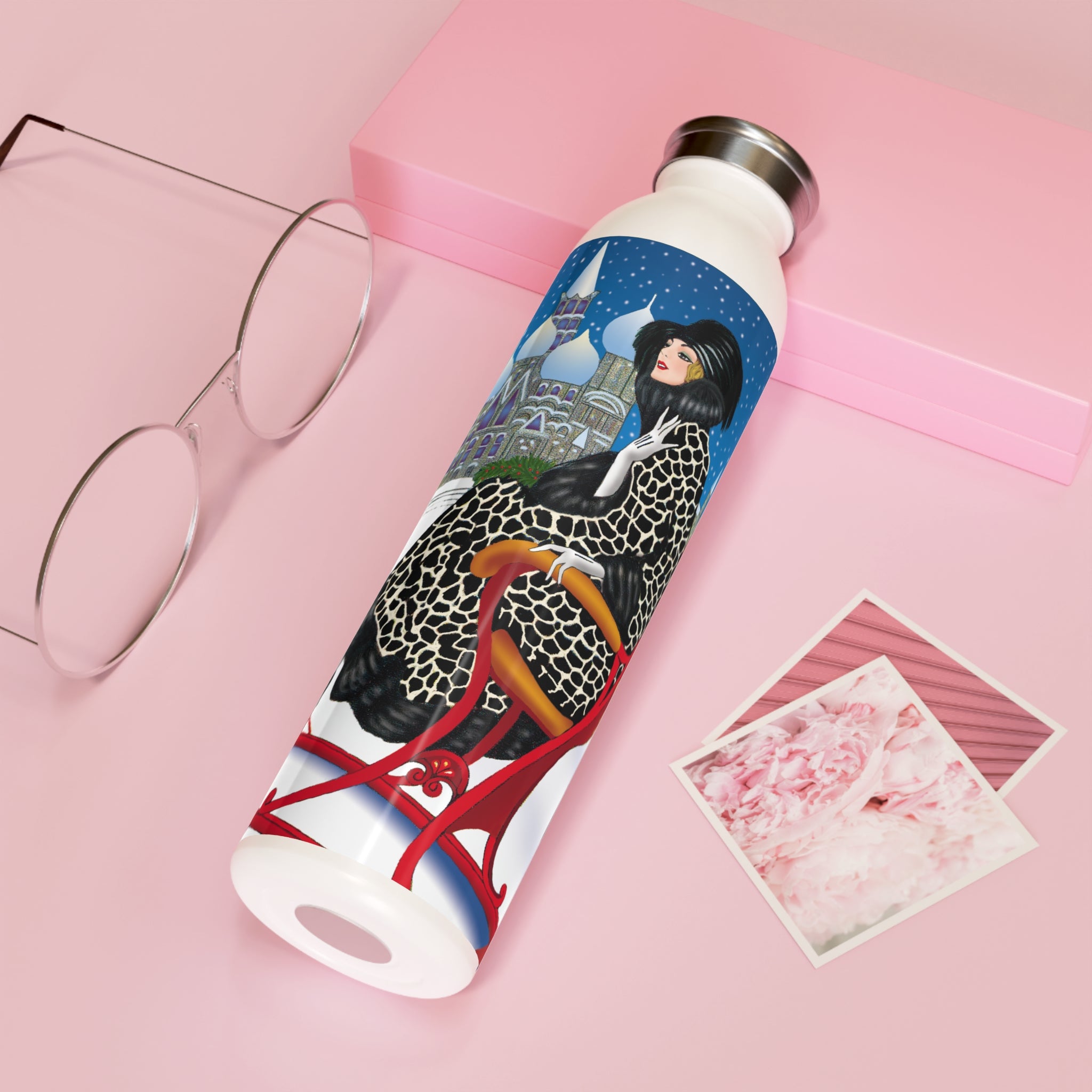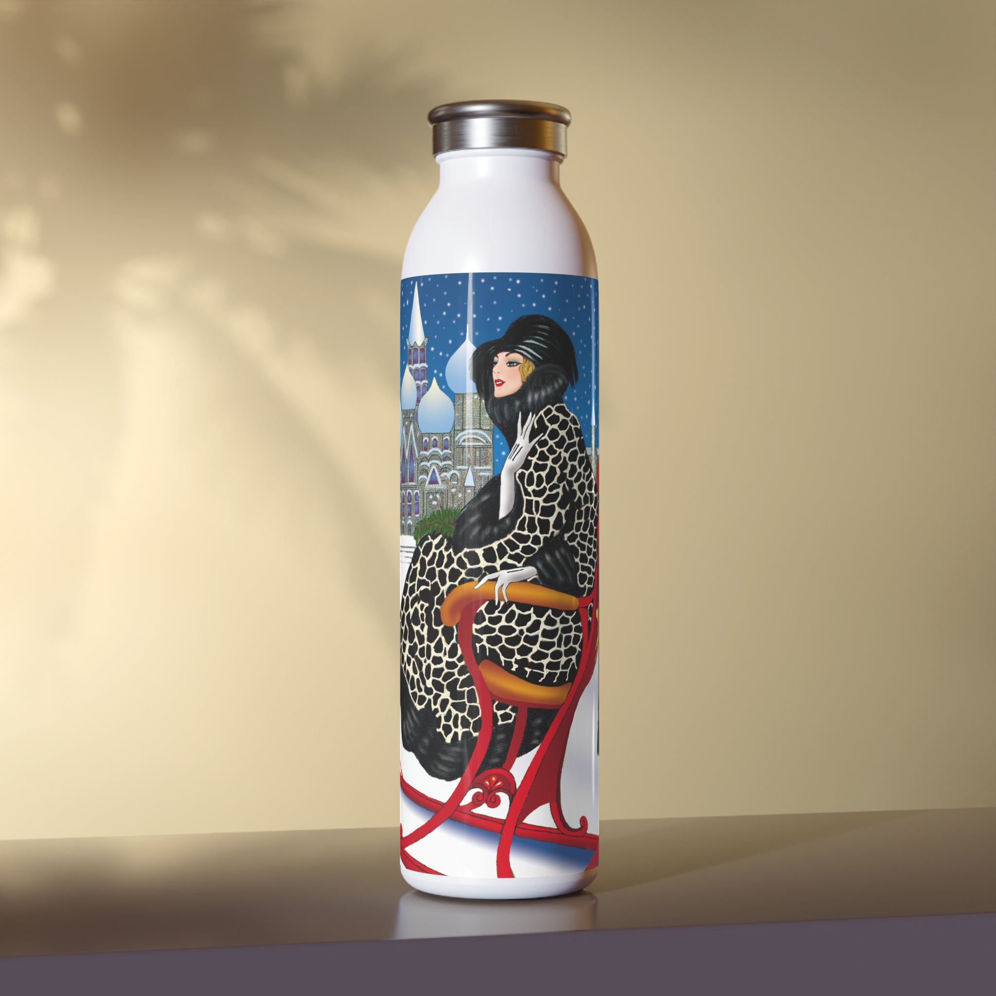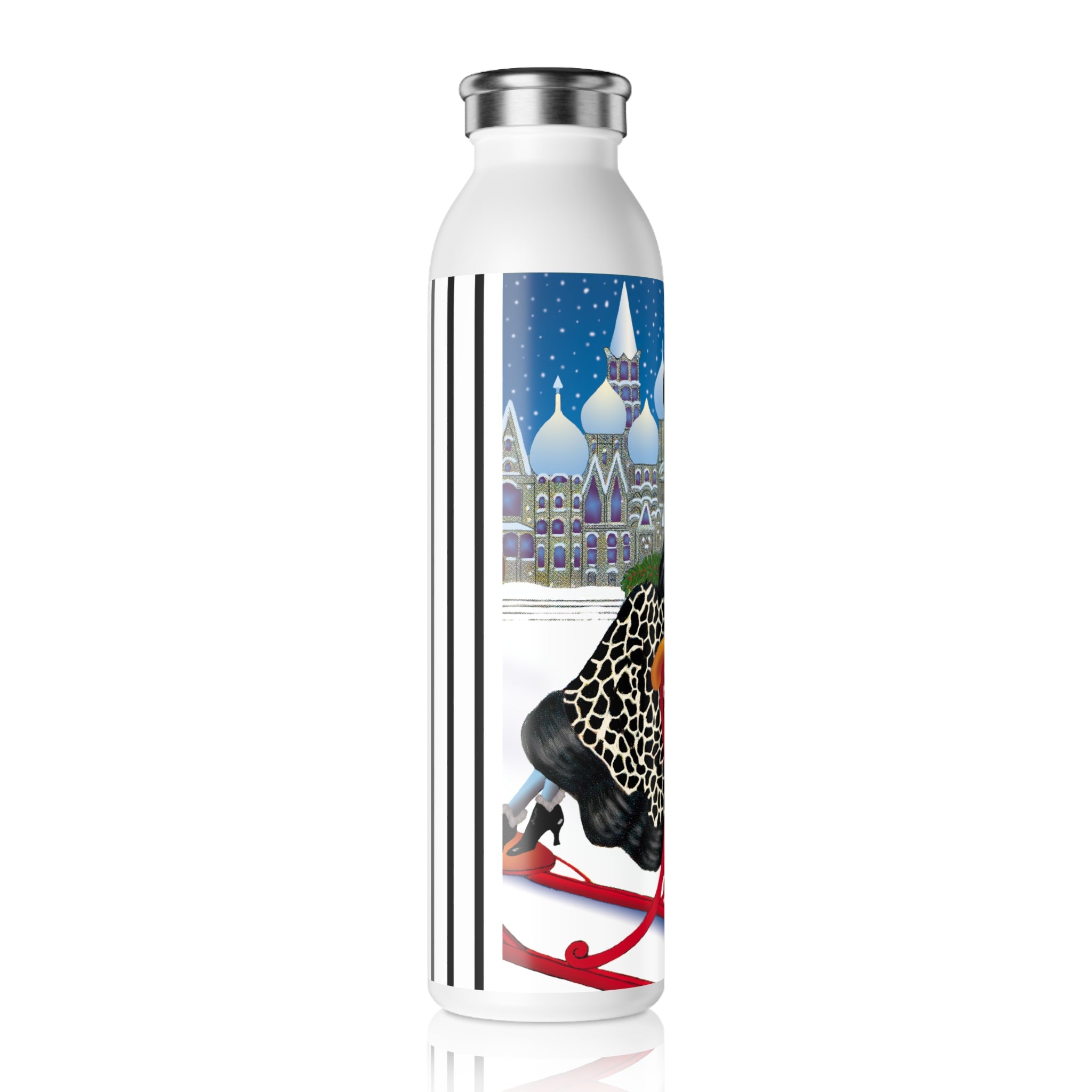 Stay stylishly hydrated with the Elegant Winter Woman in Sleigh Slim Water Bottle. With a 20oz capacity, sleek matte finish, and double-wall stainless steel frame with vacuum insulation, this bottle keeps drinks perfectly hot or cold for hours while adding a touch of seasonal elegance.
