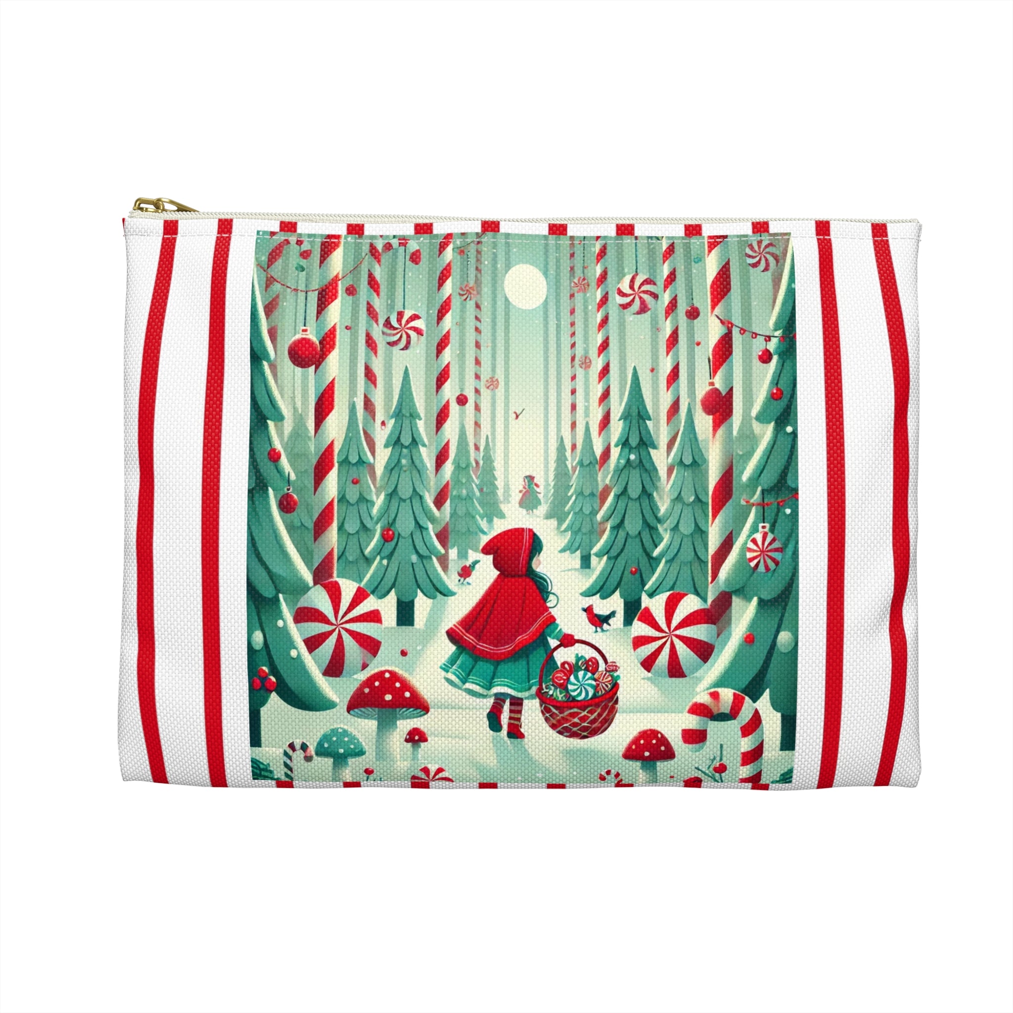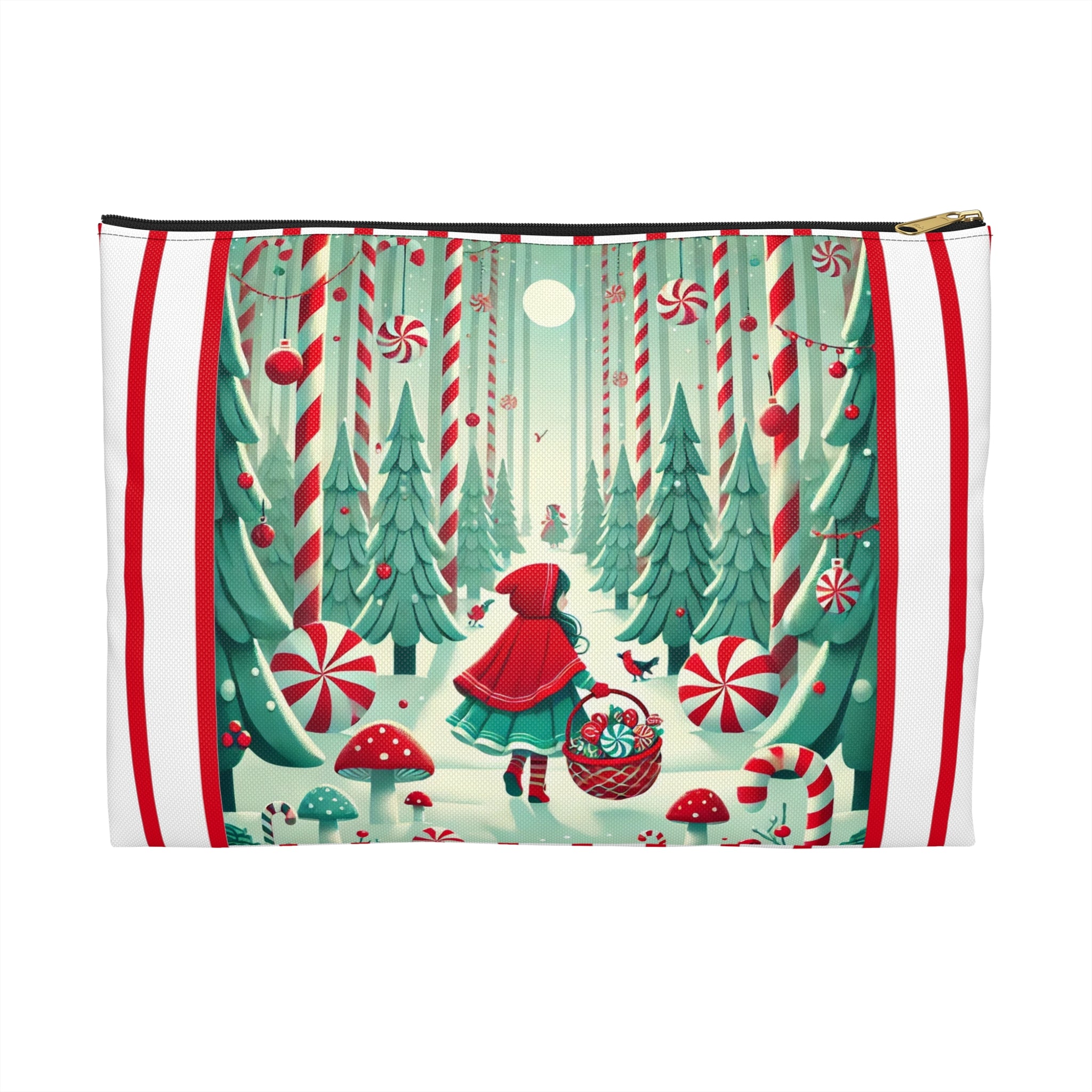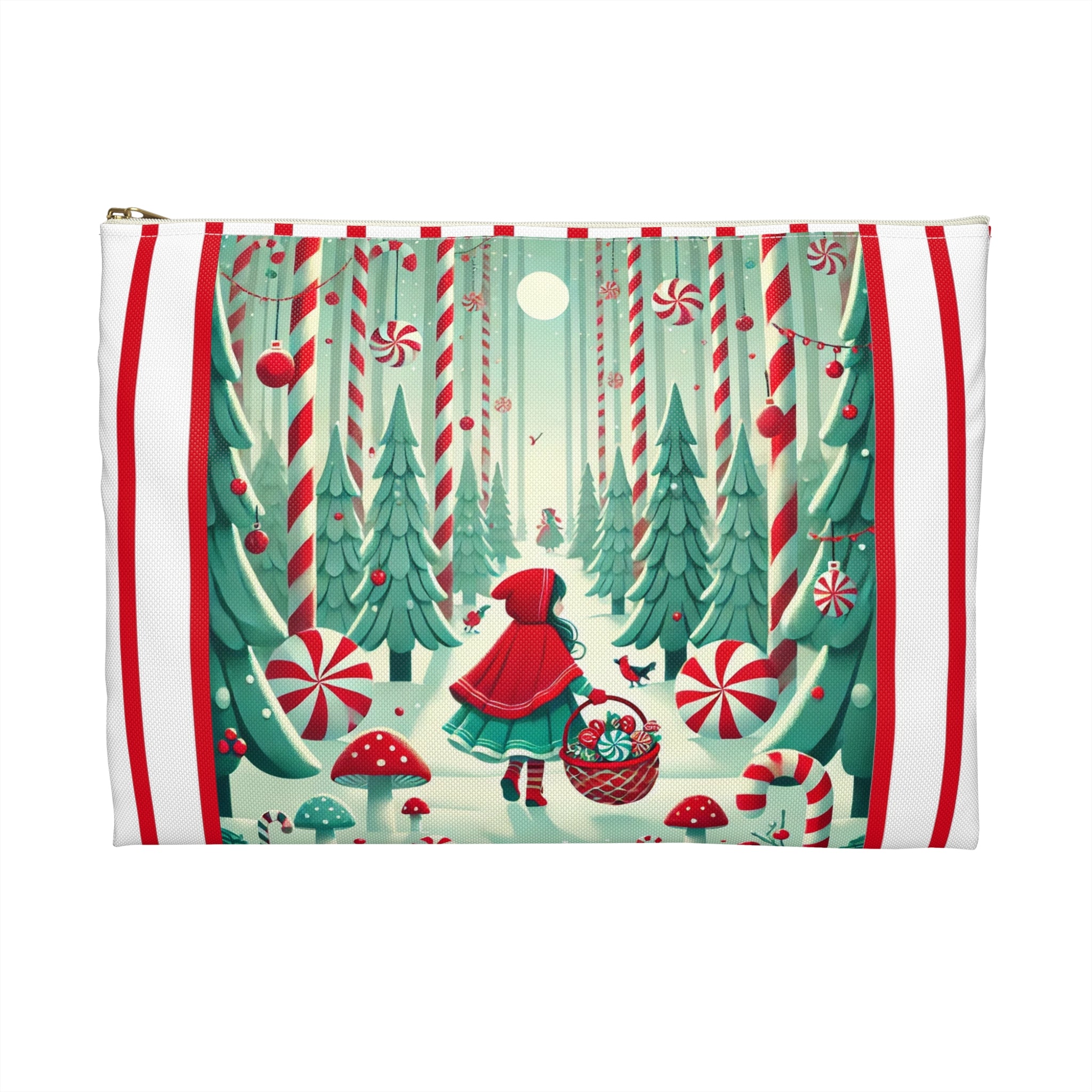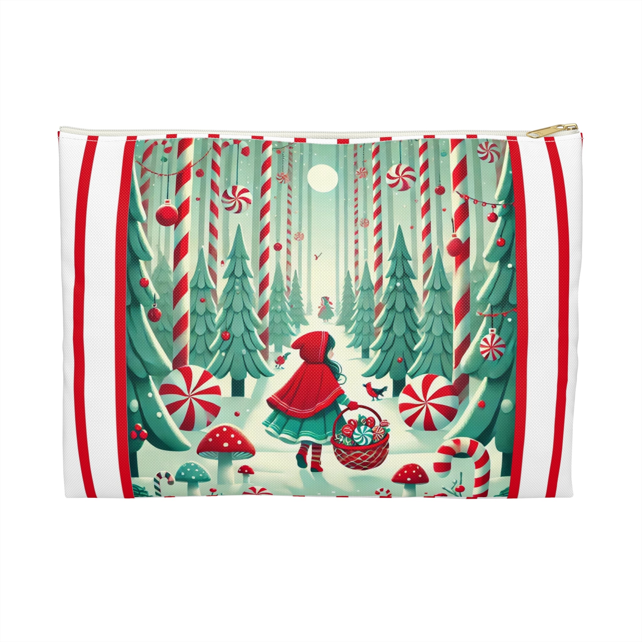 The artwork brings a whimsical story to life. A young girl in a red hooded cloak and green dress wanders through a magical forest of towering candy canes and snowy evergreens draped in garlands. Peppermint swirls float through the frosty air while mushrooms and striped sweets dot the snowy path. Lit by the full moon, the enchanting scene combines mystery with playfulness, turning a simple pouch into a festive keepsake filled with holiday wonder.