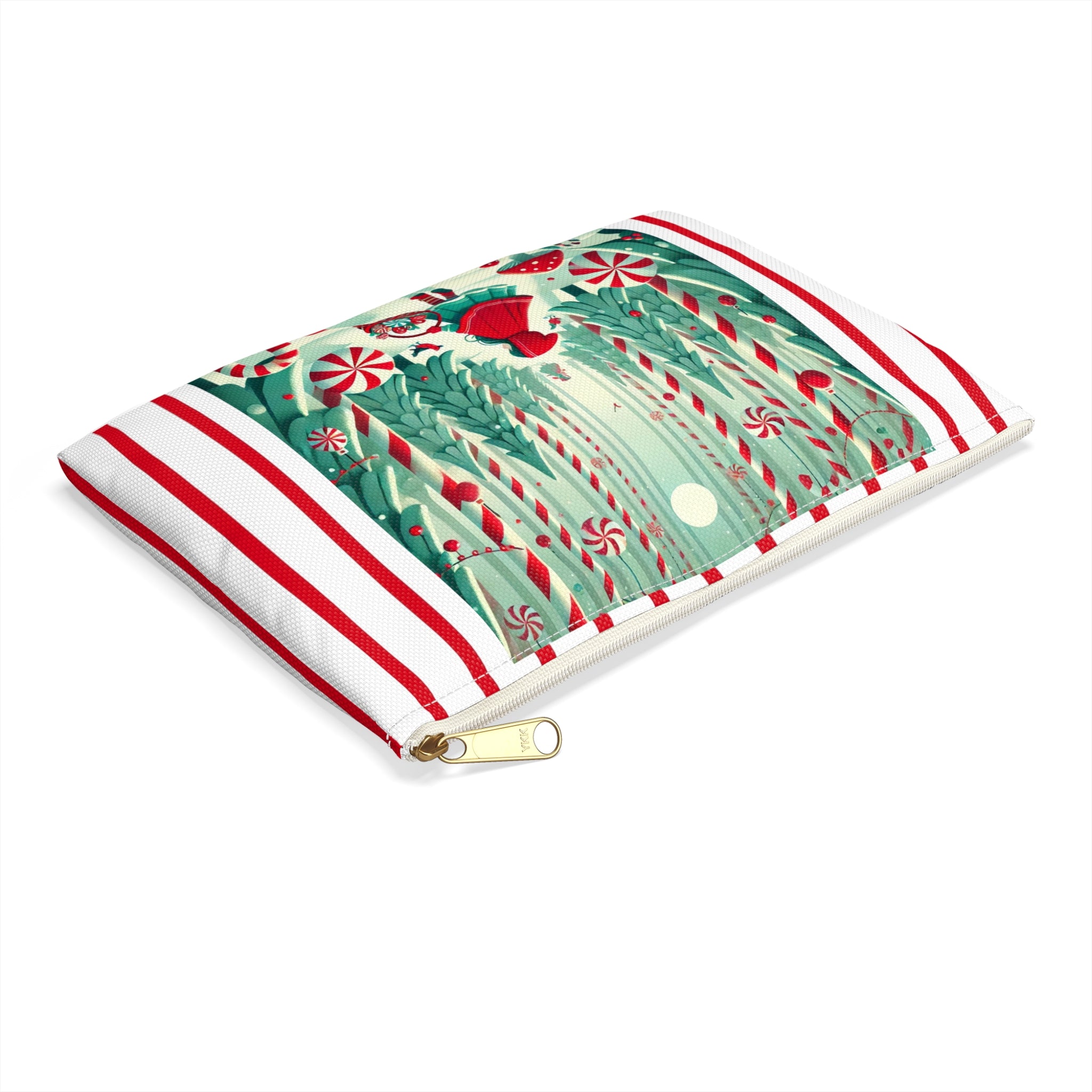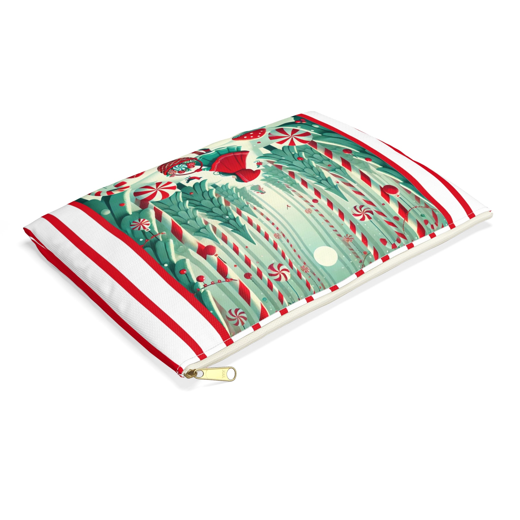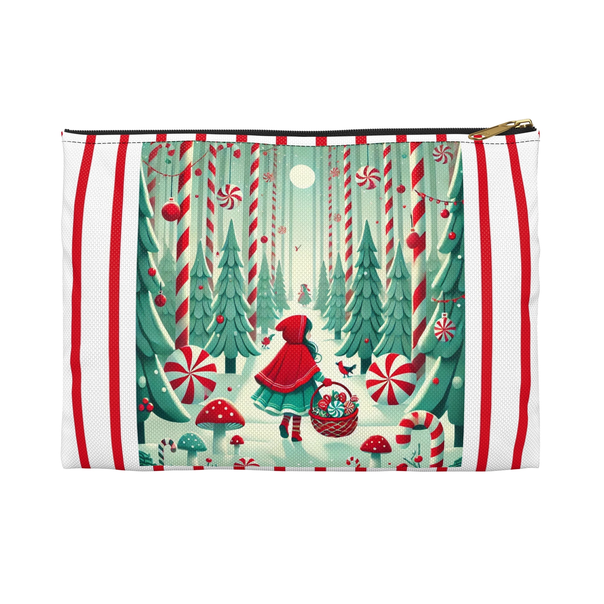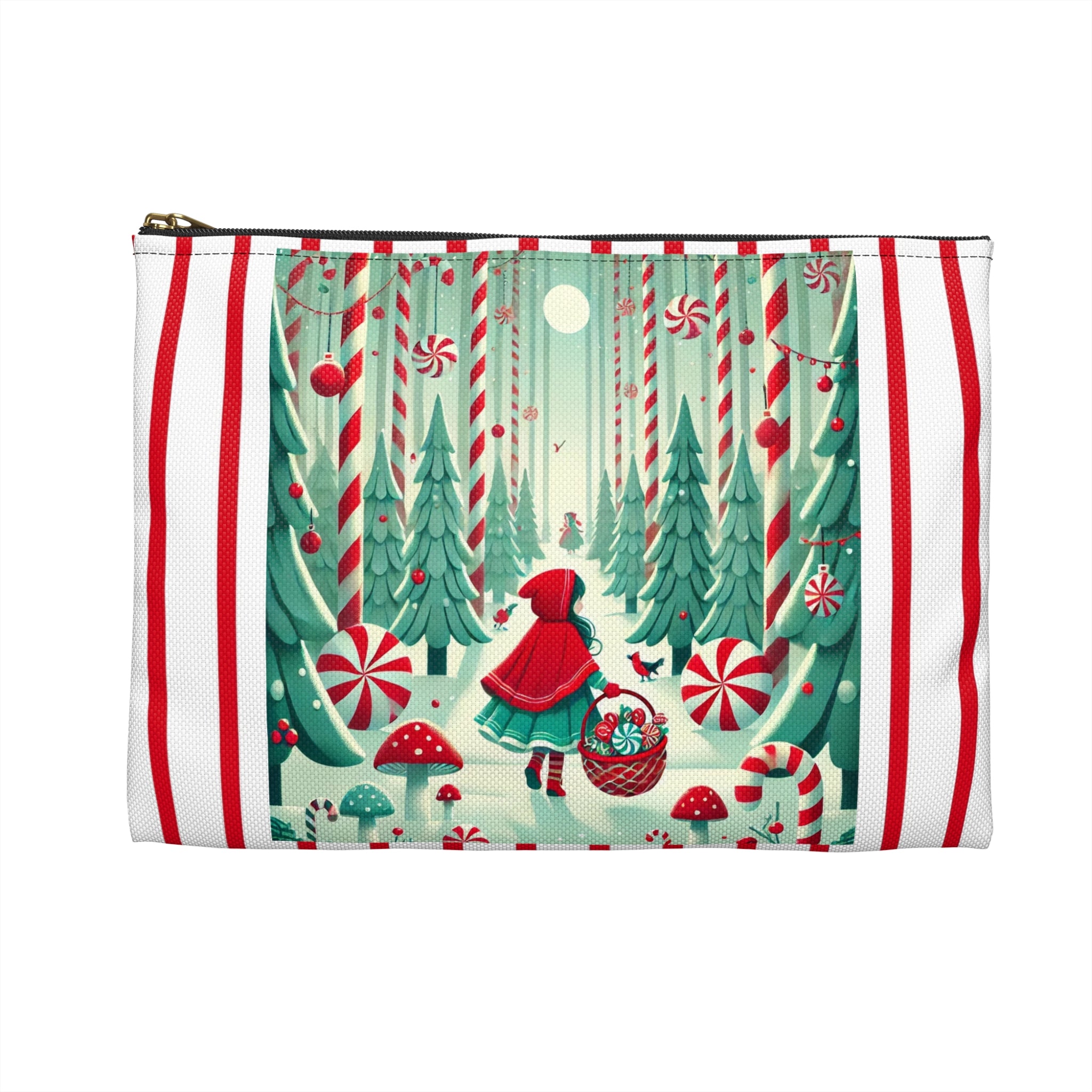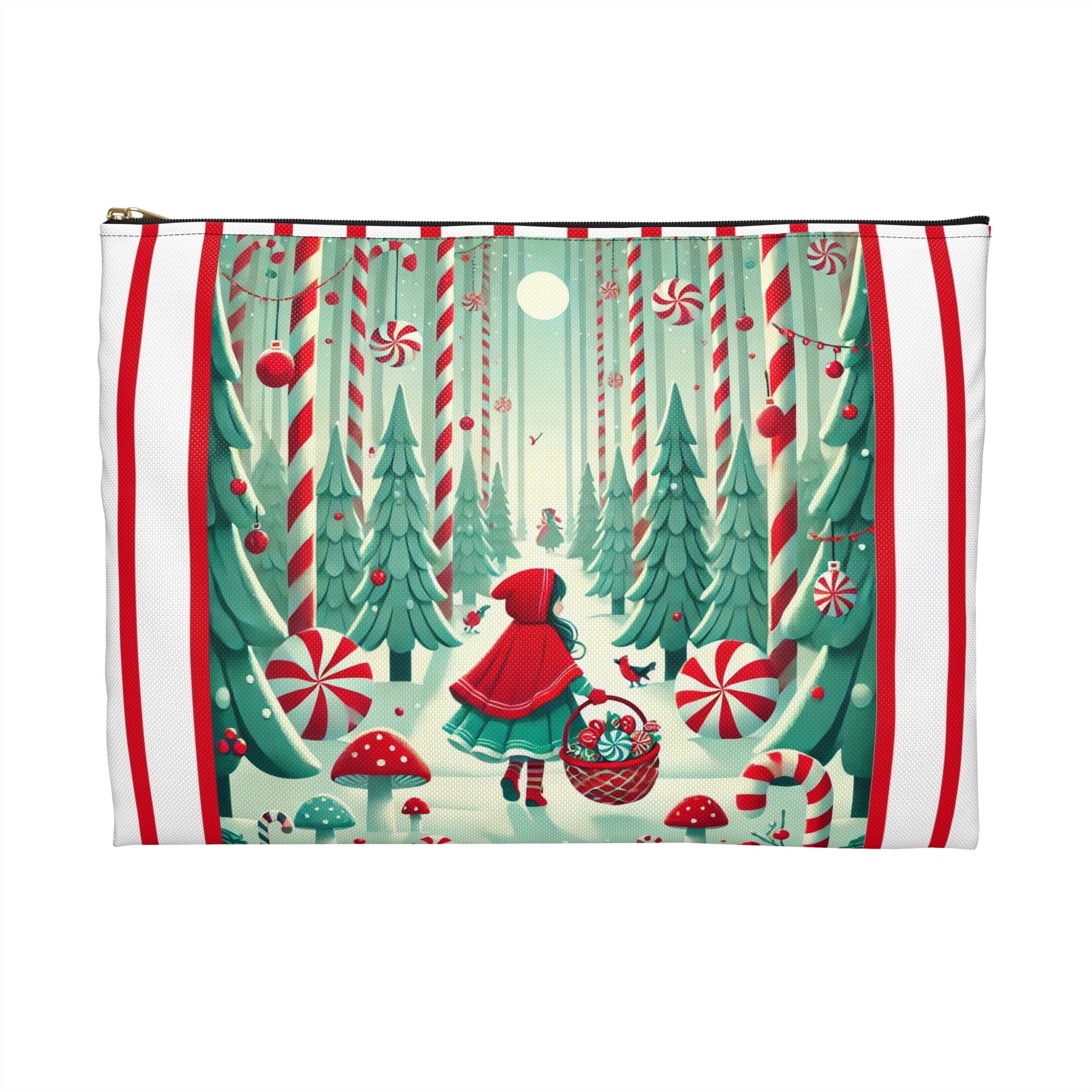The artwork brings a whimsical story to life. A young girl in a red hooded cloak and green dress wanders through a magical forest of towering candy canes and snowy evergreens draped in garlands. Peppermint swirls float through the frosty air while mushrooms and striped sweets dot the snowy path. Lit by the full moon, the enchanting scene combines mystery with playfulness, turning a simple pouch into a festive keepsake filled with holiday wonder.