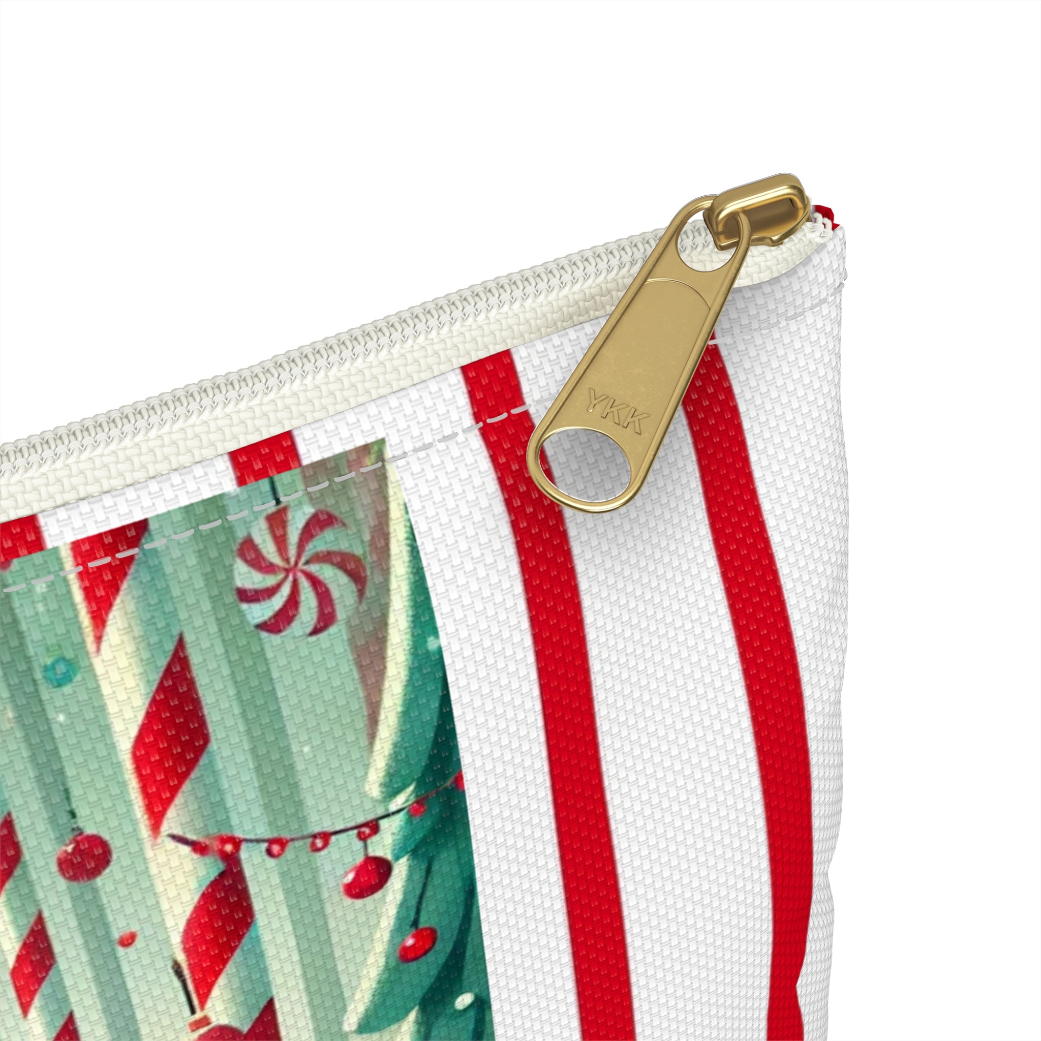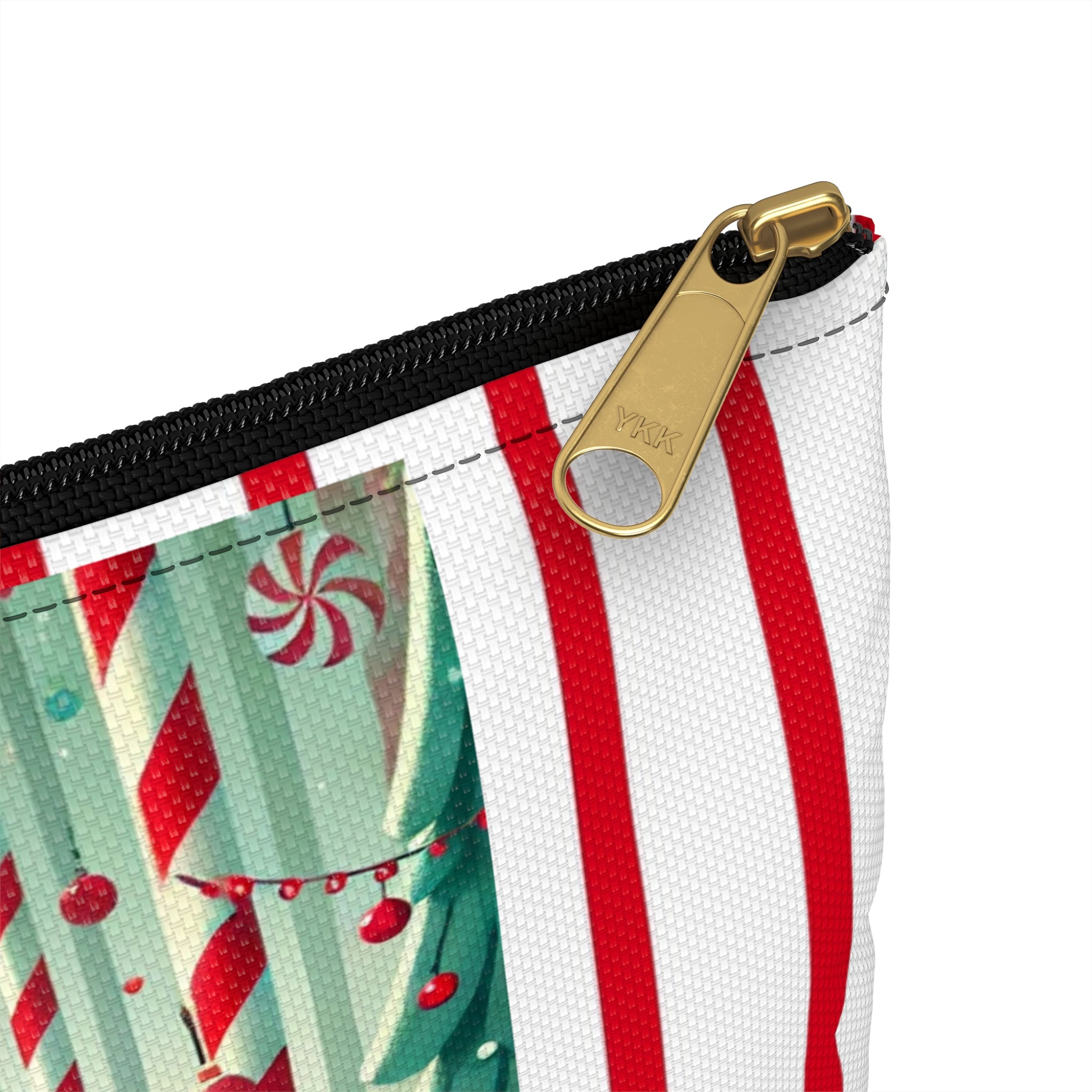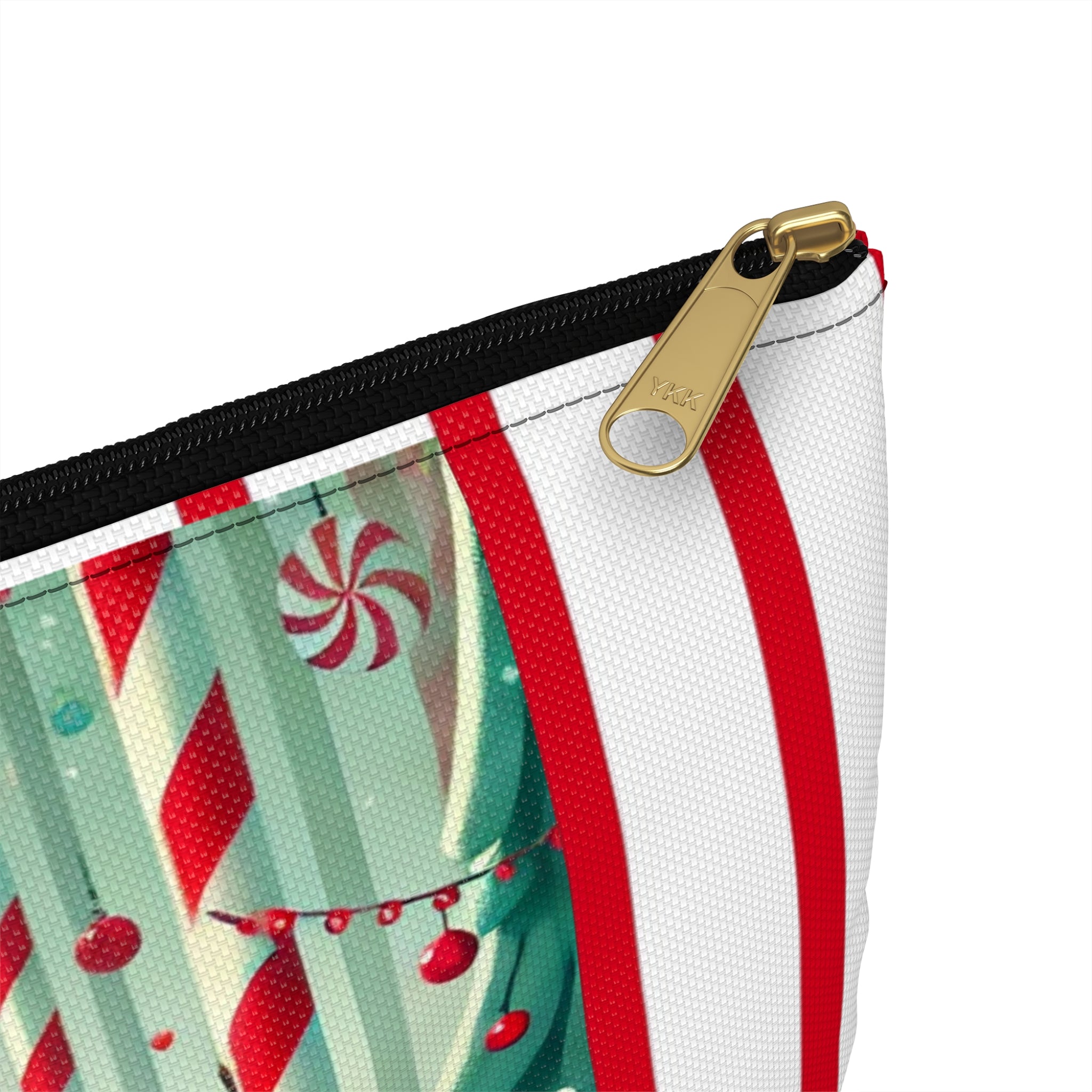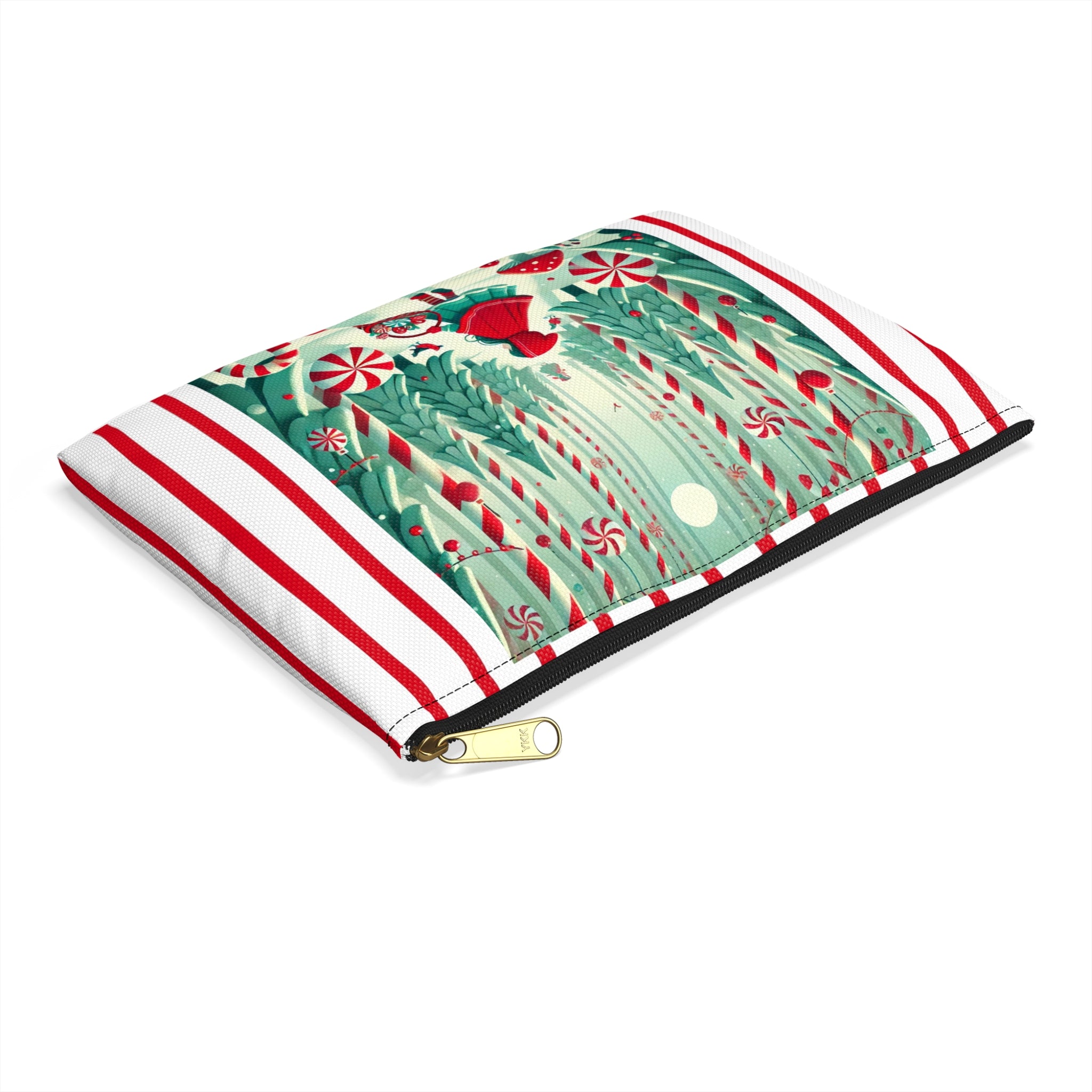 The artwork brings a whimsical story to life. A young girl in a red hooded cloak and green dress wanders through a magical forest of towering candy canes and snowy evergreens draped in garlands. Peppermint swirls float through the frosty air while mushrooms and striped sweets dot the snowy path. Lit by the full moon, the enchanting scene combines mystery with playfulness, turning a simple pouch into a festive keepsake filled with holiday wonder.