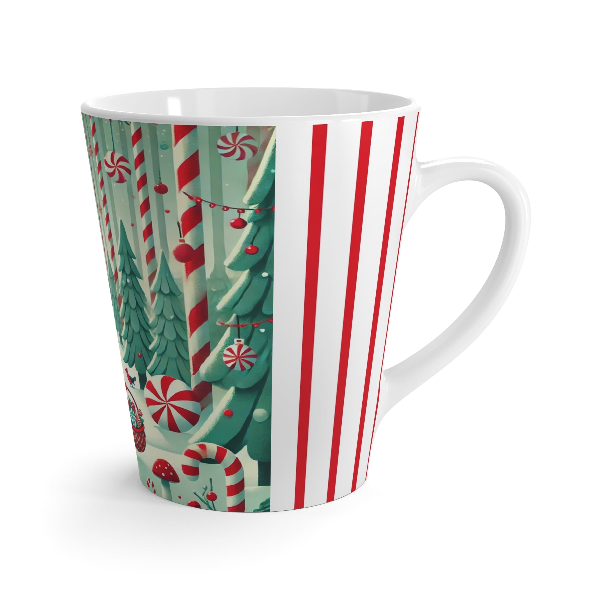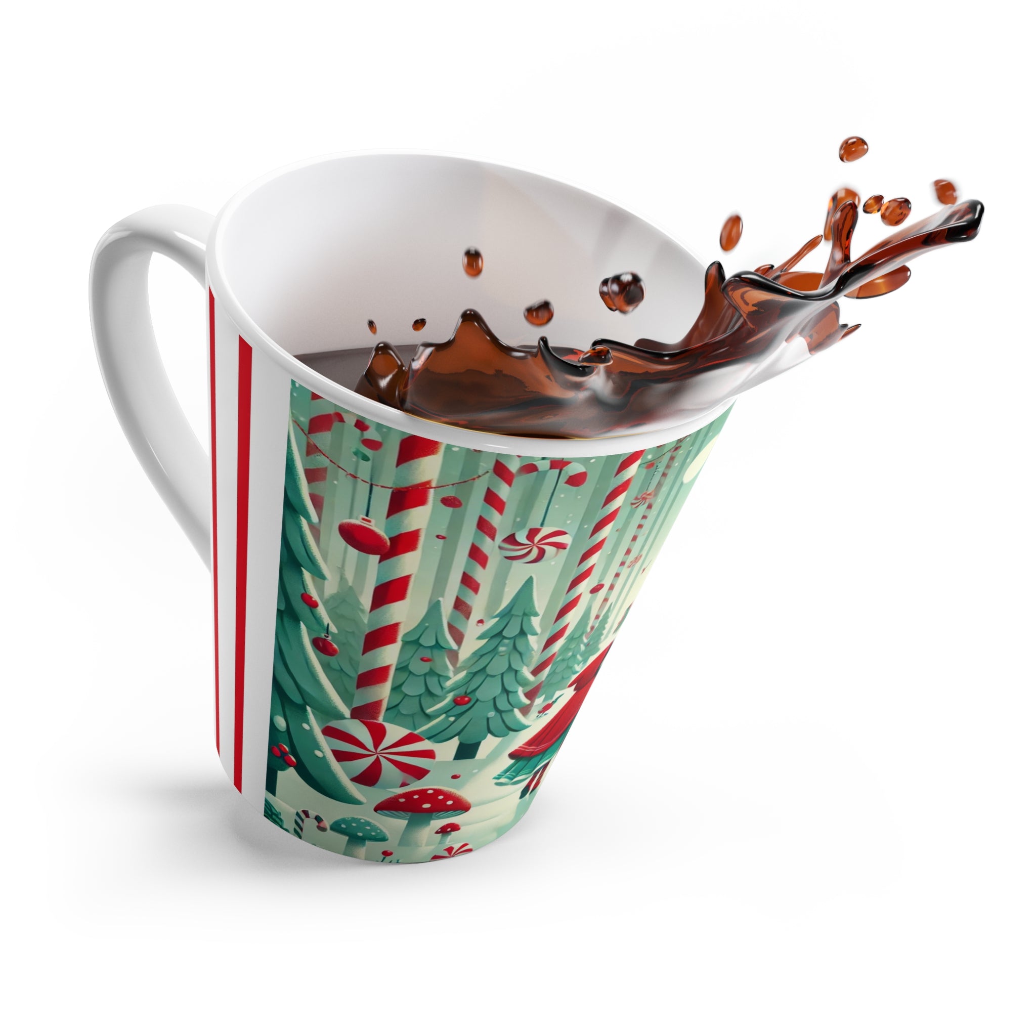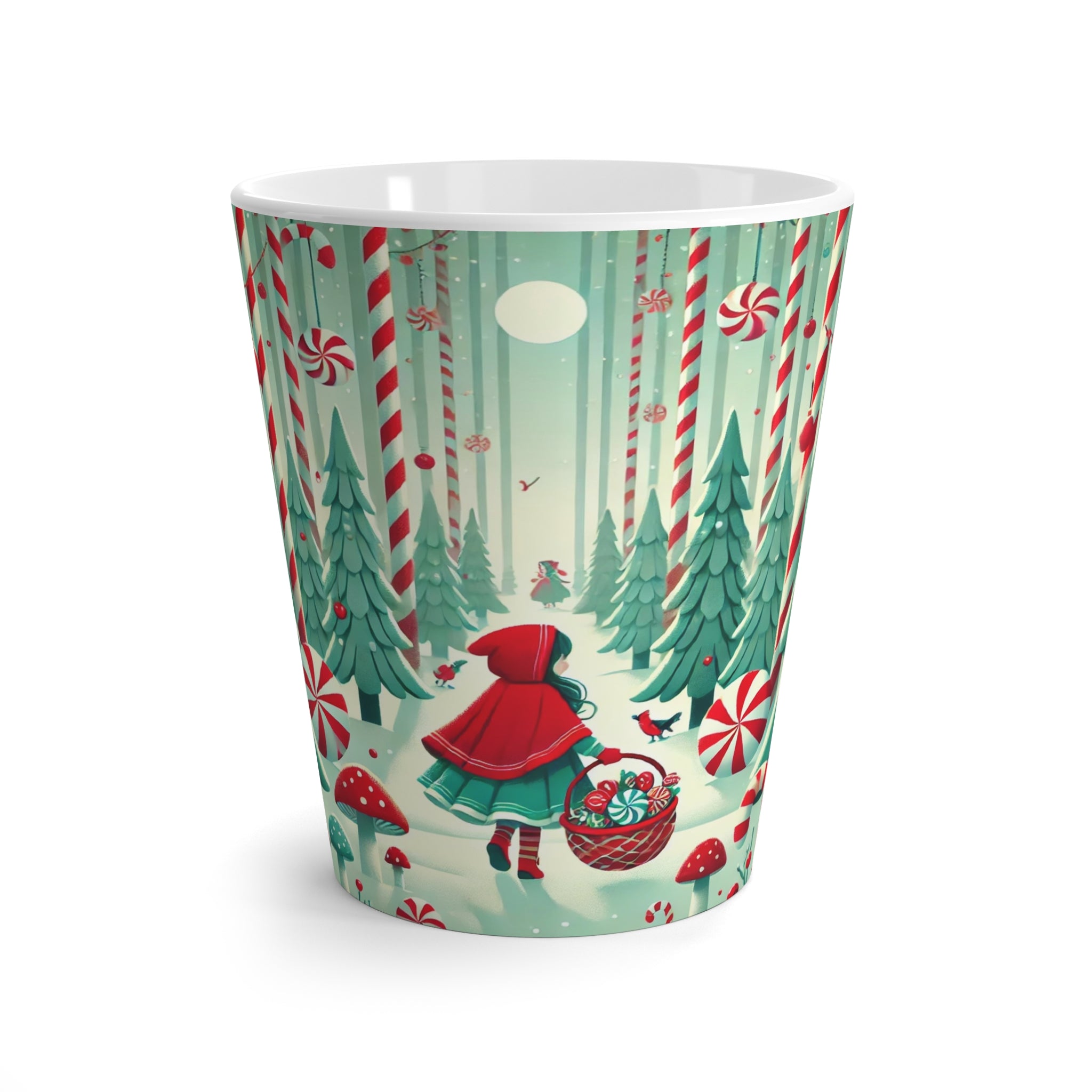 The artwork transforms your morning coffee into a storybook moment. A young girl in a red hooded cloak wanders through a magical forest of candy canes and peppermint swirls, her basket filled with holiday treats. Evergreen trees rise tall around her, draped with festive garlands, while mushrooms and striped sweets dot the snowy ground. Under the moonlit sky, this whimsical scene captures the wonder of the season and brings it straight to your table.