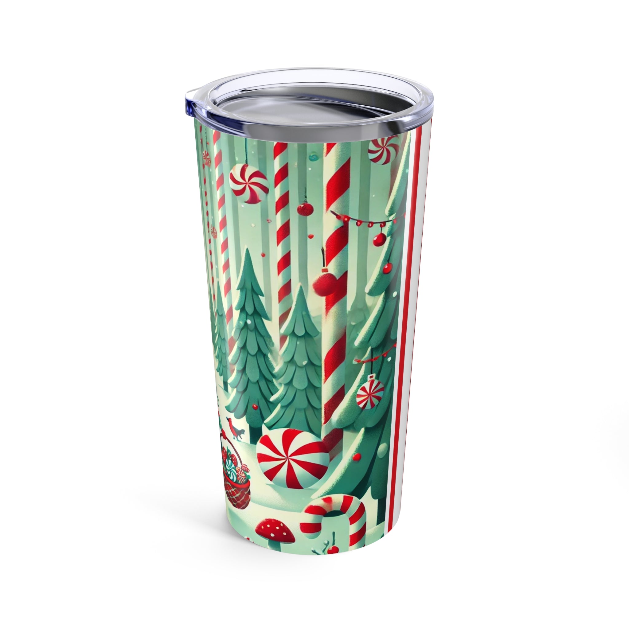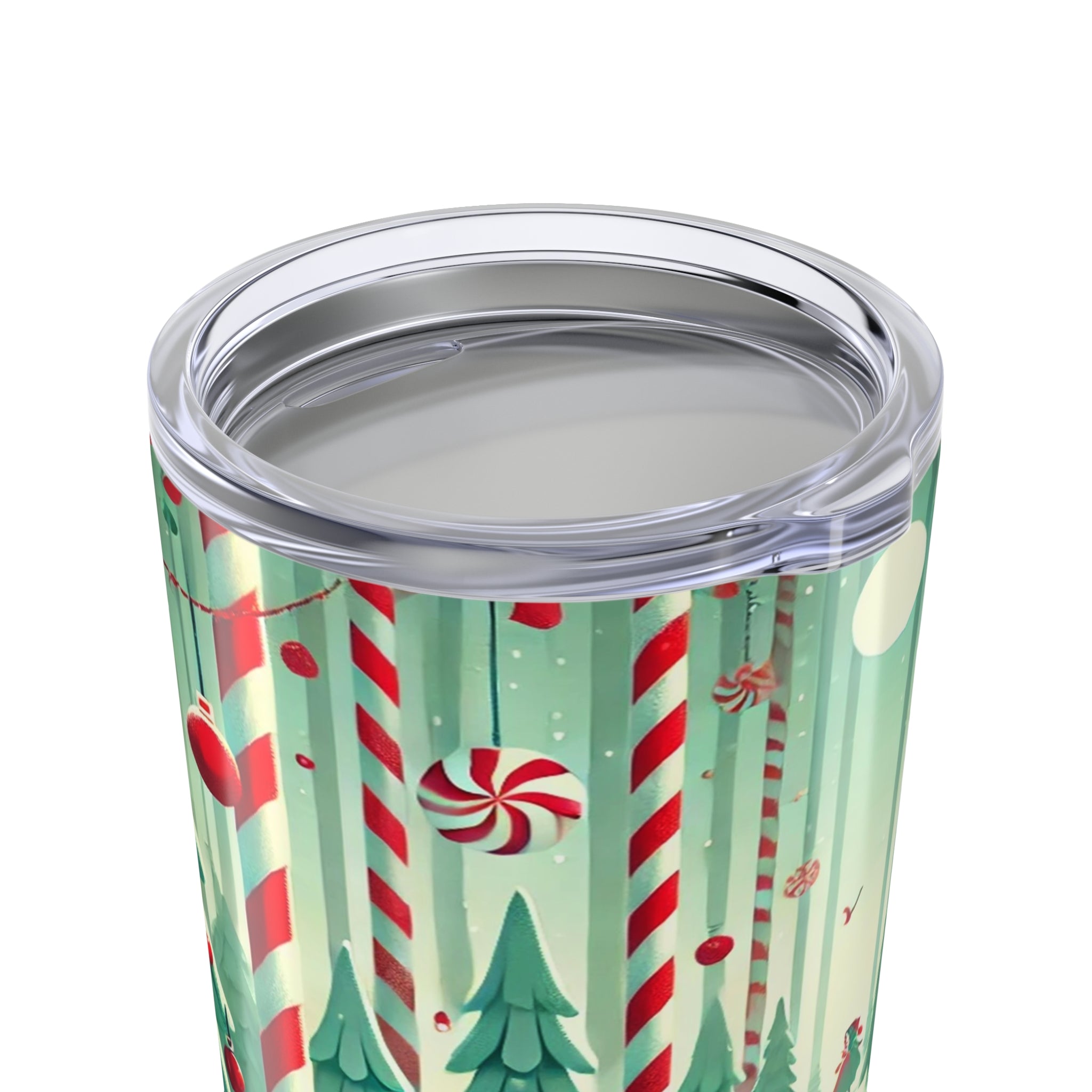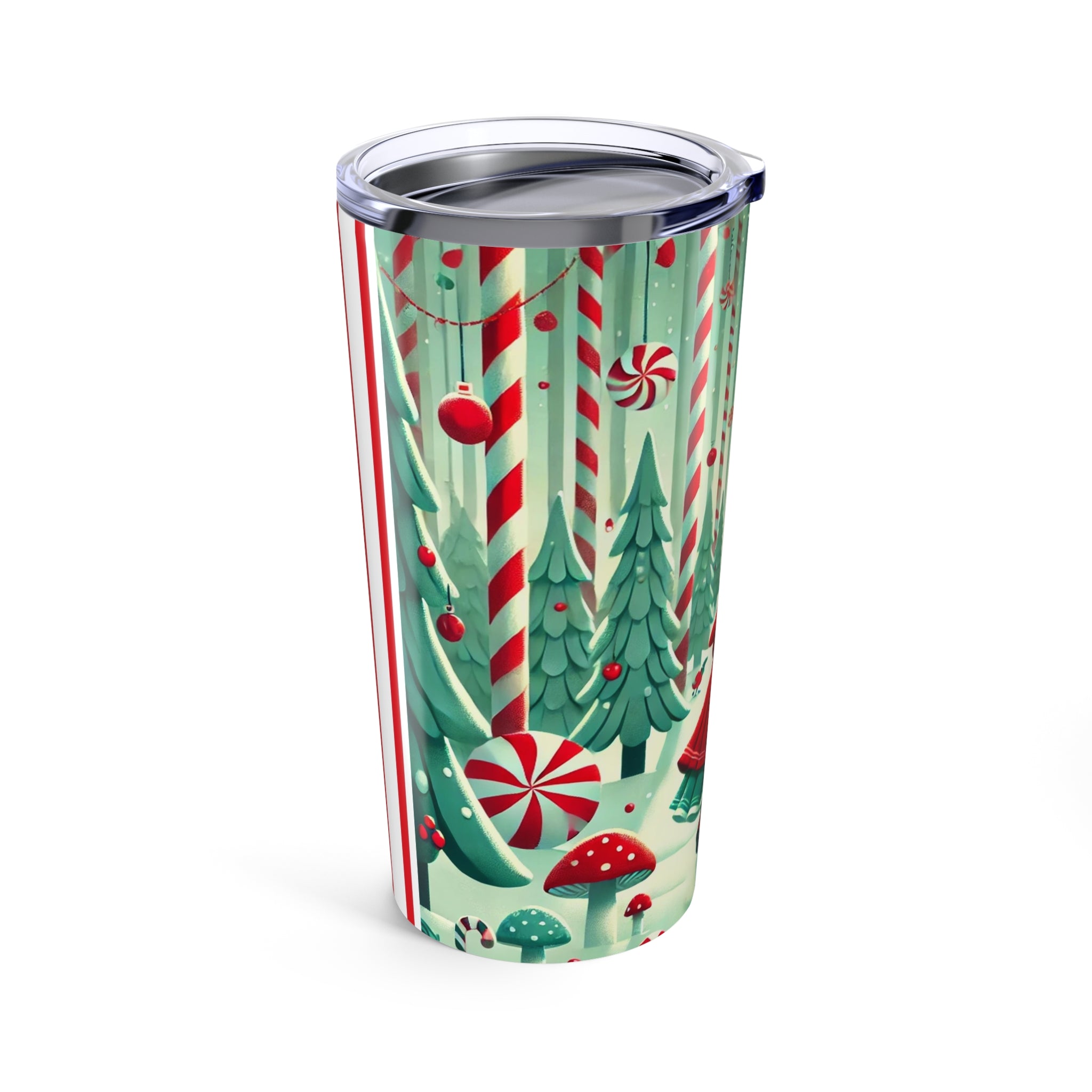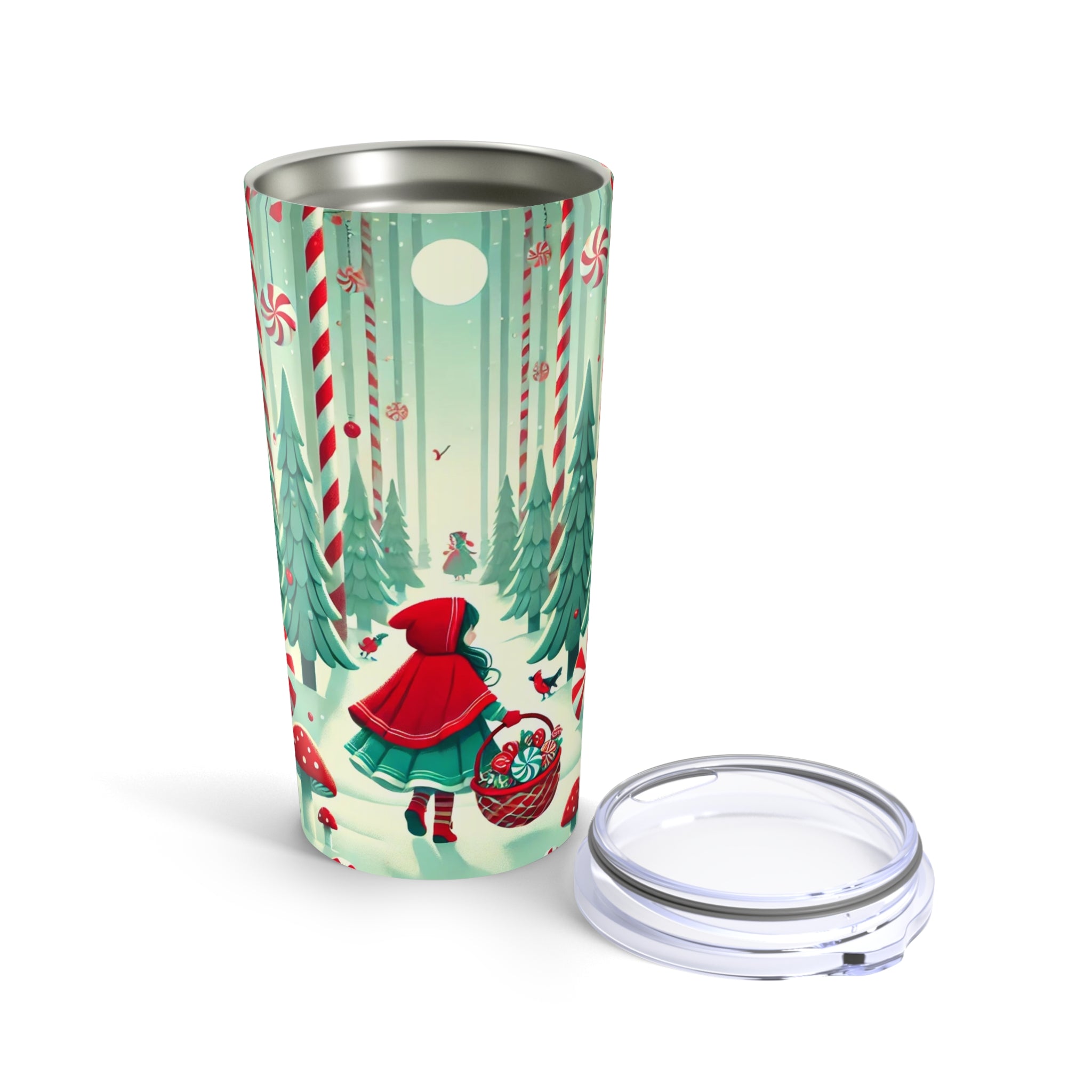 The design transports you into an enchanted winter forest. A girl in a red hooded cloak and green dress wanders among towering candy canes and snowy evergreens strung with garlands of berries. Peppermint swirls drift in the frosty air as scarlet mushrooms and striped sweets brighten the snowy ground. Under the glow of the full moon, the whimsical scene invites you into a storybook world where holiday wonder comes alive with every sip.