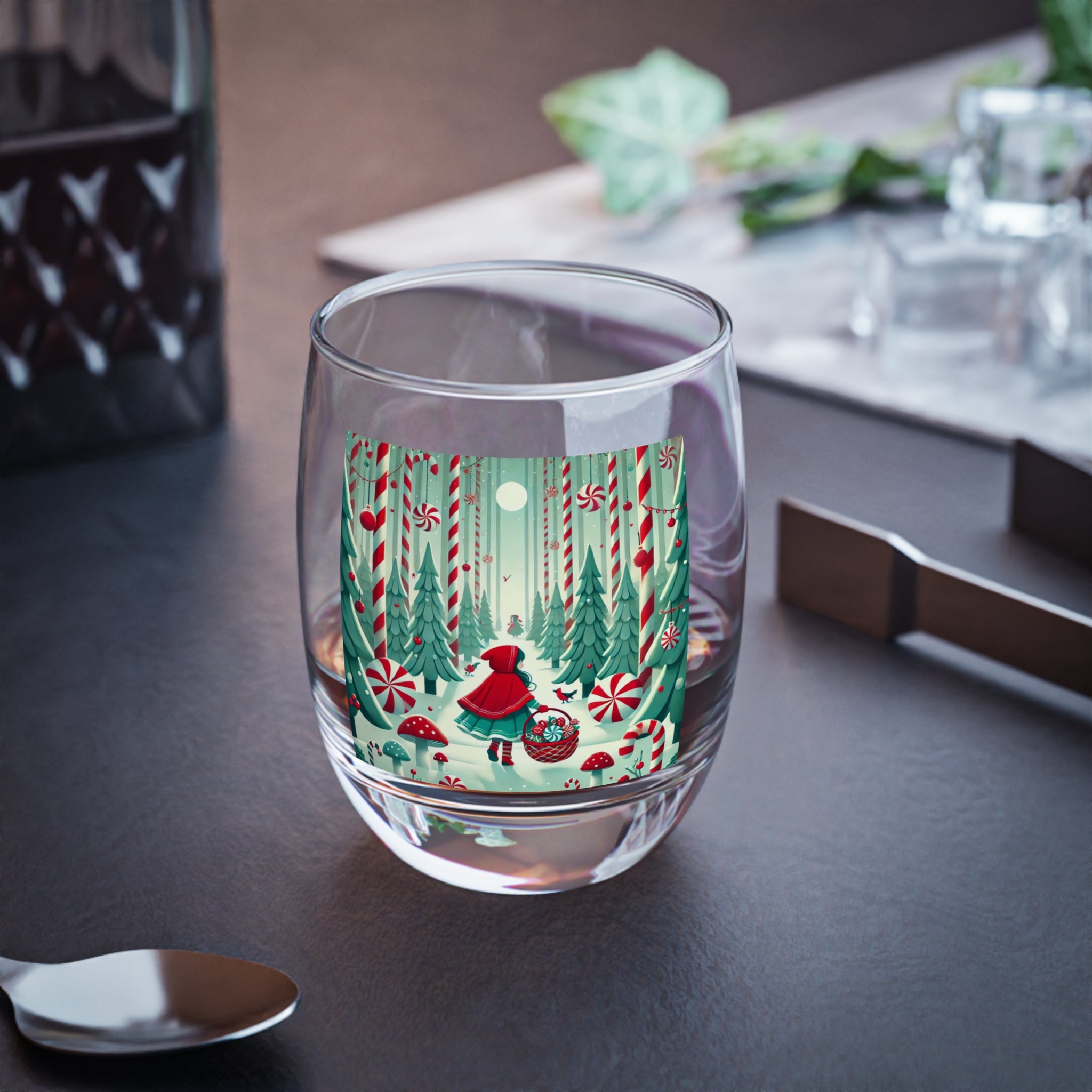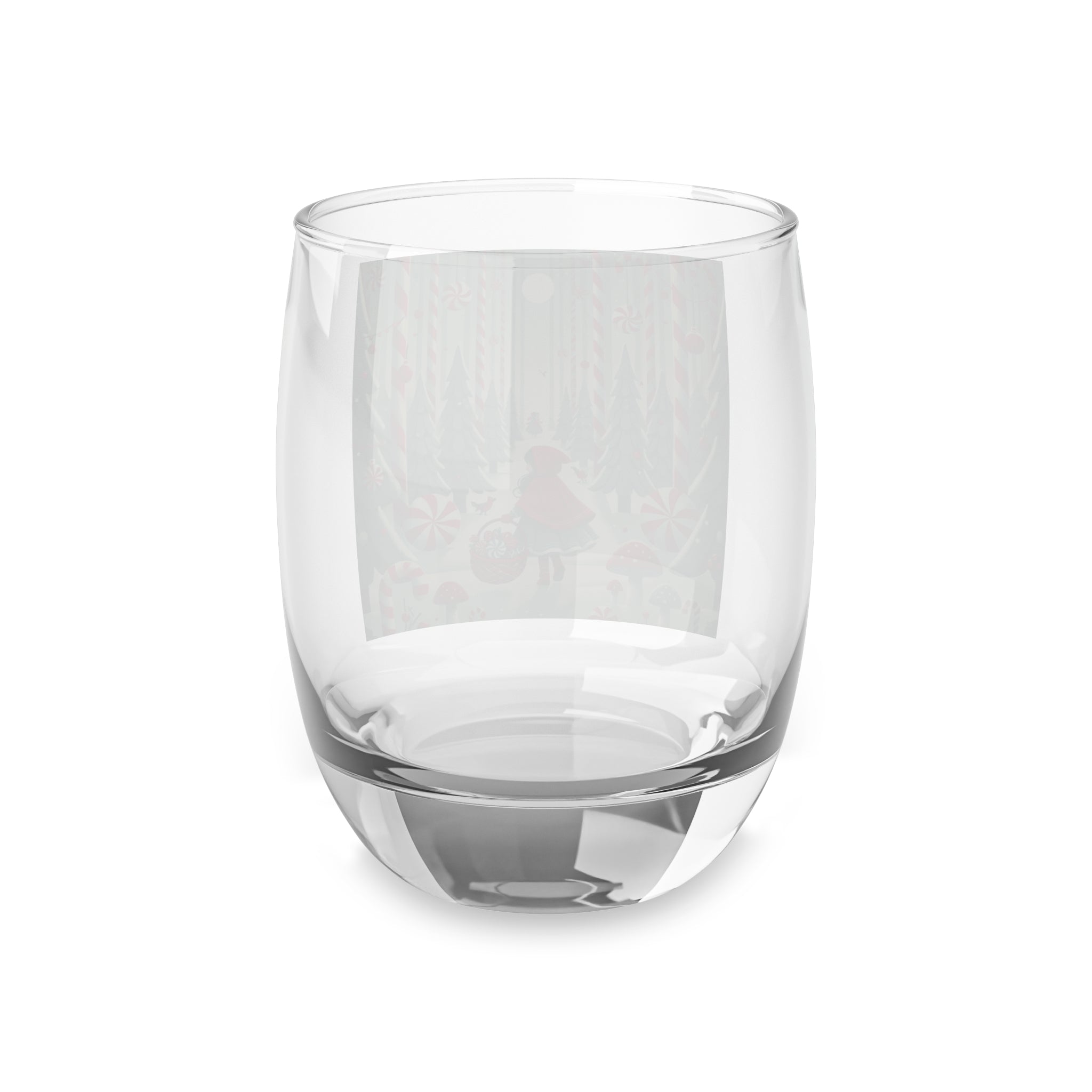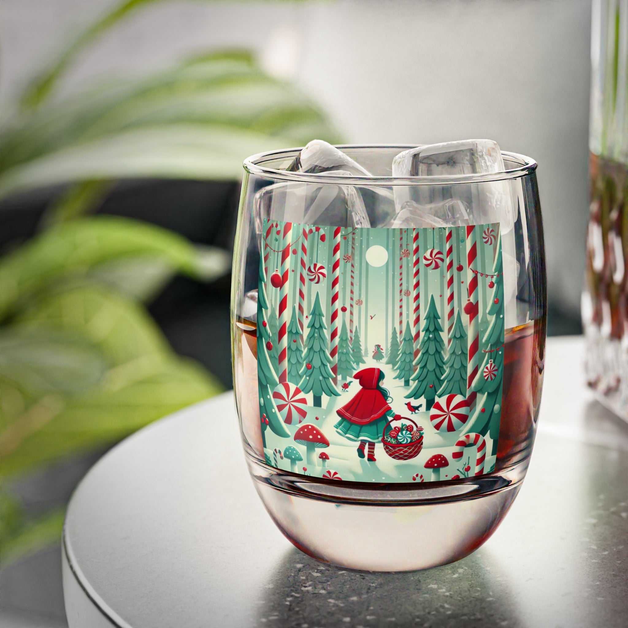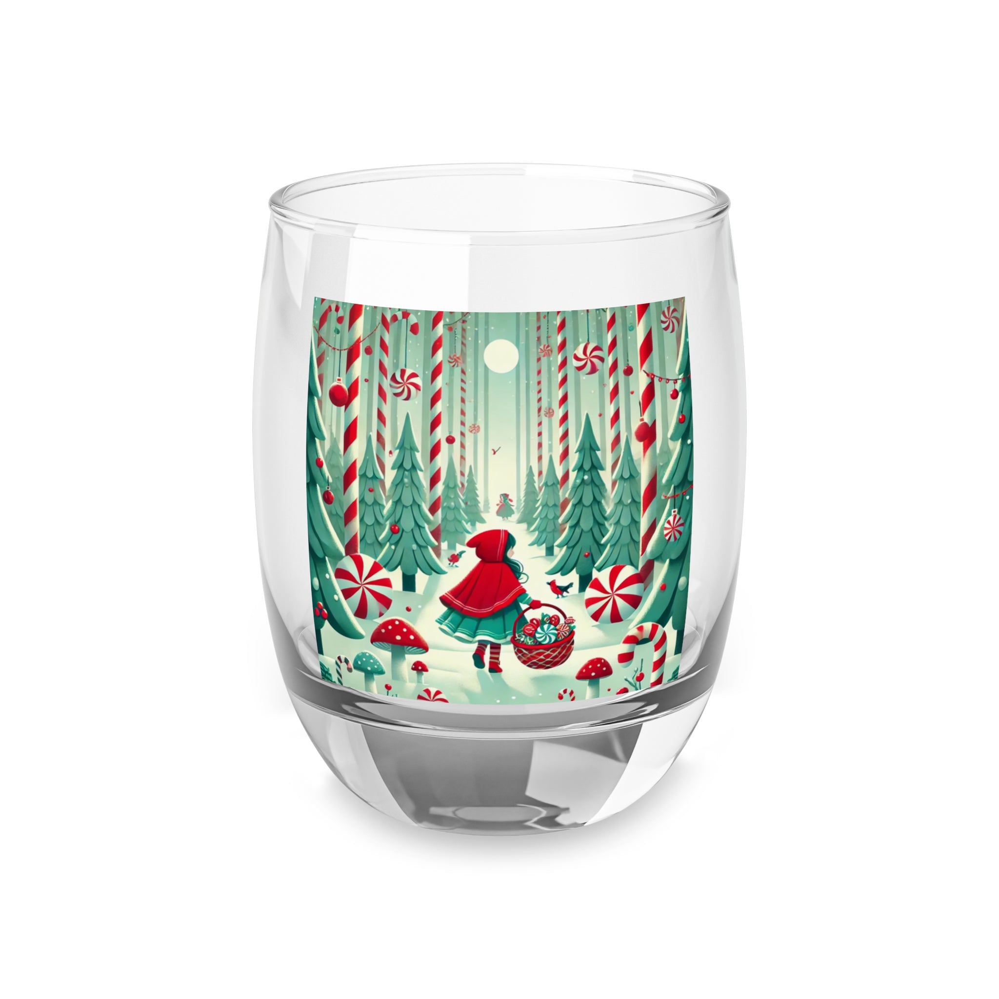 The design invites you into an enchanted winter wonderland. A young girl in a red hooded cloak and green dress wanders through a forest of towering candy canes and snowy evergreens draped in garlands. Peppermint swirls dance in the frosty air, while scarlet mushrooms and striped sweets brighten the snowy ground. Under the soft glow of a full moon, the scene feels whimsical and mysterious—transforming every sip into a storybook holiday moment.