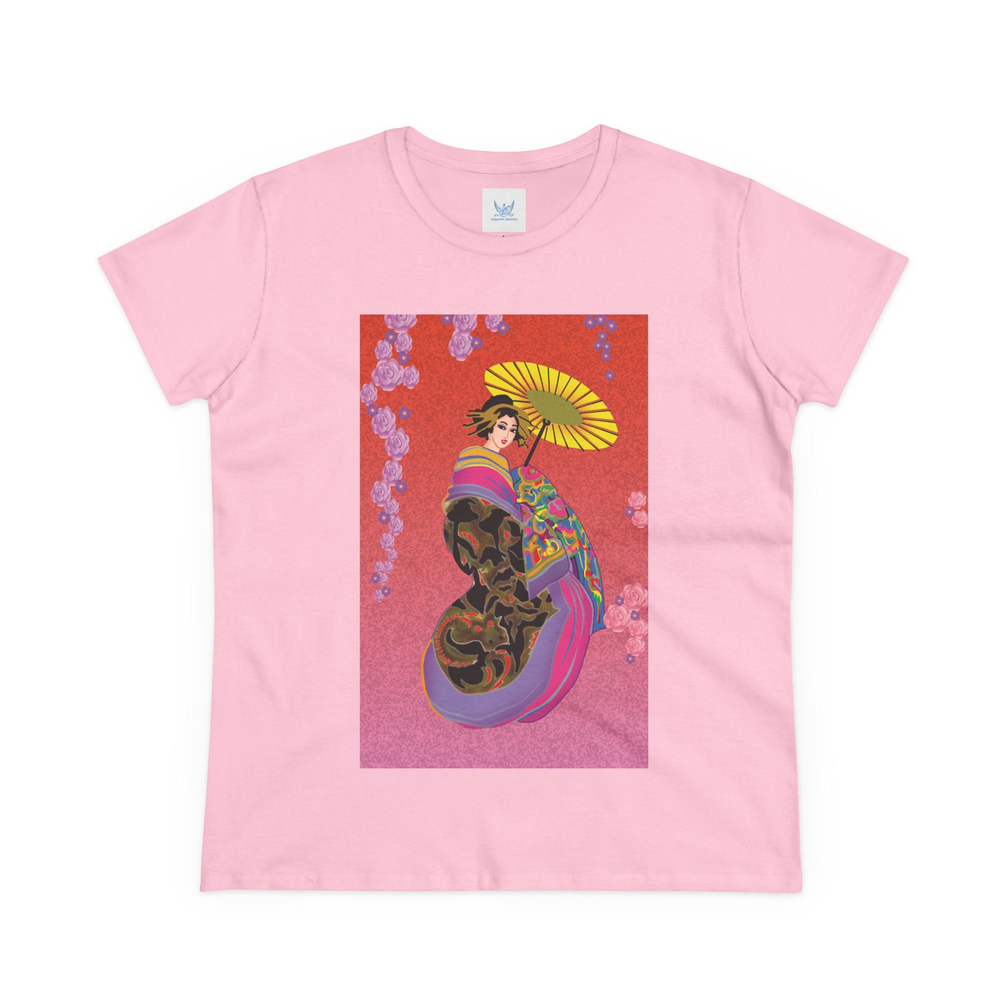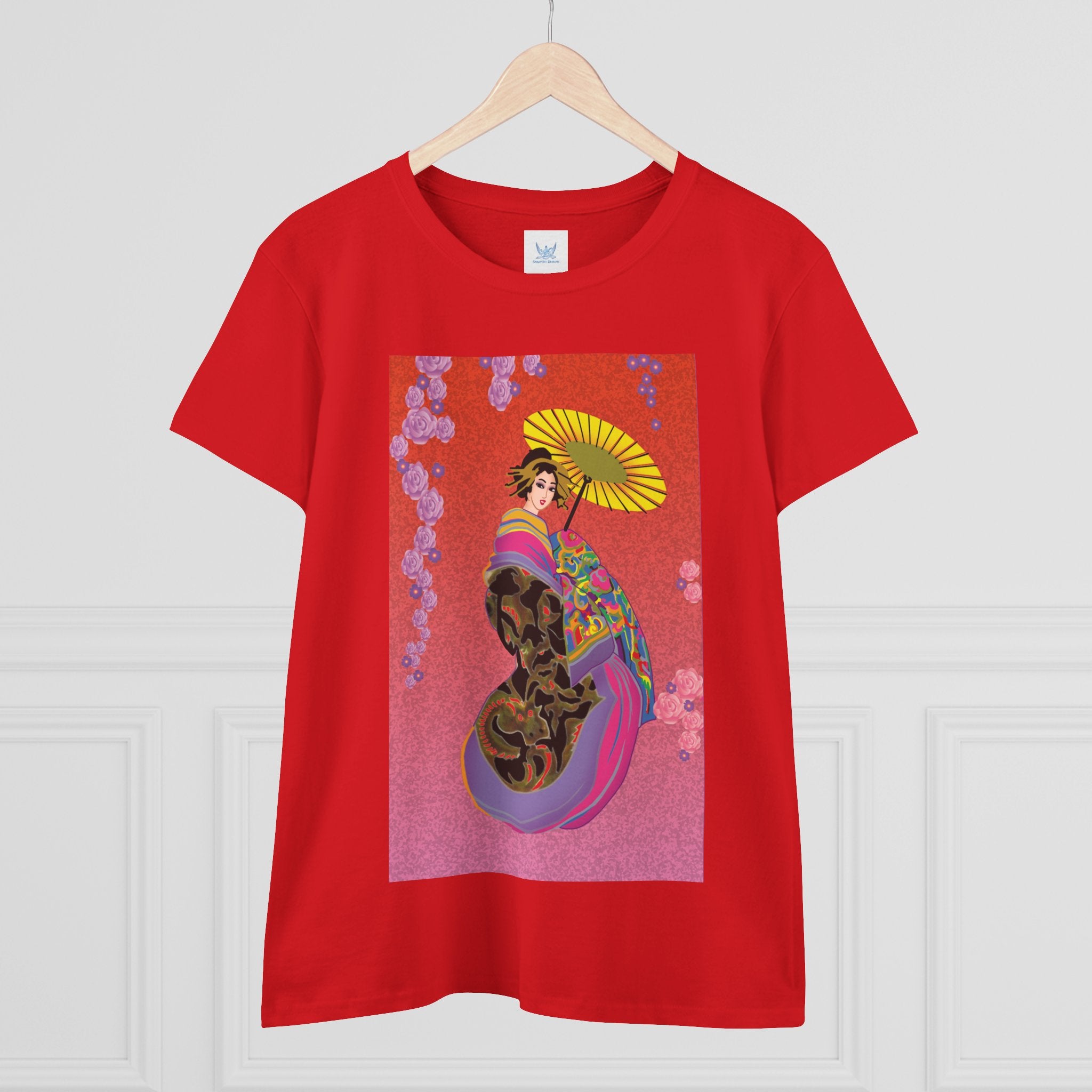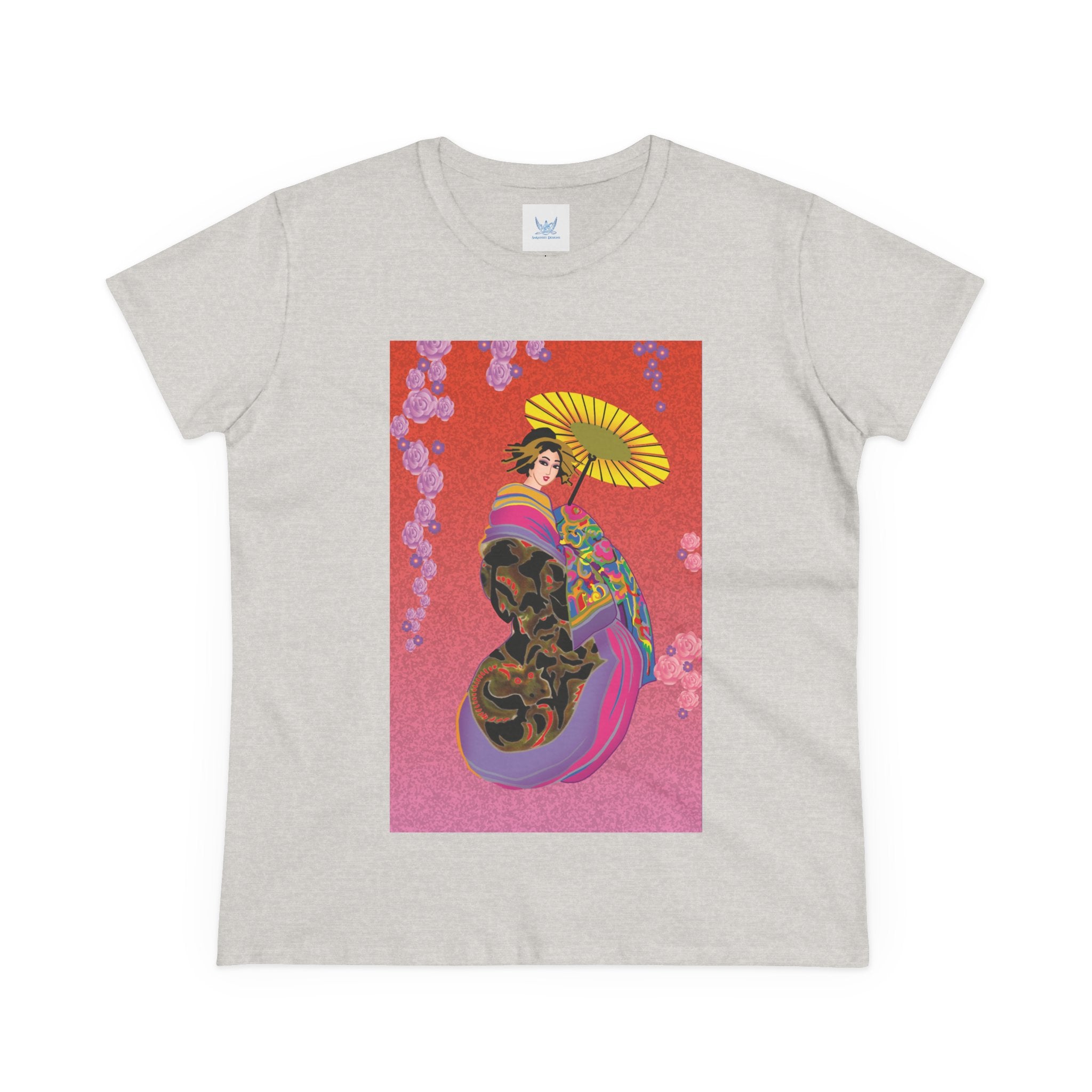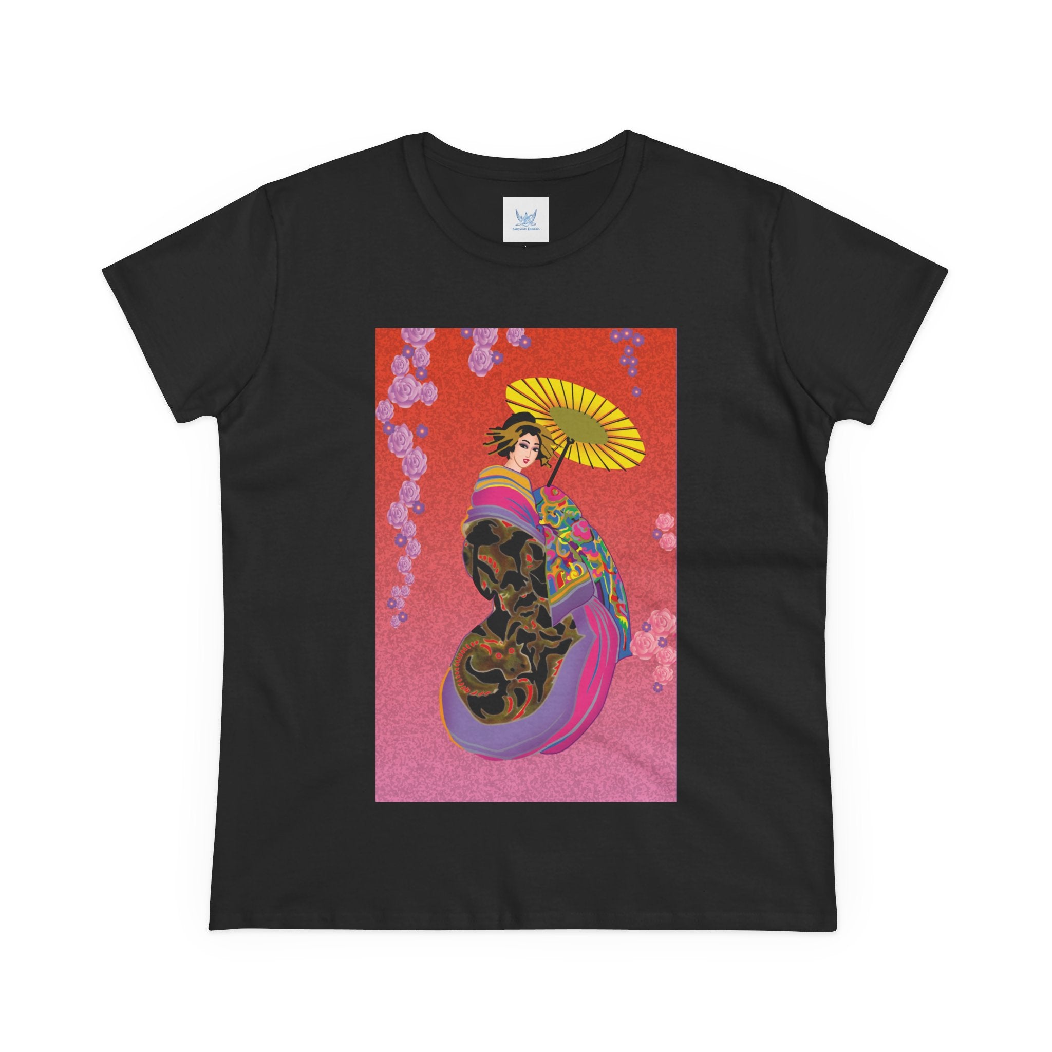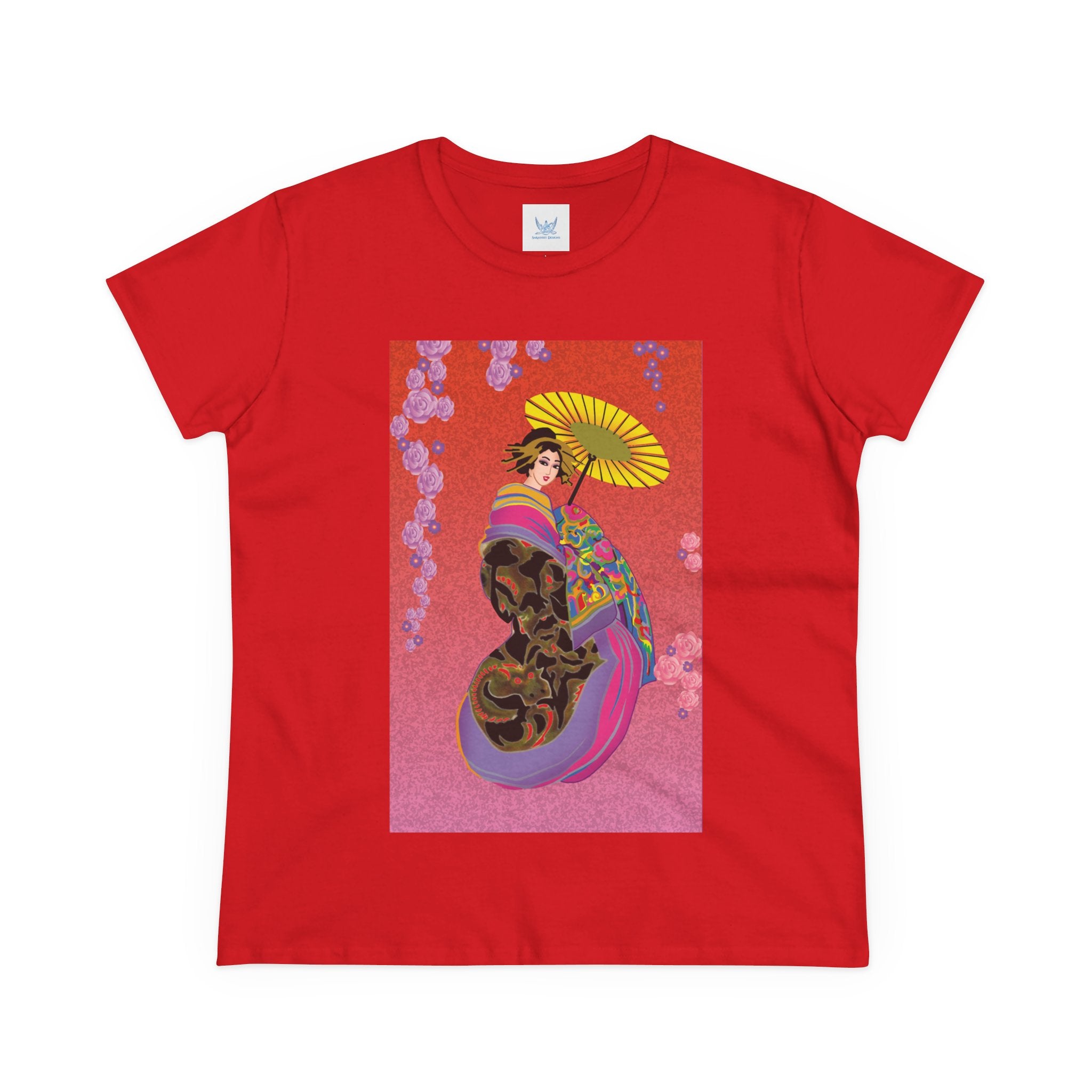 Across its smooth fabric unfolds a captivating Japanese geisha set against a bold, vibrant red backdrop. Dressed in an elegant black kimono detailed with gold and rose patterns, she holds a vivid yellow parasol that pops with color. Layers of fabric in rose, purple, yellow, and blue cascade gracefully, framed by delicate vines of pink roses. Her poised stance conveys movement, beauty, and timeless charm that elevates this tee beyond everyday fashion.