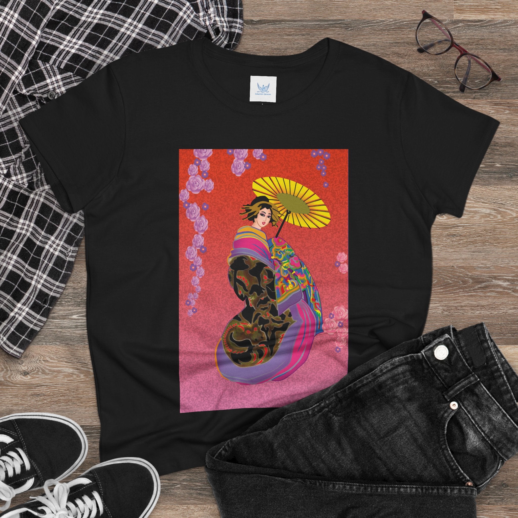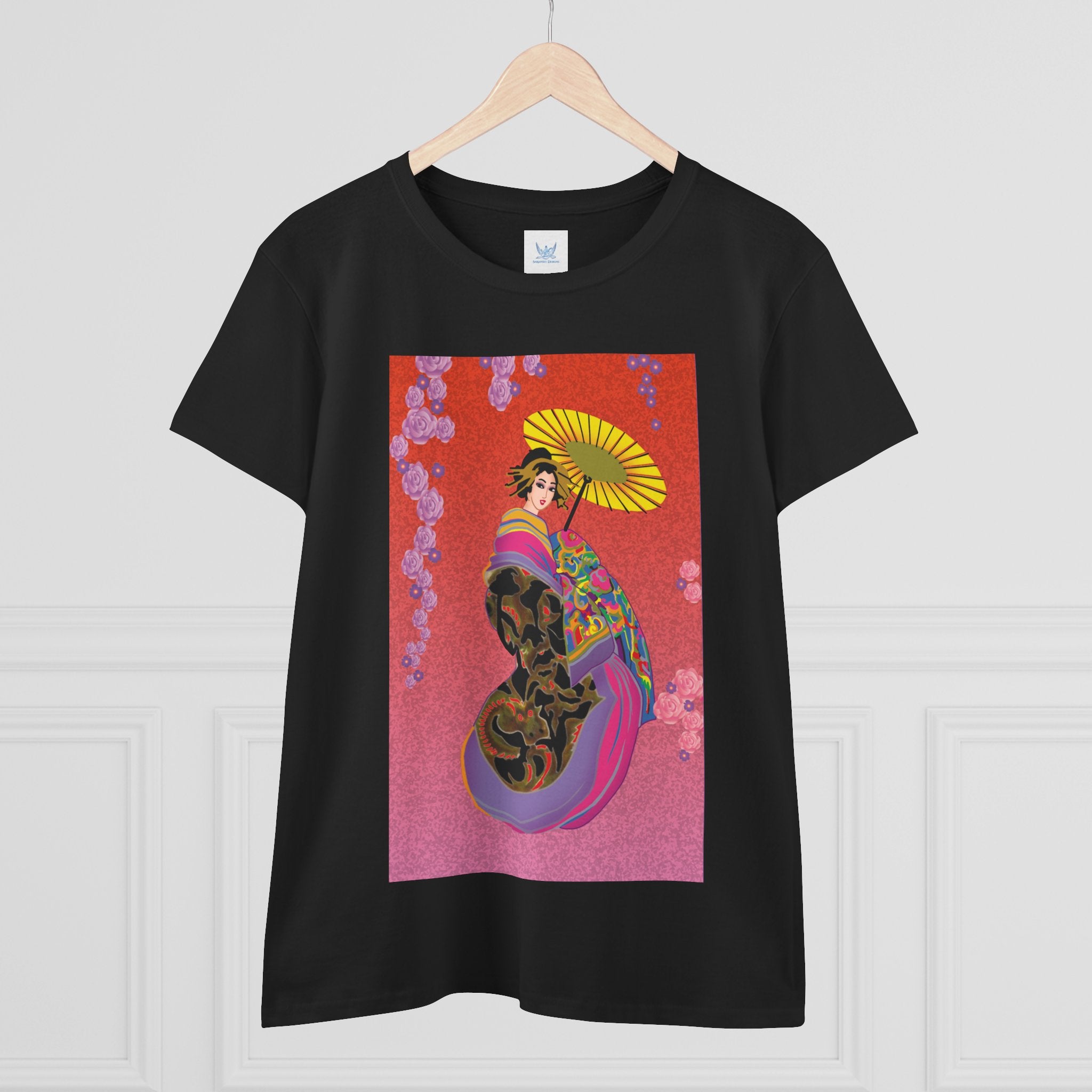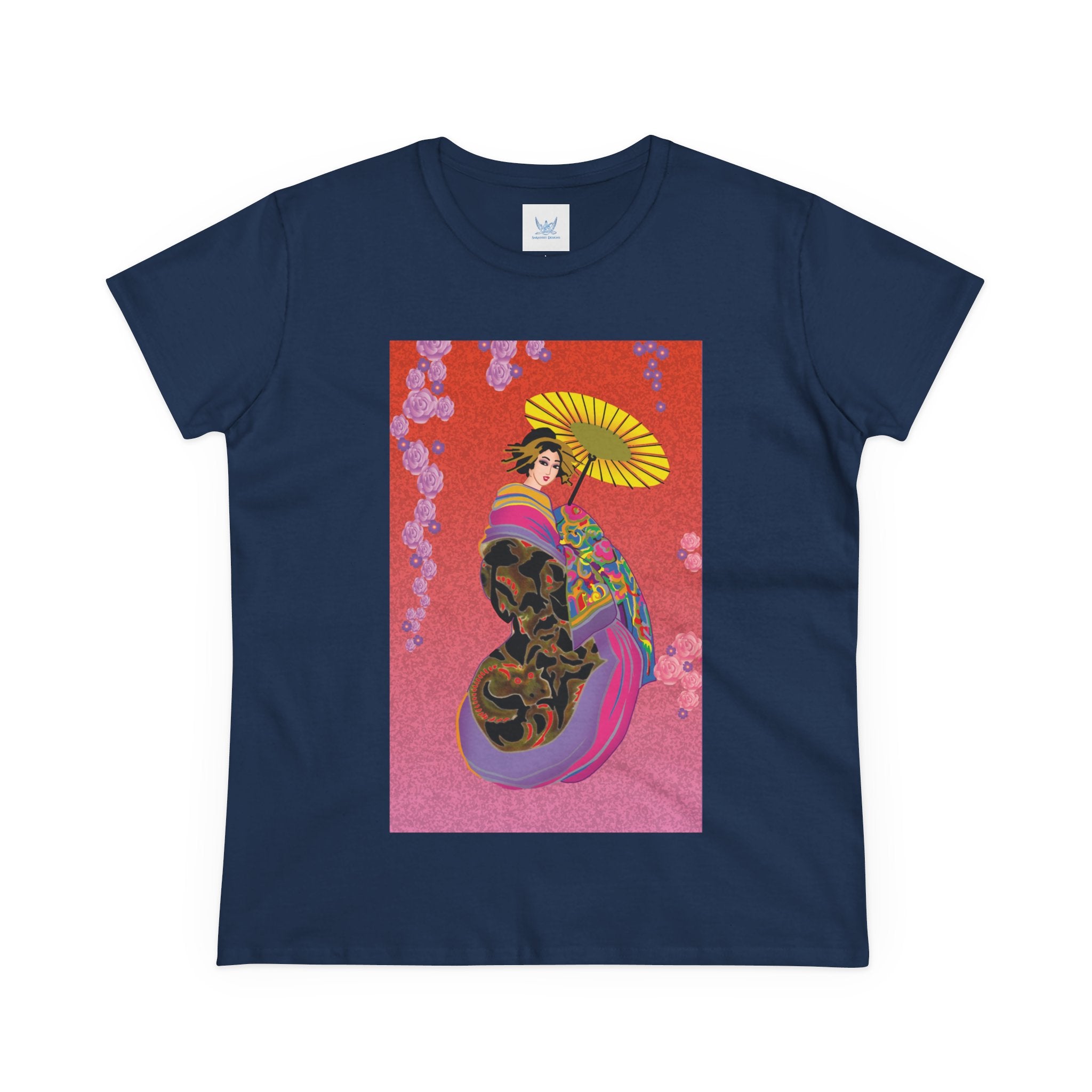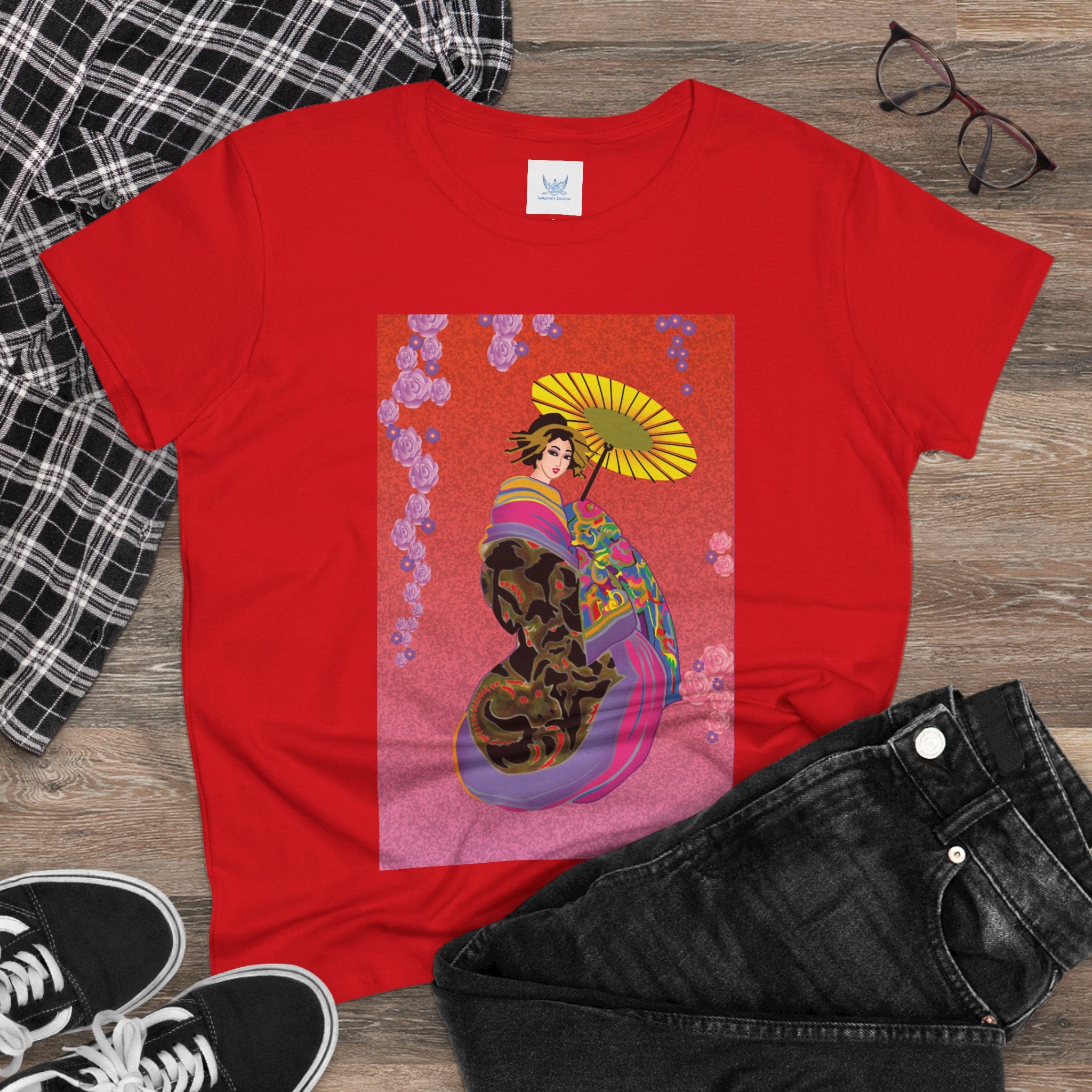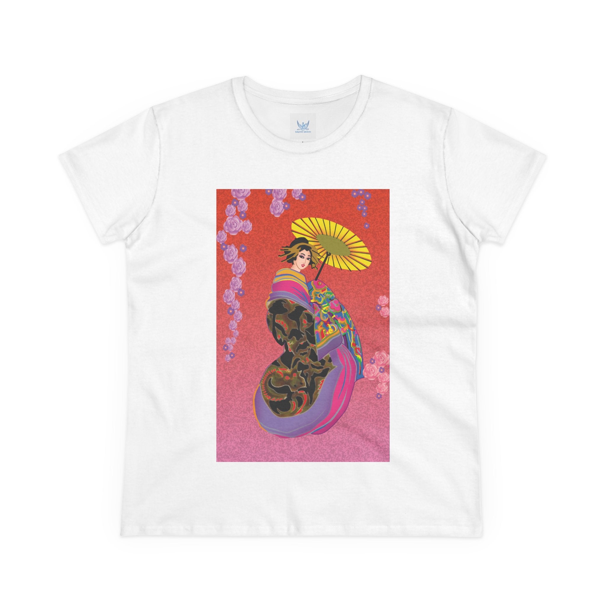 Across its smooth fabric unfolds a captivating Japanese geisha set against a bold, vibrant red backdrop. Dressed in an elegant black kimono detailed with gold and rose patterns, she holds a vivid yellow parasol that pops with color. Layers of fabric in rose, purple, yellow, and blue cascade gracefully, framed by delicate vines of pink roses. Her poised stance conveys movement, beauty, and timeless charm that elevates this tee beyond everyday fashion.