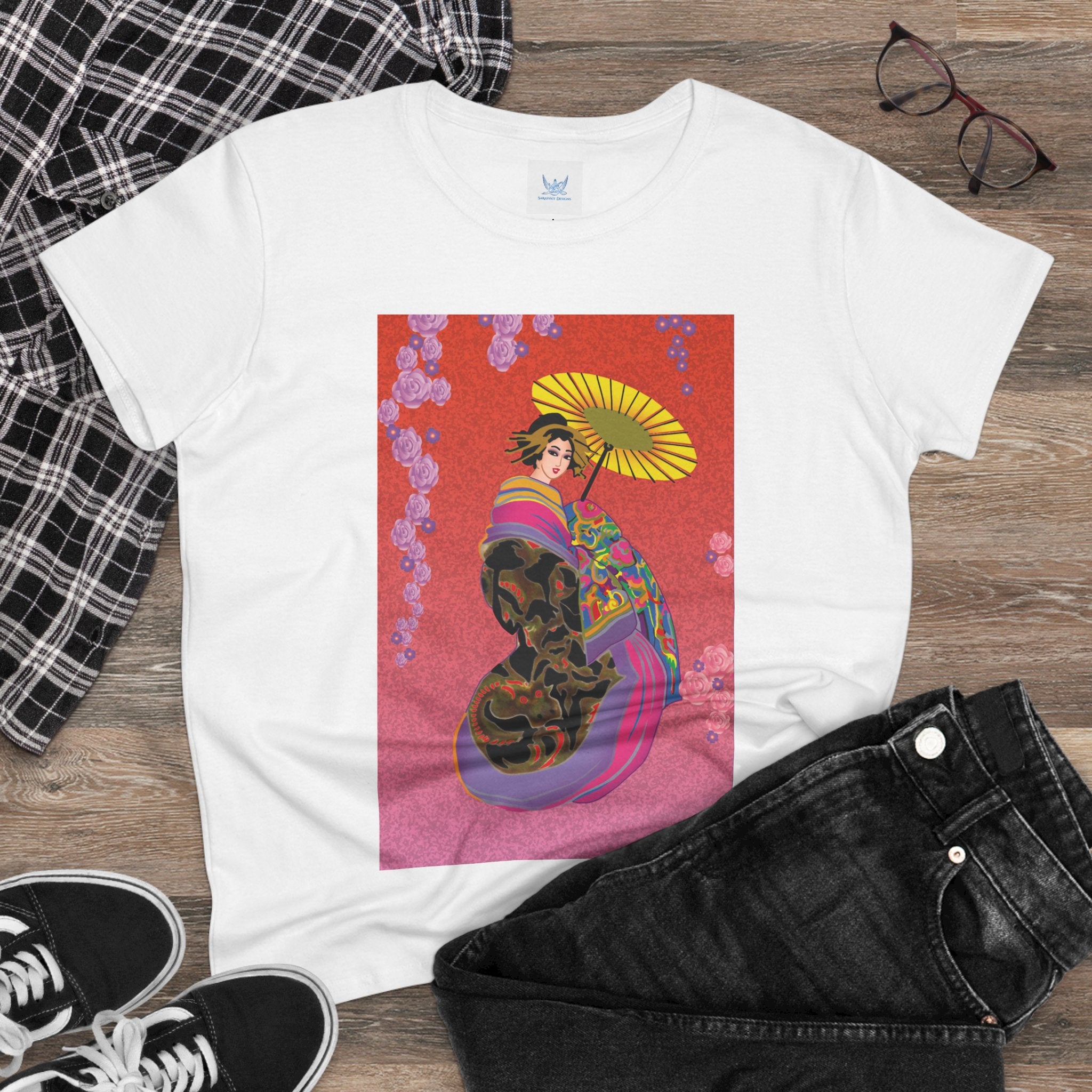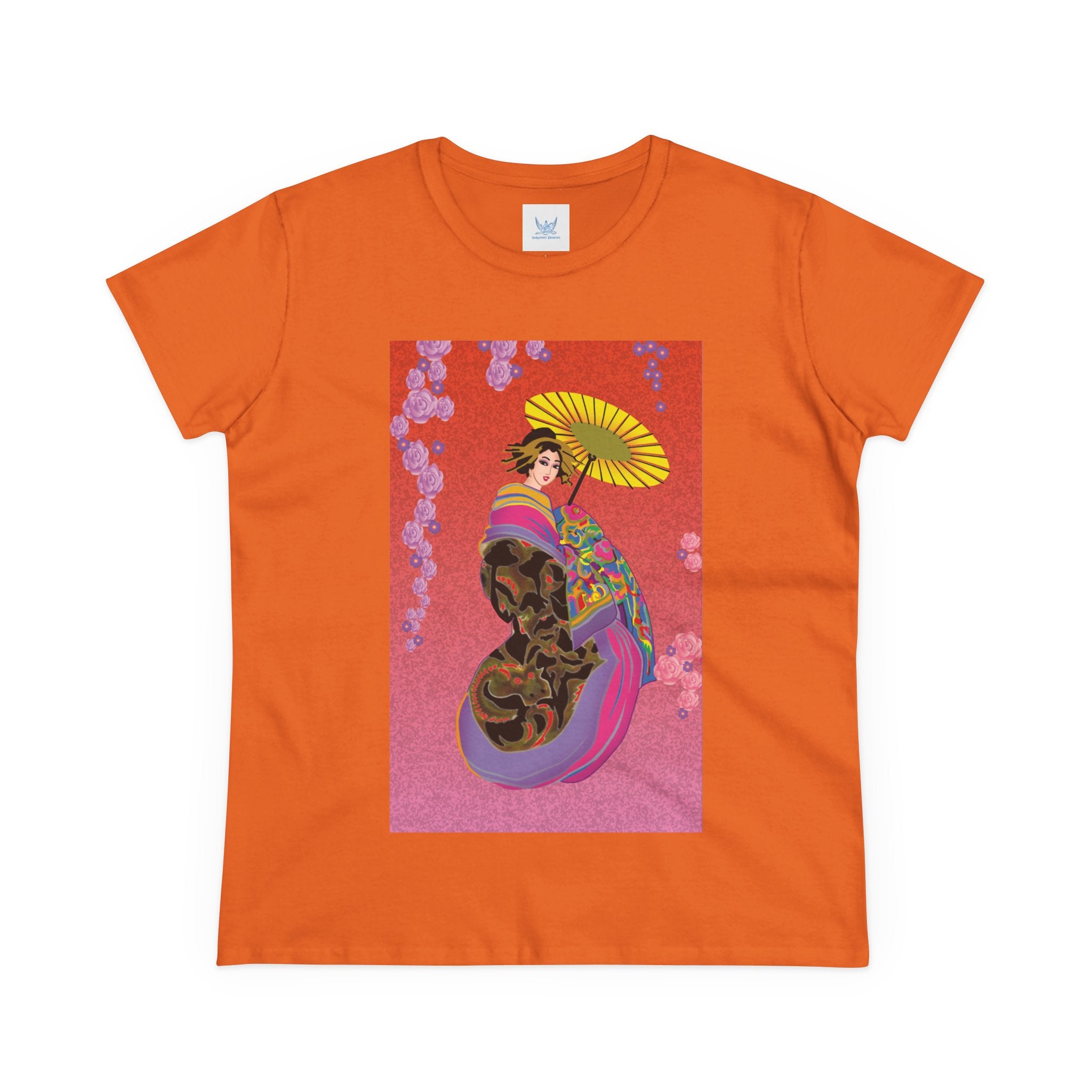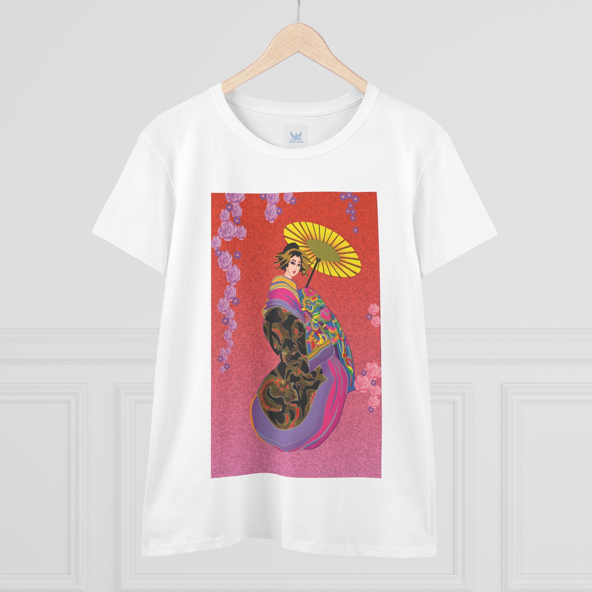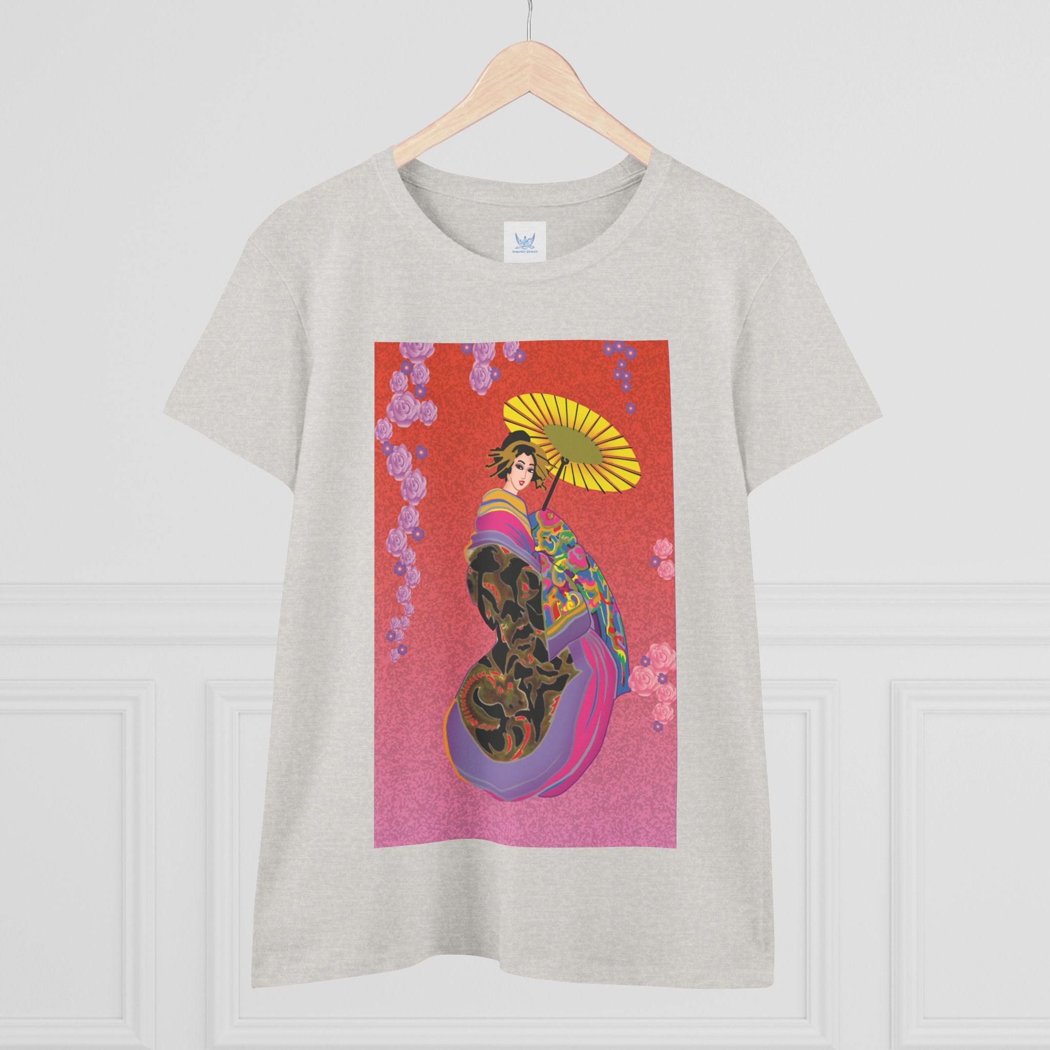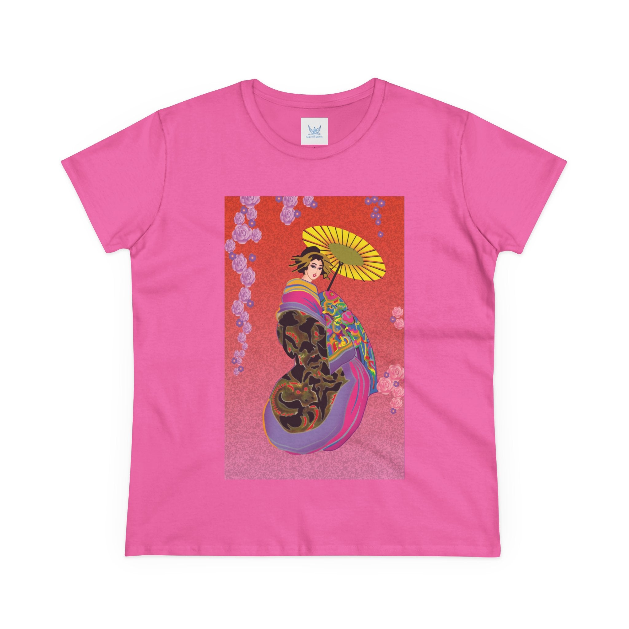 Across its smooth fabric unfolds a captivating Japanese geisha set against a bold, vibrant red backdrop. Dressed in an elegant black kimono detailed with gold and rose patterns, she holds a vivid yellow parasol that pops with color. Layers of fabric in rose, purple, yellow, and blue cascade gracefully, framed by delicate vines of pink roses. Her poised stance conveys movement, beauty, and timeless charm that elevates this tee beyond everyday fashion.
