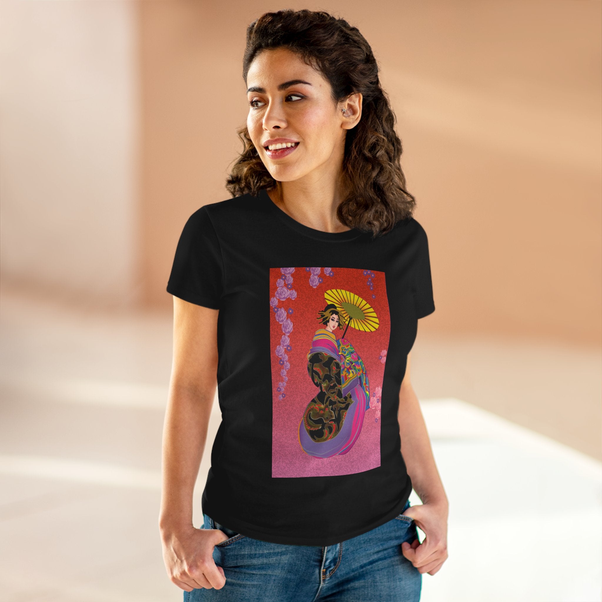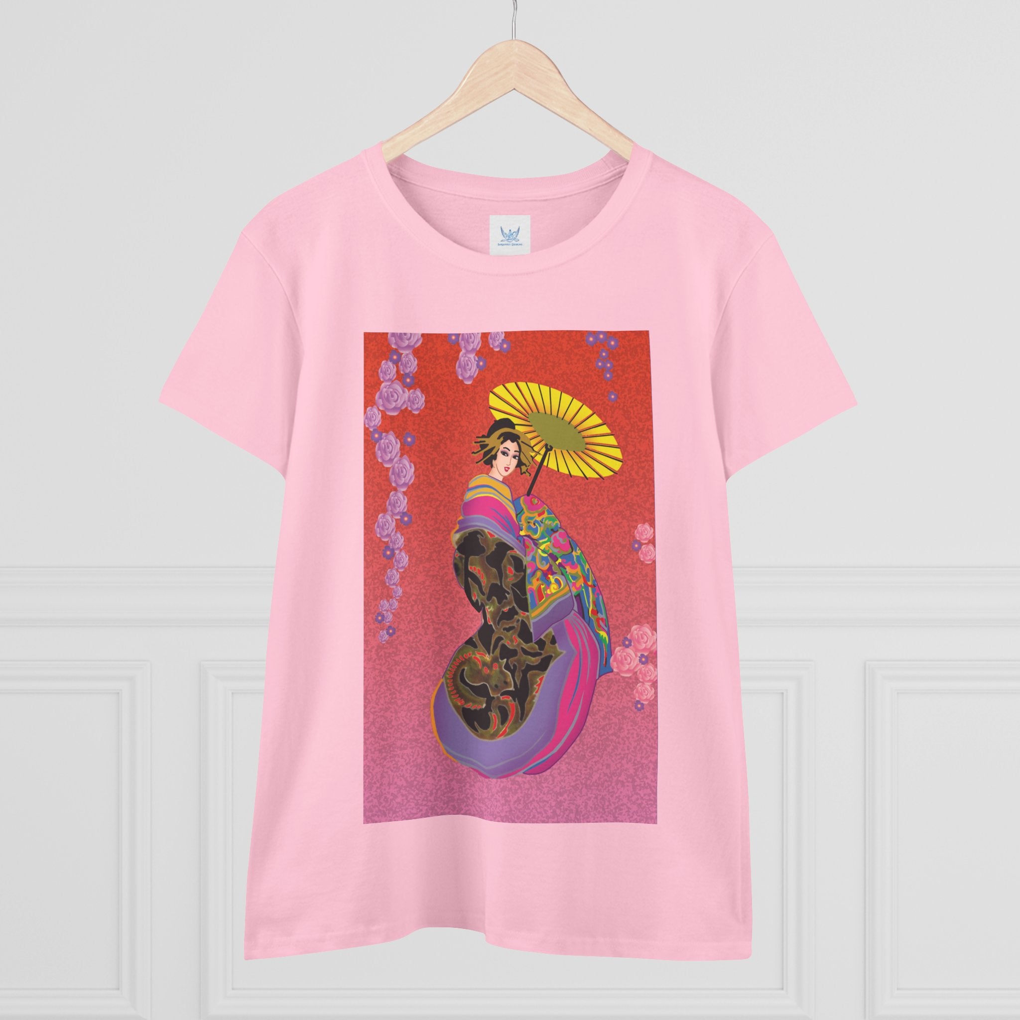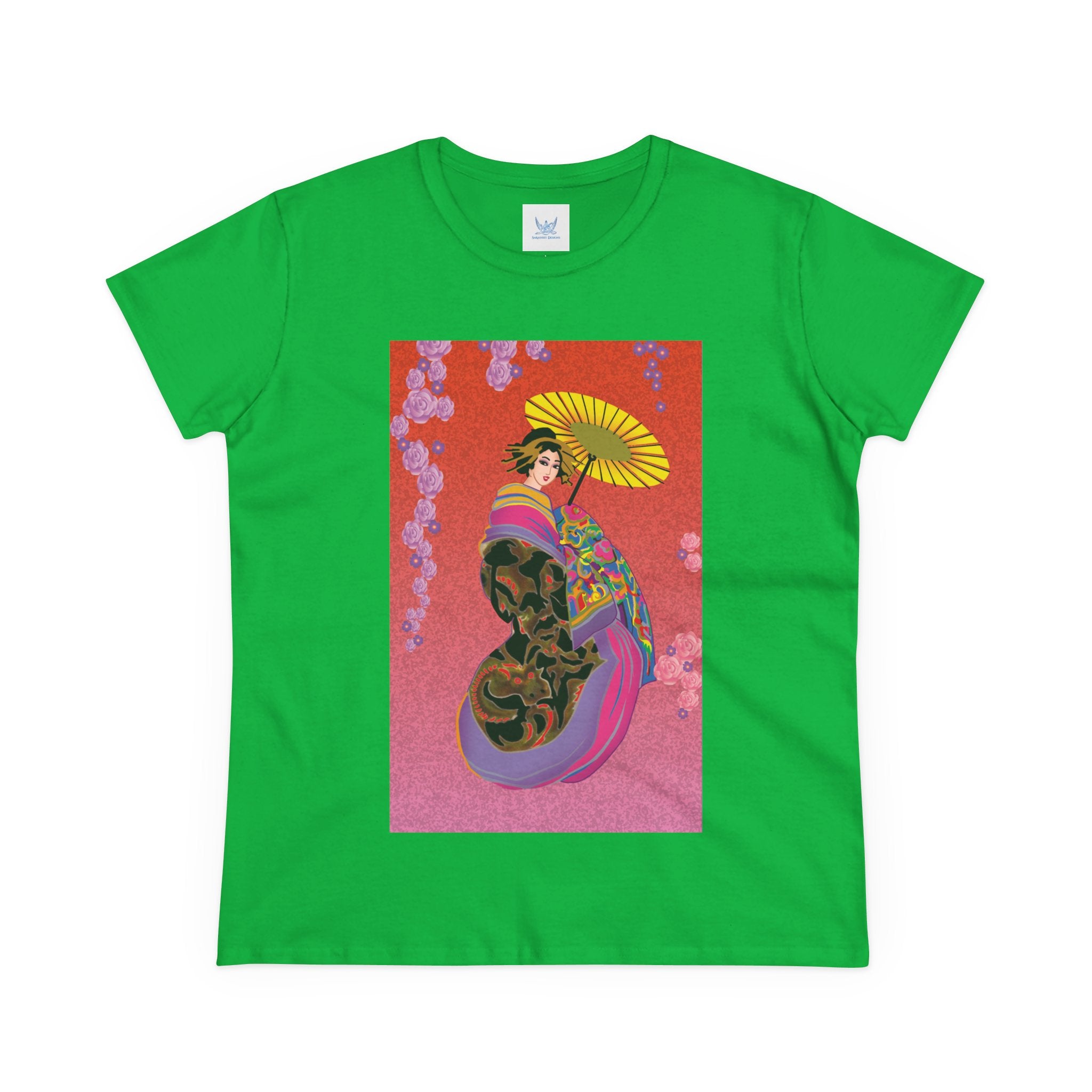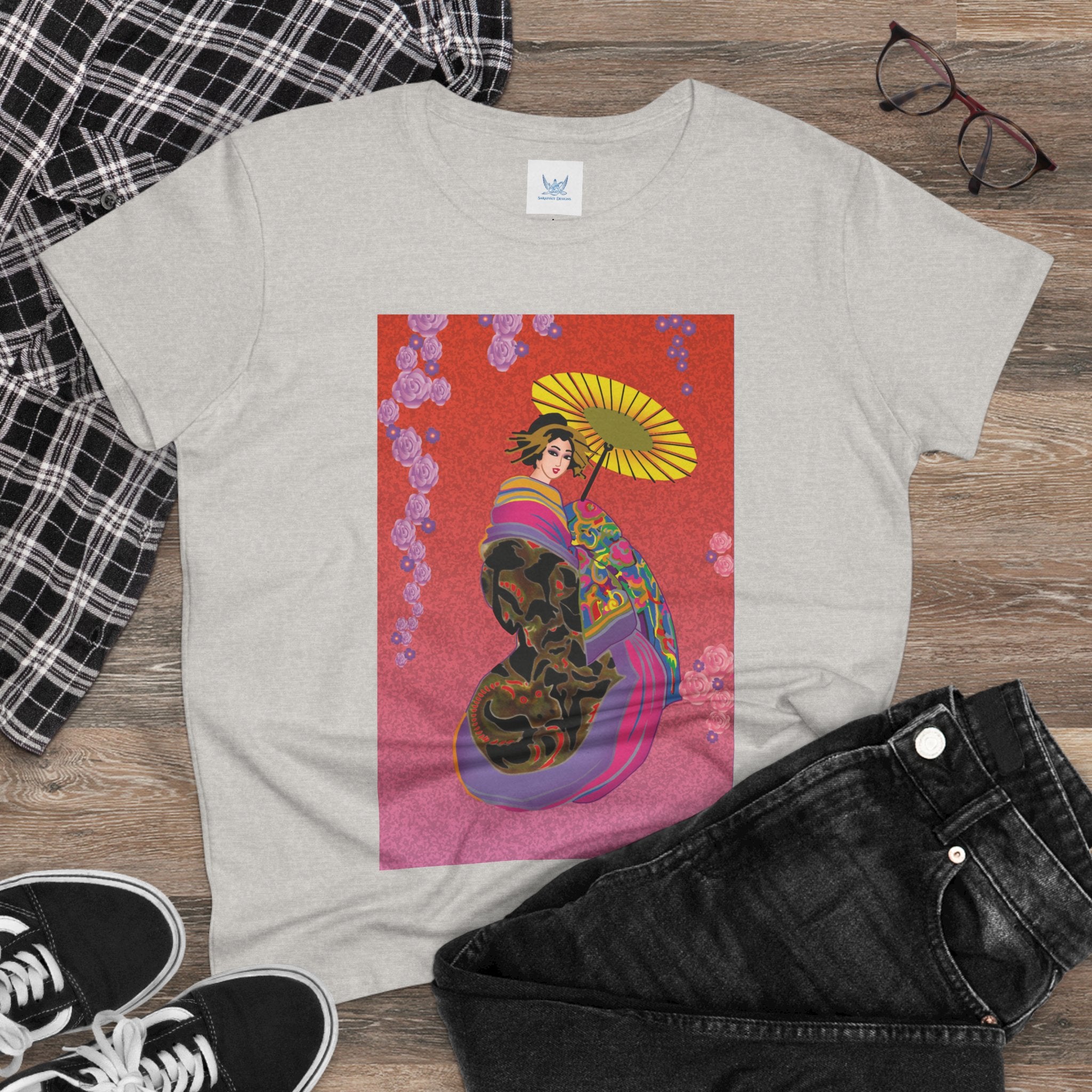 Across its smooth fabric unfolds a captivating Japanese geisha set against a bold, vibrant red backdrop. Dressed in an elegant black kimono detailed with gold and rose patterns, she holds a vivid yellow parasol that pops with color. Layers of fabric in rose, purple, yellow, and blue cascade gracefully, framed by delicate vines of pink roses. Her poised stance conveys movement, beauty, and timeless charm that elevates this tee beyond everyday fashion.
