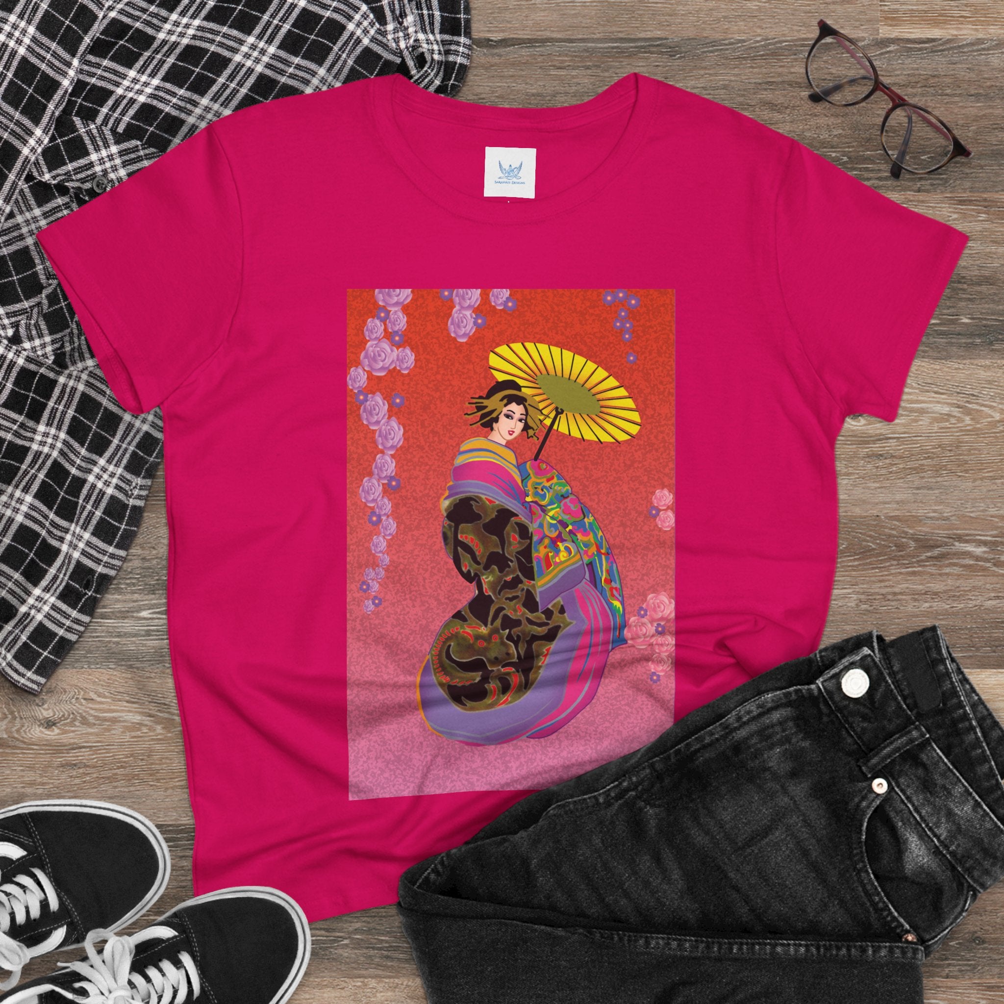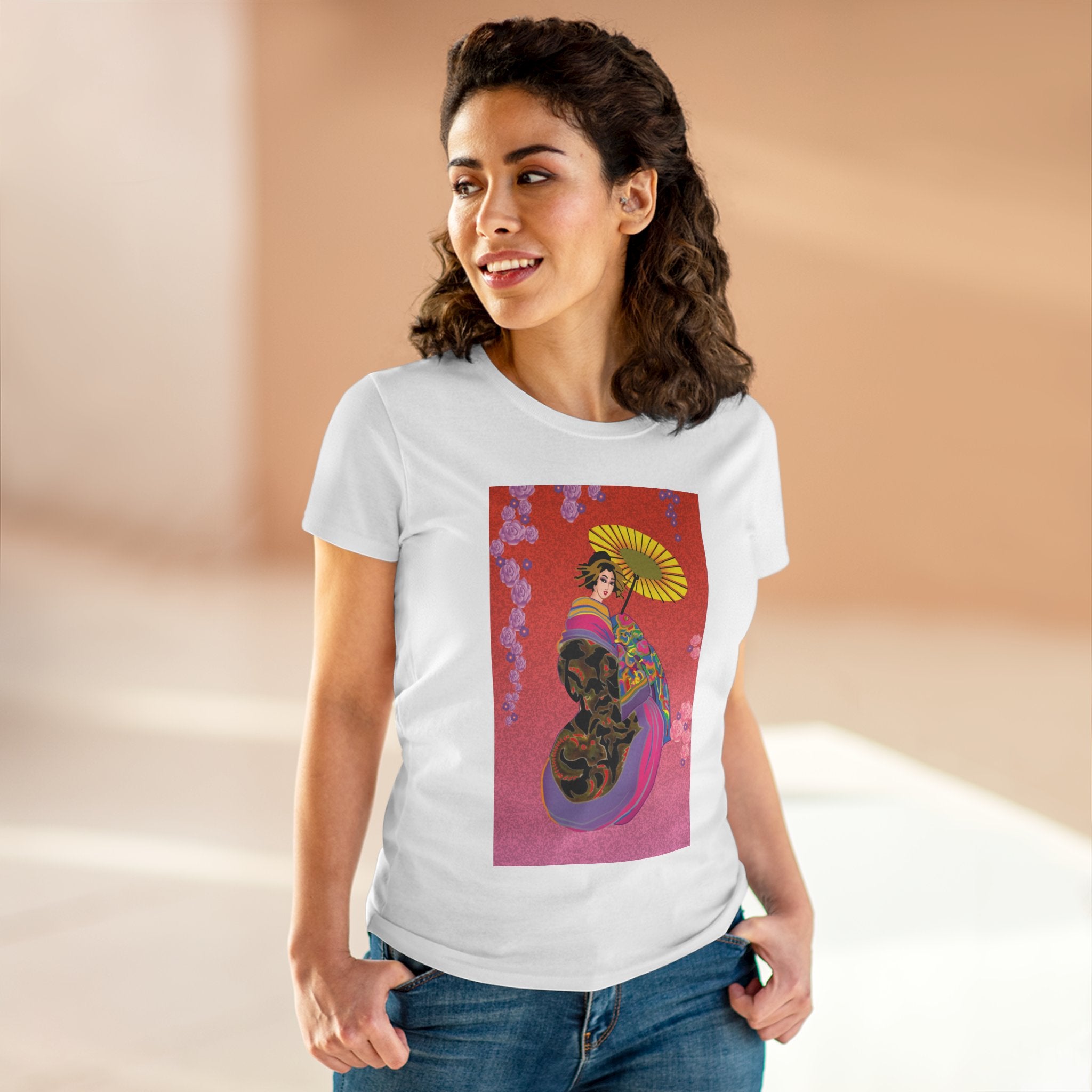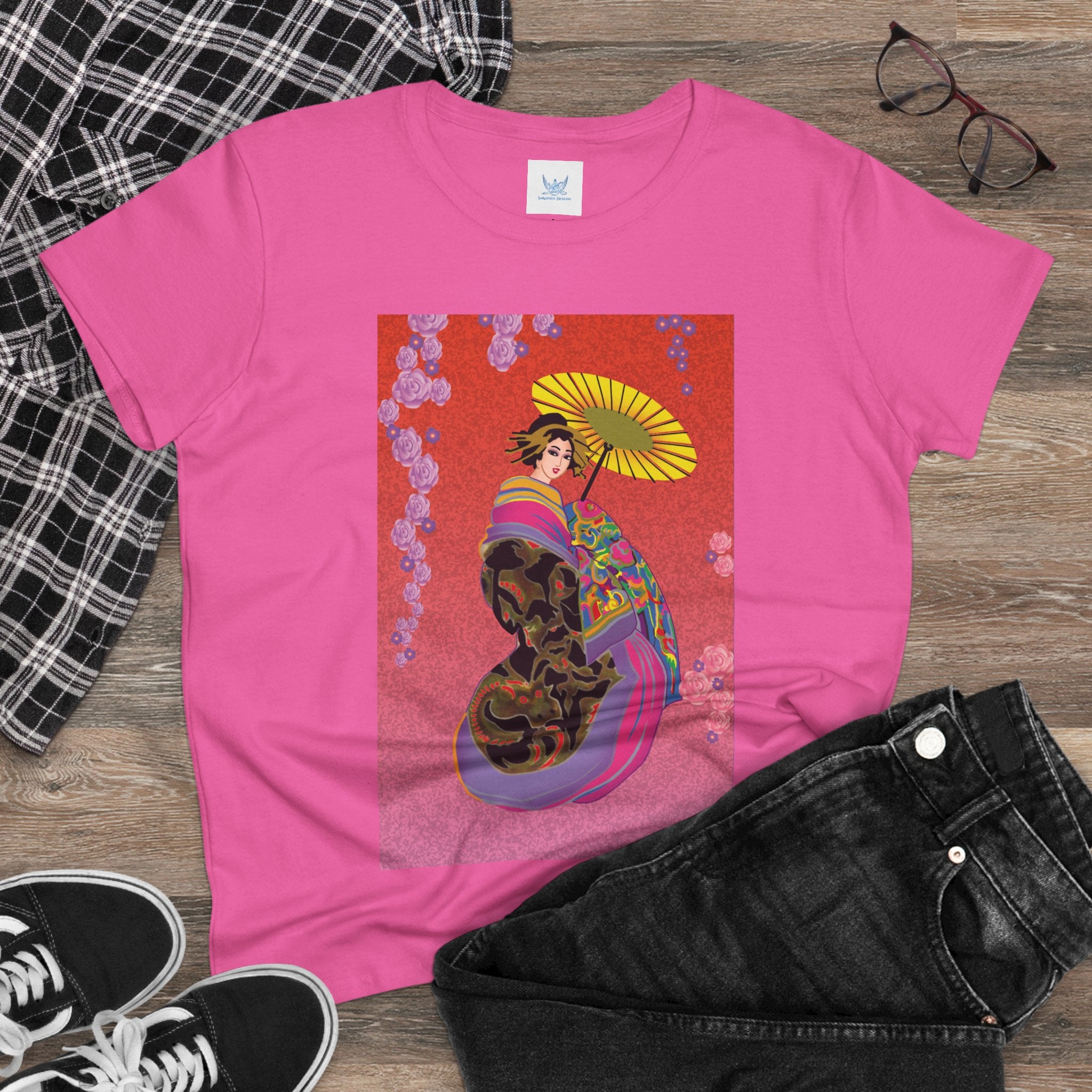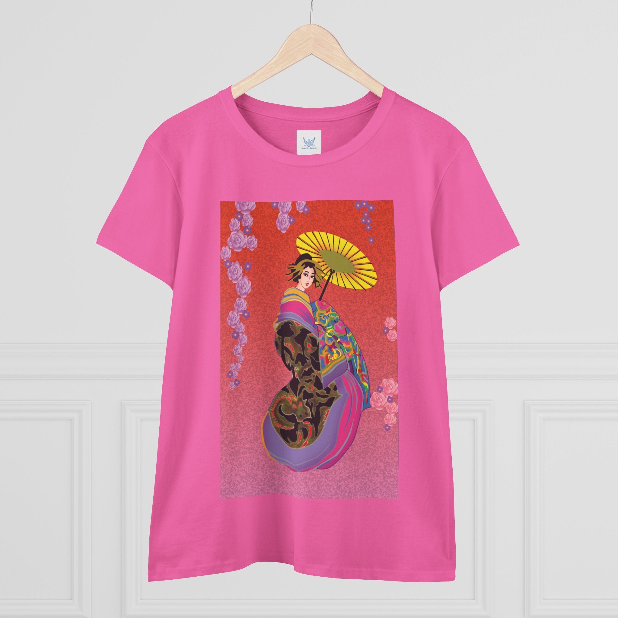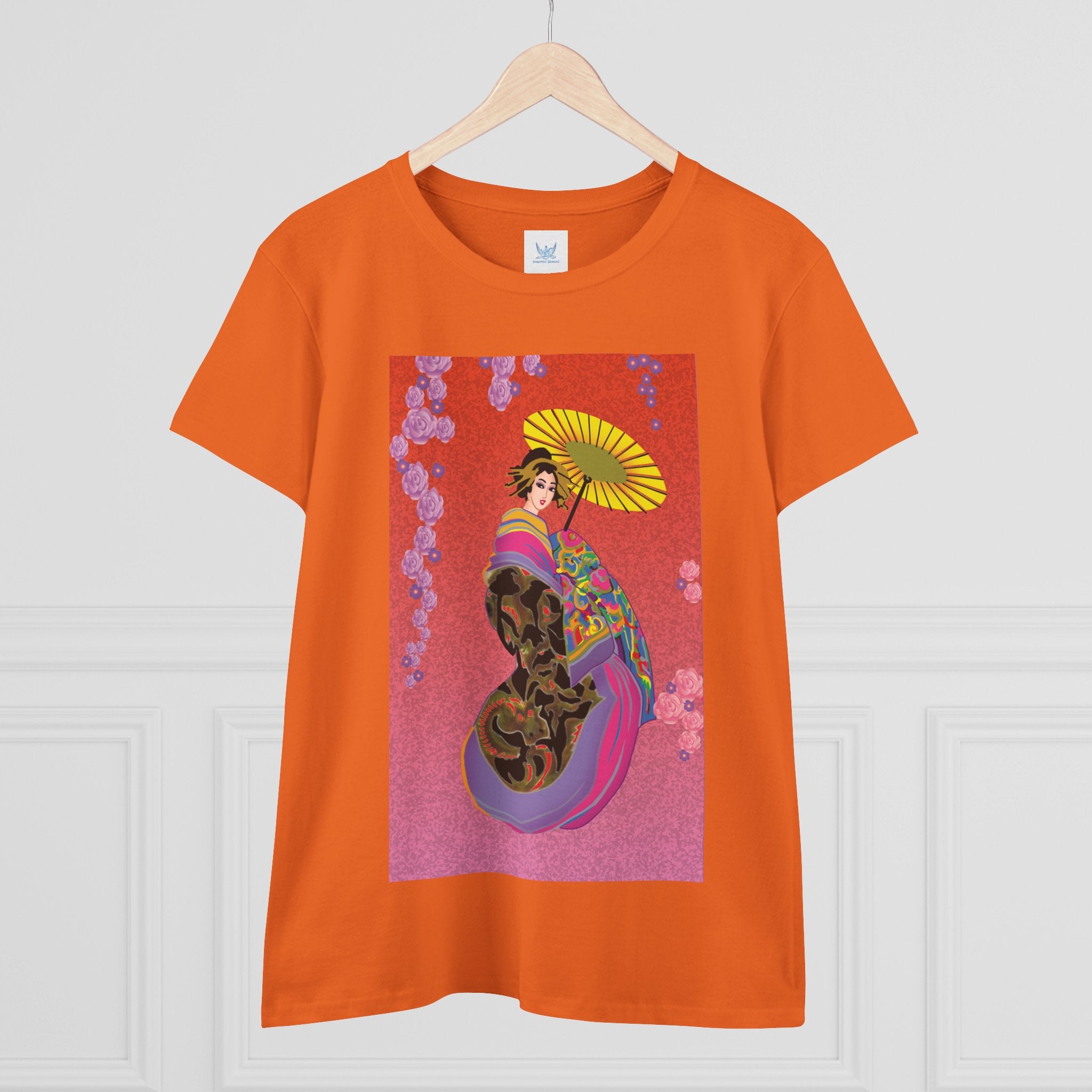 Across its smooth fabric unfolds a captivating Japanese geisha set against a bold, vibrant red backdrop. Dressed in an elegant black kimono detailed with gold and rose patterns, she holds a vivid yellow parasol that pops with color. Layers of fabric in rose, purple, yellow, and blue cascade gracefully, framed by delicate vines of pink roses. Her poised stance conveys movement, beauty, and timeless charm that elevates this tee beyond everyday fashion.
