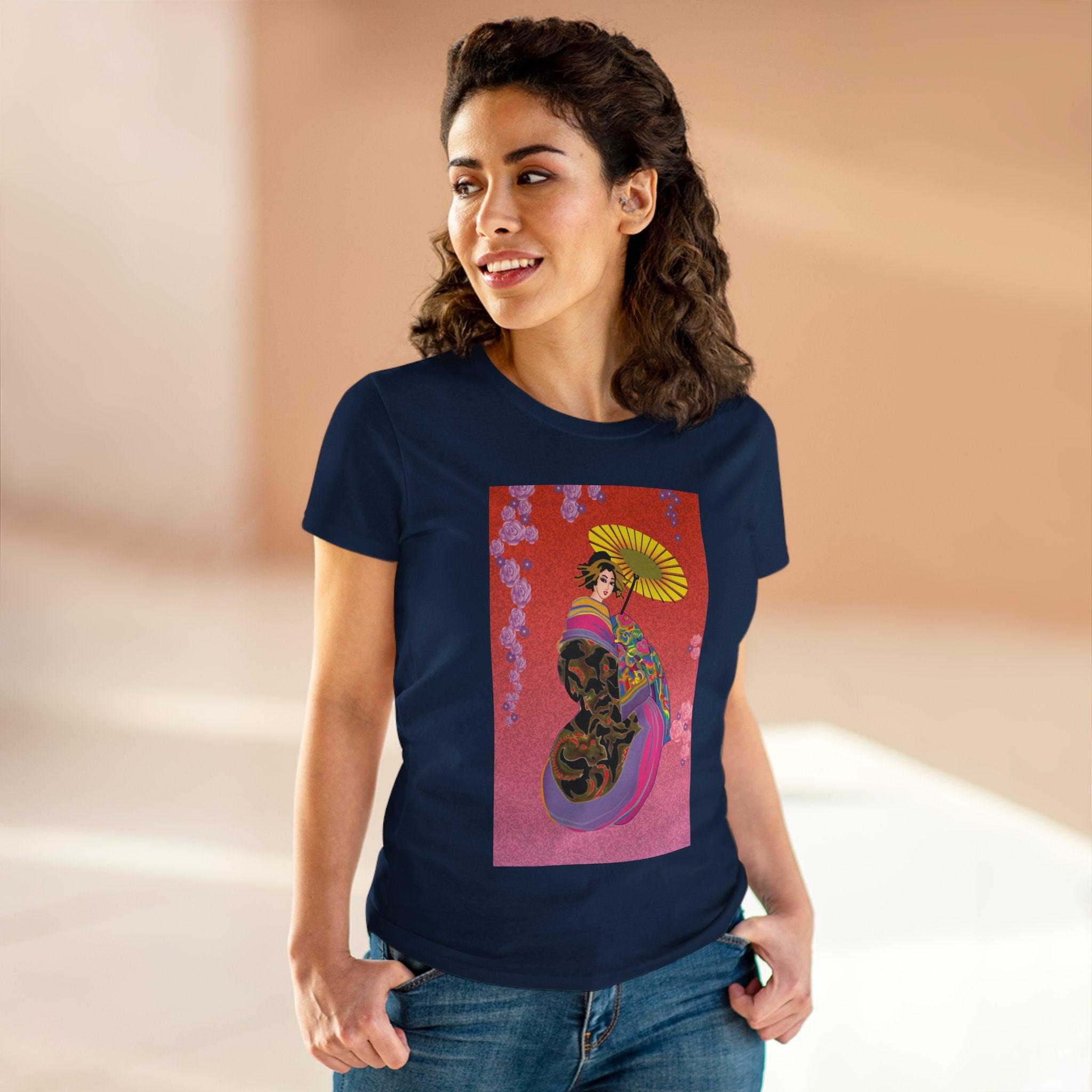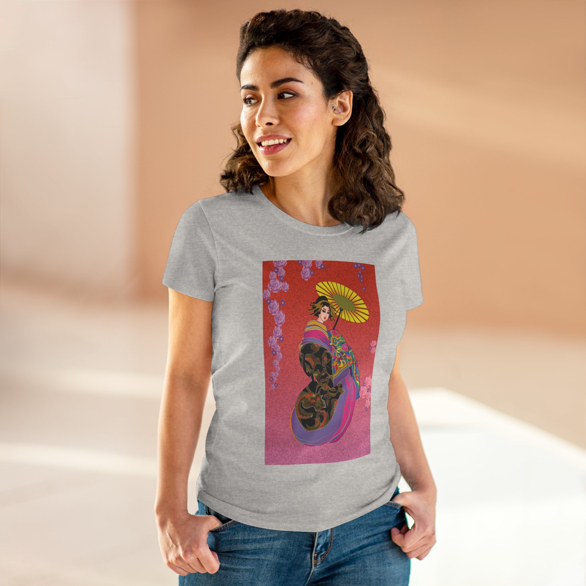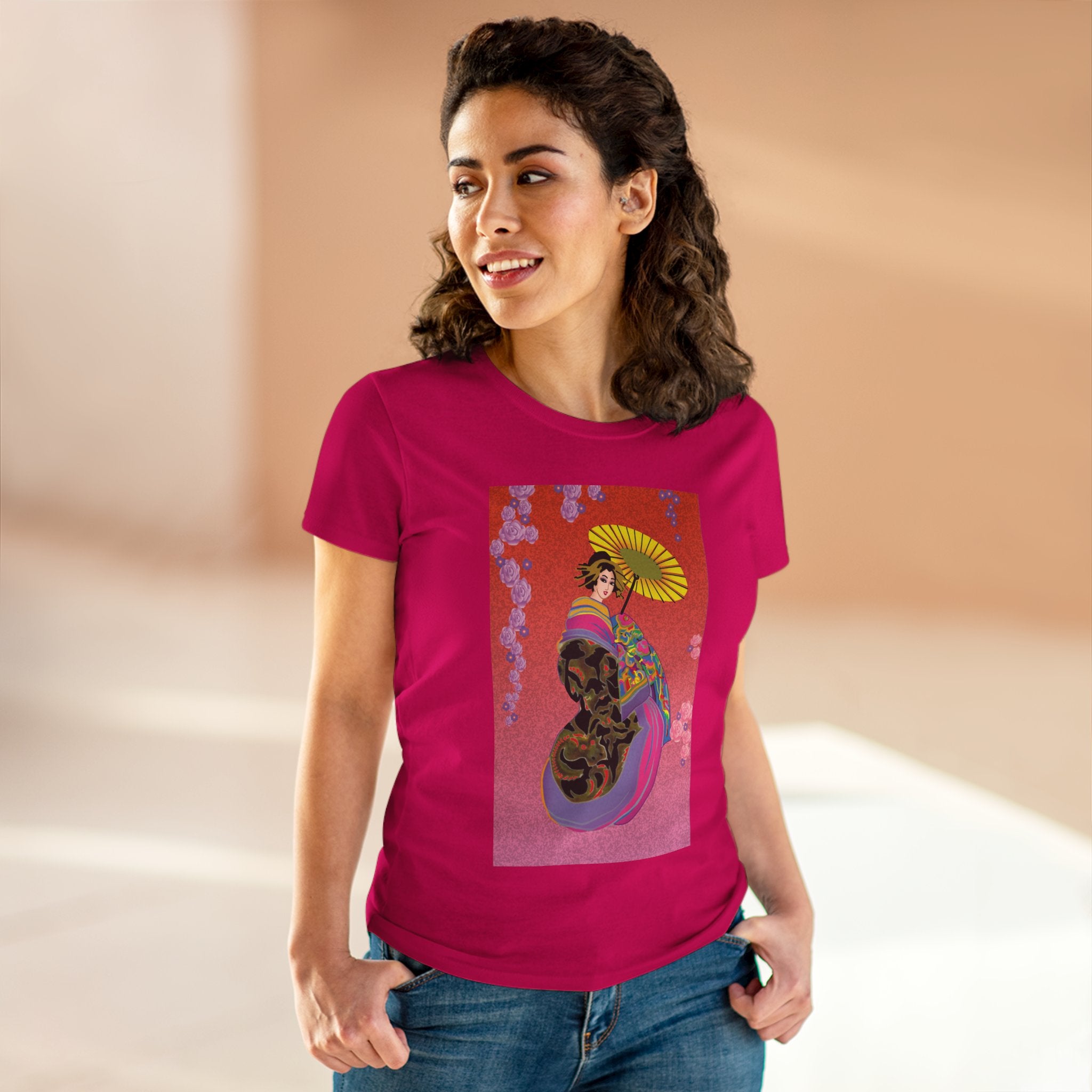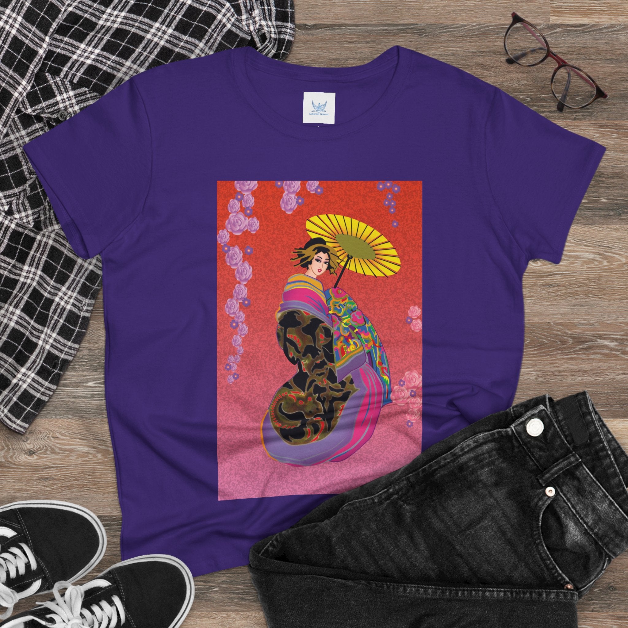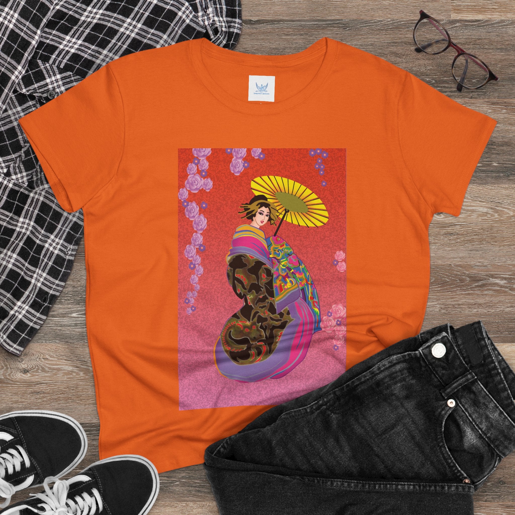 Across its smooth fabric unfolds a captivating Japanese geisha set against a bold, vibrant red backdrop. Dressed in an elegant black kimono detailed with gold and rose patterns, she holds a vivid yellow parasol that pops with color. Layers of fabric in rose, purple, yellow, and blue cascade gracefully, framed by delicate vines of pink roses. Her poised stance conveys movement, beauty, and timeless charm that elevates this tee beyond everyday fashion.