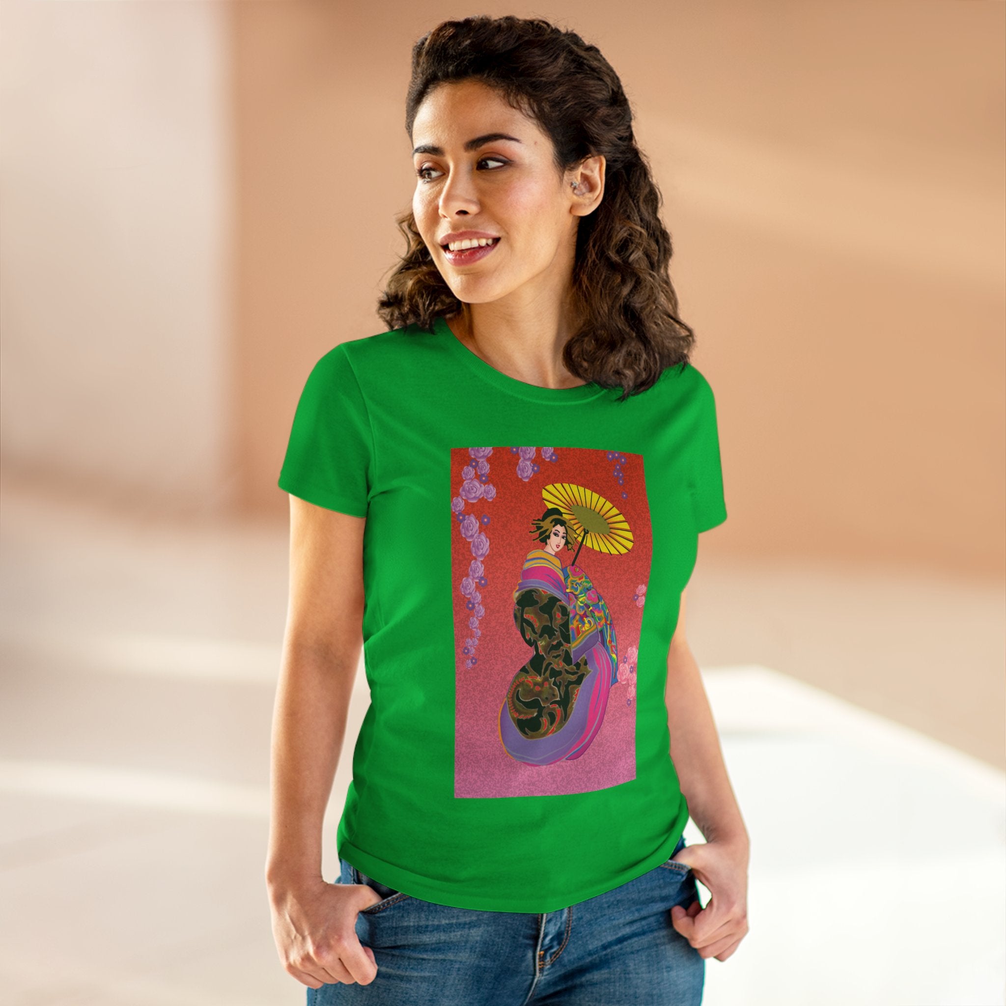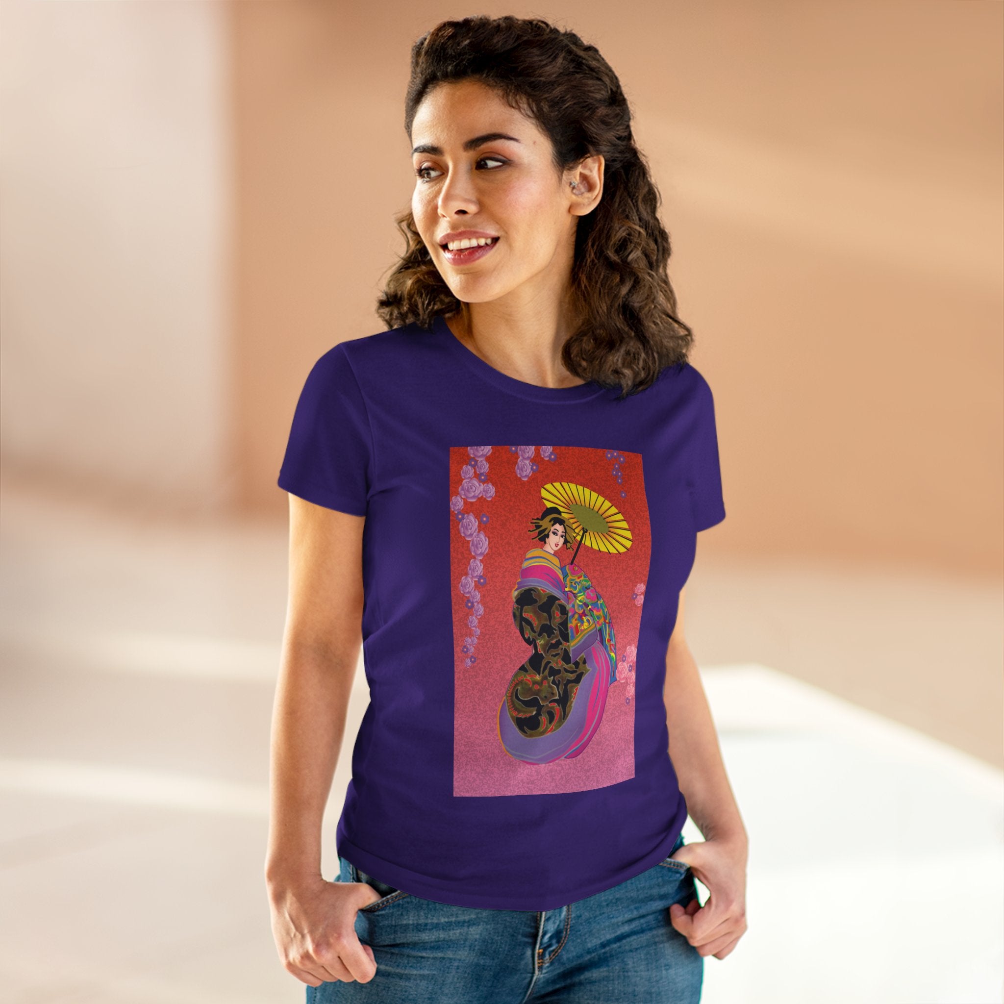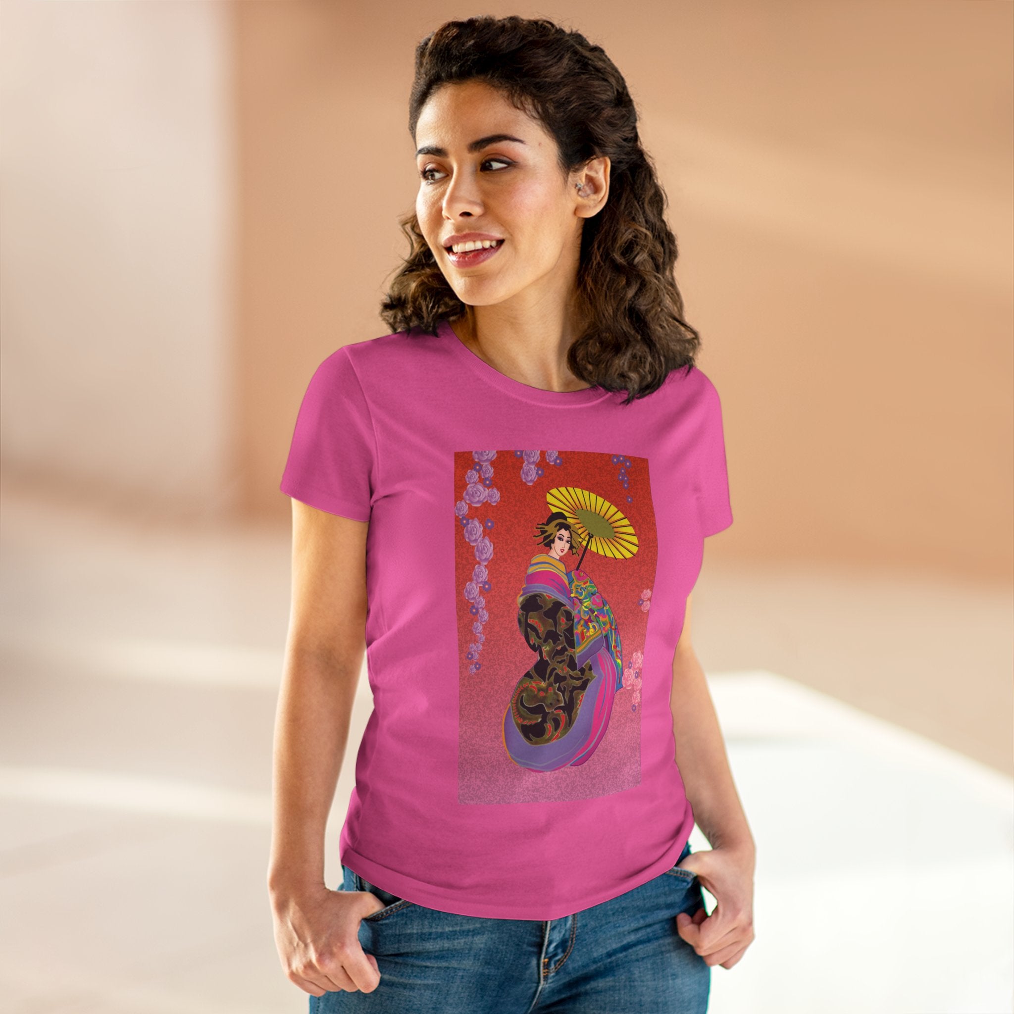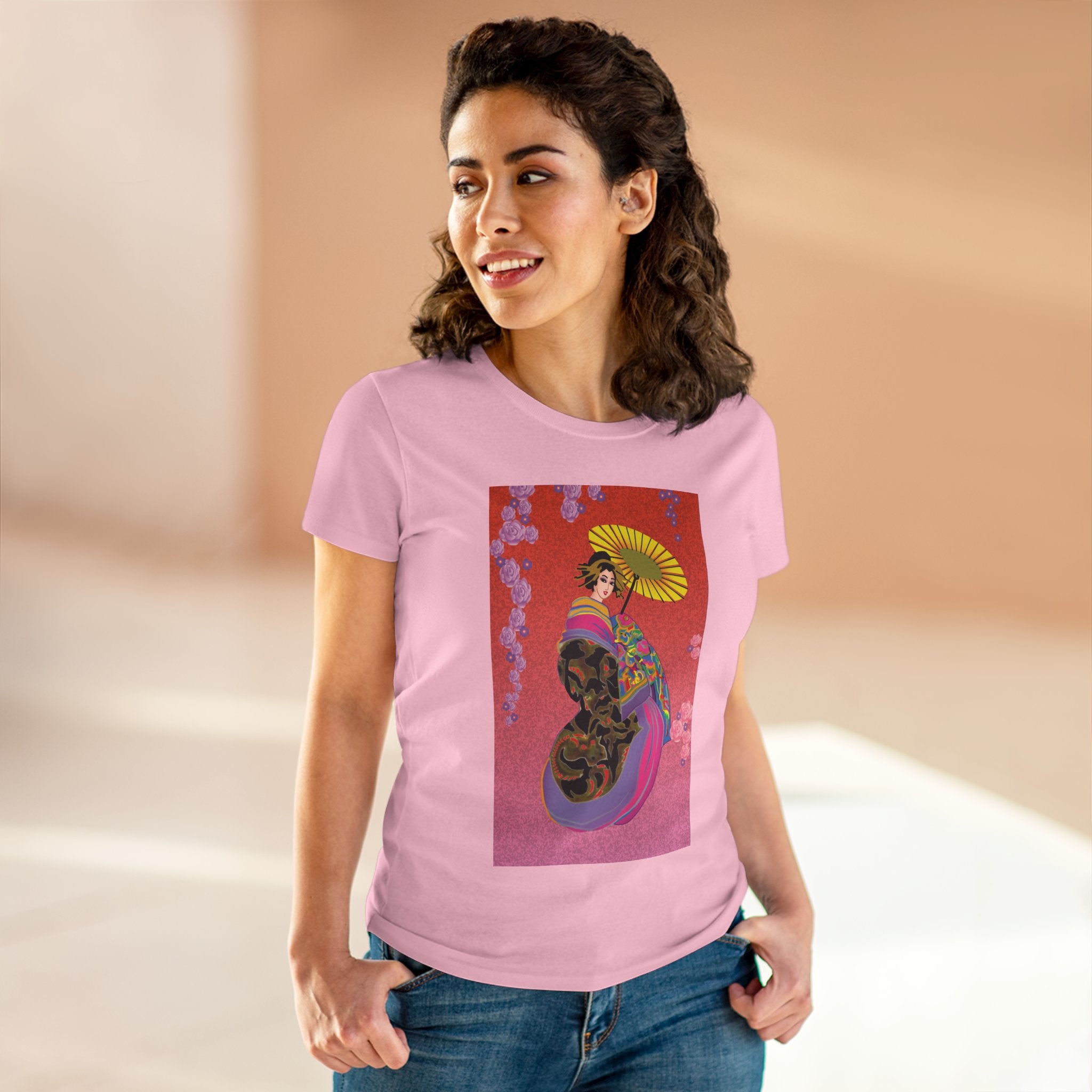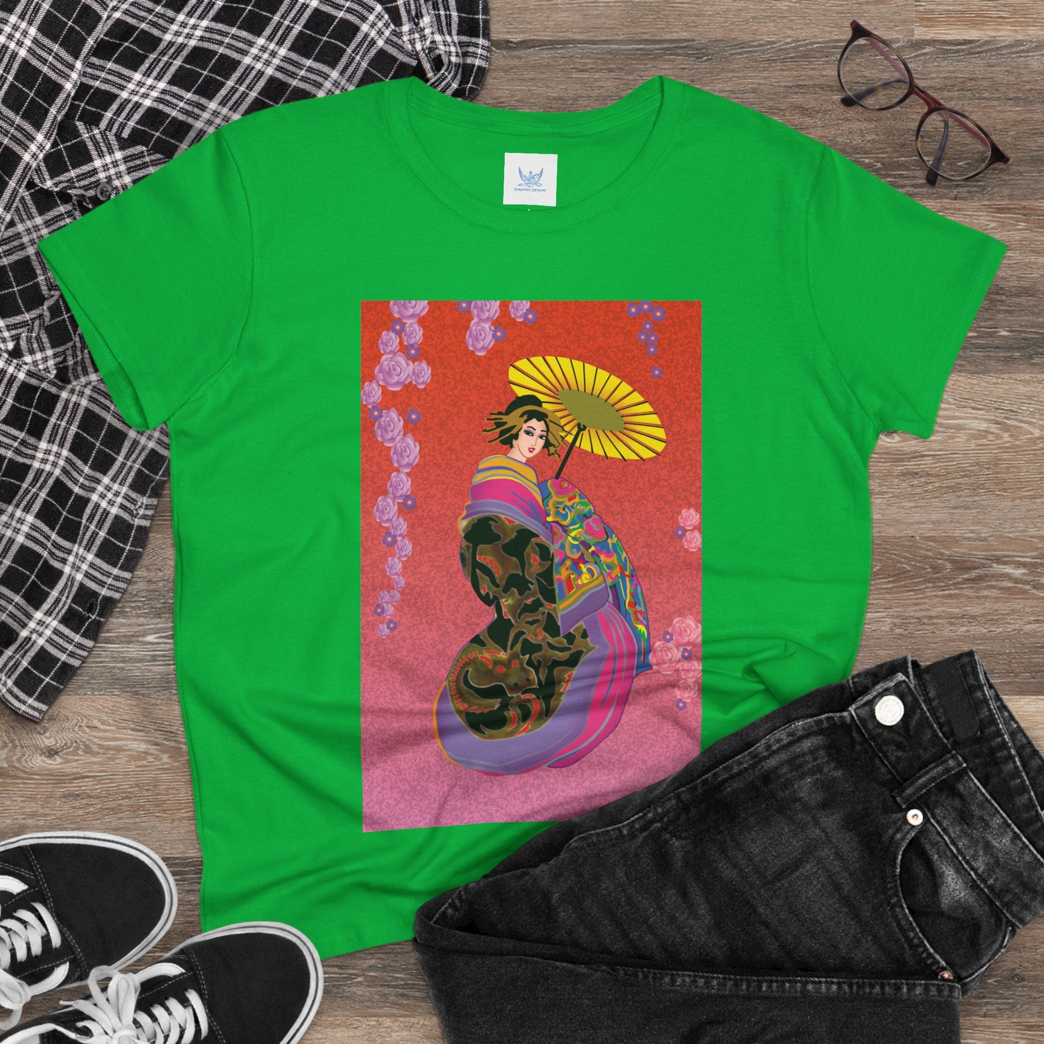 Across its smooth fabric unfolds a captivating Japanese geisha set against a bold, vibrant red backdrop. Dressed in an elegant black kimono detailed with gold and rose patterns, she holds a vivid yellow parasol that pops with color. Layers of fabric in rose, purple, yellow, and blue cascade gracefully, framed by delicate vines of pink roses. Her poised stance conveys movement, beauty, and timeless charm that elevates this tee beyond everyday fashion.