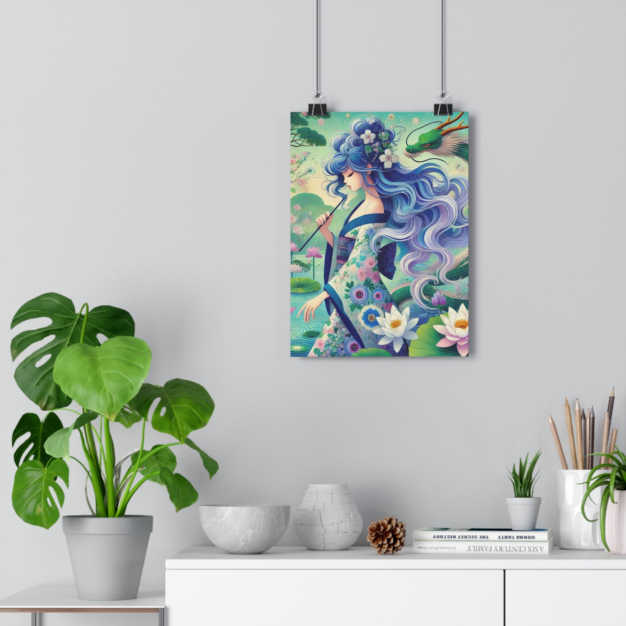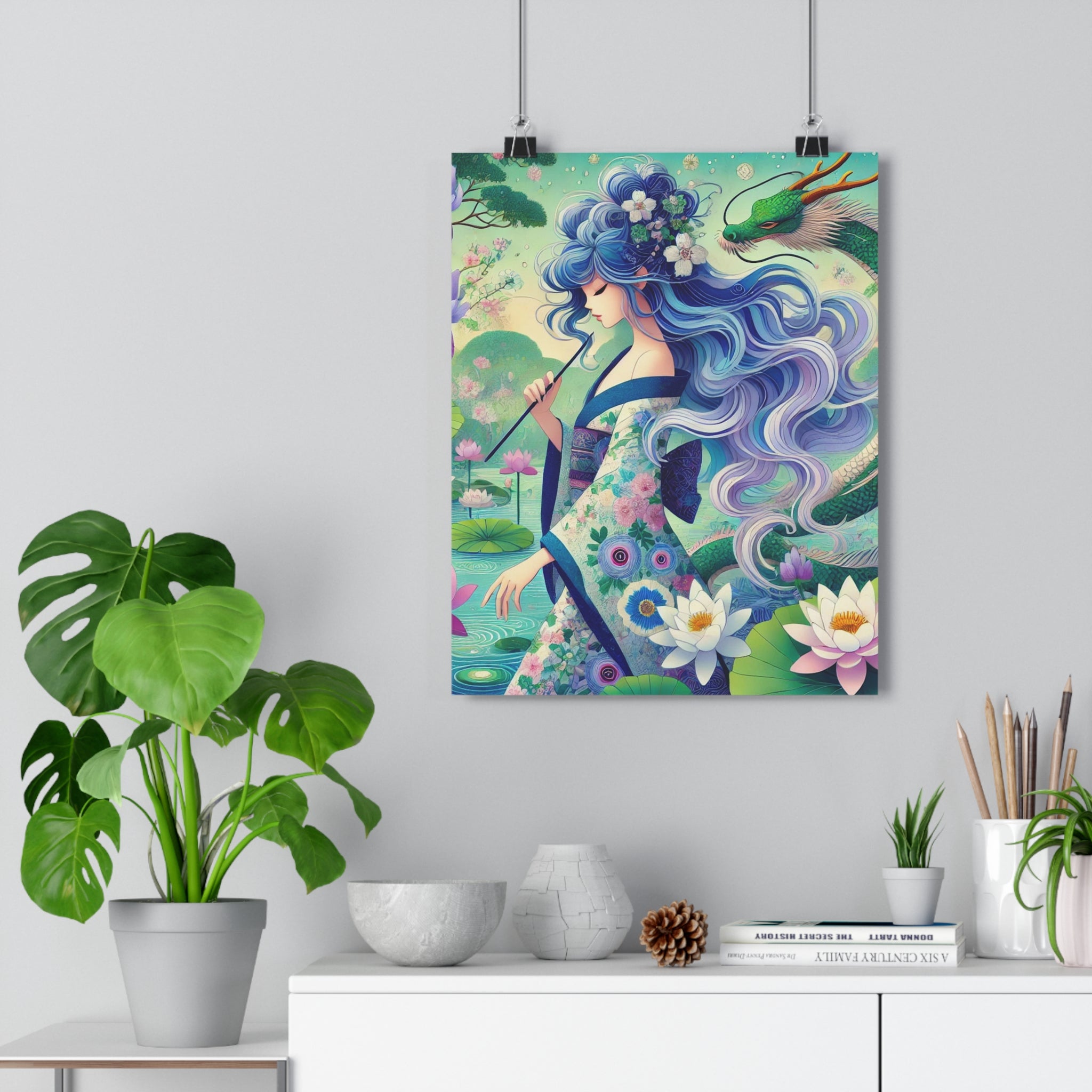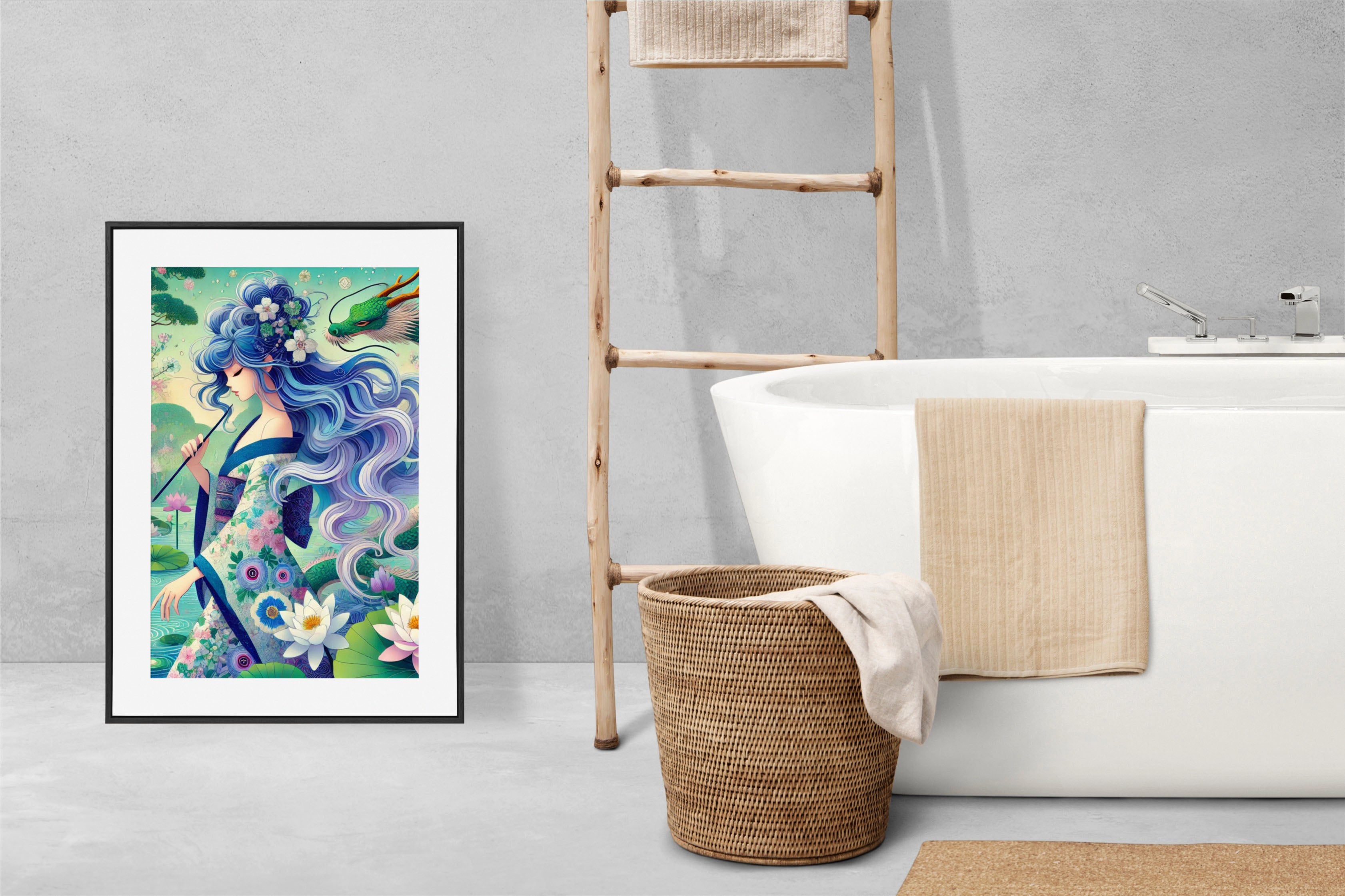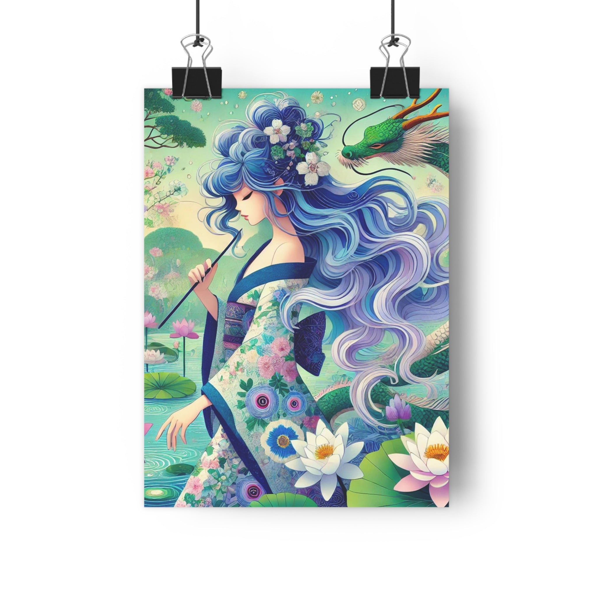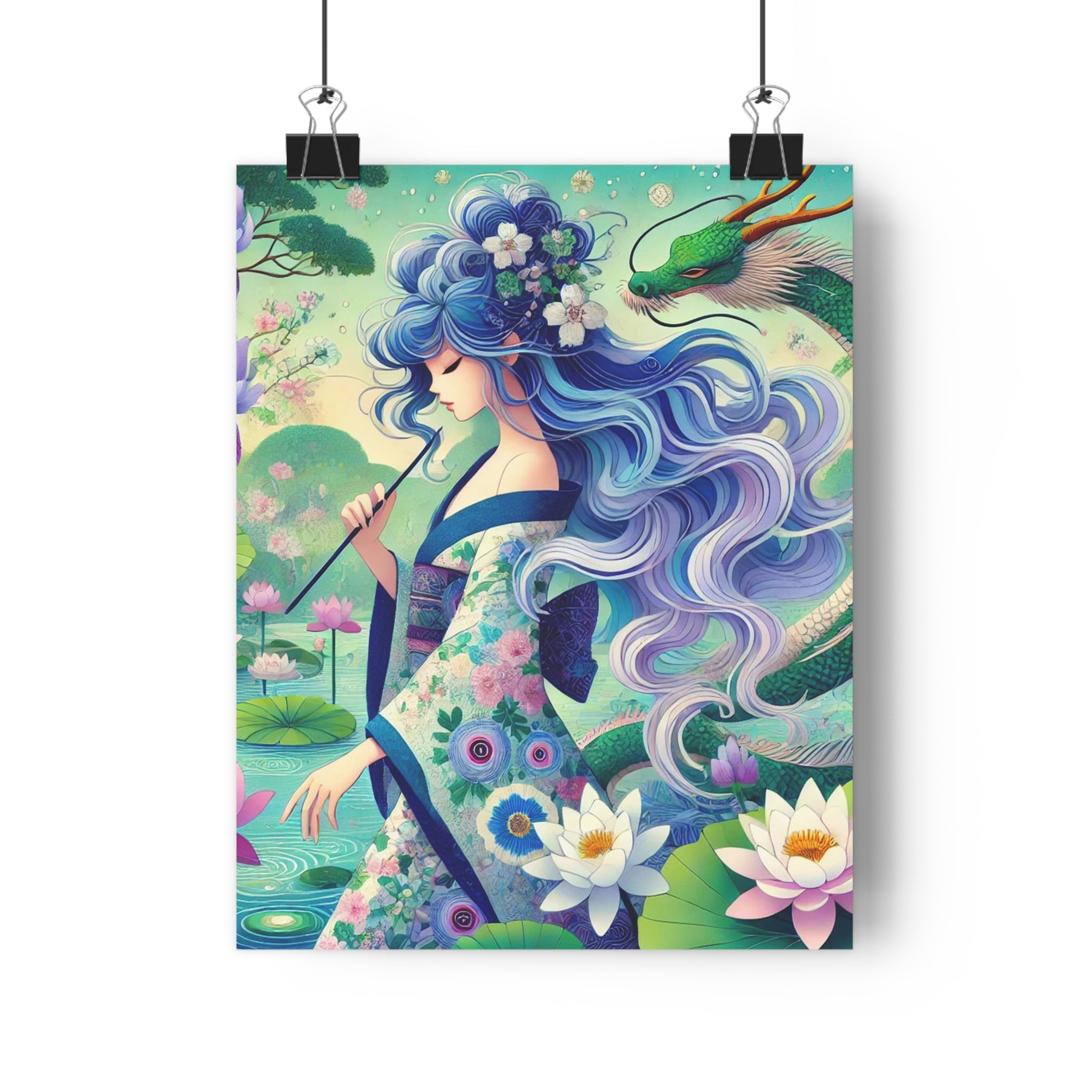 The enchanting artwork, Fairy of the Koi Pond, portrays a modern fairy with flowing blue hair, dressed in an iris-patterned kimono, standing beside a koi pond filled with irises and water lilies. A jade-green dragon coils gracefully at her side, adding a mystical and protective aura to the scene. With its flat, vibrant color palette and delicate design, the piece merges Eastern-inspired elegance with dreamlike fantasy, radiating peace, strength, and enchantment in every detail.