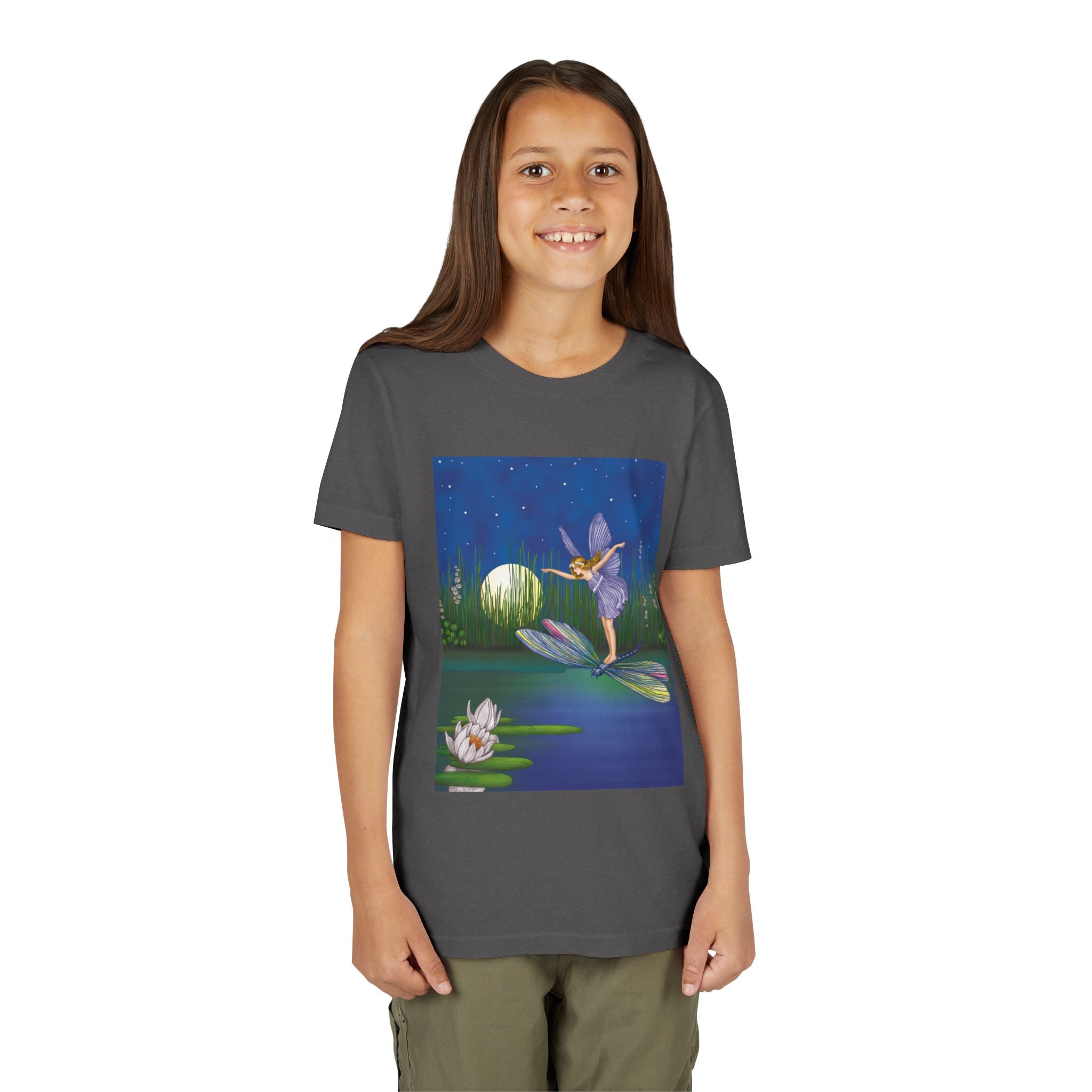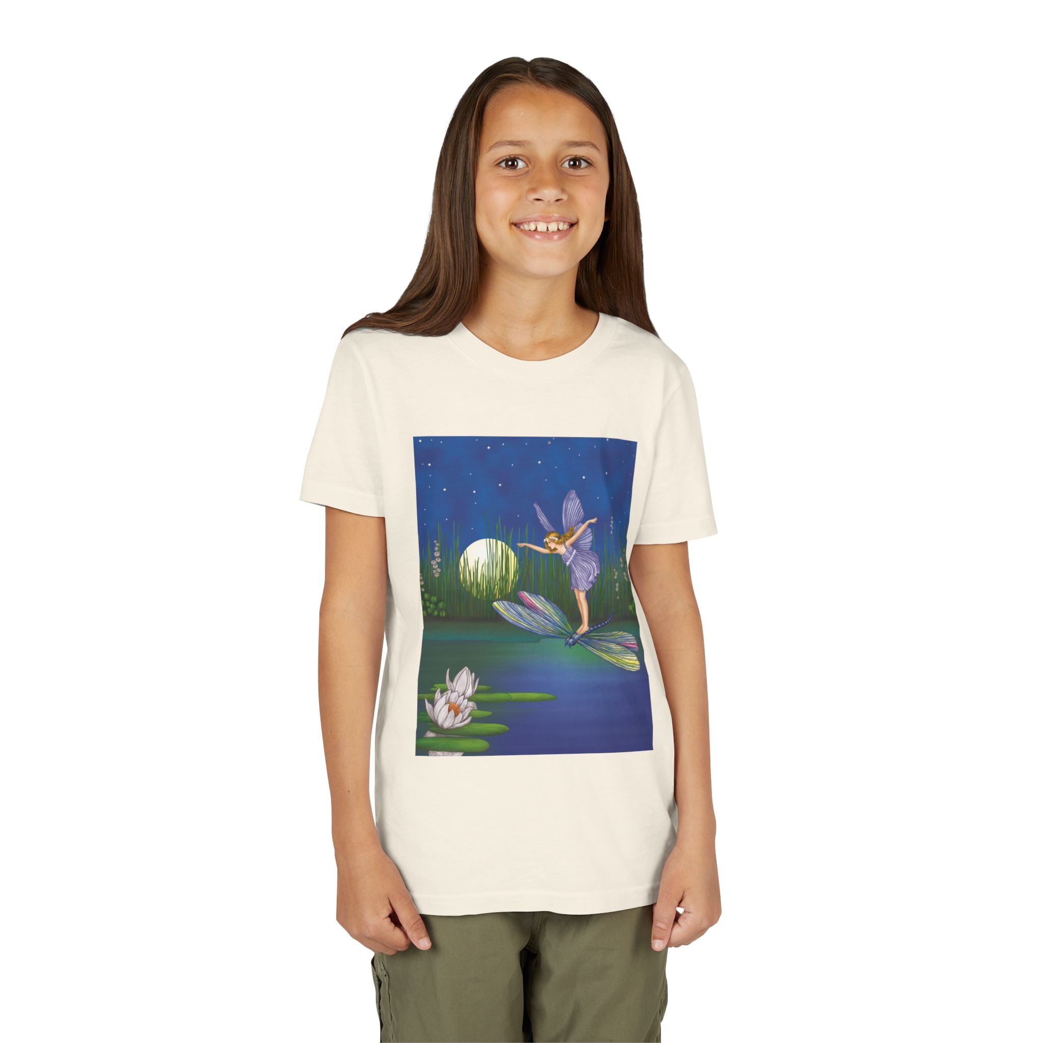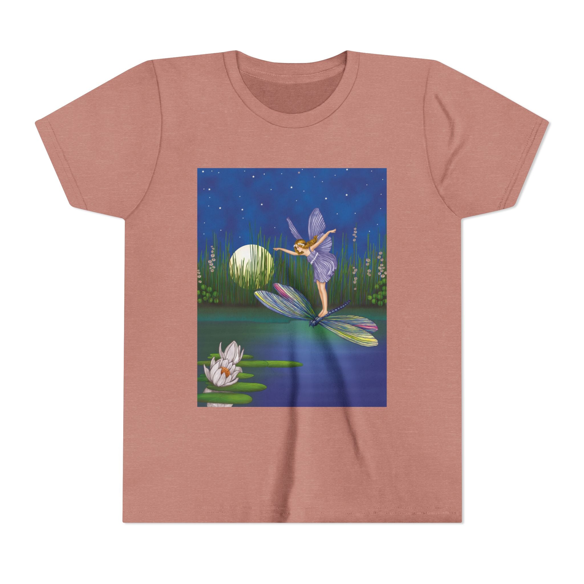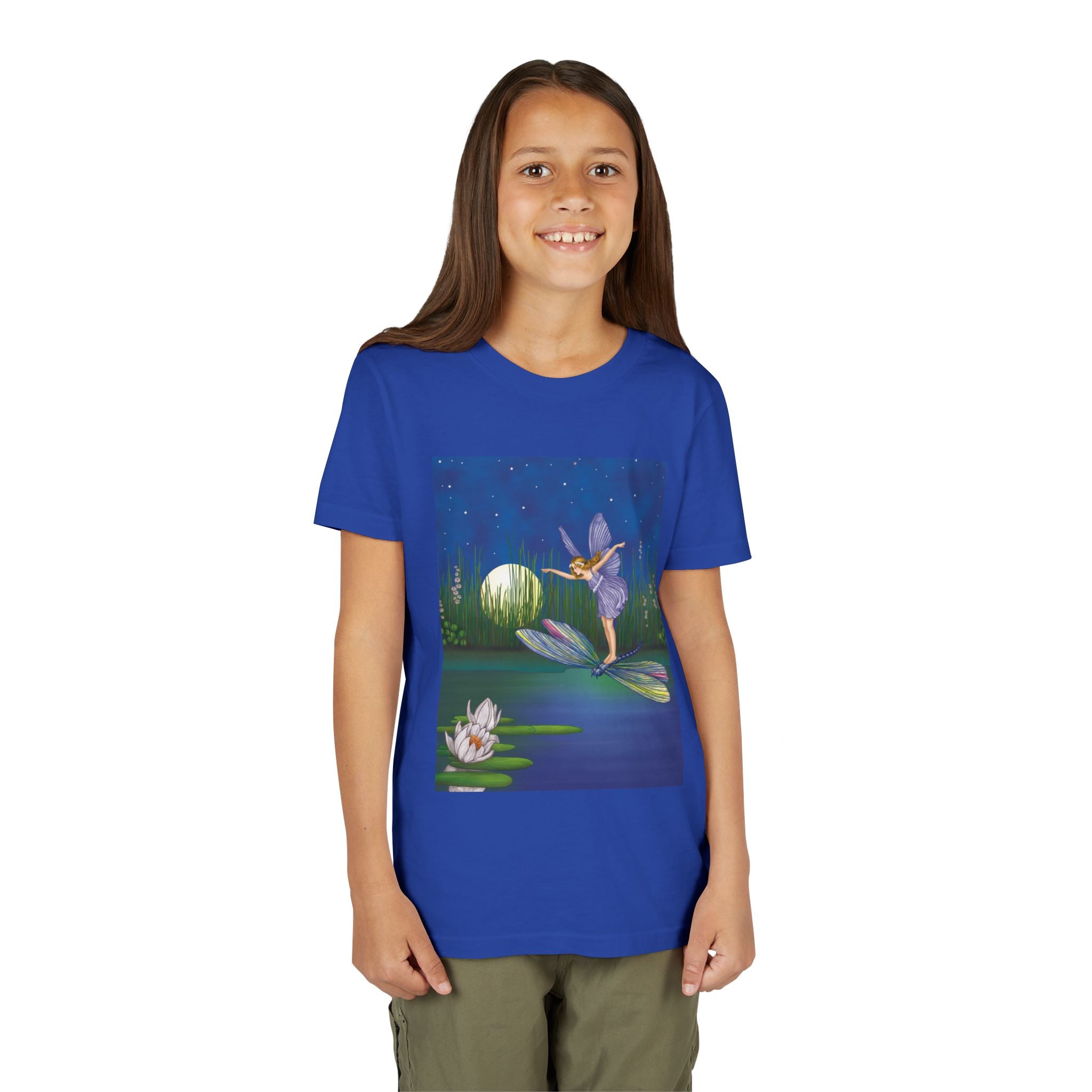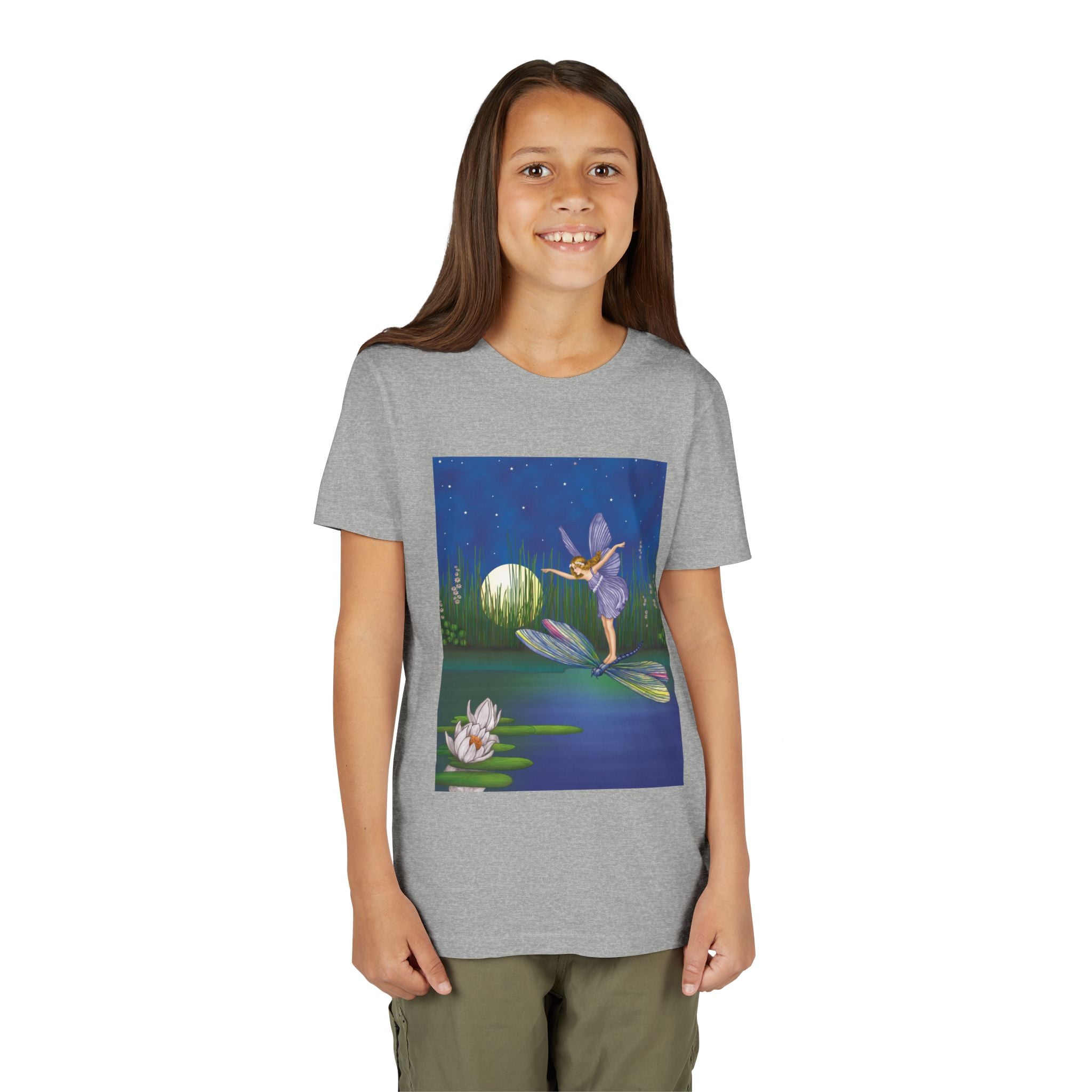 Kids will love this whimsical tee featuring "Fairy on a Dragonfly" by Ida Rentoul Outhwaite, a beloved early 20th-century illustration that blends Art Nouveau grace with folklore charm. The artwork shows a delicate fairy with gossamer wings gliding through the night sky atop a dragonfly, above a moonlit pond surrounded by reeds and lilies—a magical scene that brings nature and imagination to life.