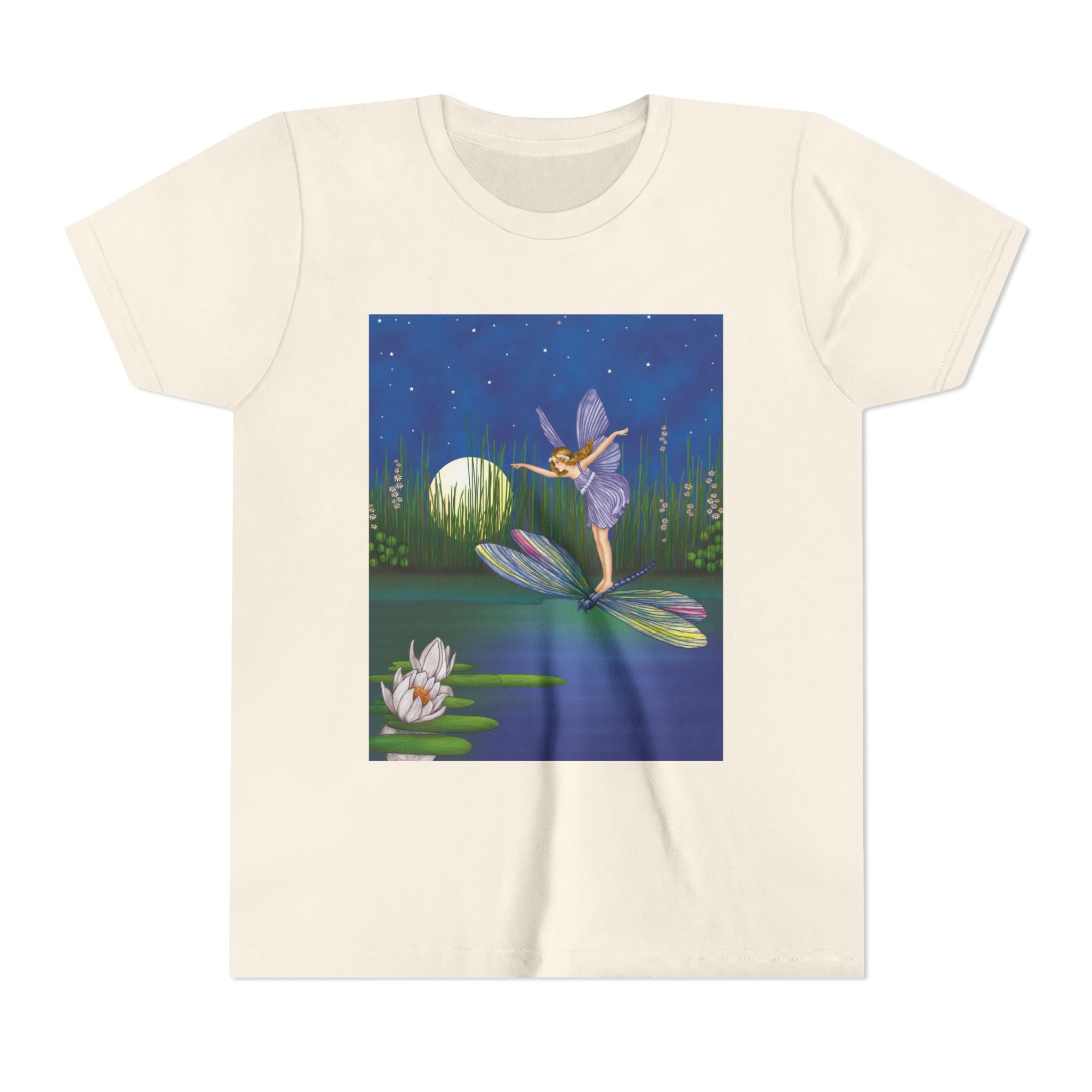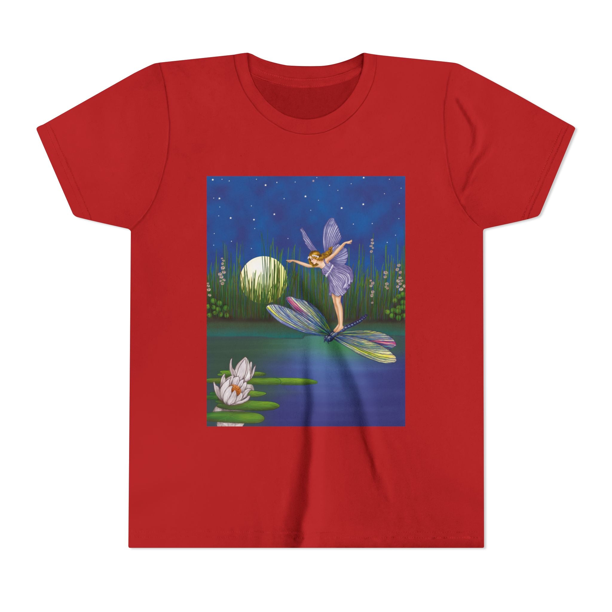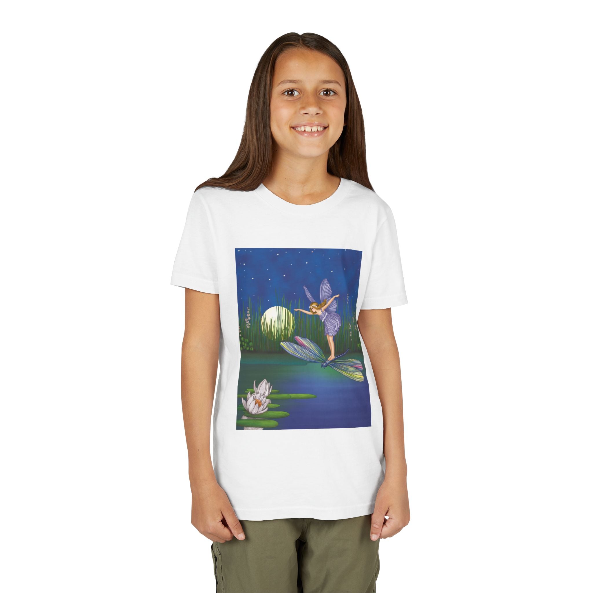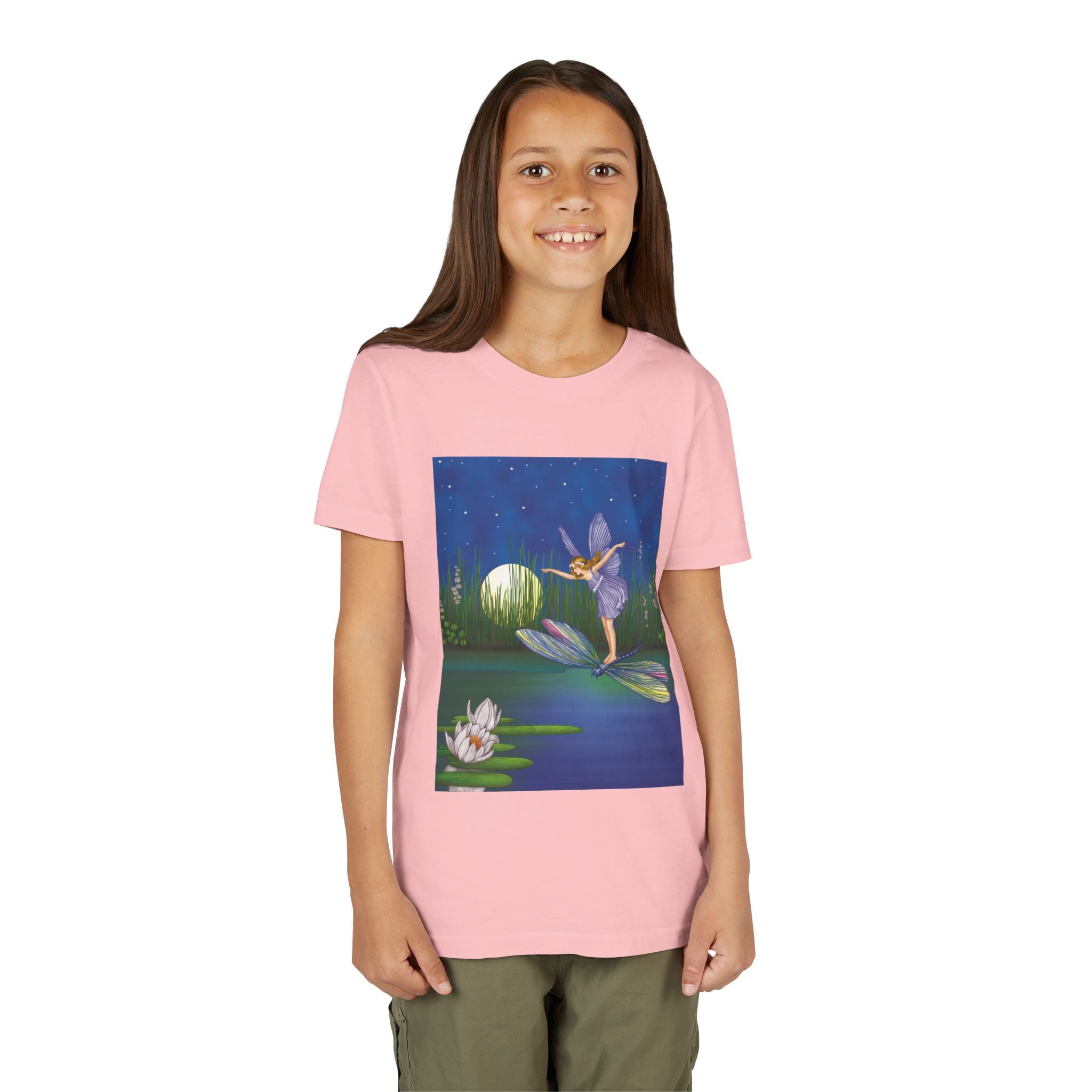 Kids will love this whimsical tee featuring "Fairy on a Dragonfly" by Ida Rentoul Outhwaite, a beloved early 20th-century illustration that blends Art Nouveau grace with folklore charm. The artwork shows a delicate fairy with gossamer wings gliding through the night sky atop a dragonfly, above a moonlit pond surrounded by reeds and lilies—a magical scene that brings nature and imagination to life.