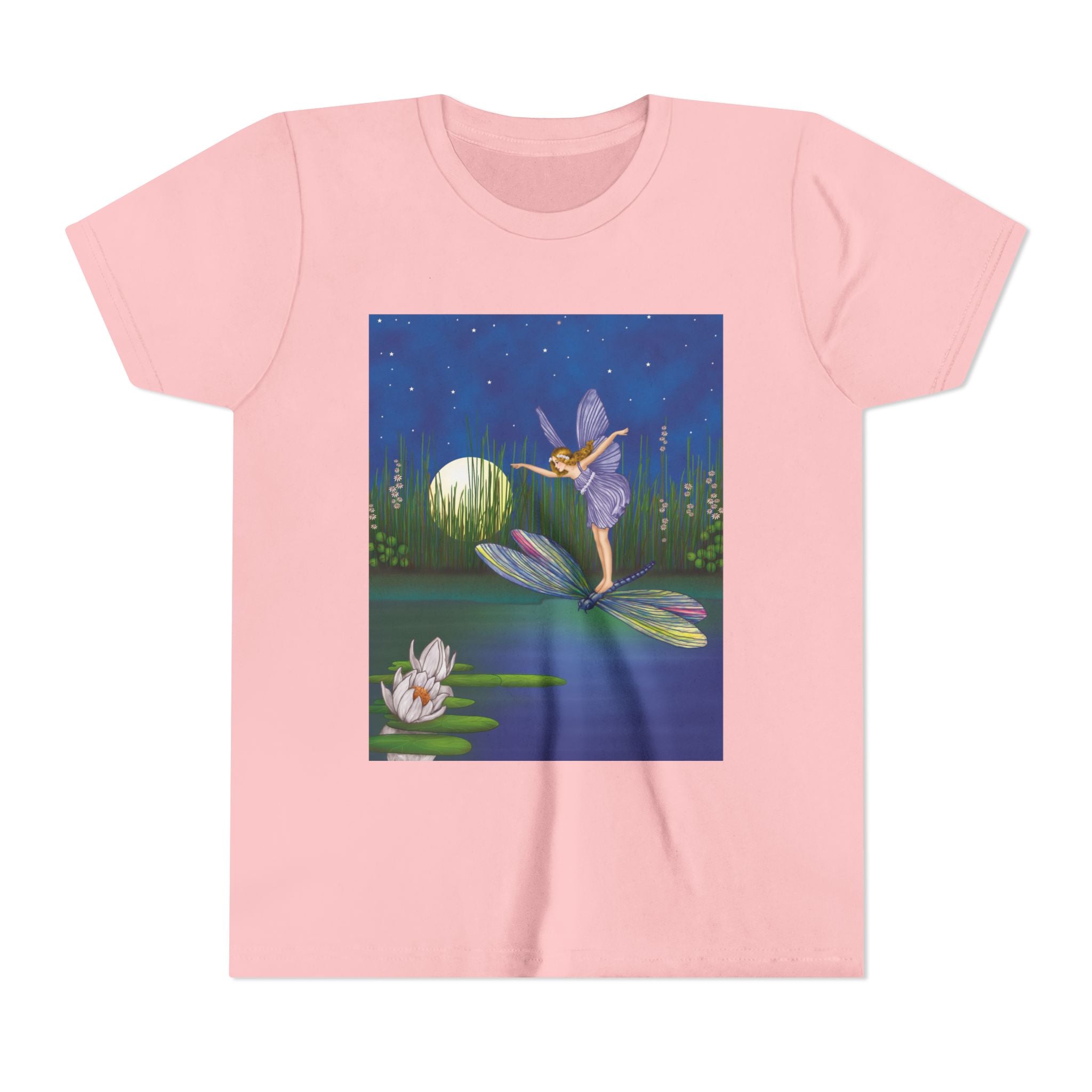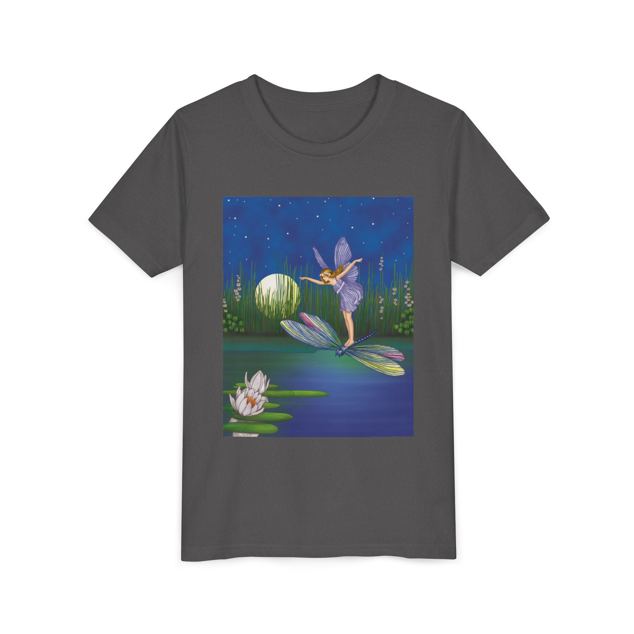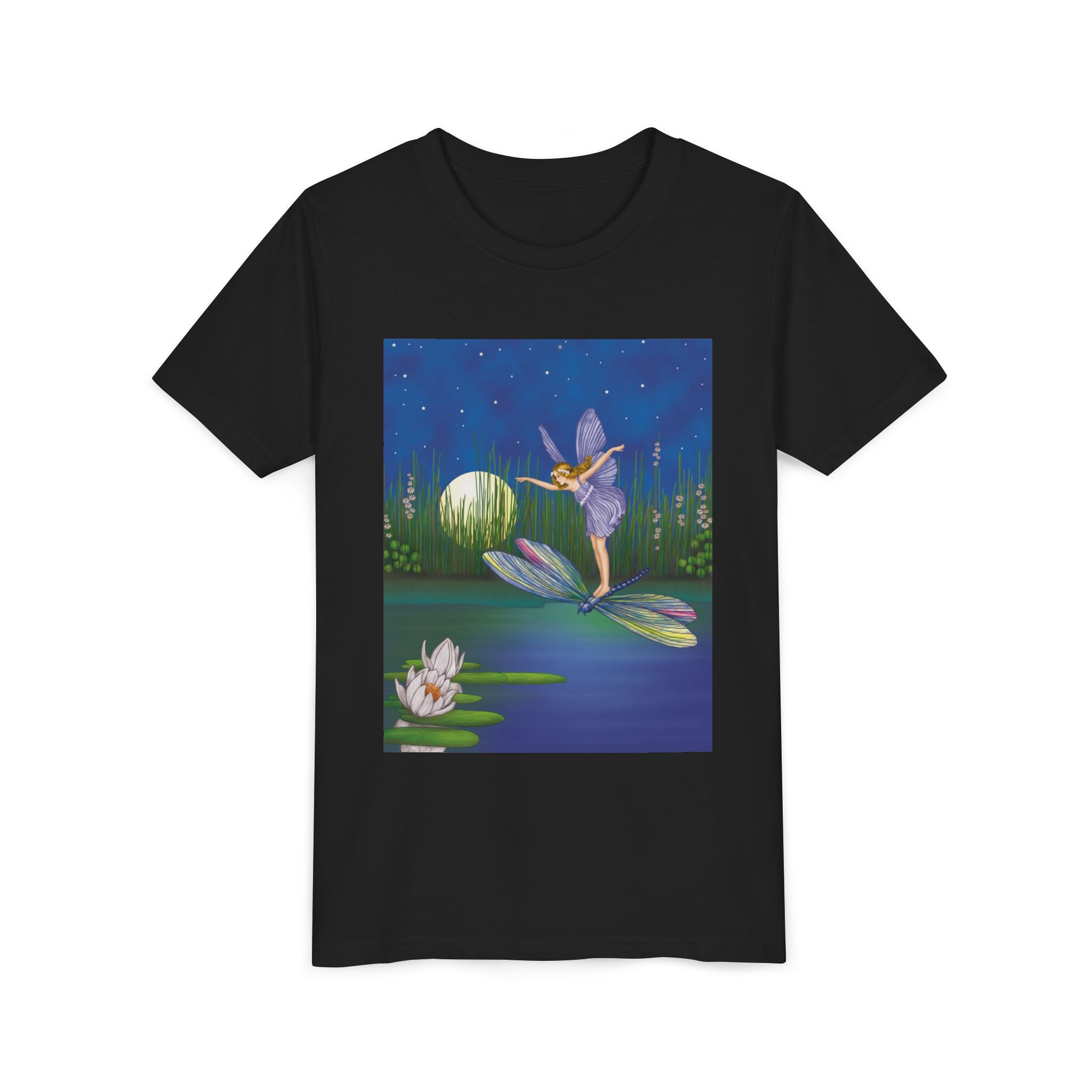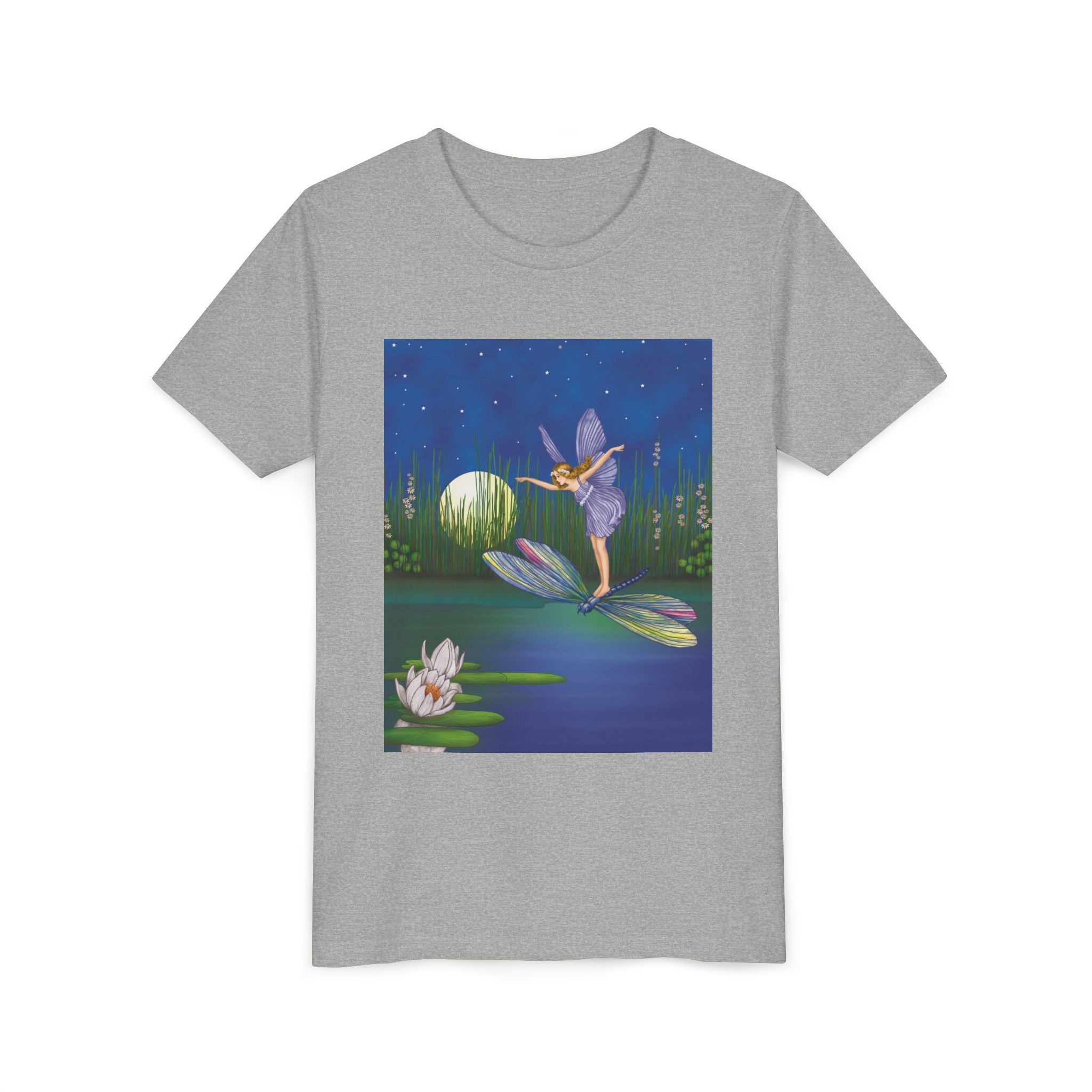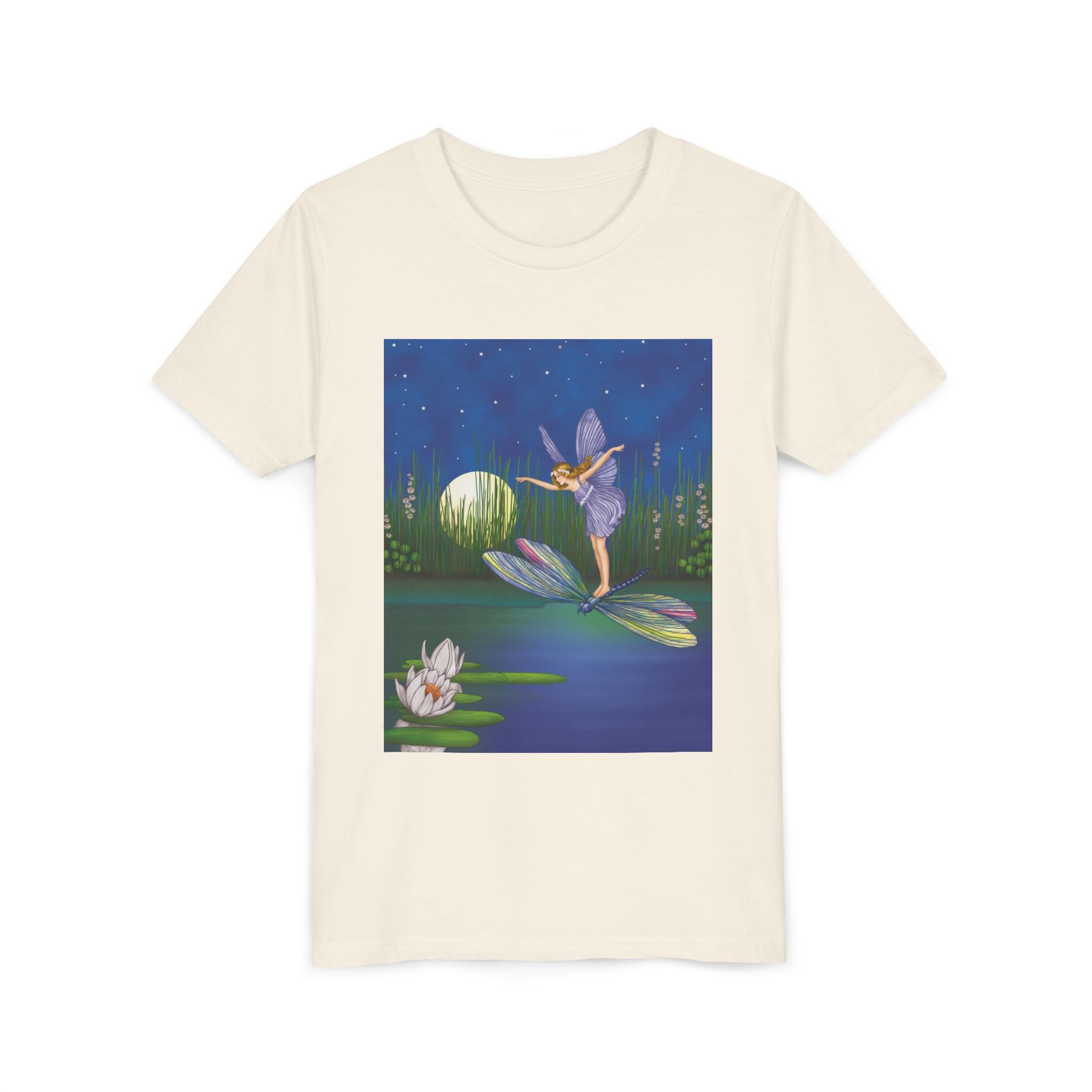 Kids will love this whimsical tee featuring "Fairy on a Dragonfly" by Ida Rentoul Outhwaite, a beloved early 20th-century illustration that blends Art Nouveau grace with folklore charm. The artwork shows a delicate fairy with gossamer wings gliding through the night sky atop a dragonfly, above a moonlit pond surrounded by reeds and lilies—a magical scene that brings nature and imagination to life.