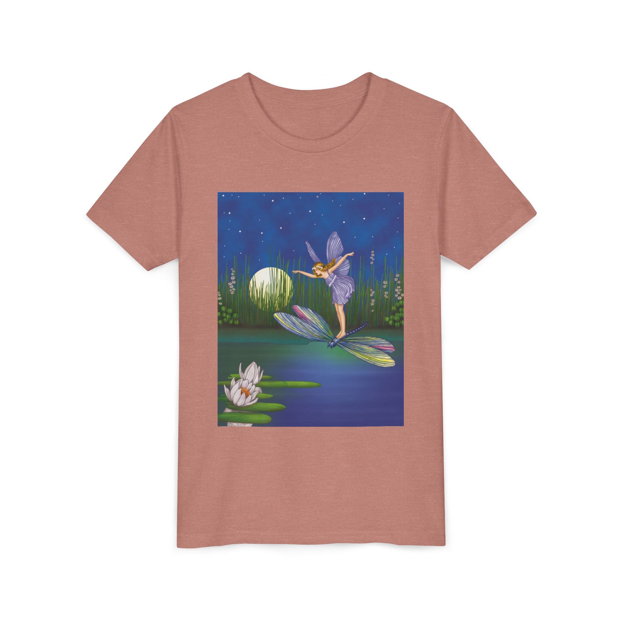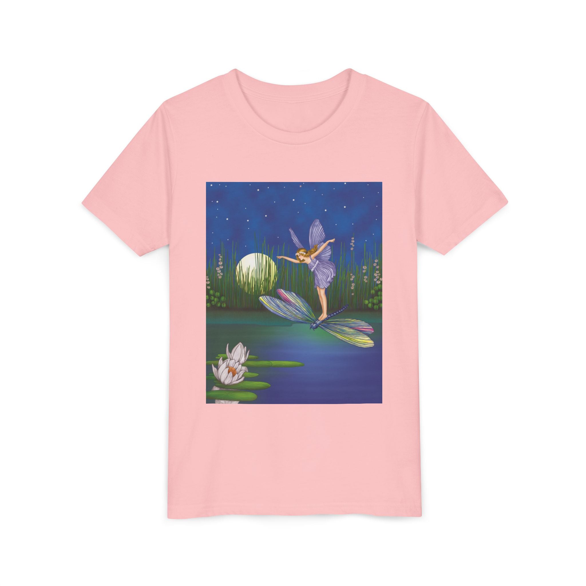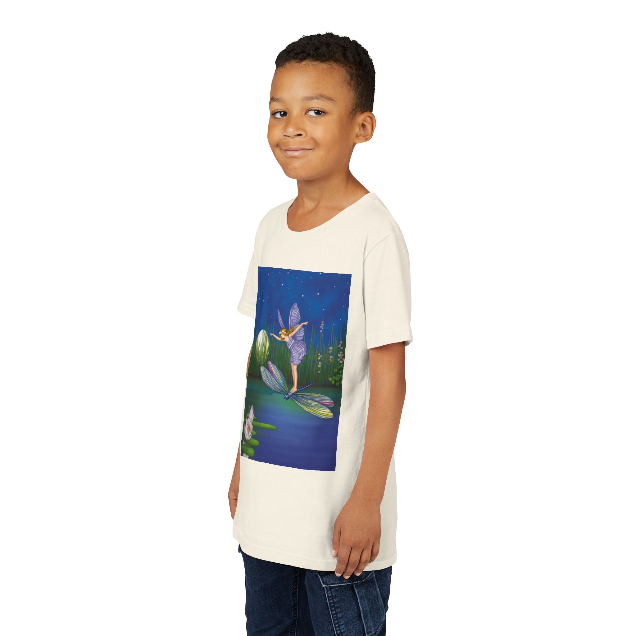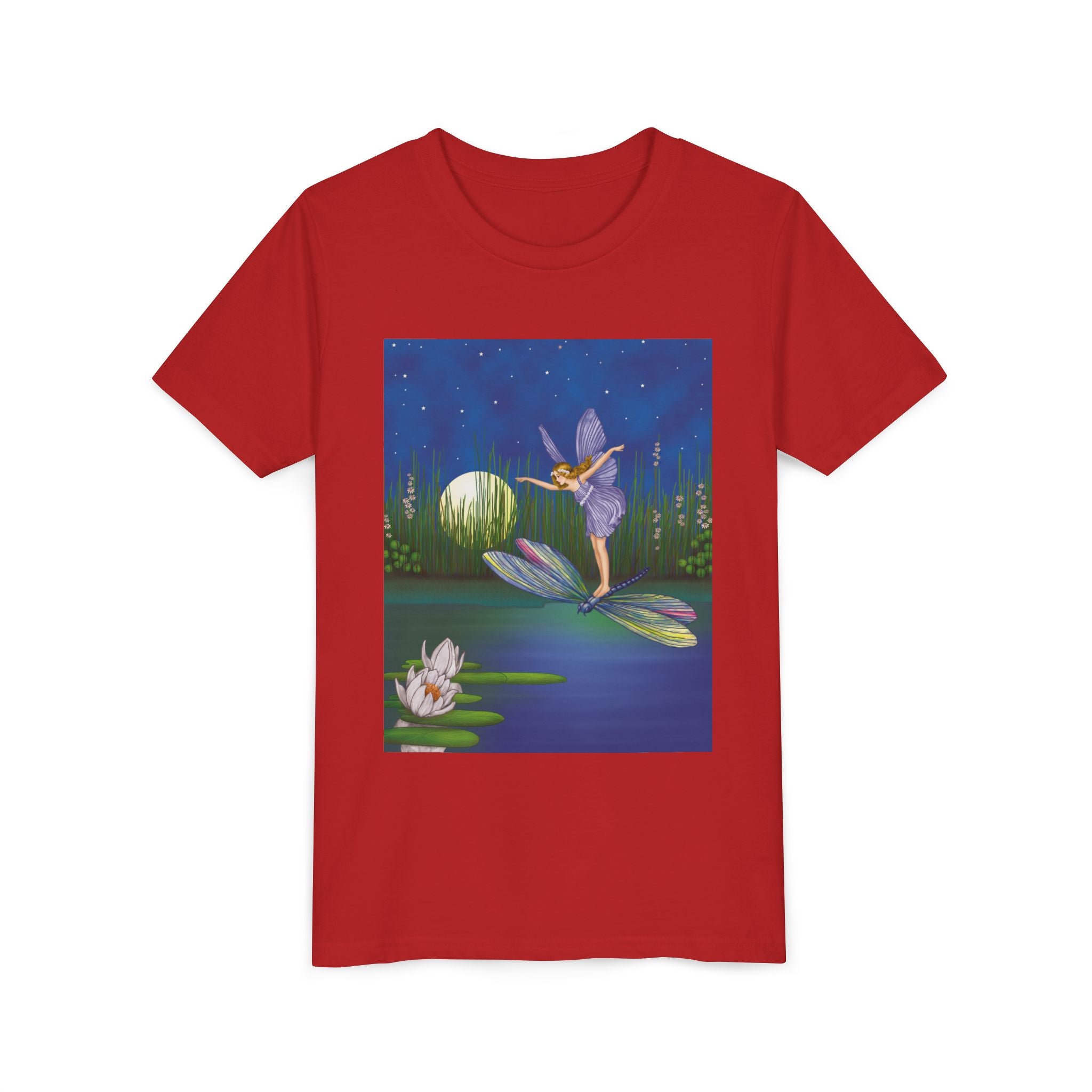 Kids will love this whimsical tee featuring "Fairy on a Dragonfly" by Ida Rentoul Outhwaite, a beloved early 20th-century illustration that blends Art Nouveau grace with folklore charm. The artwork shows a delicate fairy with gossamer wings gliding through the night sky atop a dragonfly, above a moonlit pond surrounded by reeds and lilies—a magical scene that brings nature and imagination to life.