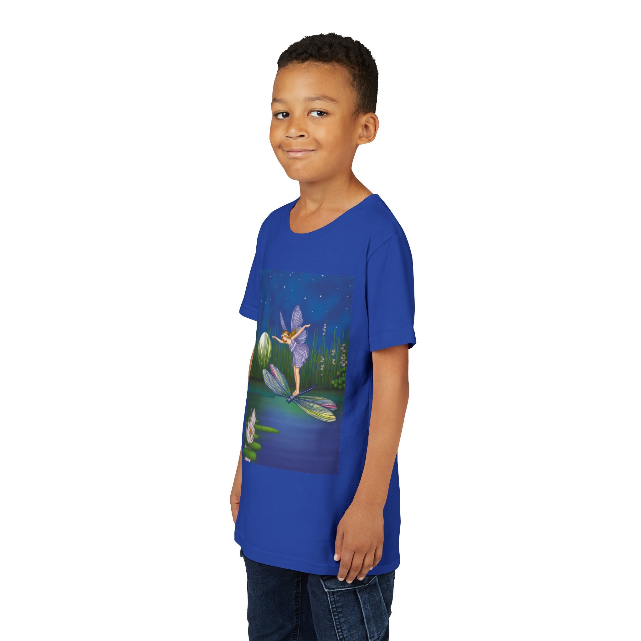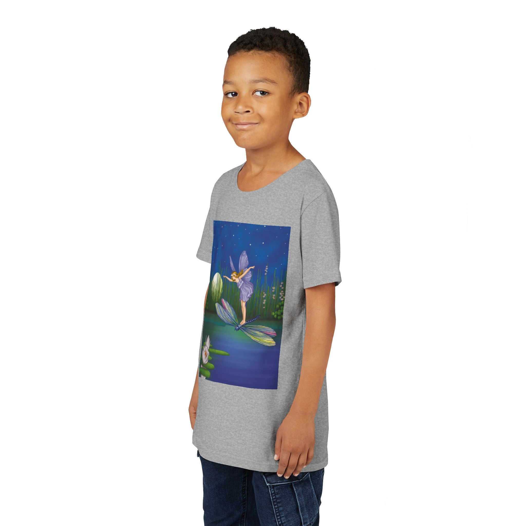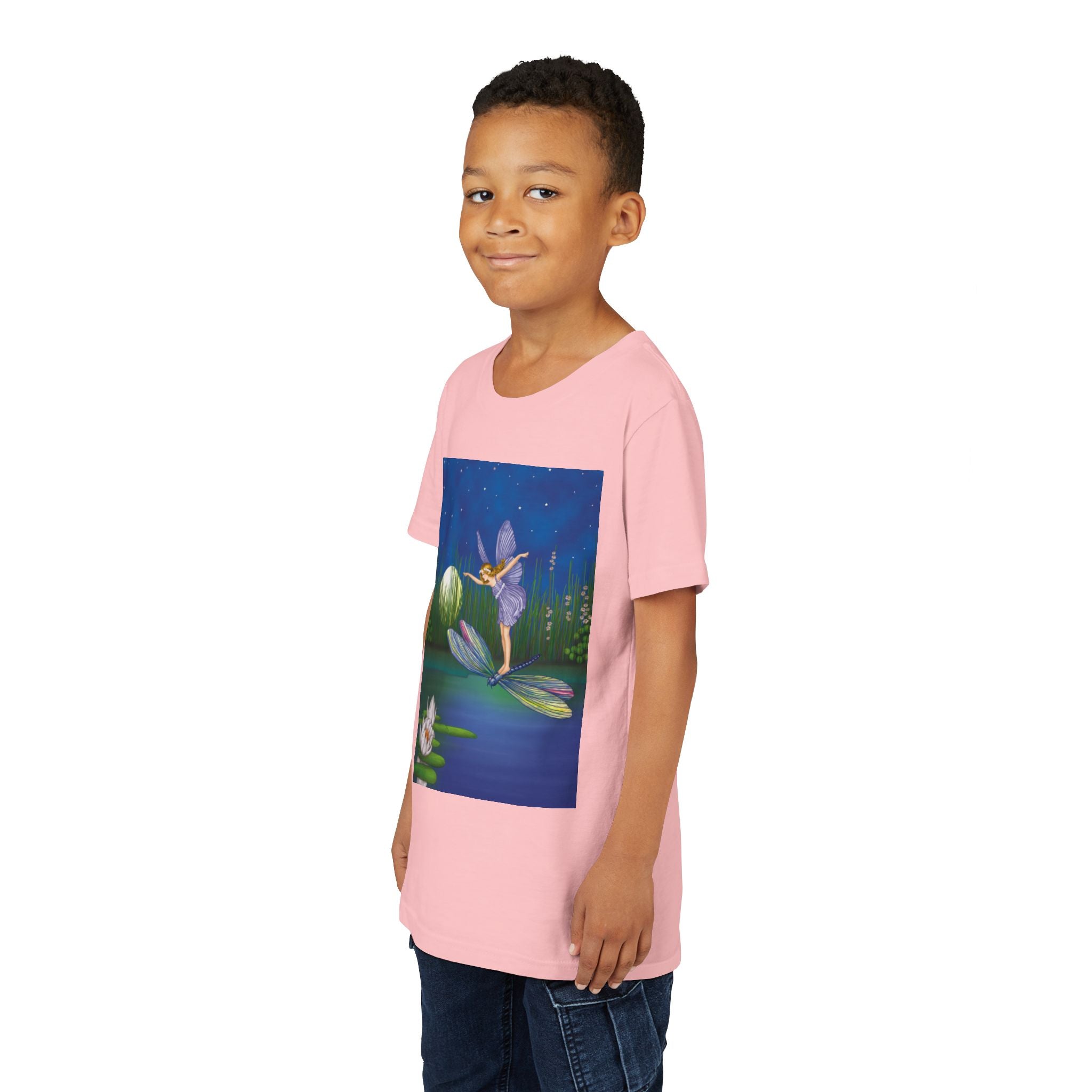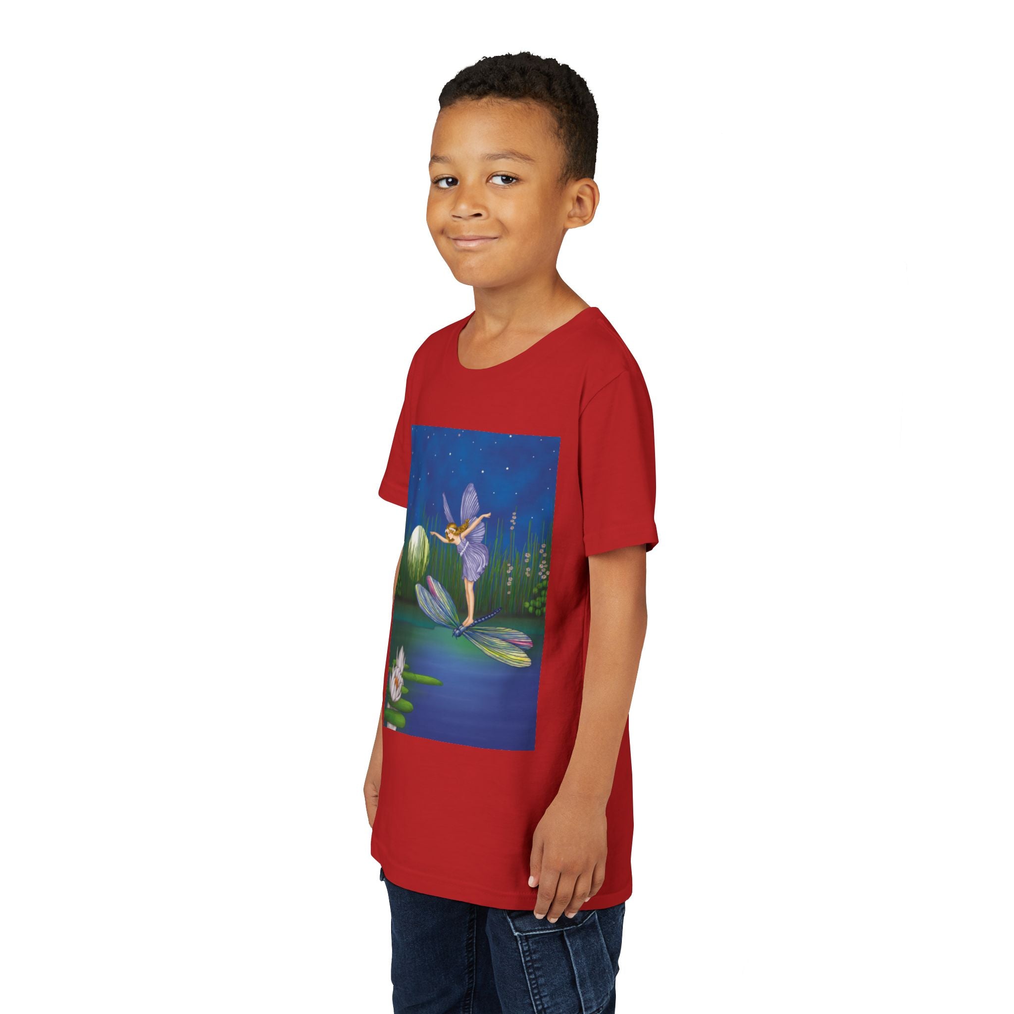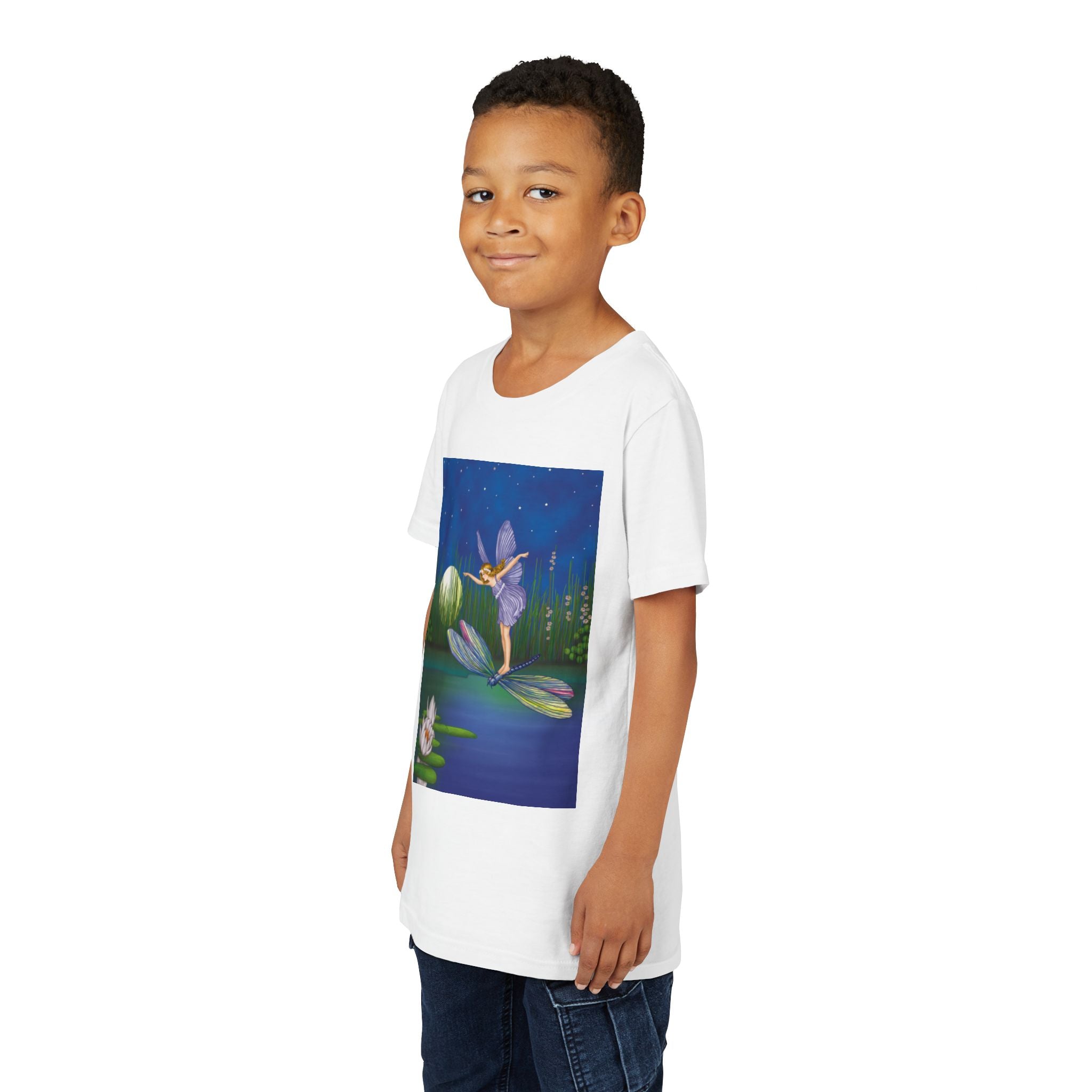 Kids will love this whimsical tee featuring "Fairy on a Dragonfly" by Ida Rentoul Outhwaite, a beloved early 20th-century illustration that blends Art Nouveau grace with folklore charm. The artwork shows a delicate fairy with gossamer wings gliding through the night sky atop a dragonfly, above a moonlit pond surrounded by reeds and lilies—a magical scene that brings nature and imagination to life.