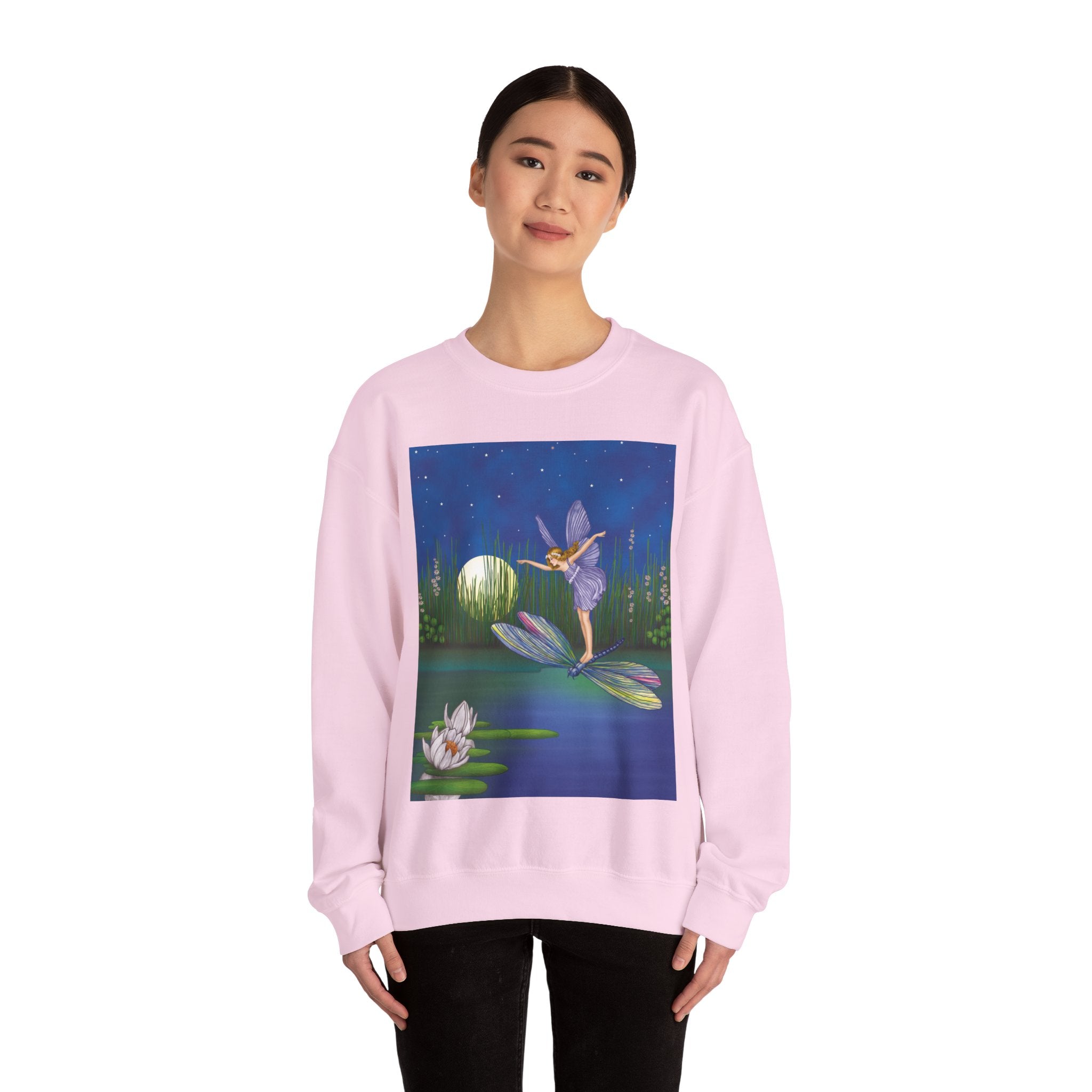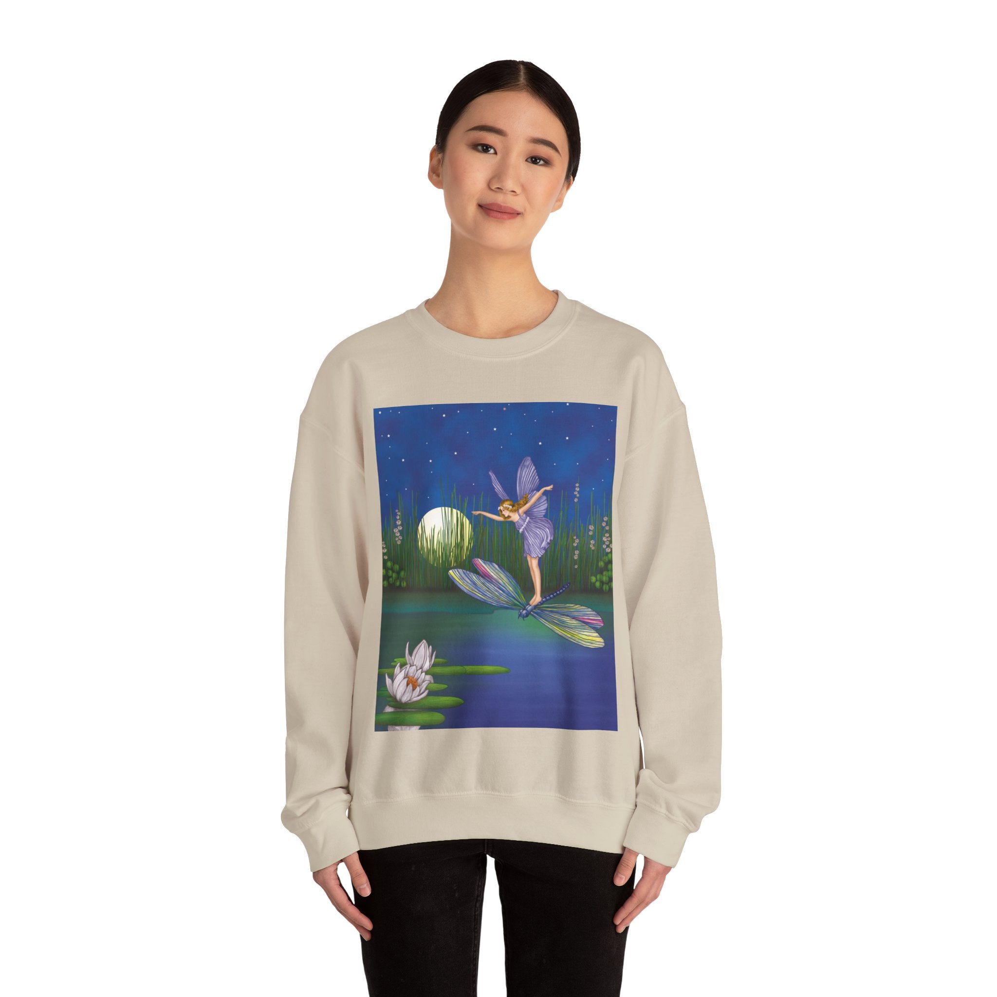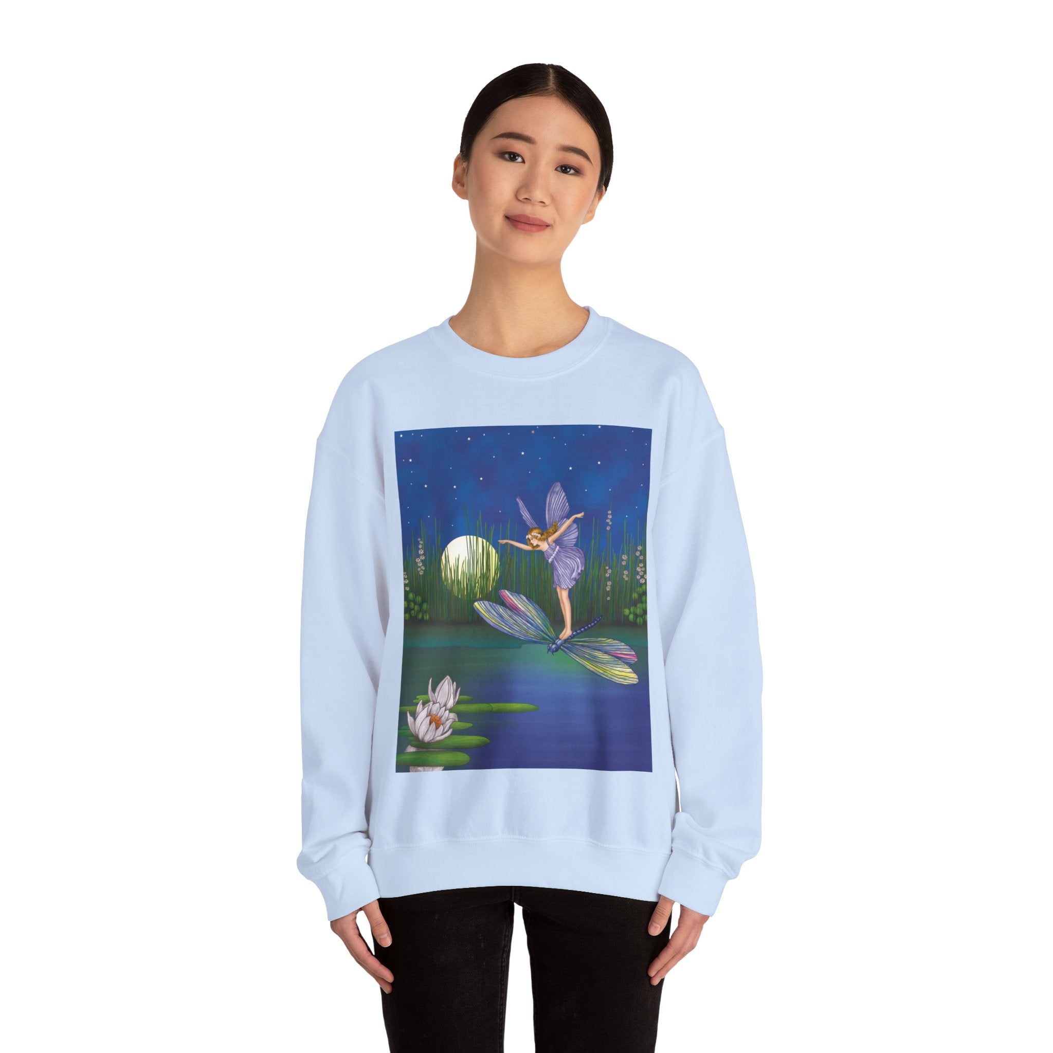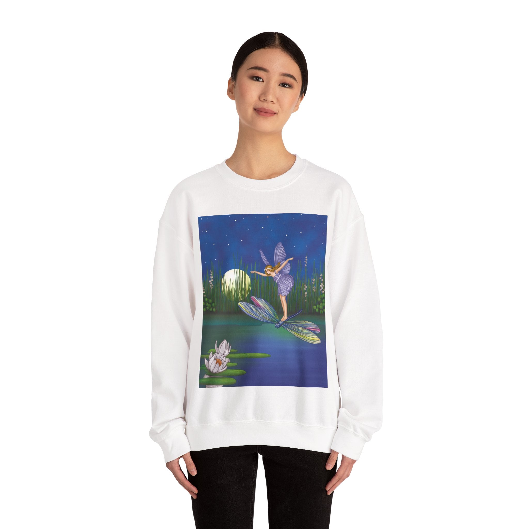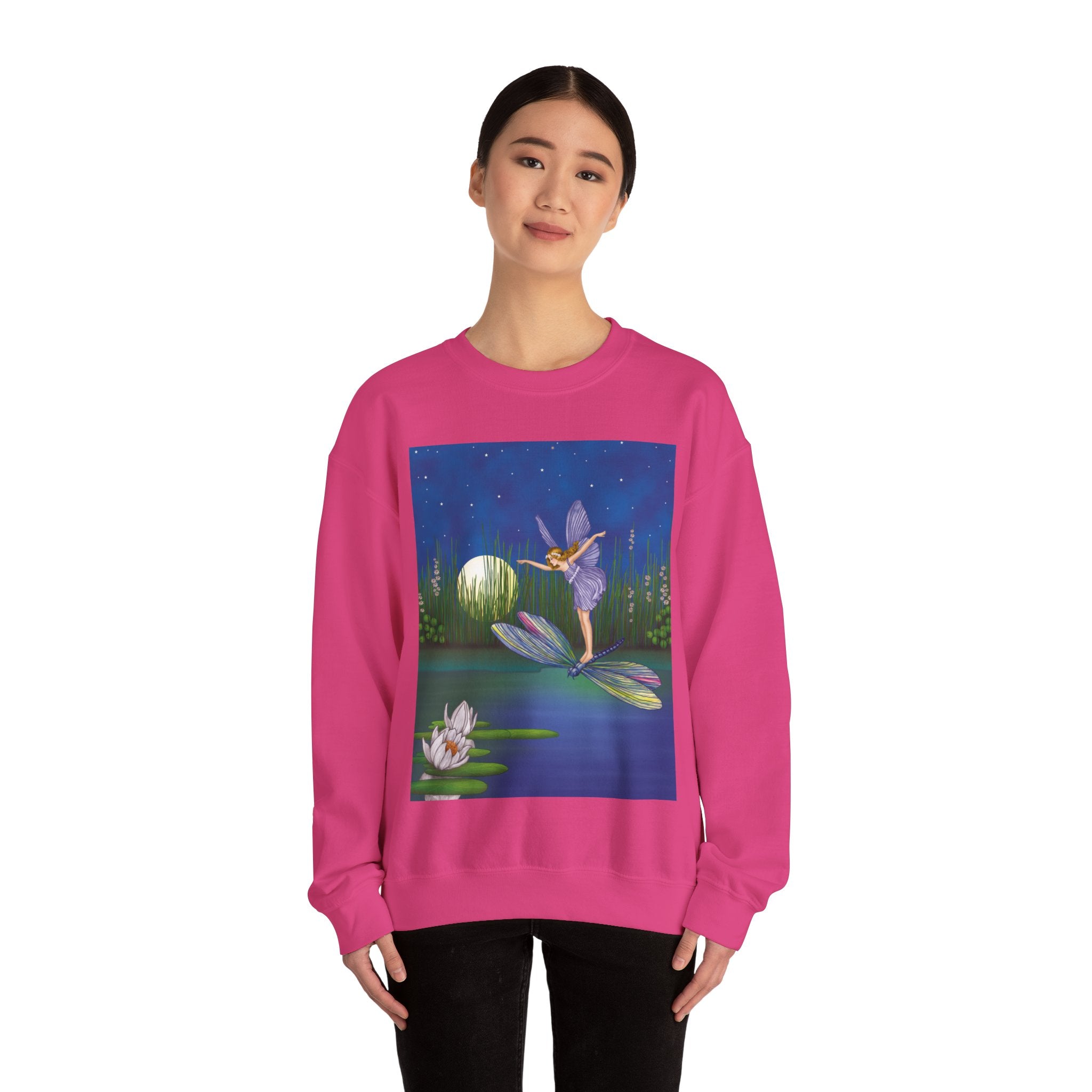 Fairy on a Dragonfly Heavy Blend™ Crewneck Sweatshirt drifts into view like a page from a storybook, featuring Ida Rentoul Outhwaite’s enchanting illustration of a delicate fairy riding a dragonfly across a moonlit pond, where lilies and reeds rest beneath a still, magical sky.