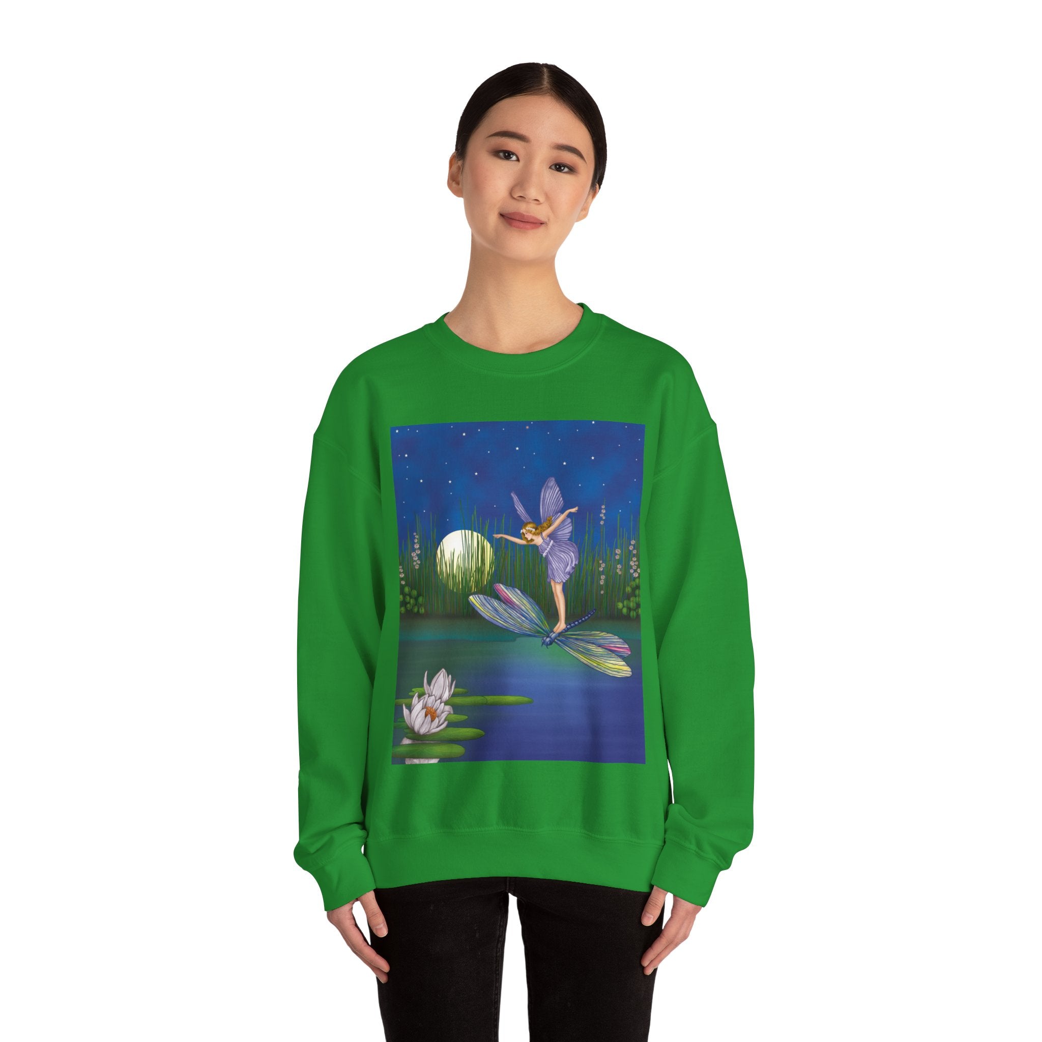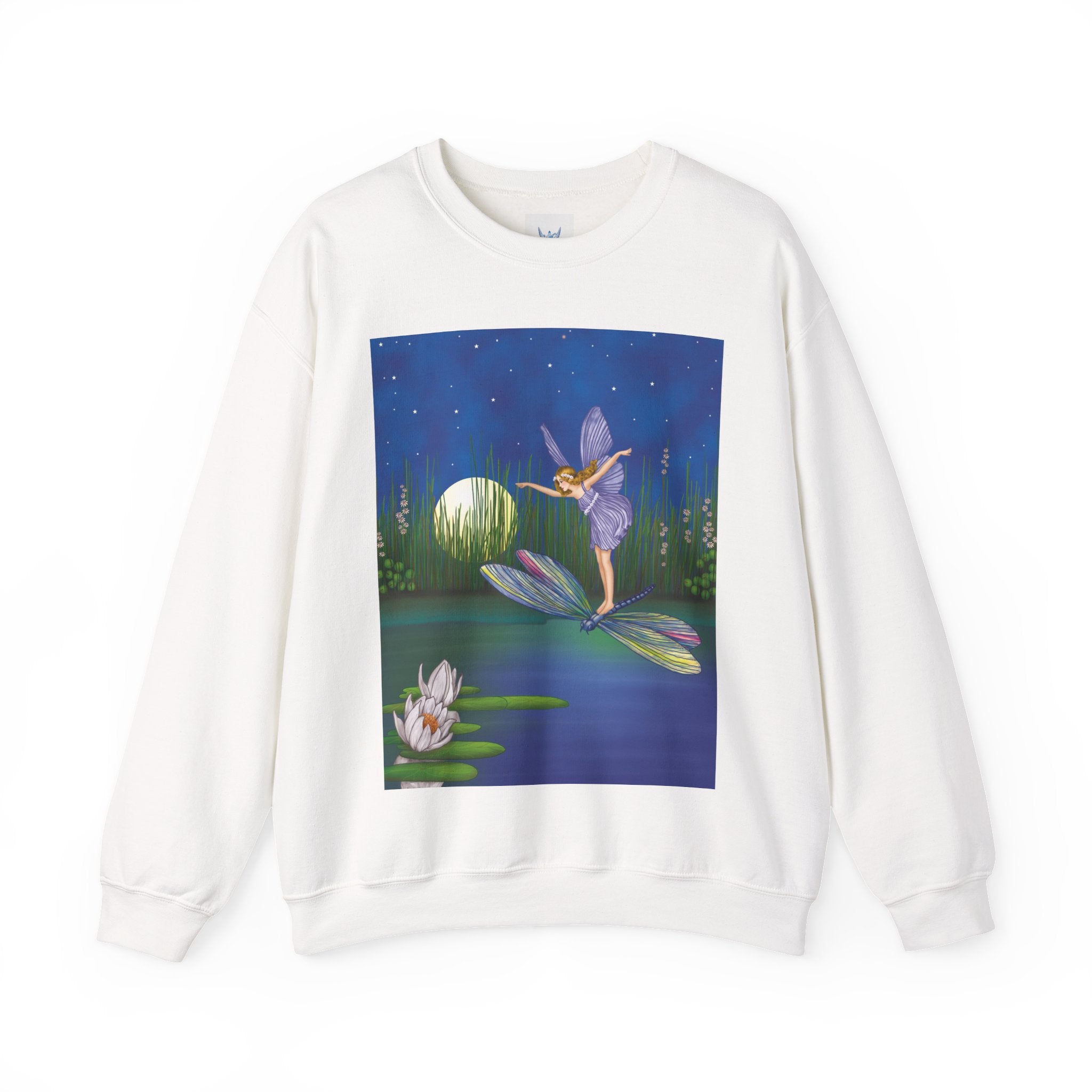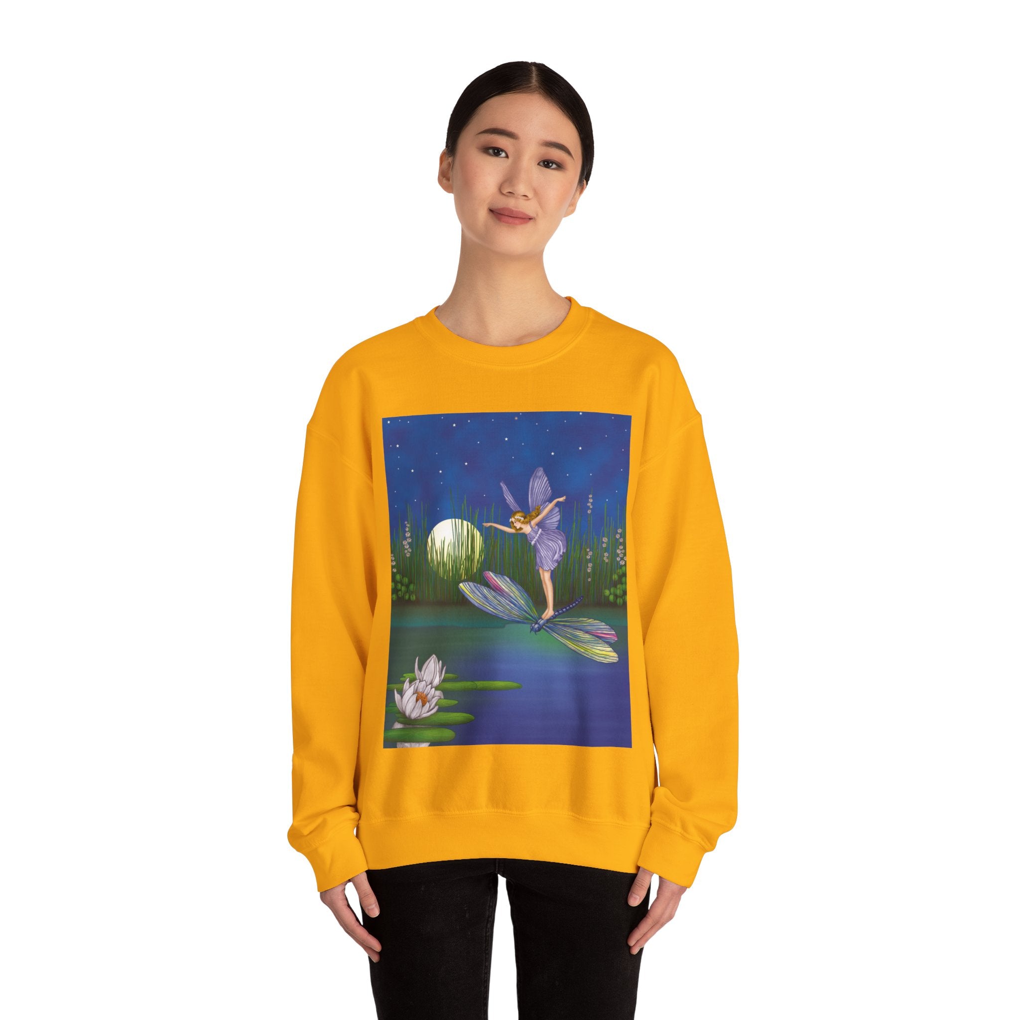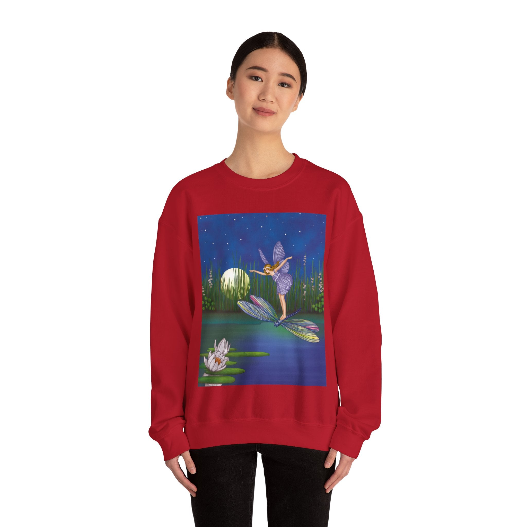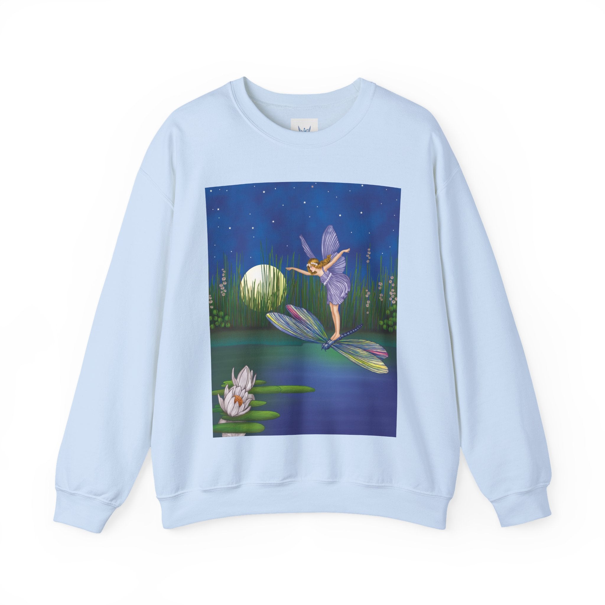 Fairy on a Dragonfly Heavy Blend™ Crewneck Sweatshirt drifts into view like a page from a storybook, featuring Ida Rentoul Outhwaite’s enchanting illustration of a delicate fairy riding a dragonfly across a moonlit pond, where lilies and reeds rest beneath a still, magical sky.