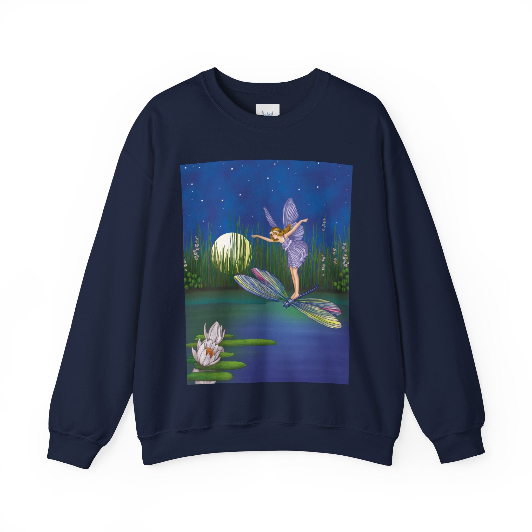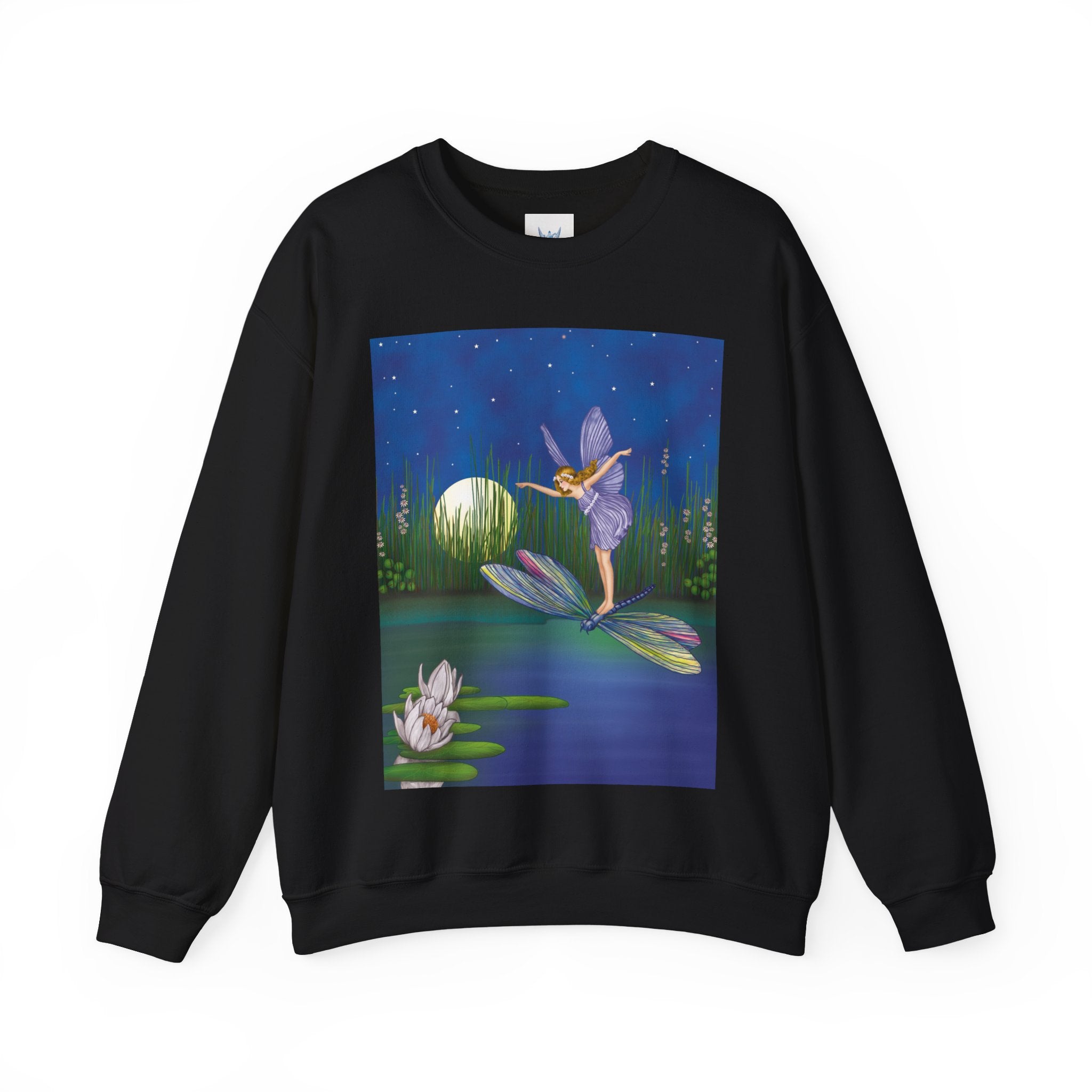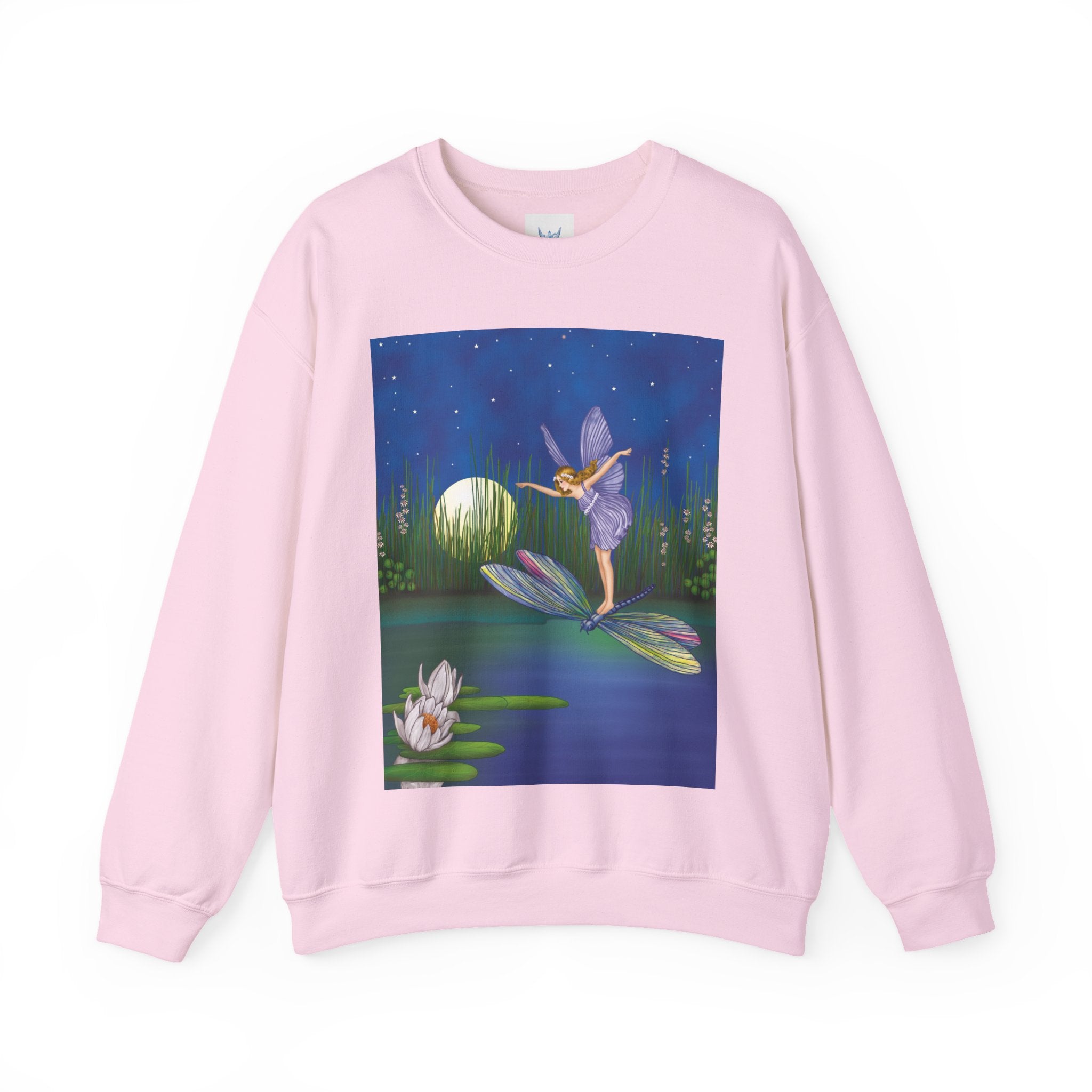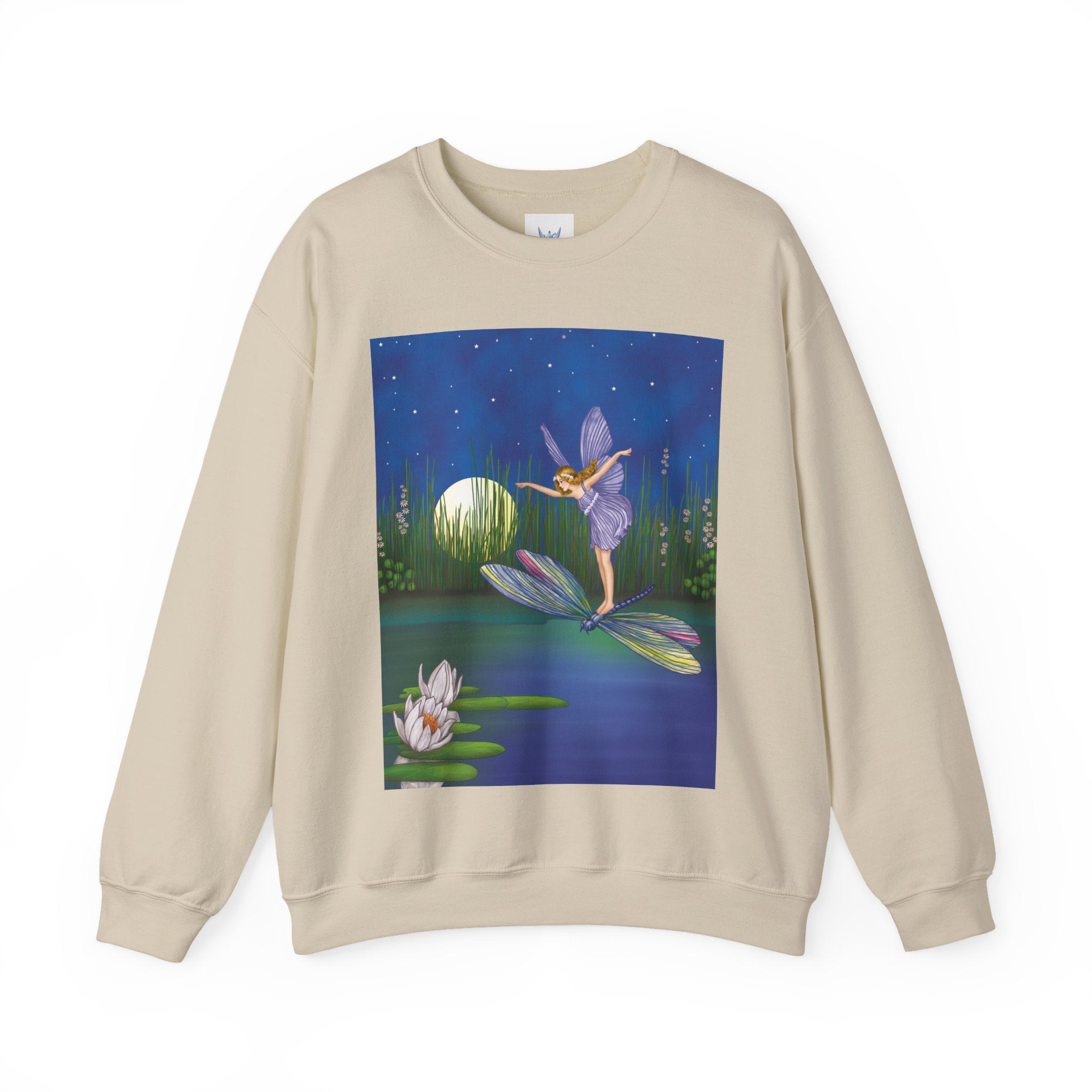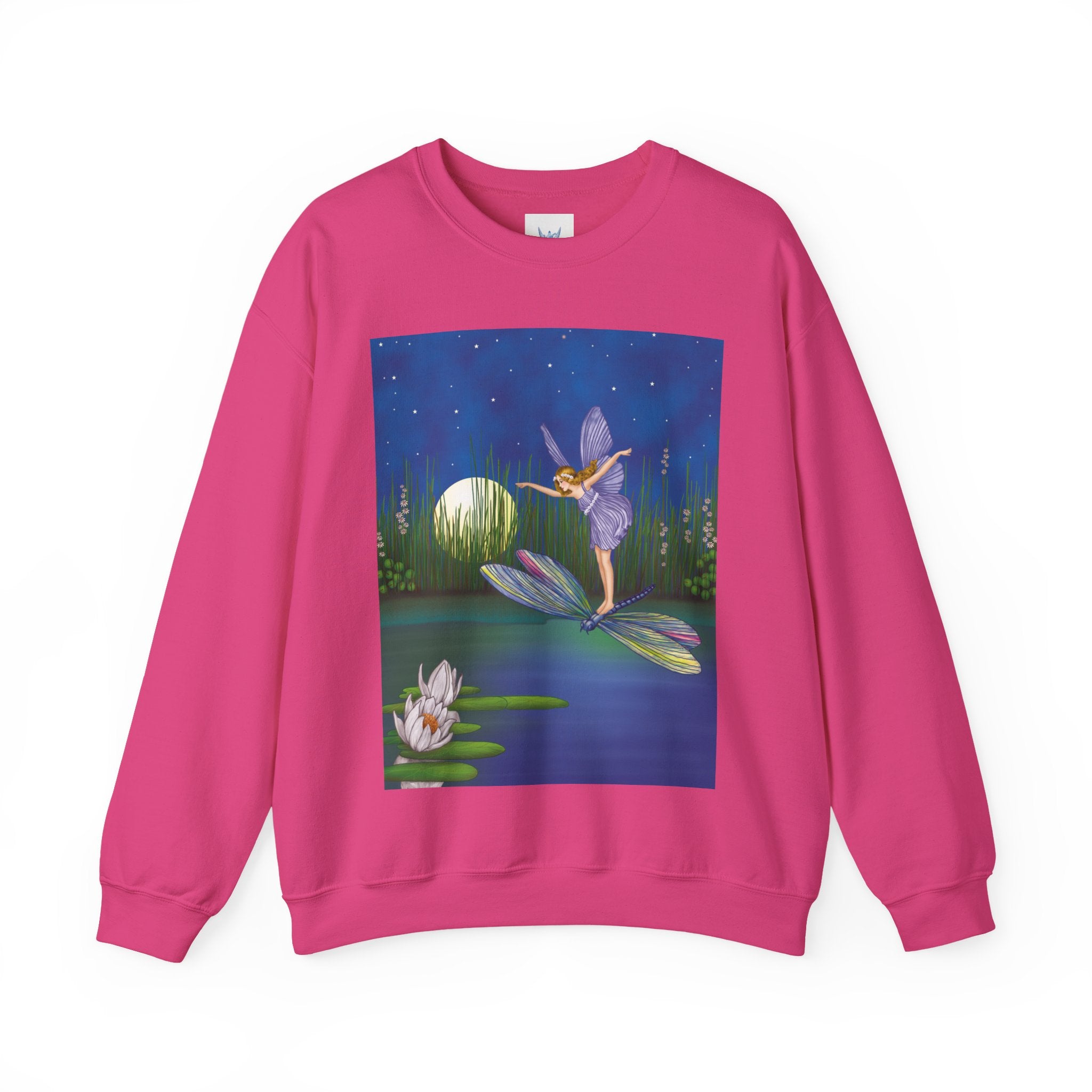 Fairy on a Dragonfly Heavy Blend™ Crewneck Sweatshirt drifts into view like a page from a storybook, featuring Ida Rentoul Outhwaite’s enchanting illustration of a delicate fairy riding a dragonfly across a moonlit pond, where lilies and reeds rest beneath a still, magical sky.
