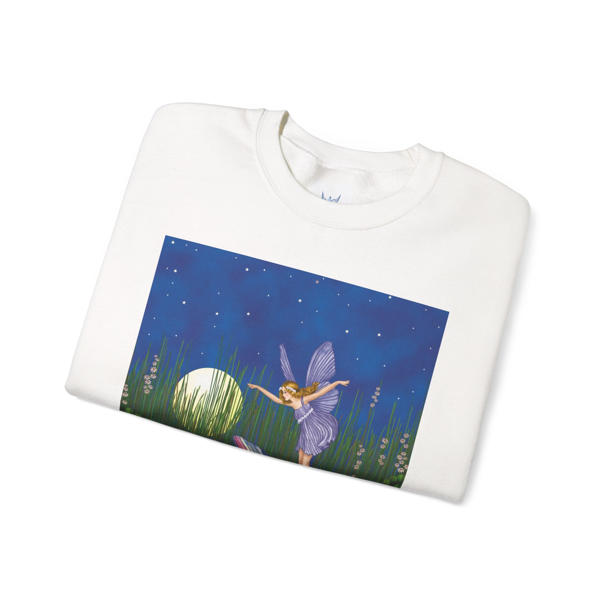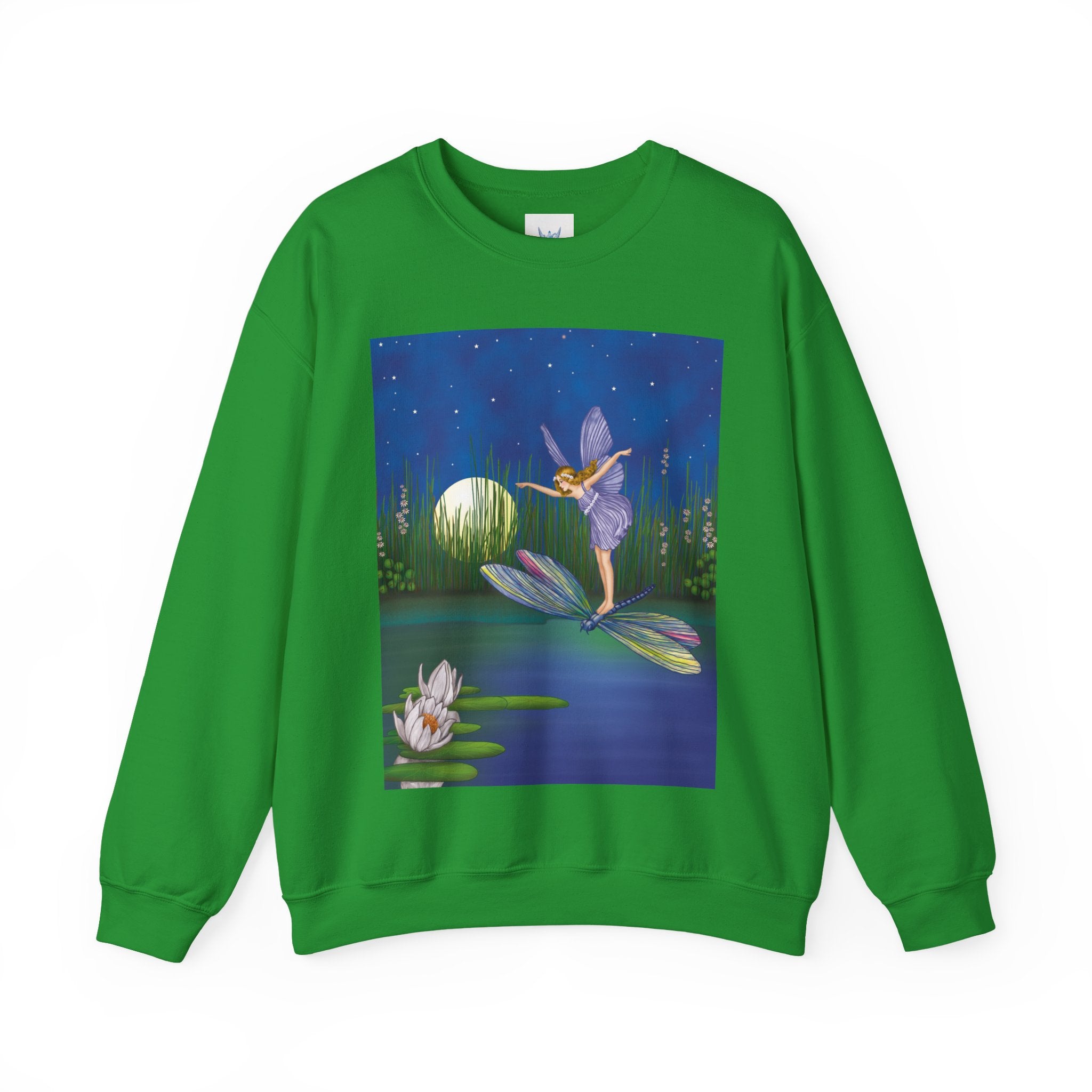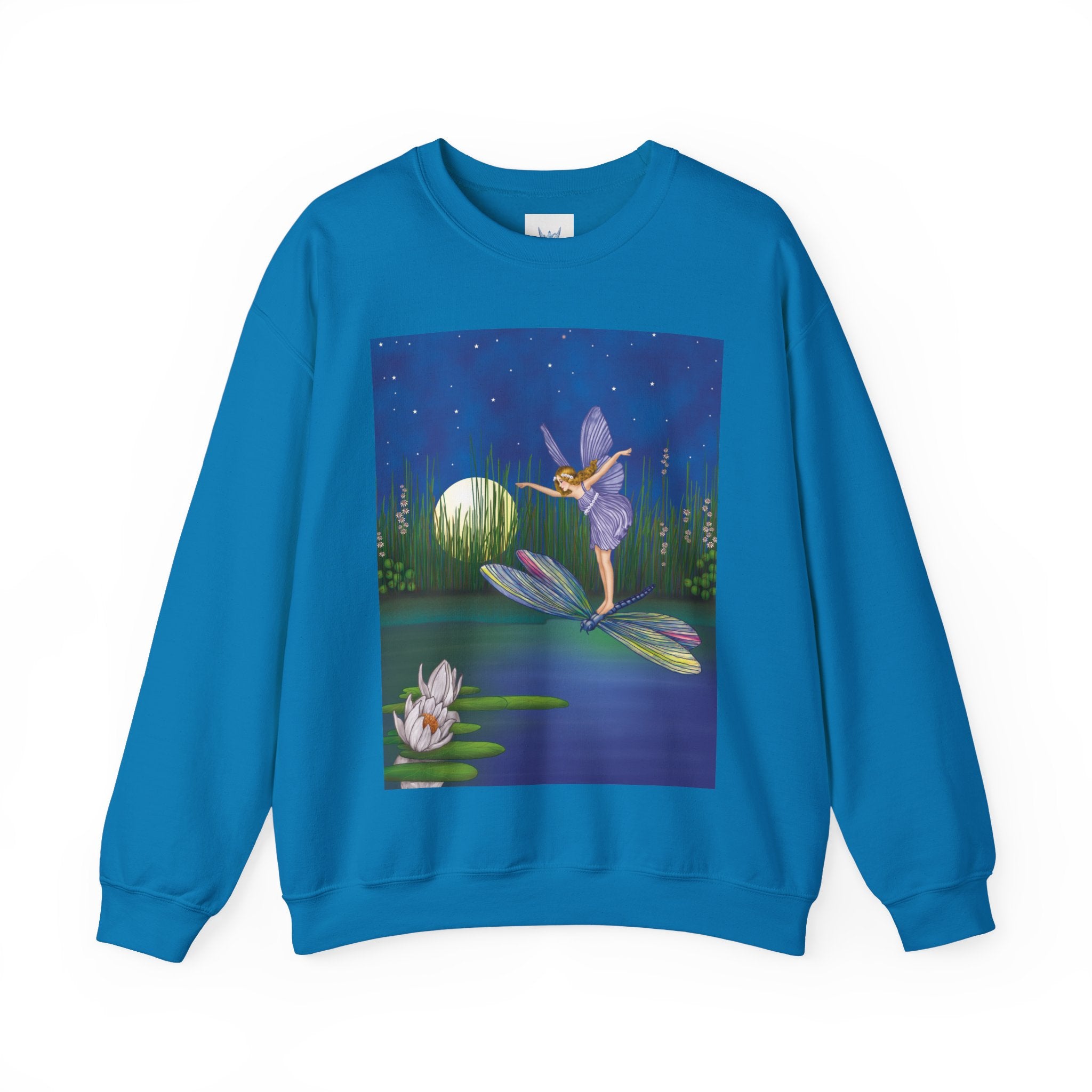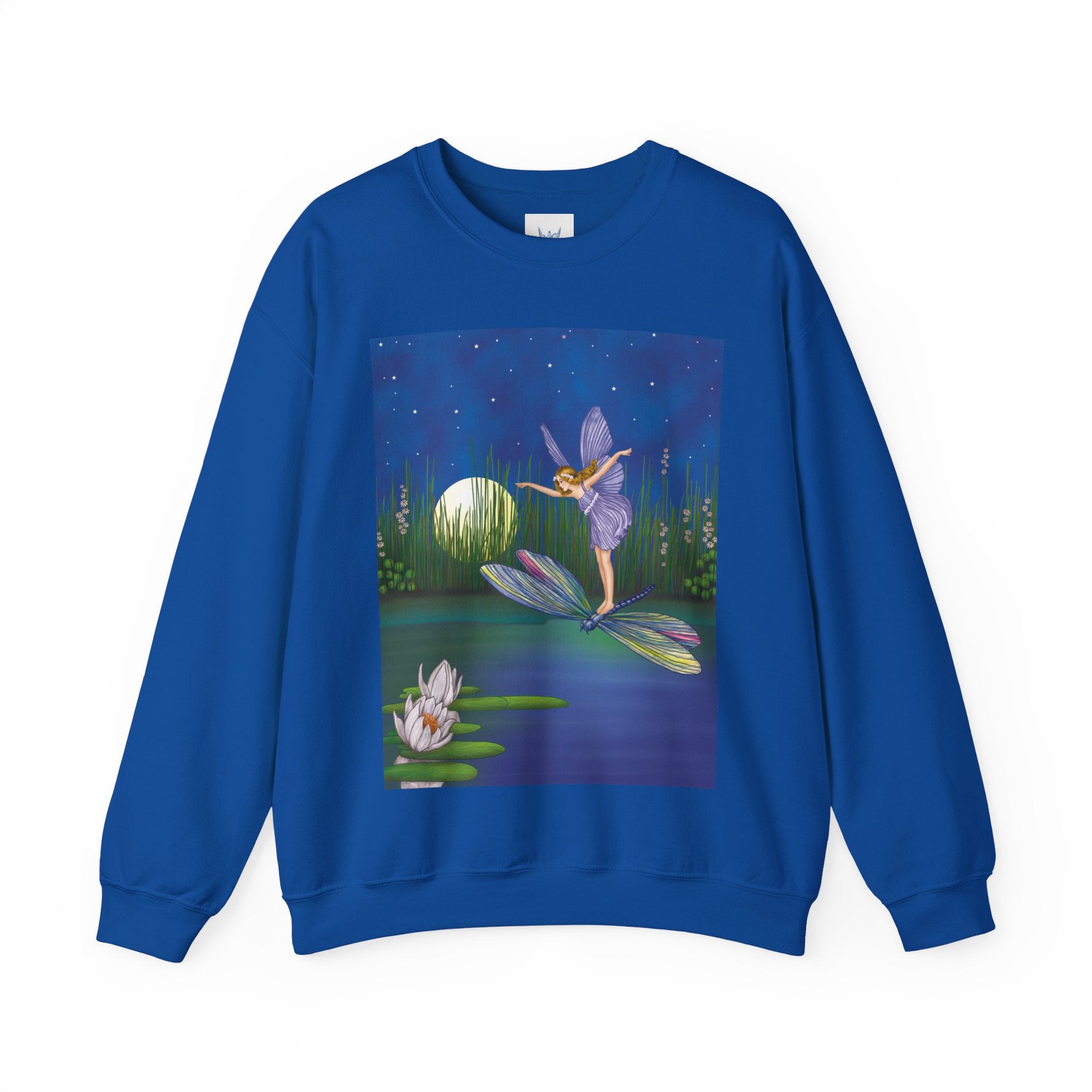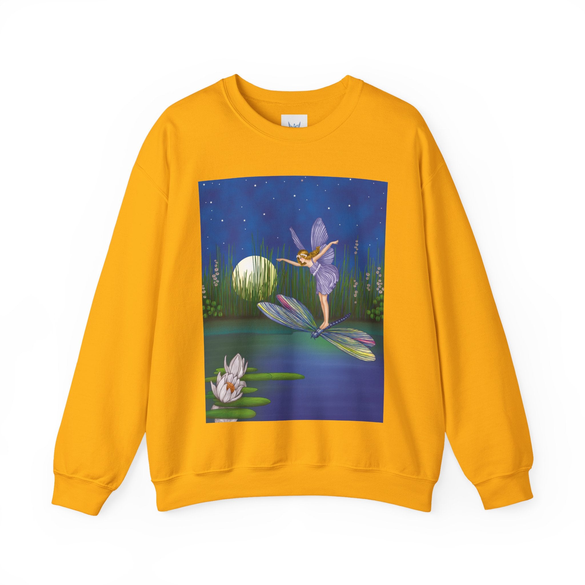 Fairy on a Dragonfly Heavy Blend™ Crewneck Sweatshirt drifts into view like a page from a storybook, featuring Ida Rentoul Outhwaite’s enchanting illustration of a delicate fairy riding a dragonfly across a moonlit pond, where lilies and reeds rest beneath a still, magical sky.