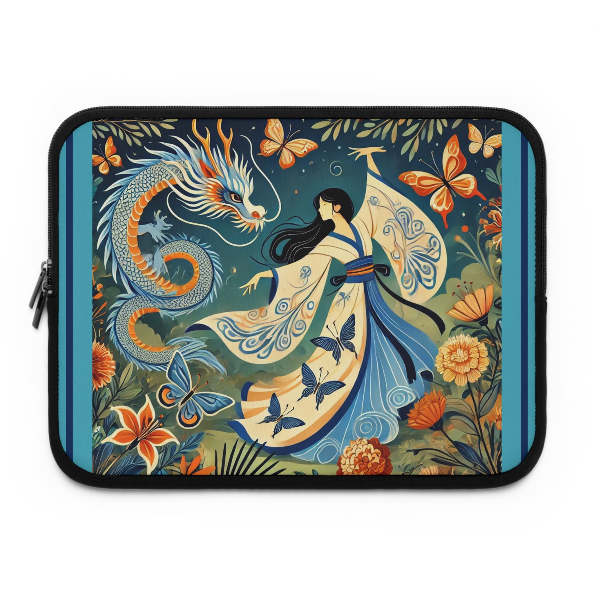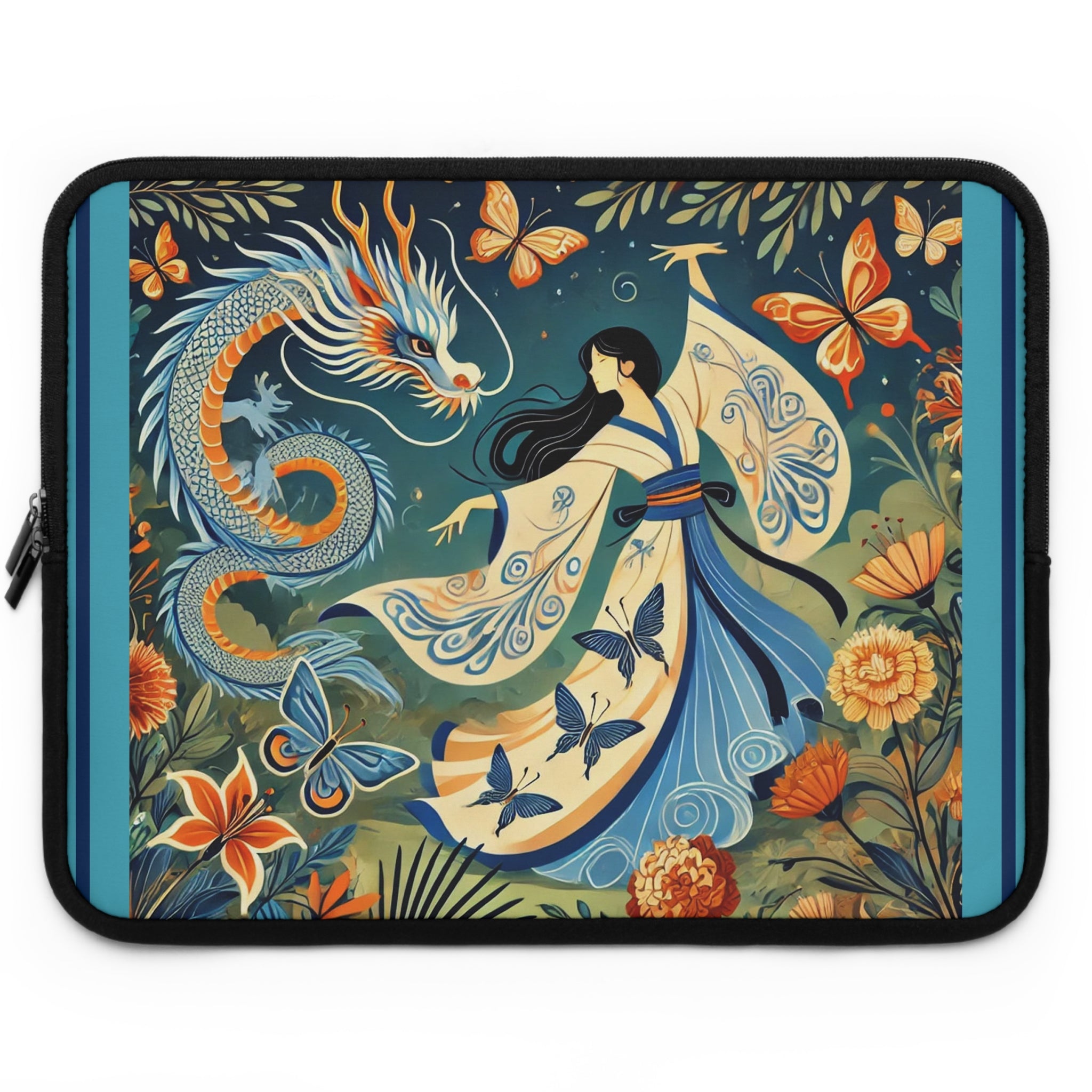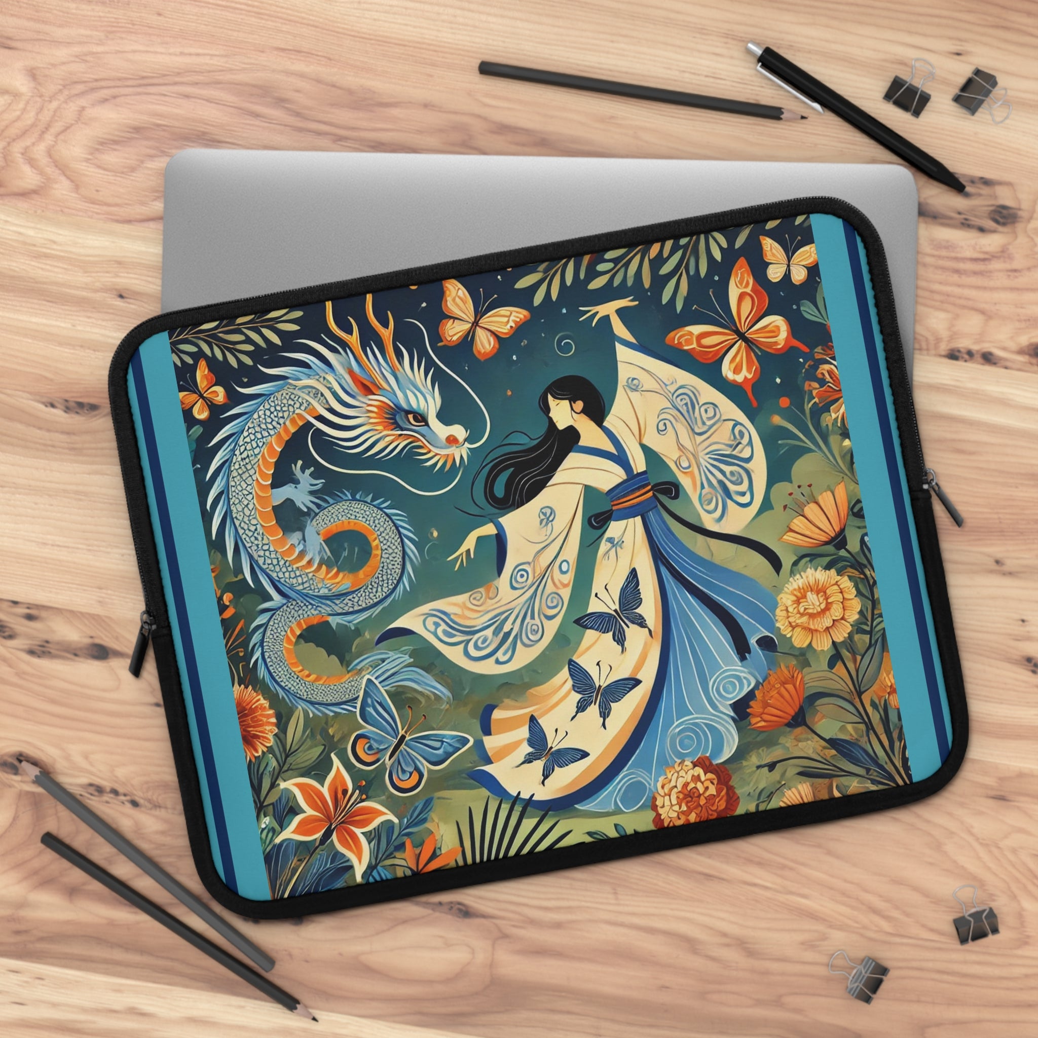Bring a touch of magic to your everyday with the Fairy Waltz in the Butterfly Garden Laptop Sleeve. This captivating design portrays a modern fairy twirling gracefully through a lush butterfly garden, her delicate wings catching sunlight as they shimmer with iridescent hues. Dancing beside her is a gentle dragon companion, their movements perfectly in sync — a harmony of power and grace. Around them, butterflies drift like living petals among vivid blossoms, their wings painting the air with color. The moment feels alive and enchanted, capturing the essence of friendship, freedom, and wonder within a dreamlike garden alive with light and motion.