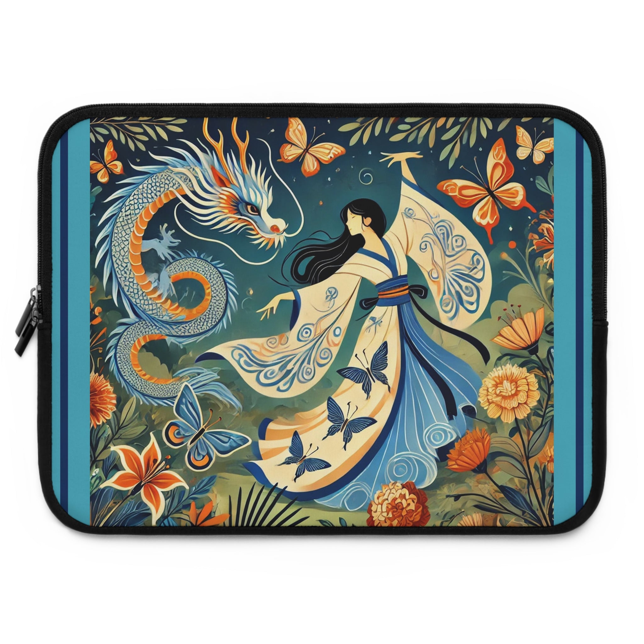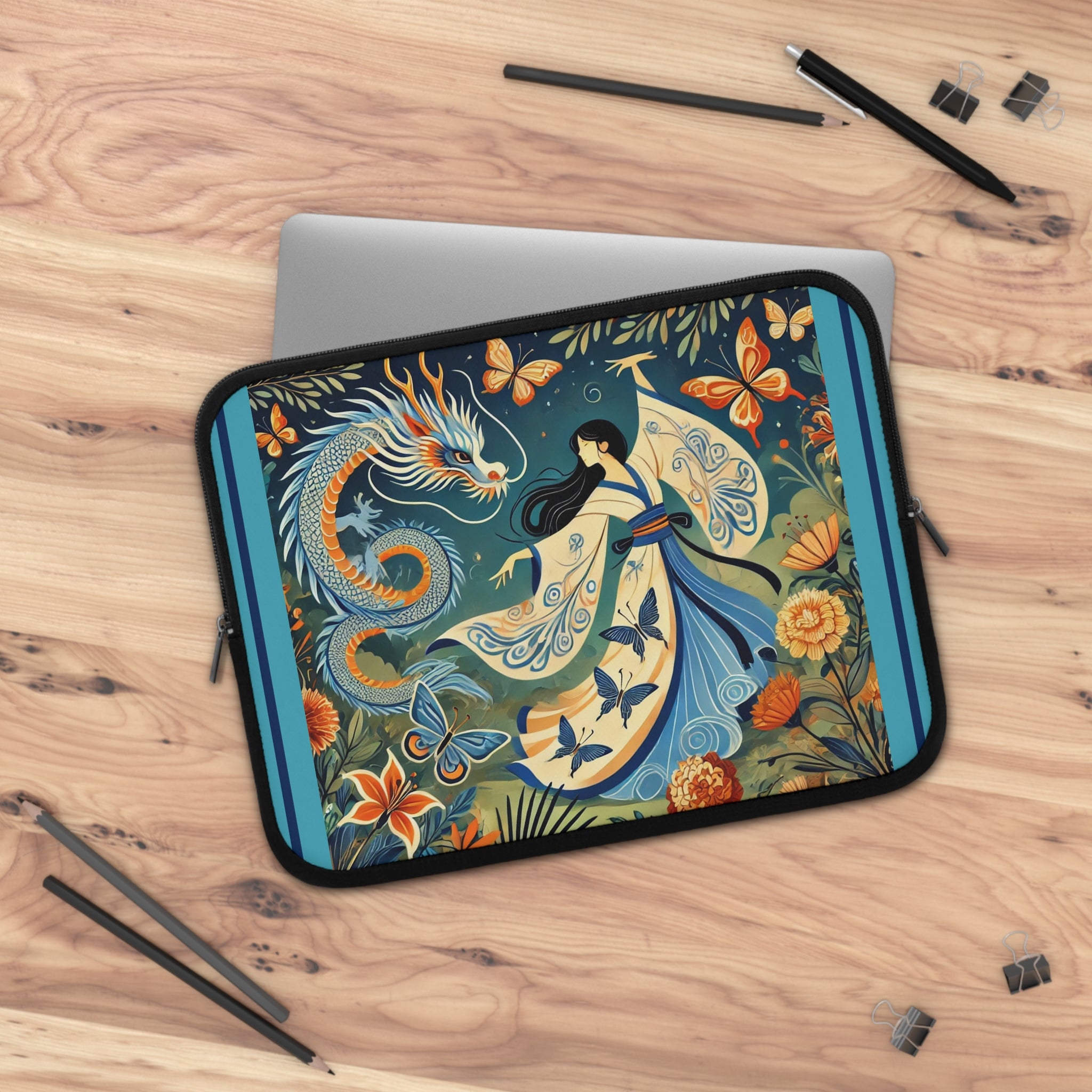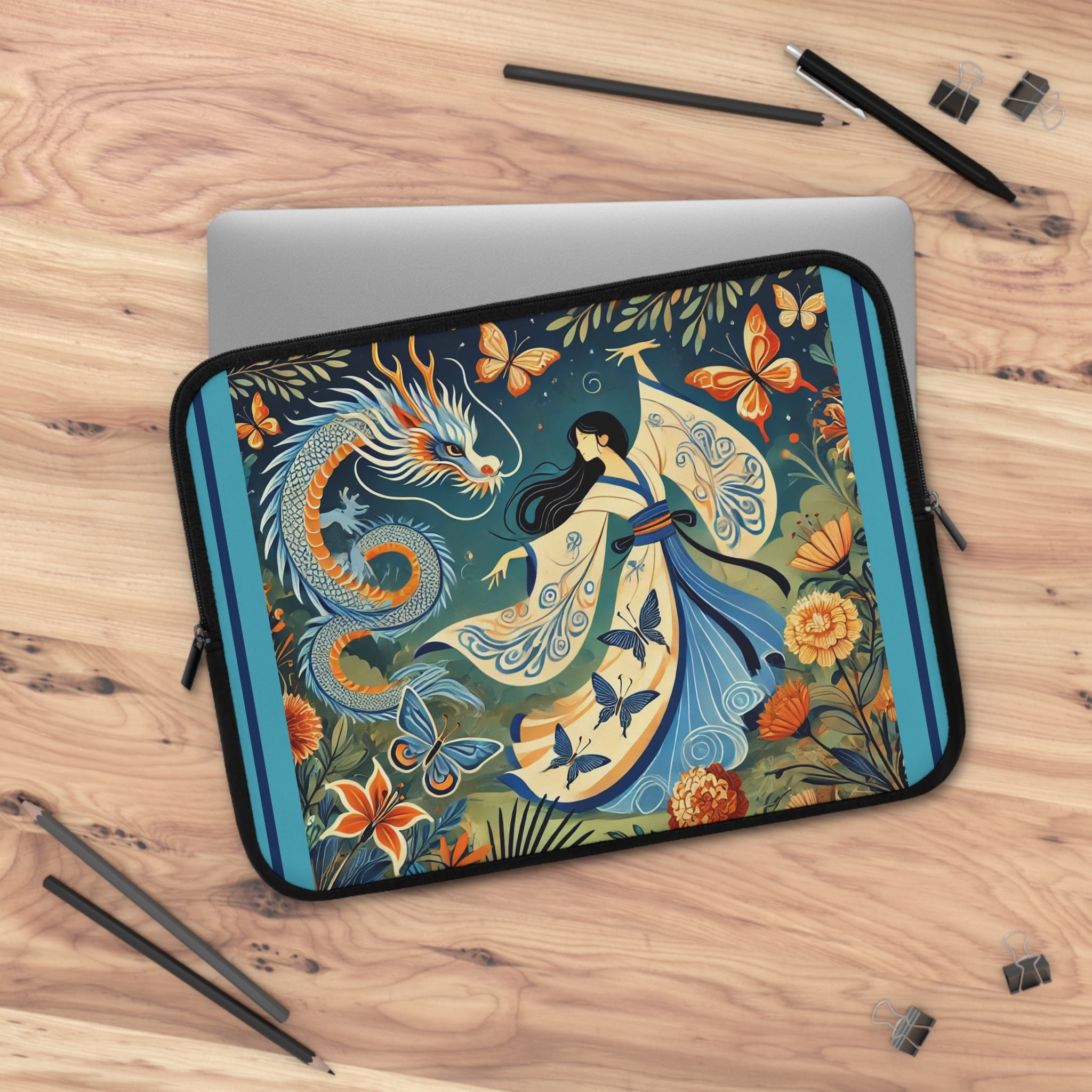 Bring a touch of magic to your everyday with the Fairy Waltz in the Butterfly Garden Laptop Sleeve. This captivating design portrays a modern fairy twirling gracefully through a lush butterfly garden, her delicate wings catching sunlight as they shimmer with iridescent hues. Dancing beside her is a gentle dragon companion, their movements perfectly in sync — a harmony of power and grace. Around them, butterflies drift like living petals among vivid blossoms, their wings painting the air with color. The moment feels alive and enchanted, capturing the essence of friendship, freedom, and wonder within a dreamlike garden alive with light and motion.