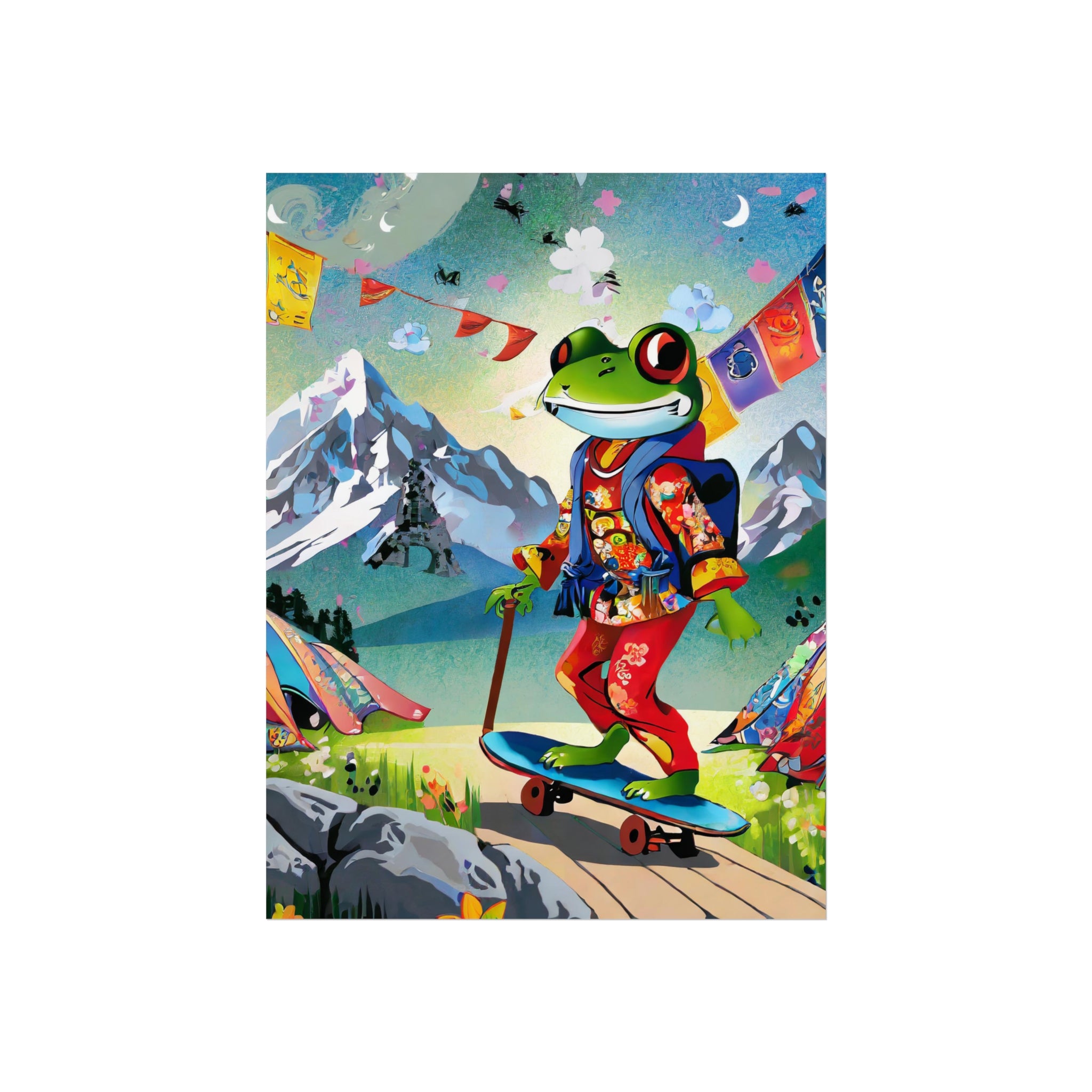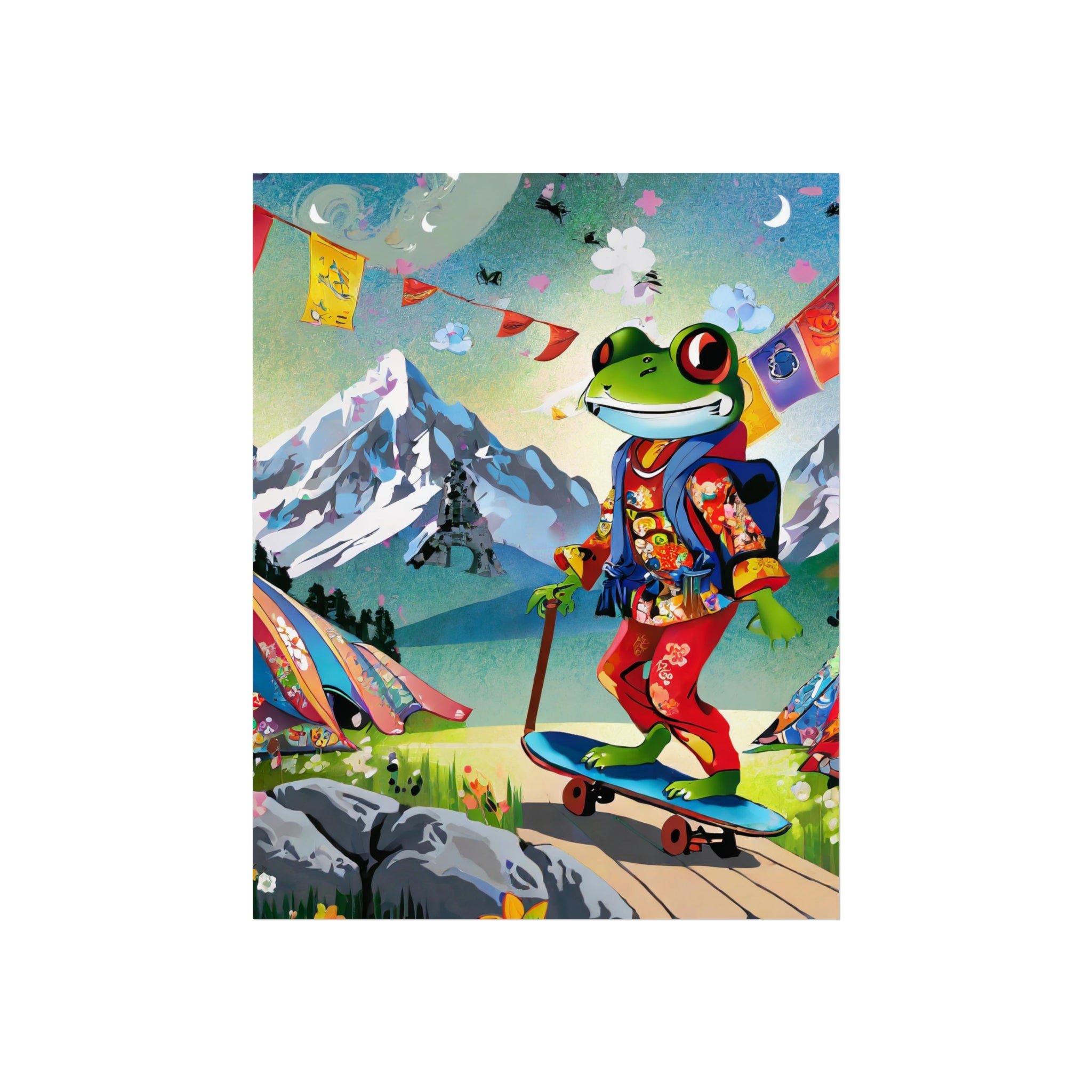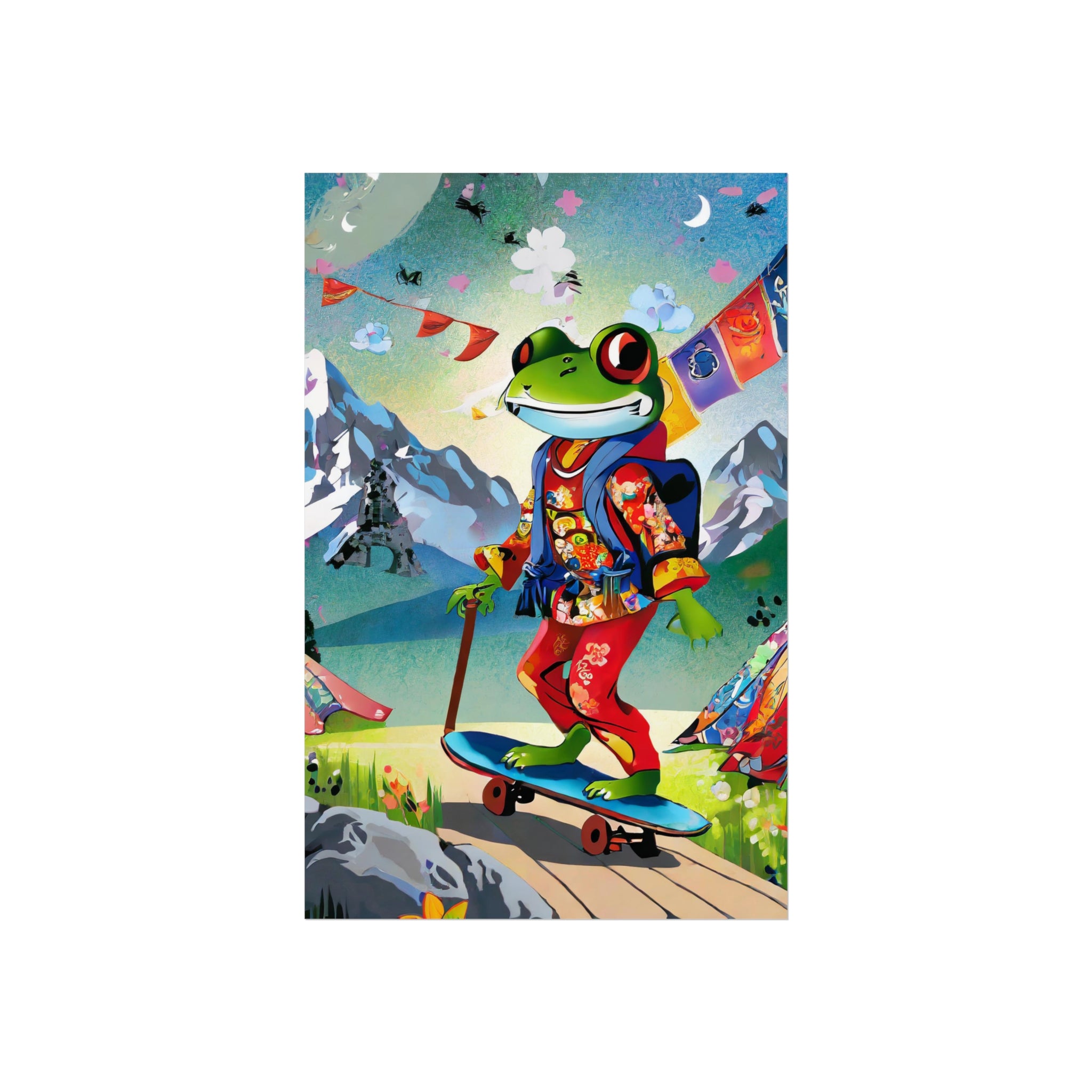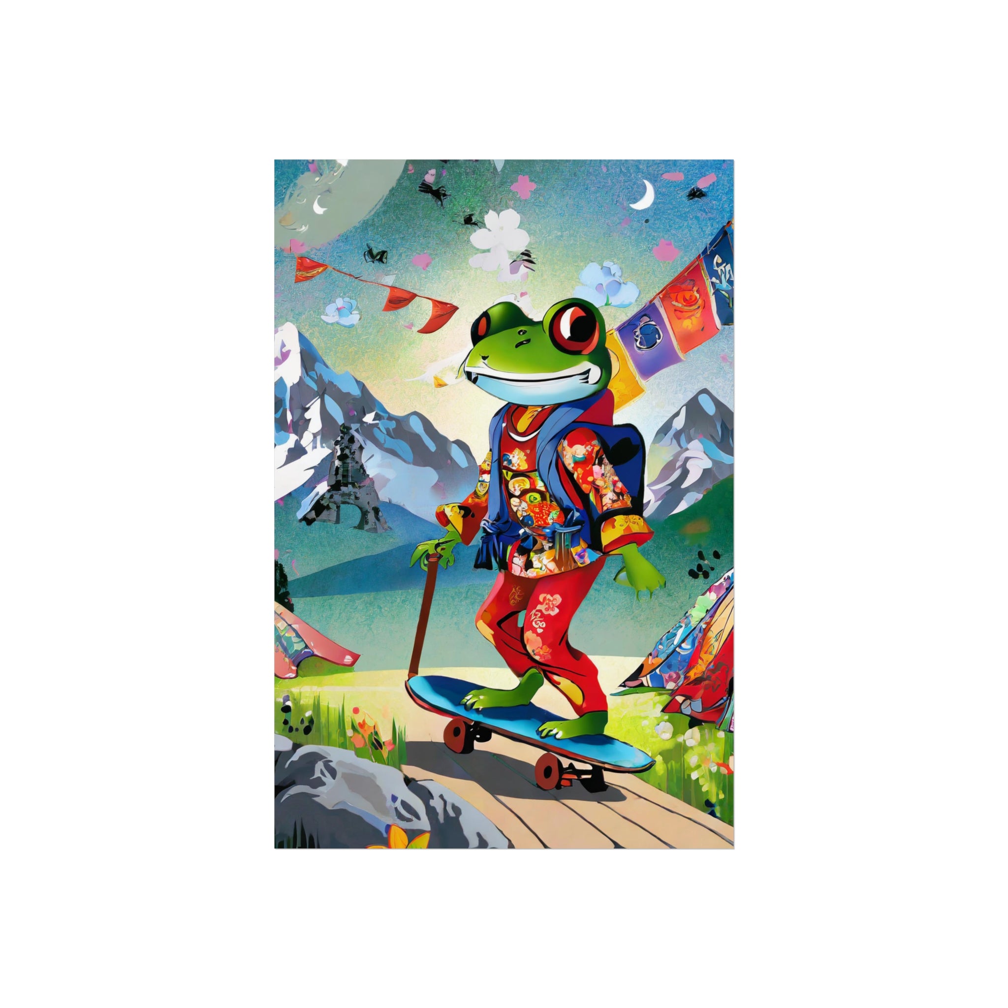 Artwork created, designed and digitally remastered by Sarasvati Designs. A whimsical illustration of a charming and fun frog riding a skateboard past colorful Tibetan tents and flags.