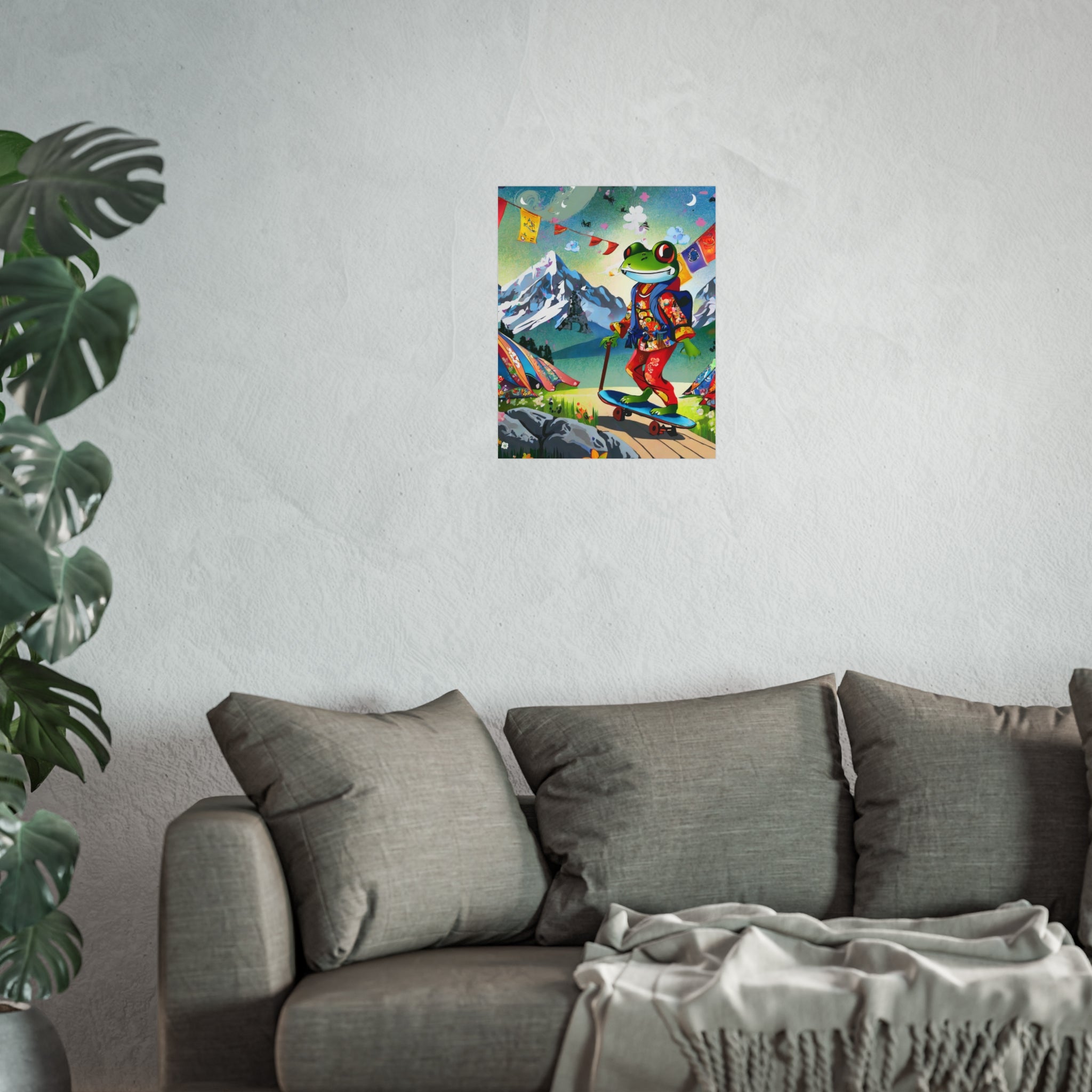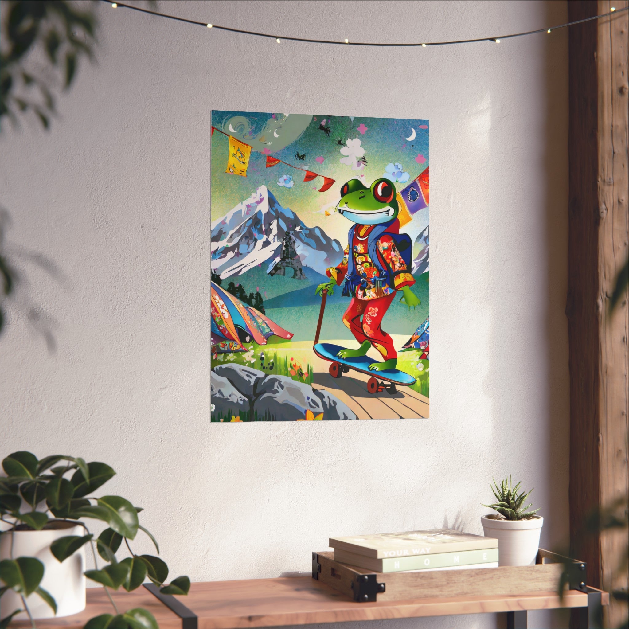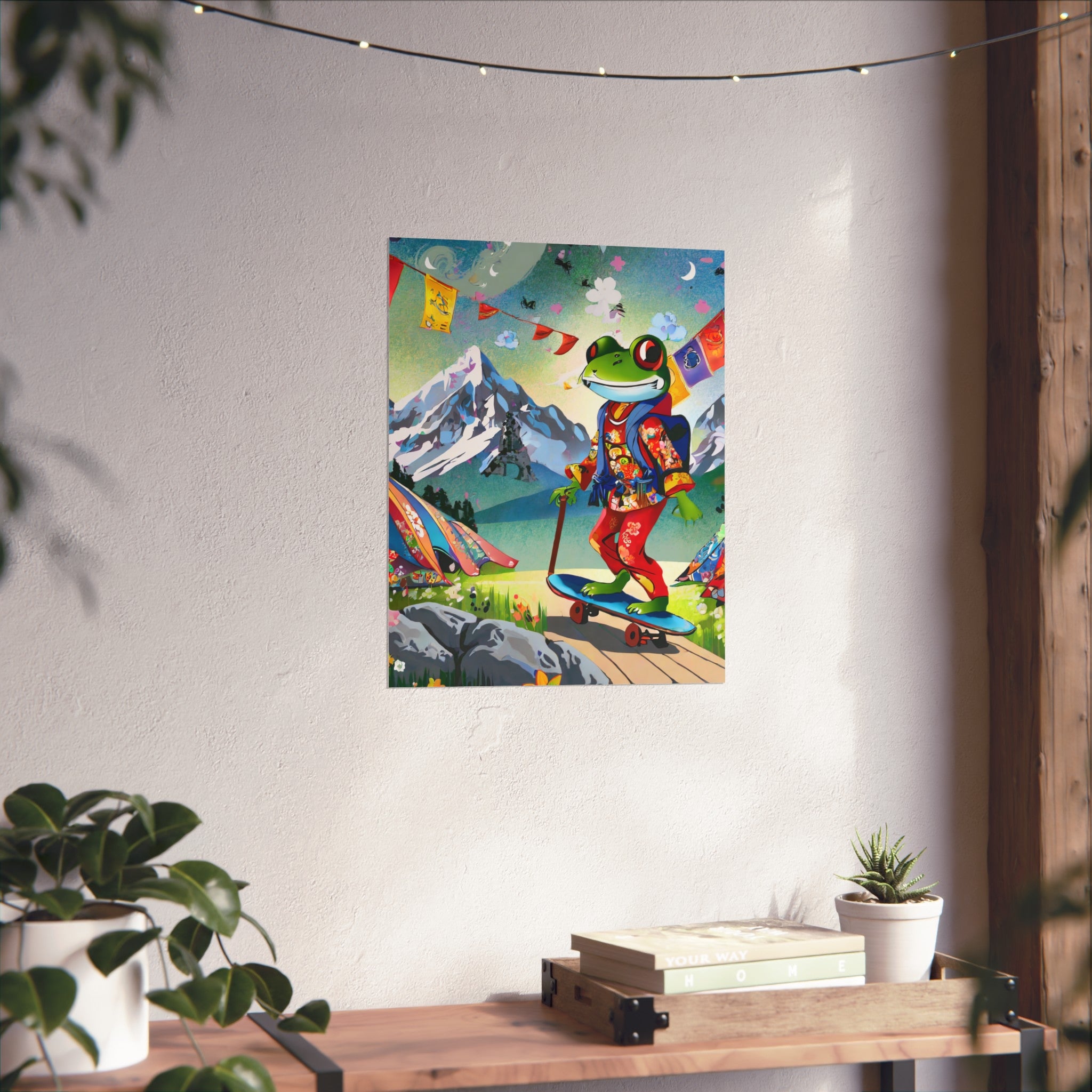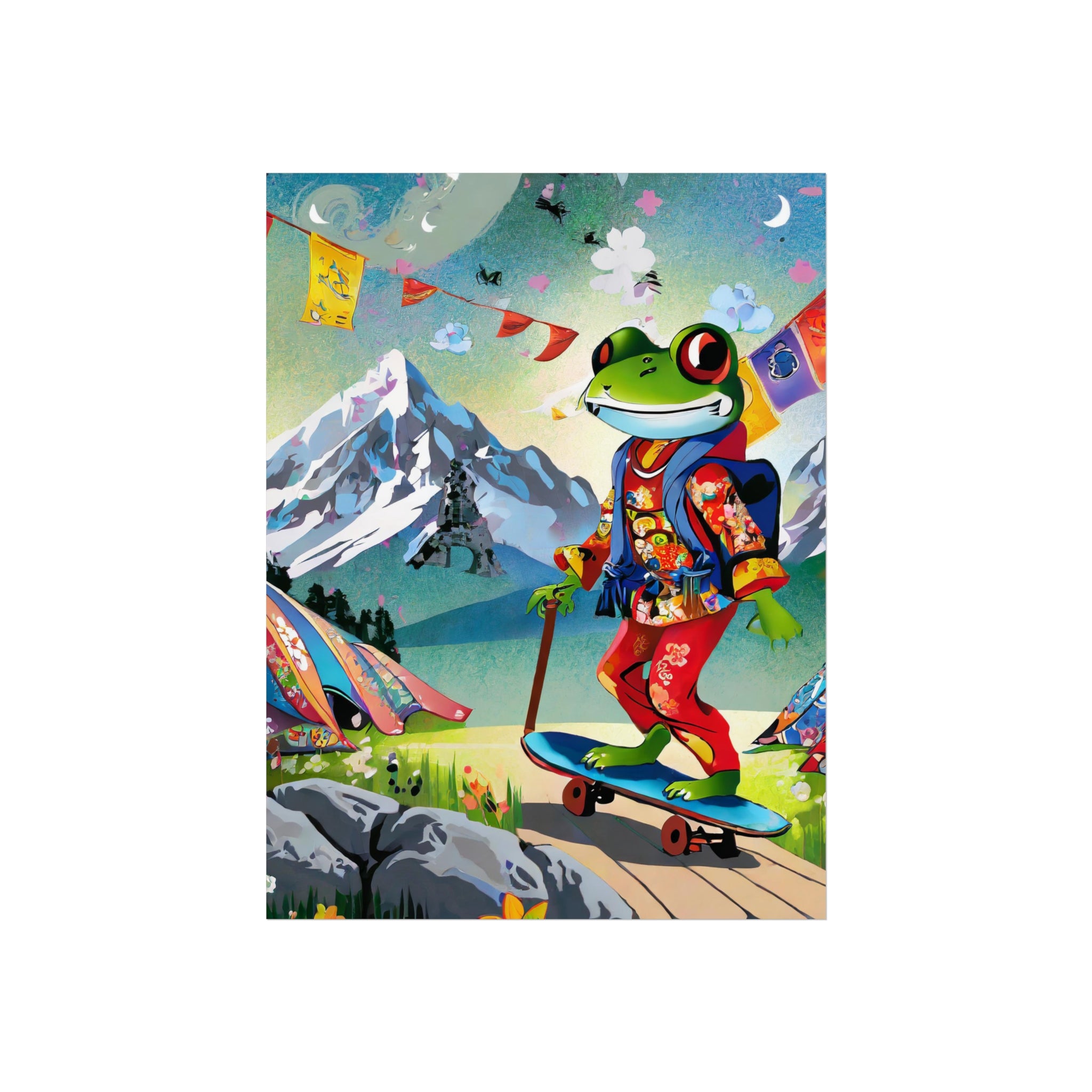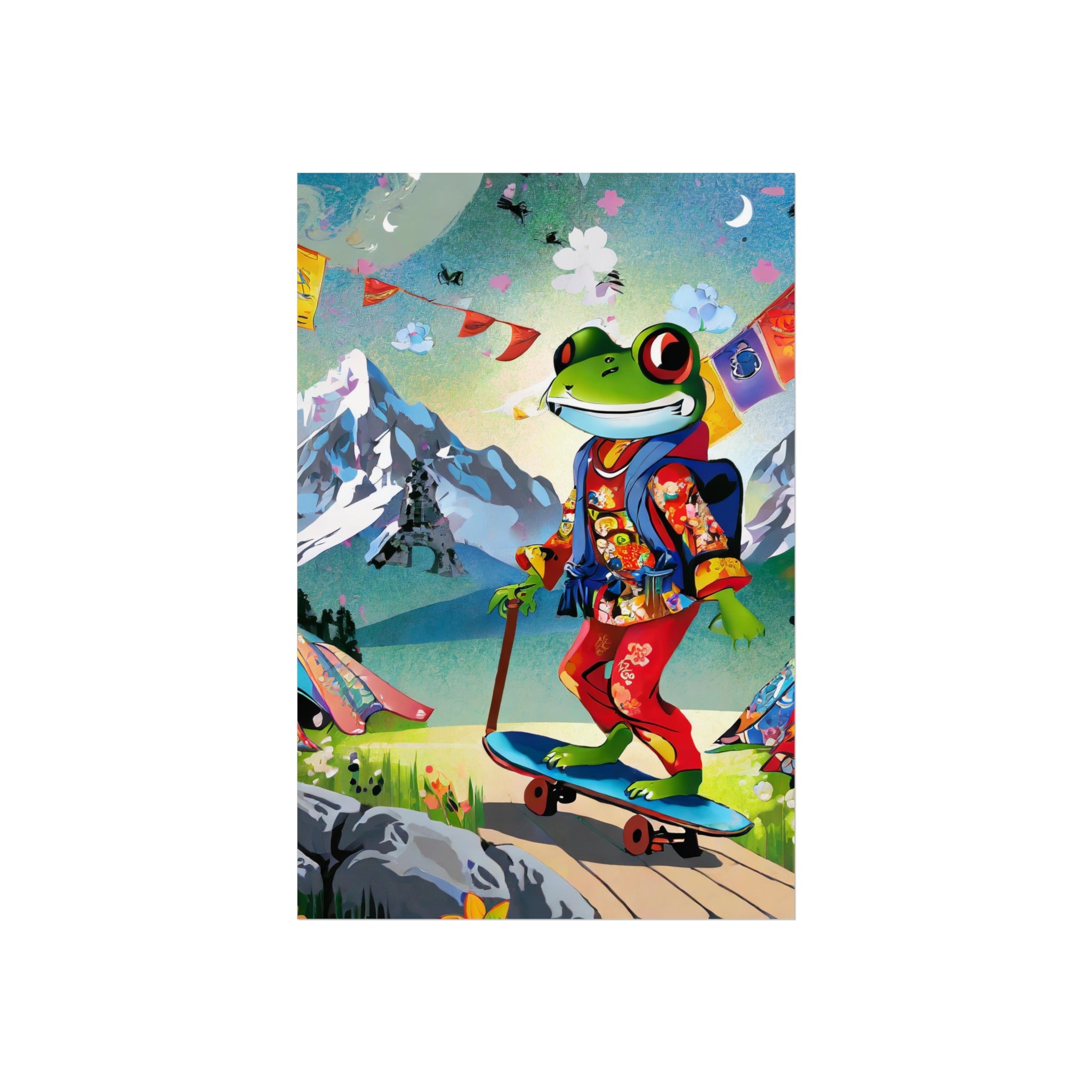 Artwork created, designed and digitally remastered by Sarasvati Designs. A whimsical illustration of a charming and fun frog riding a skateboard past colorful Tibetan tents and flags.